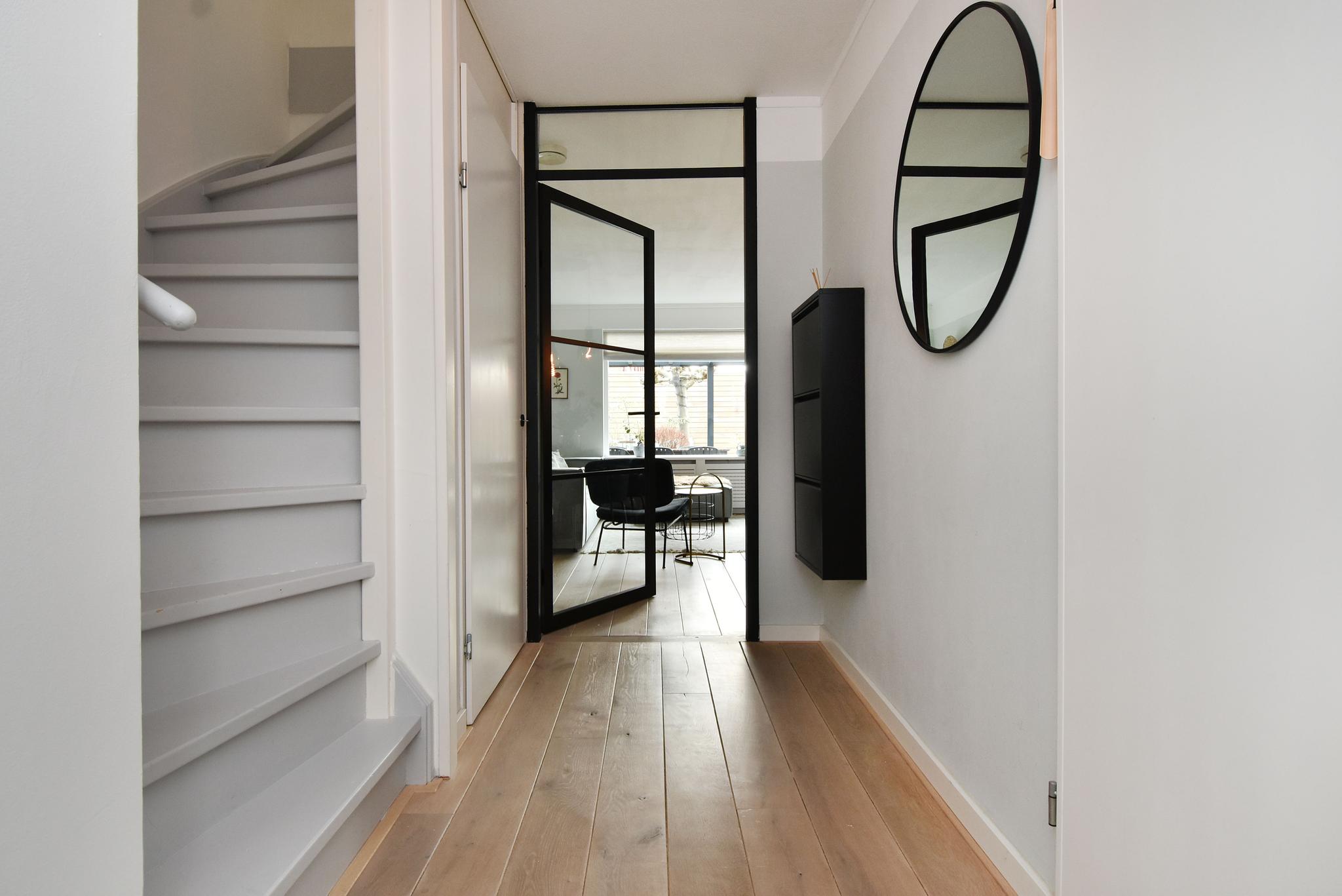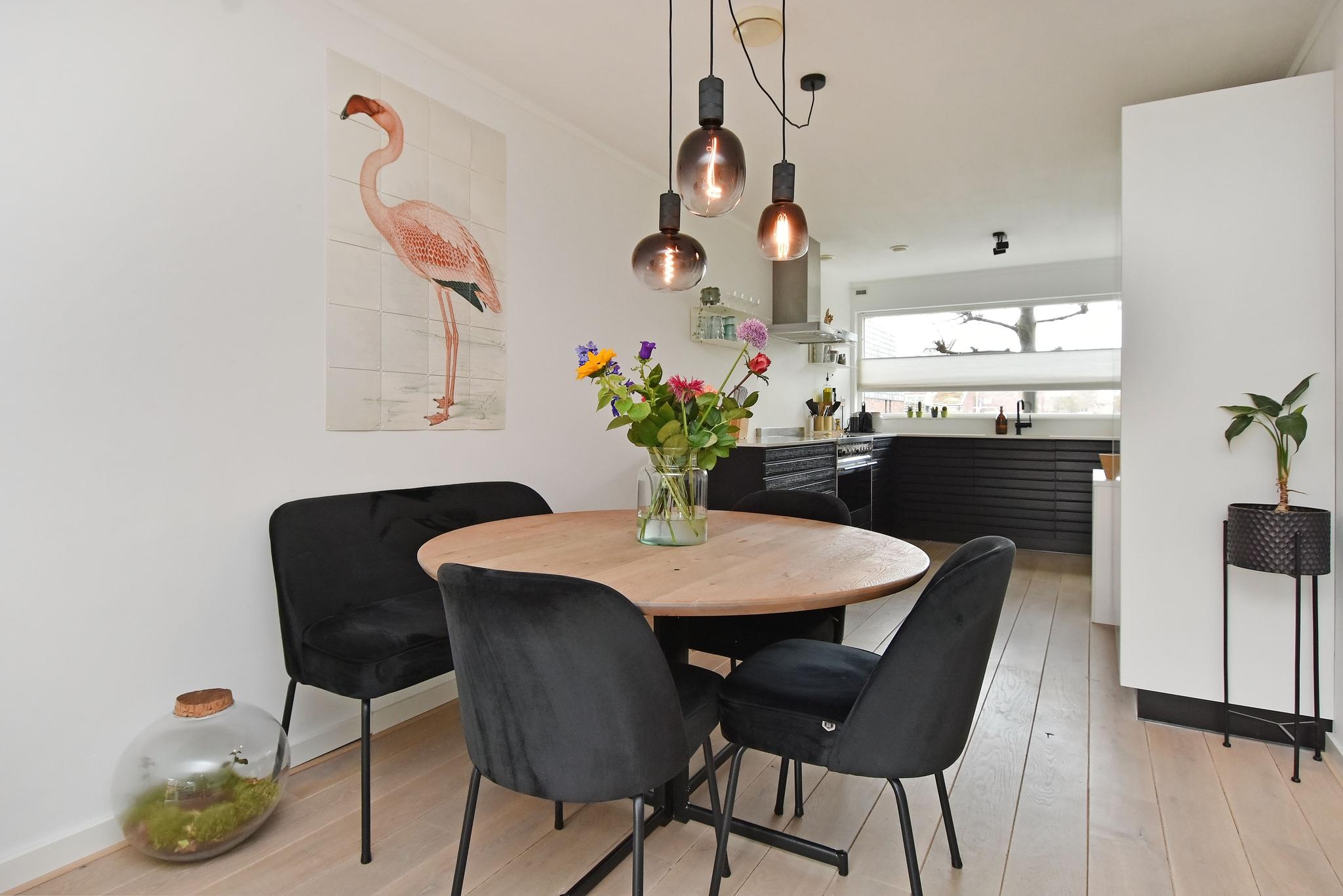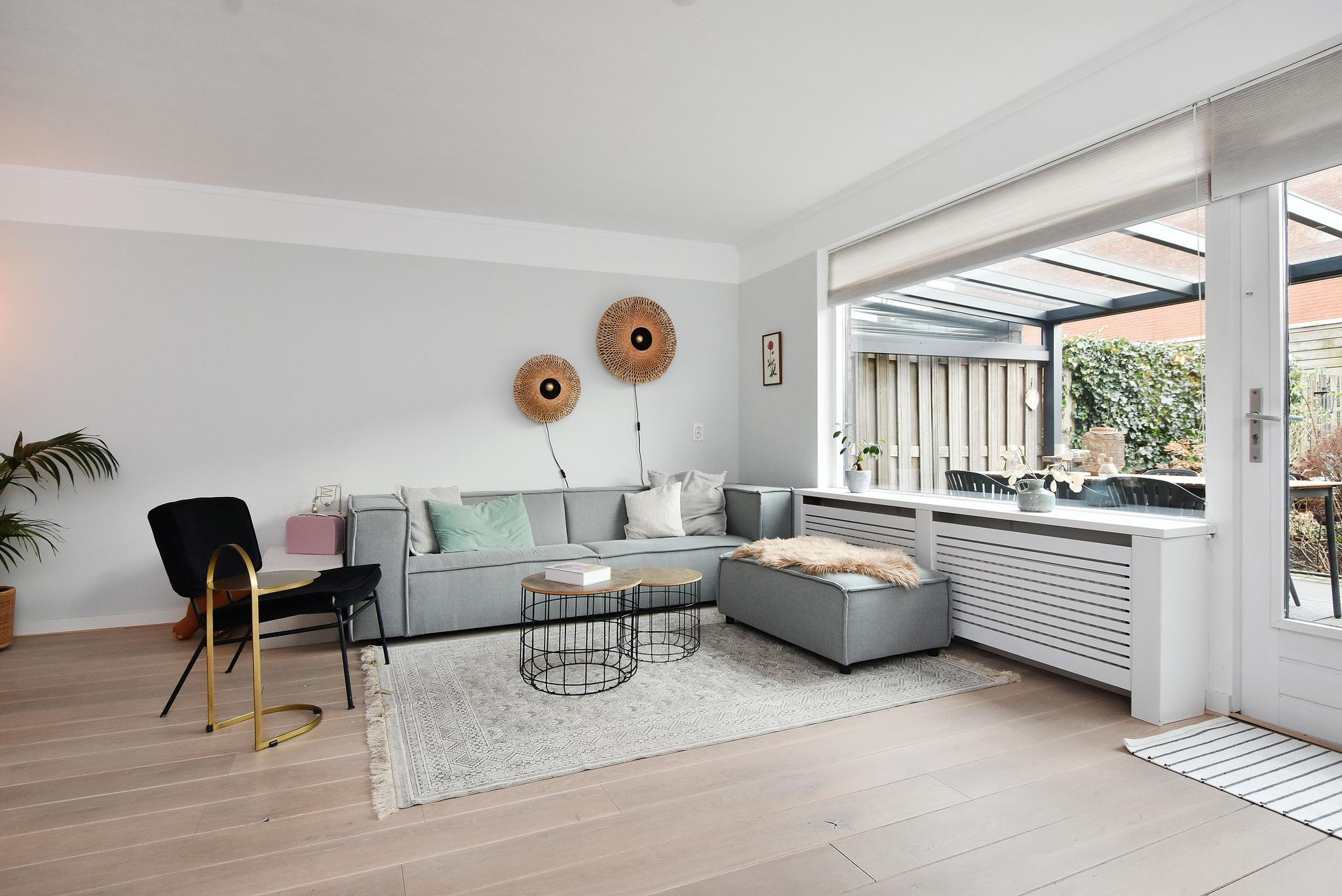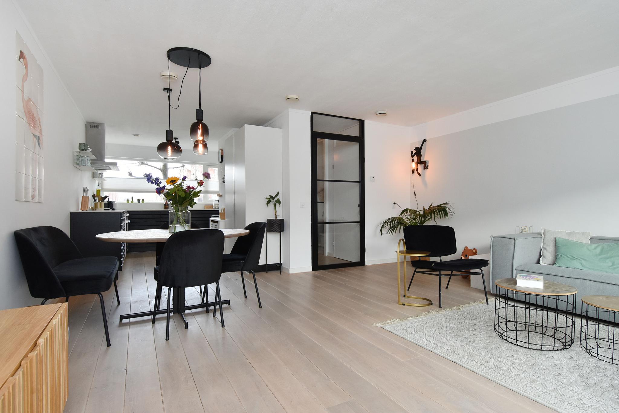 Begane grond: Via de keurig aangelegde voortuin is er toegang tot de woning. Entreehal met meterkast, een moderne toiletruimte, de trapopgang en een praktische trapkast. De lichte en zonnige woonkamer is fraai afgewerkt met een houten vloer en een stijlvolle moderne tussendeur. Aan de voorzijde bevindt zich de uitgebreide keuken uit 2020, voorzien van diverse Siemens inbouwapparatuur, zoals een groot fornuis met inductiekookplaat en dubbele oven, een koelkast en een vaatwasser.