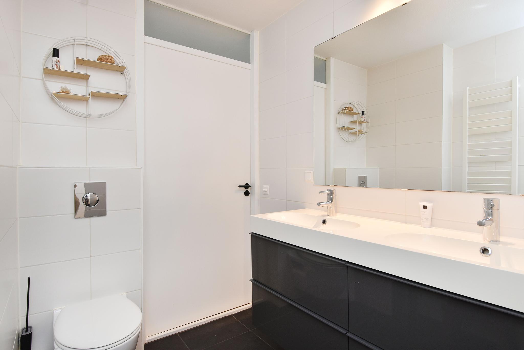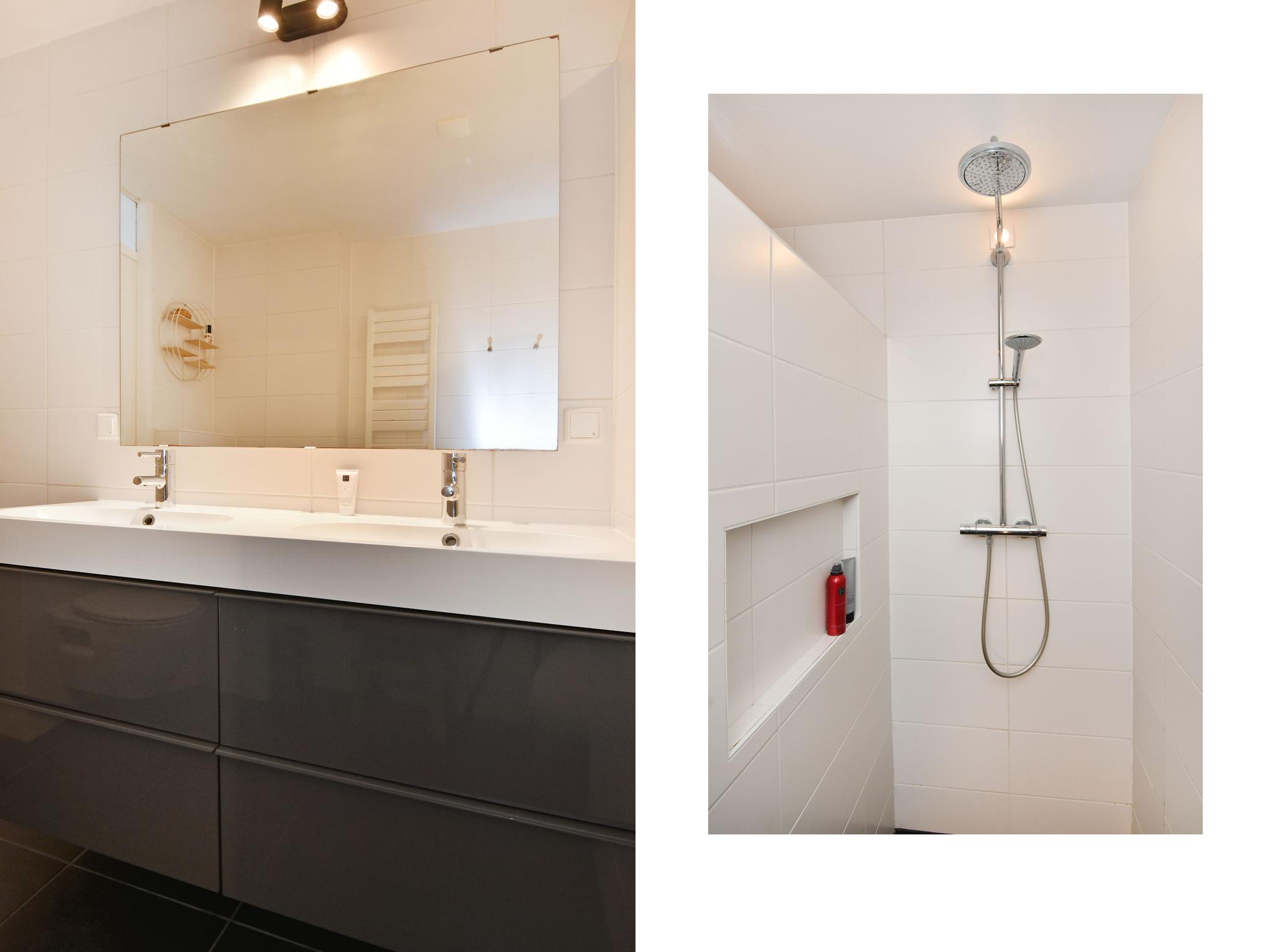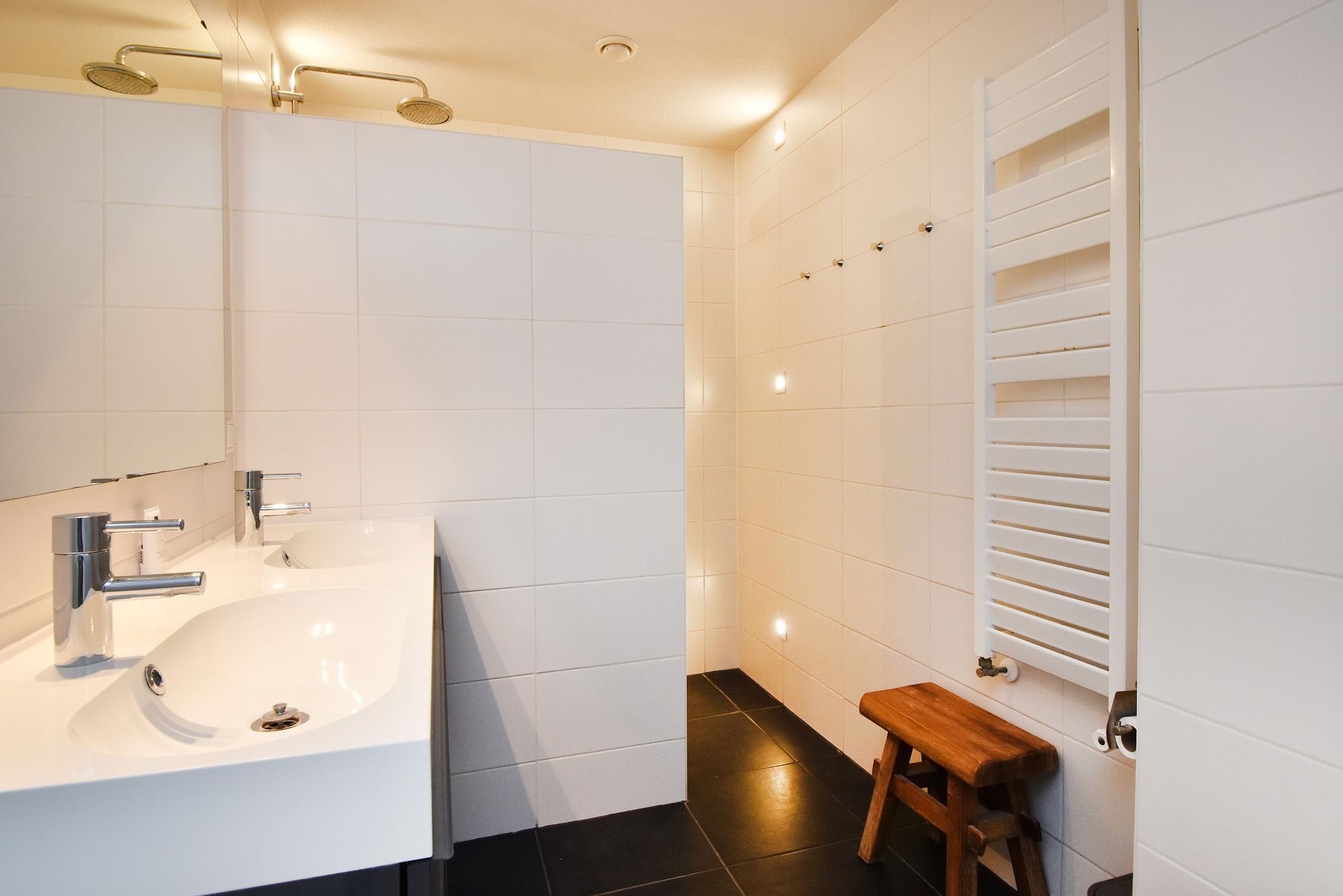 De badkamer is eveneens modern afgewerkt met een inloopdouche, een dubbel wastafelmeubel, een tweede toilet en een designradiator.