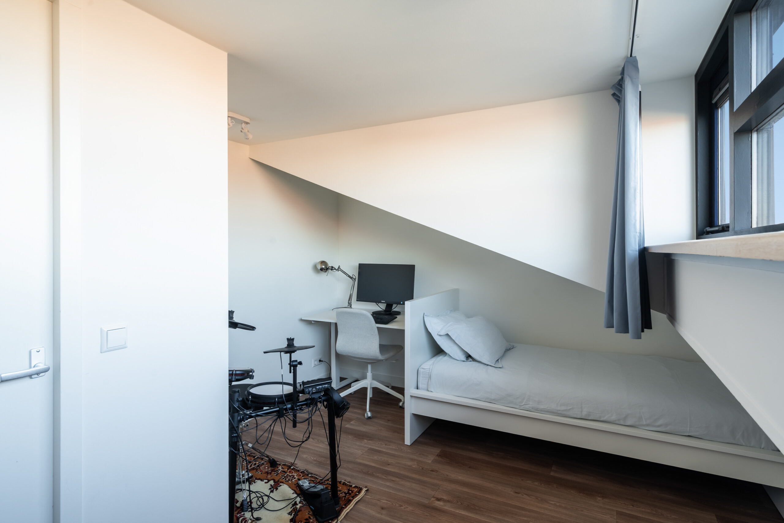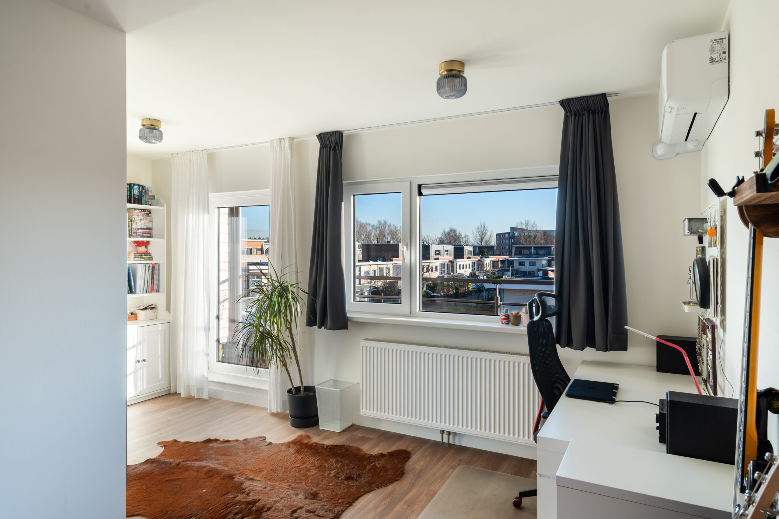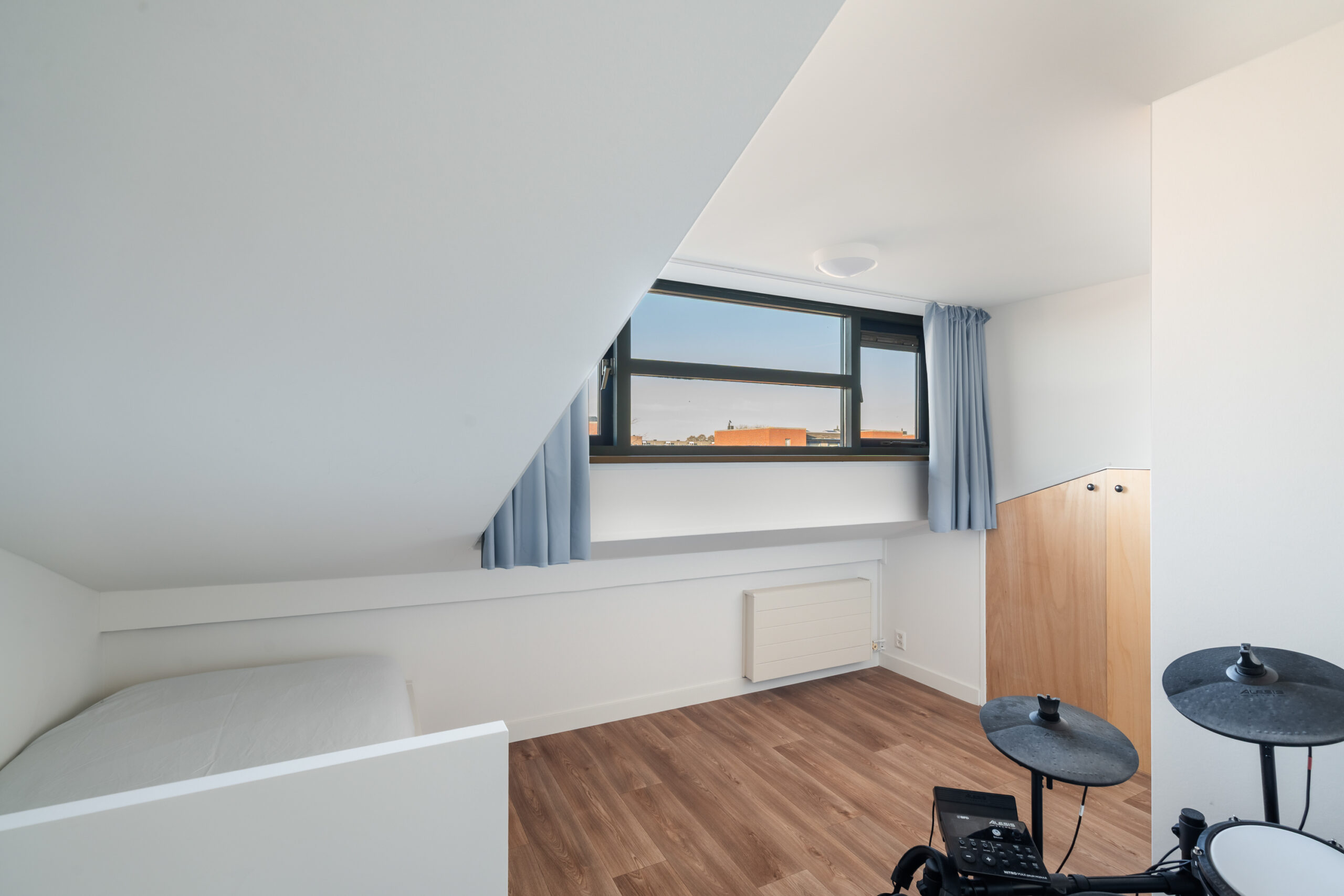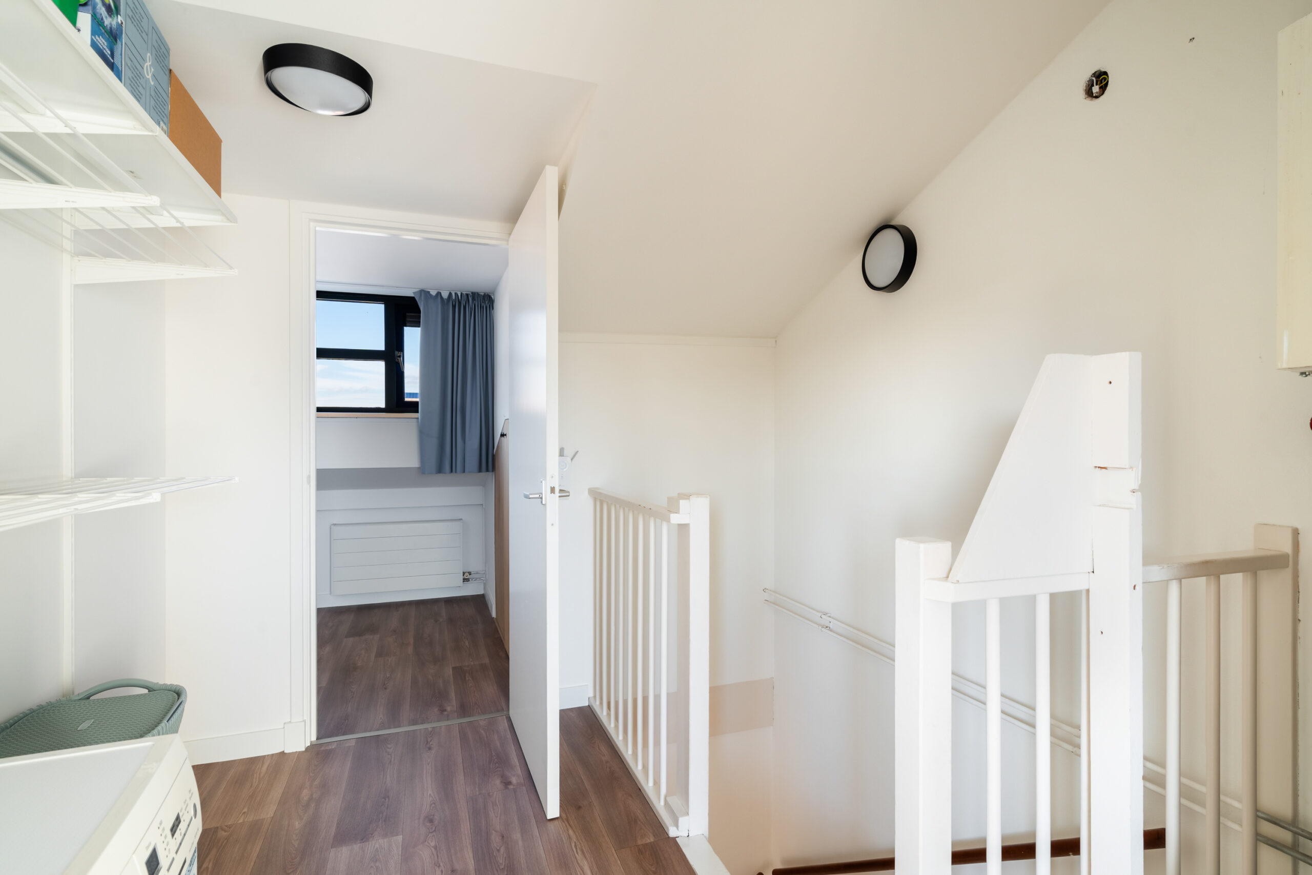 Overloop met toegang tot 2 slaapkamers. Aan de voorzijde een dakkapel, aan de achterzijde een opbouw, waardoor hier volwaardige extra kamers zijn gerealiseerd. Ook de slaapkamer aan de achterzijde is v.v. airconditioning.