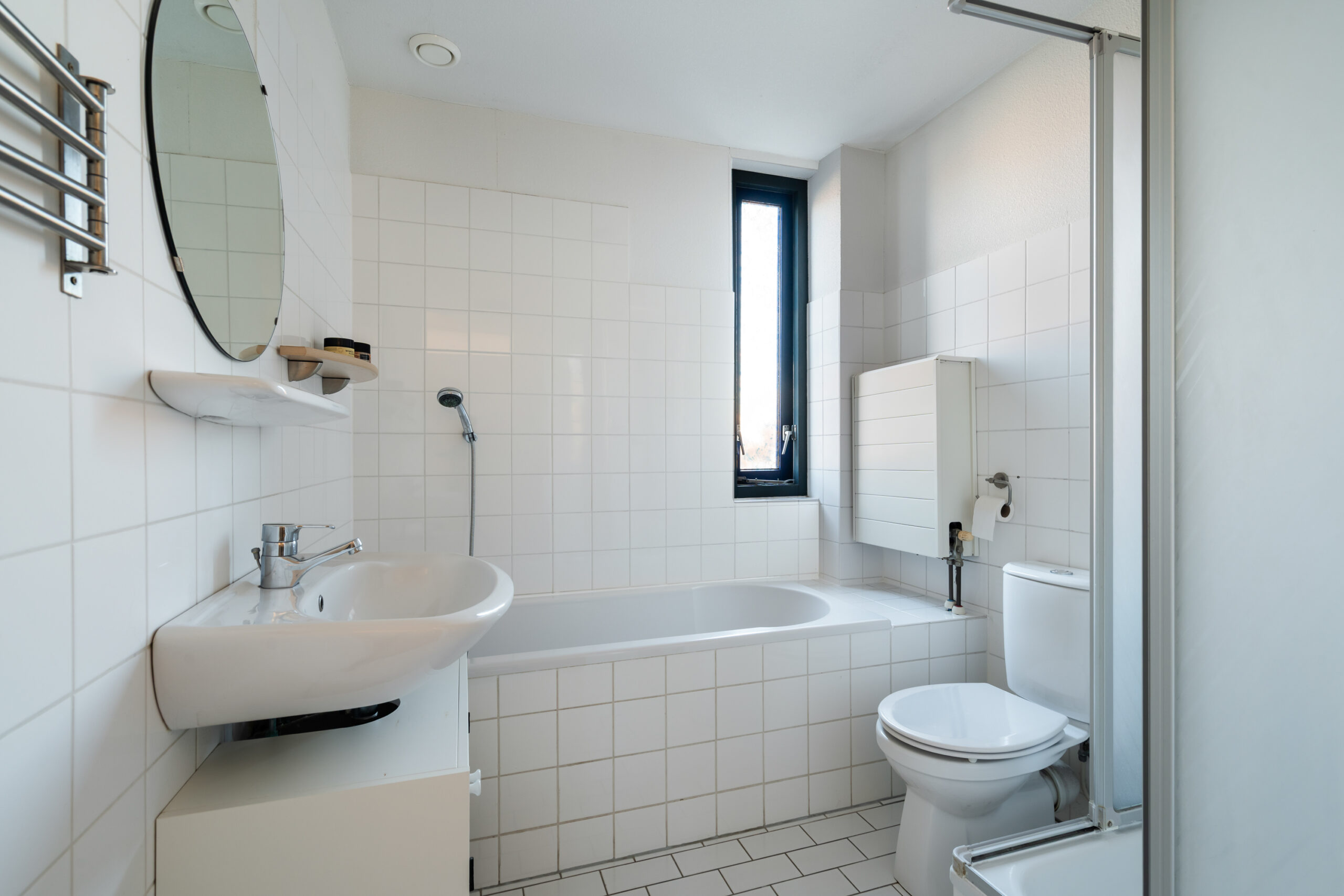Overloop met toegang tot 3 slaapkamers. Moderne badkamer met ligbad, douche, 2e toilet en wastafel. Aan de achterzijde zijn de kozijnen vernieuwd en uitgevoerd in kunststof. In 1 slaapkamer is airconditioning aanwezig.