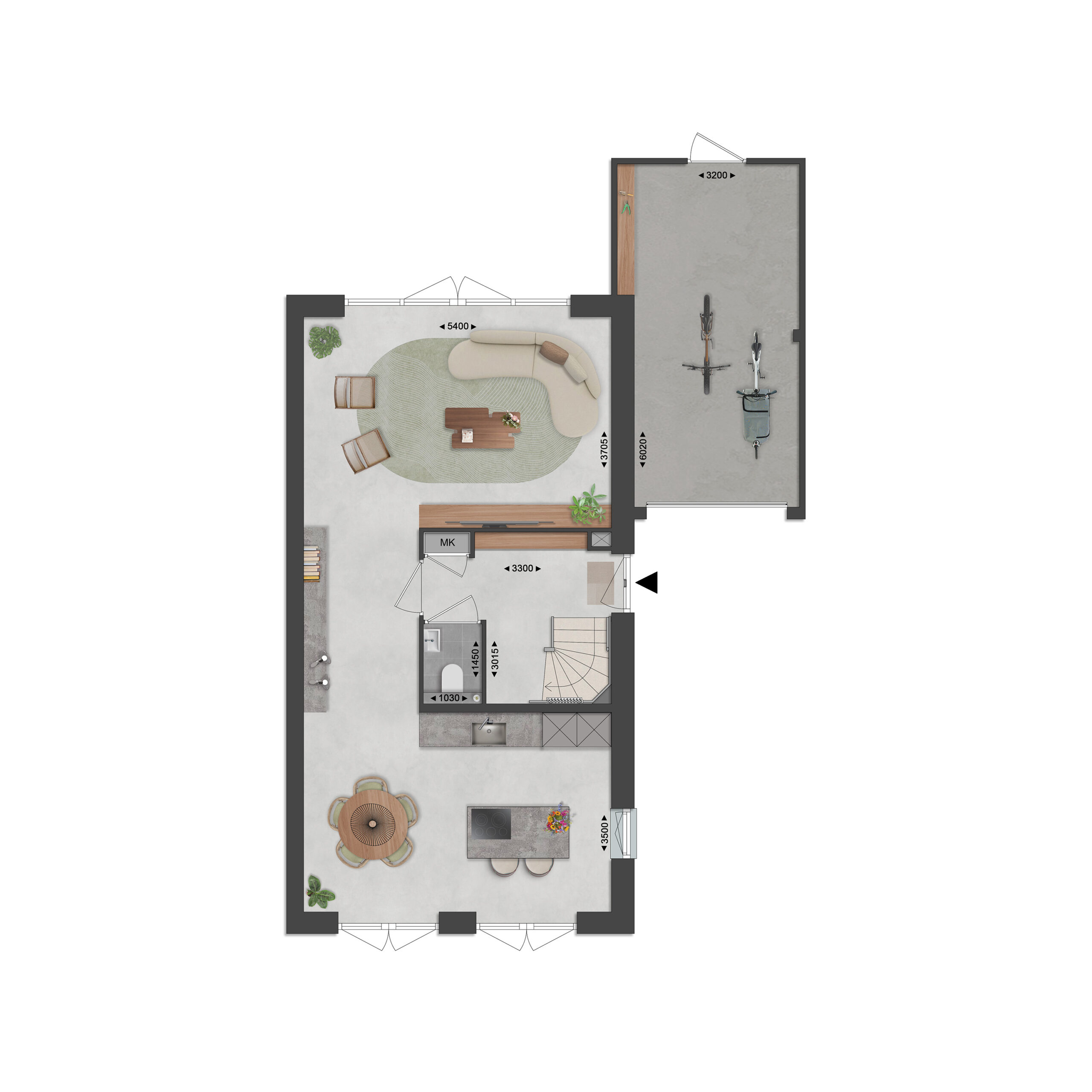 Aan de zijgevel van deze woning tref je de voordeur. Na binnenkomst vind je in de hal links de trapopgang, een hoekje voor het ophangen van de jas en het toilet en rechts de meterkast. Vervolgens stap je het woongedeelte in. Ga je links of ga je rechts? Aan de rechterzijde is de keuken gelegen, een ruimte van ca. 20 vierkante meter en daarmee een ruimte met een scala van mogelijkheden. Hier creëer jij jouw droomkeuken. Aan de achterzijde van de ruimte is de woonkamer gelegen. In basis al een grote ruimte met dubbele openslaande deuren naar de tuin. Wens je nog iets meer ruimte, dan kun je de woonkamer laten uitbreiden met een uitbouw van 1,20 meter of 2,40 meter.