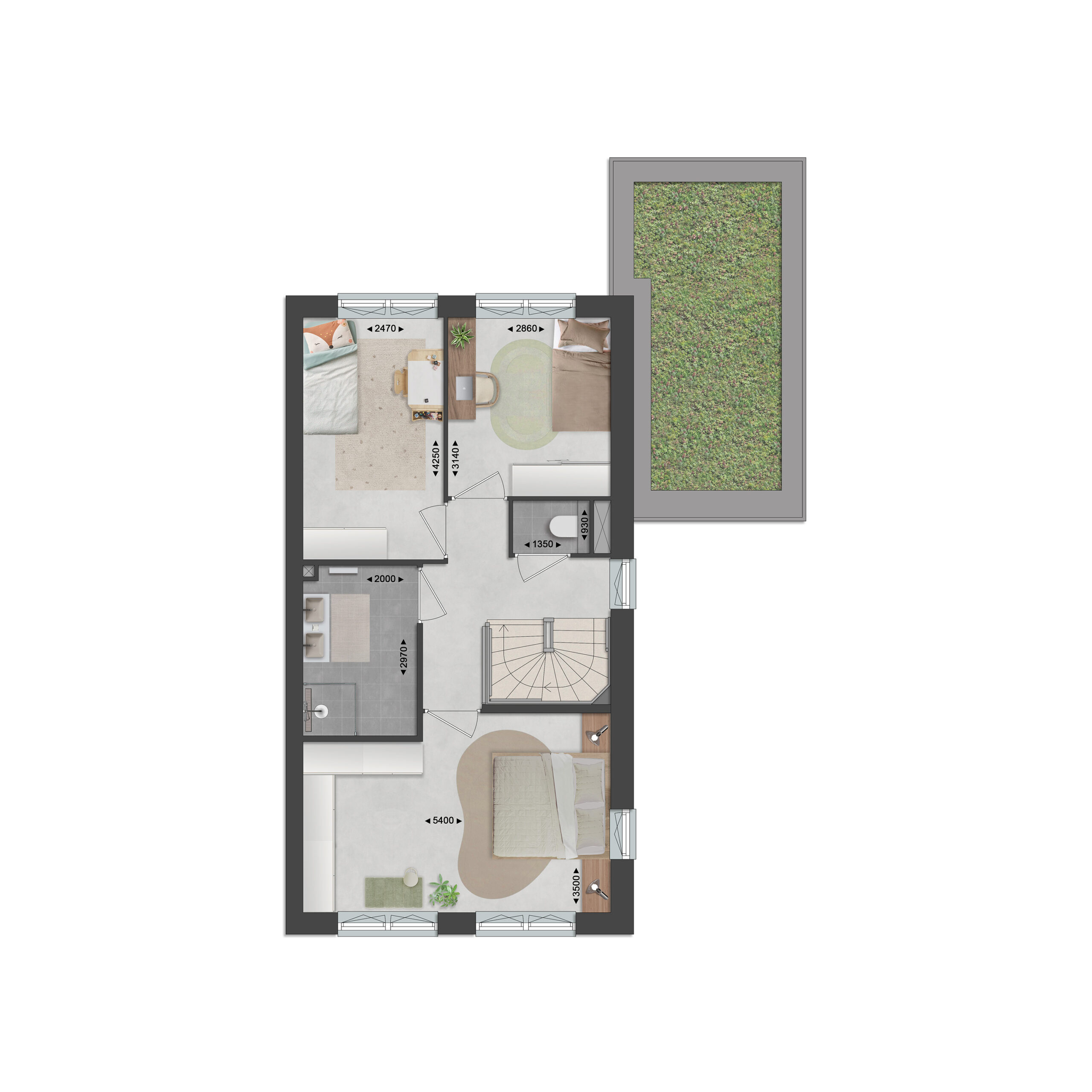 Terug naar de hal, via de trapopgang bereik je de royale overloop mét lichtinval vanuit het grote raam. Op deze verdieping zijn drie fijne slaapkamers gerealiseerd. De badkamer ligt in het midden van de verdieping en biedt voldoende ruimte voor een inloopdouche en eventueel een dubbele wastafel. Het tweede toilet wordt geplaatst in een separate ruimte.