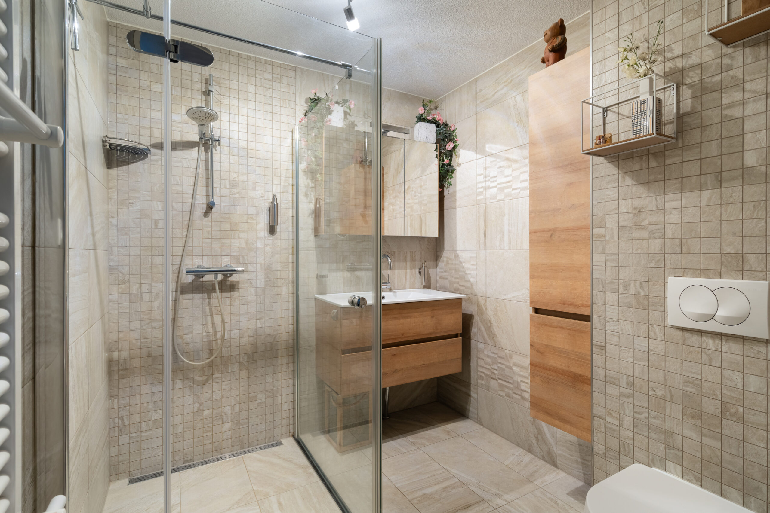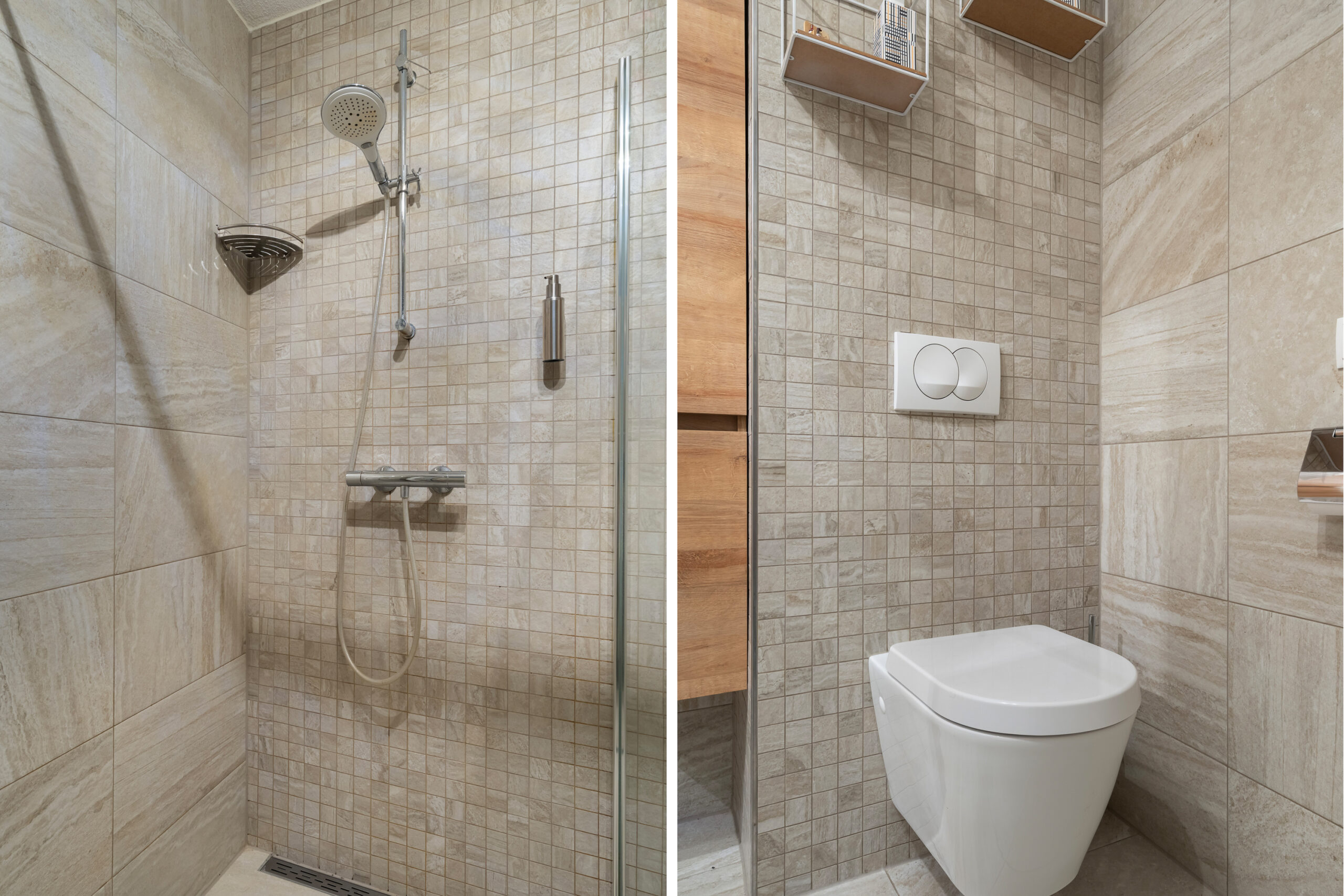 – badkamer met douchecabine, wastafelmeubel, 2e toilet, design radiator en vloerverwarming
