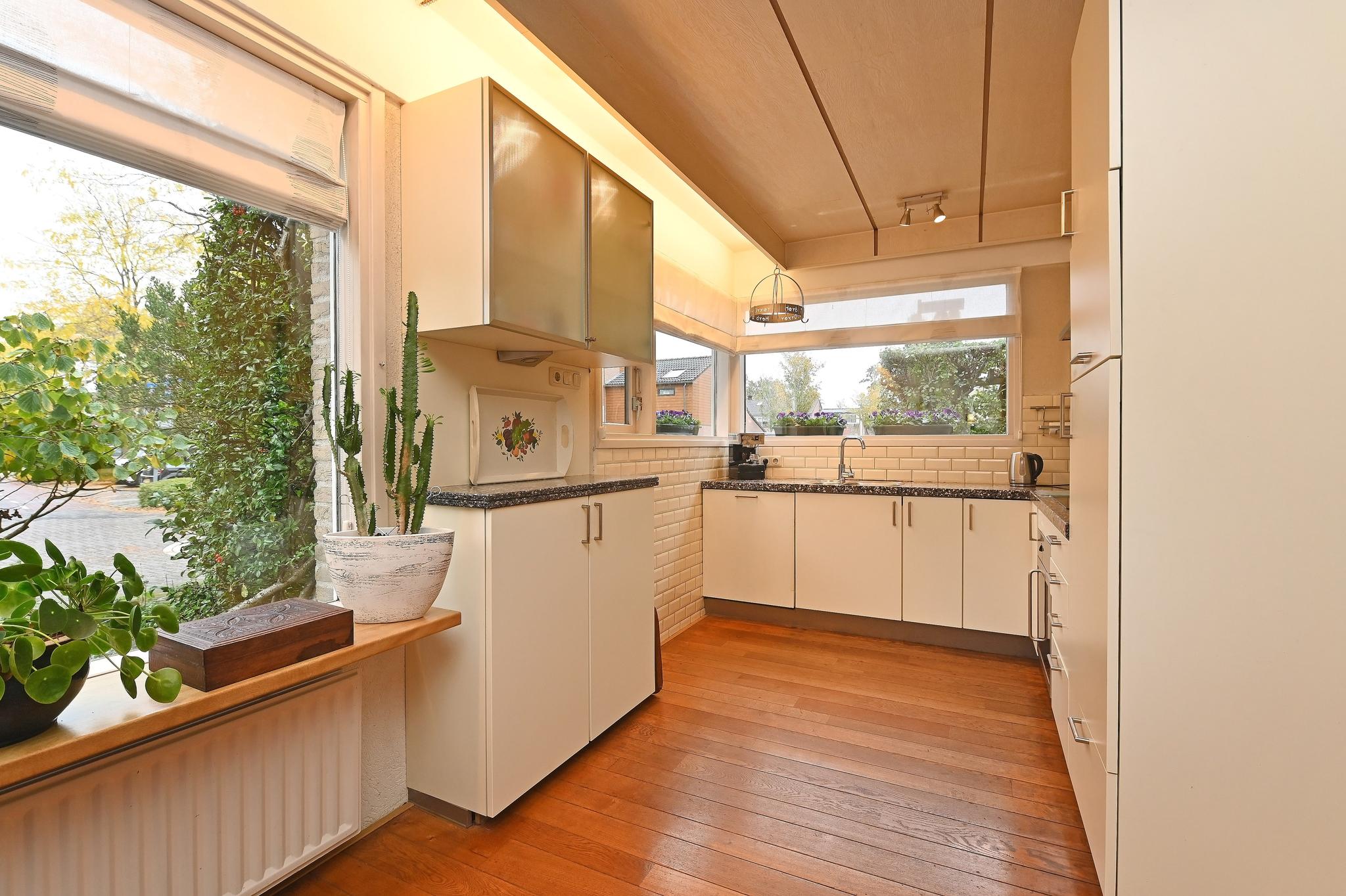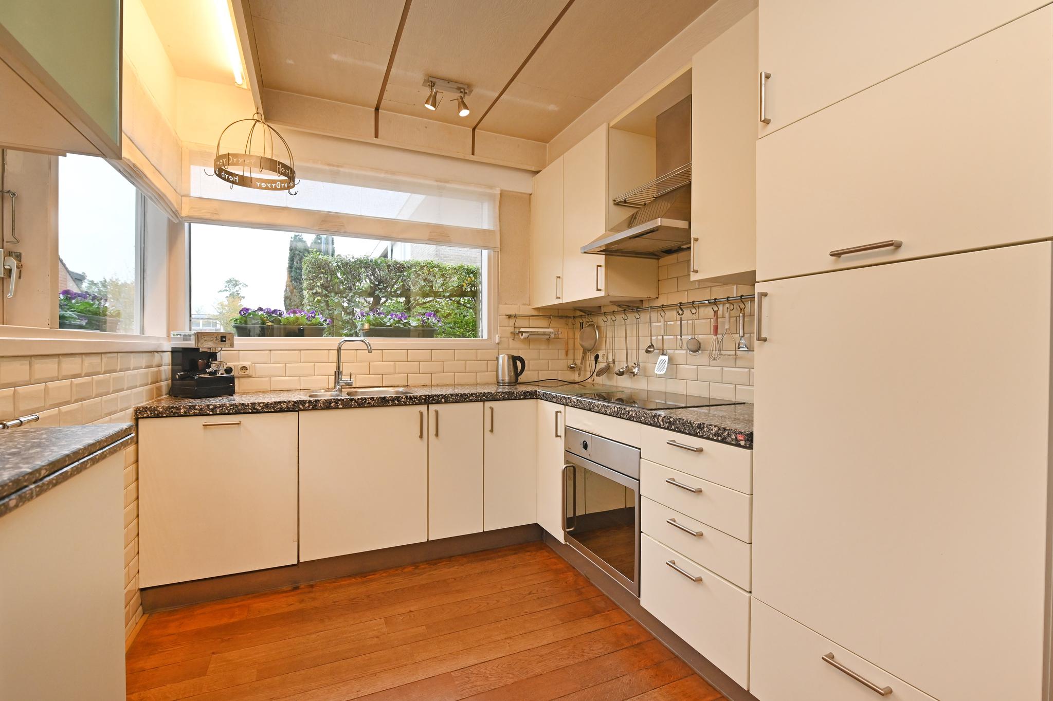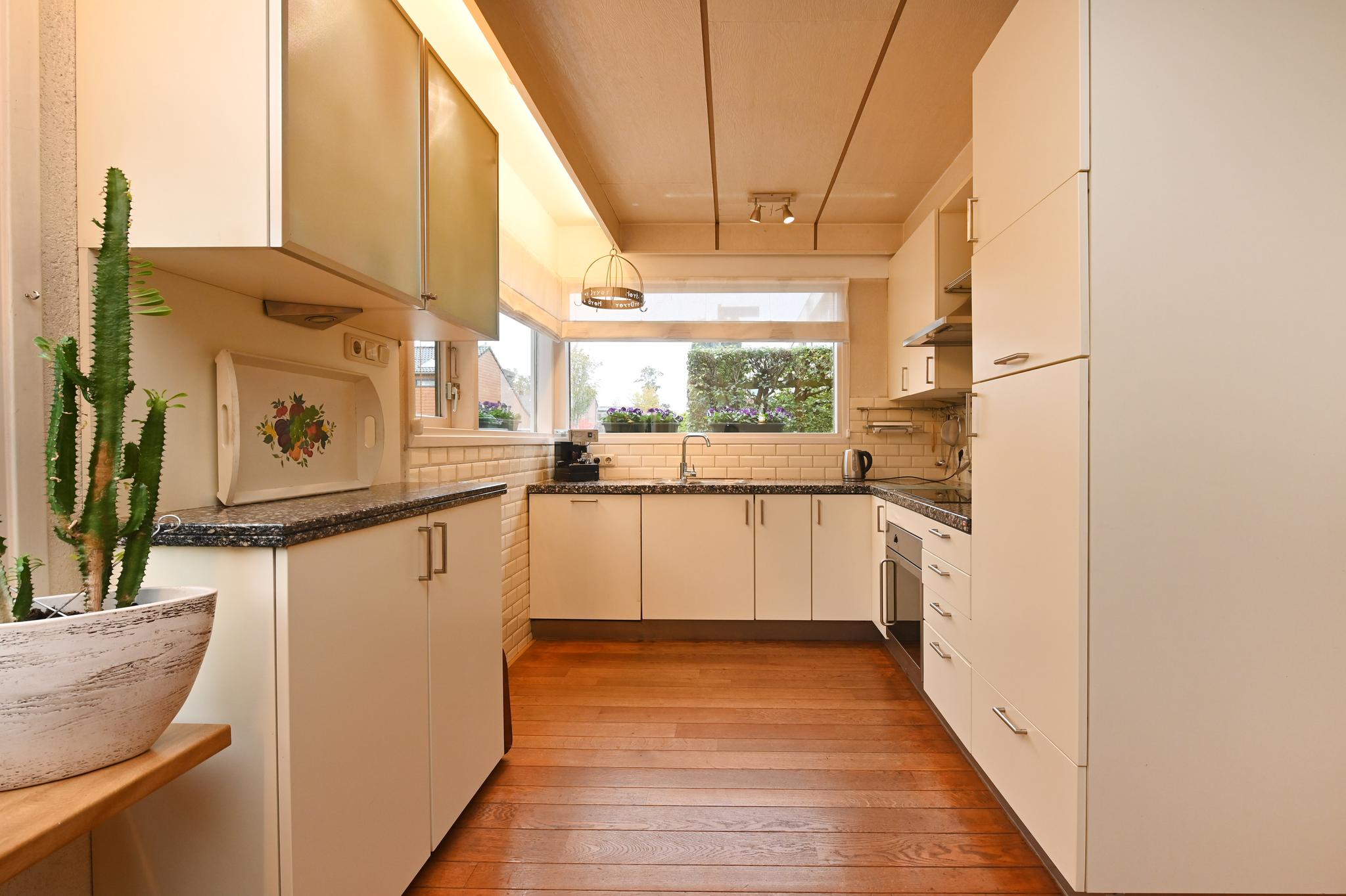 De open keuken aan de voorzijde is voorzien van alle gebruikelijke inbouwapparatuur. Er is meer dan voldoende ruimte voor een grote eethoek. De grote raampartijen verbinden de woonruimte met het groene buiten.