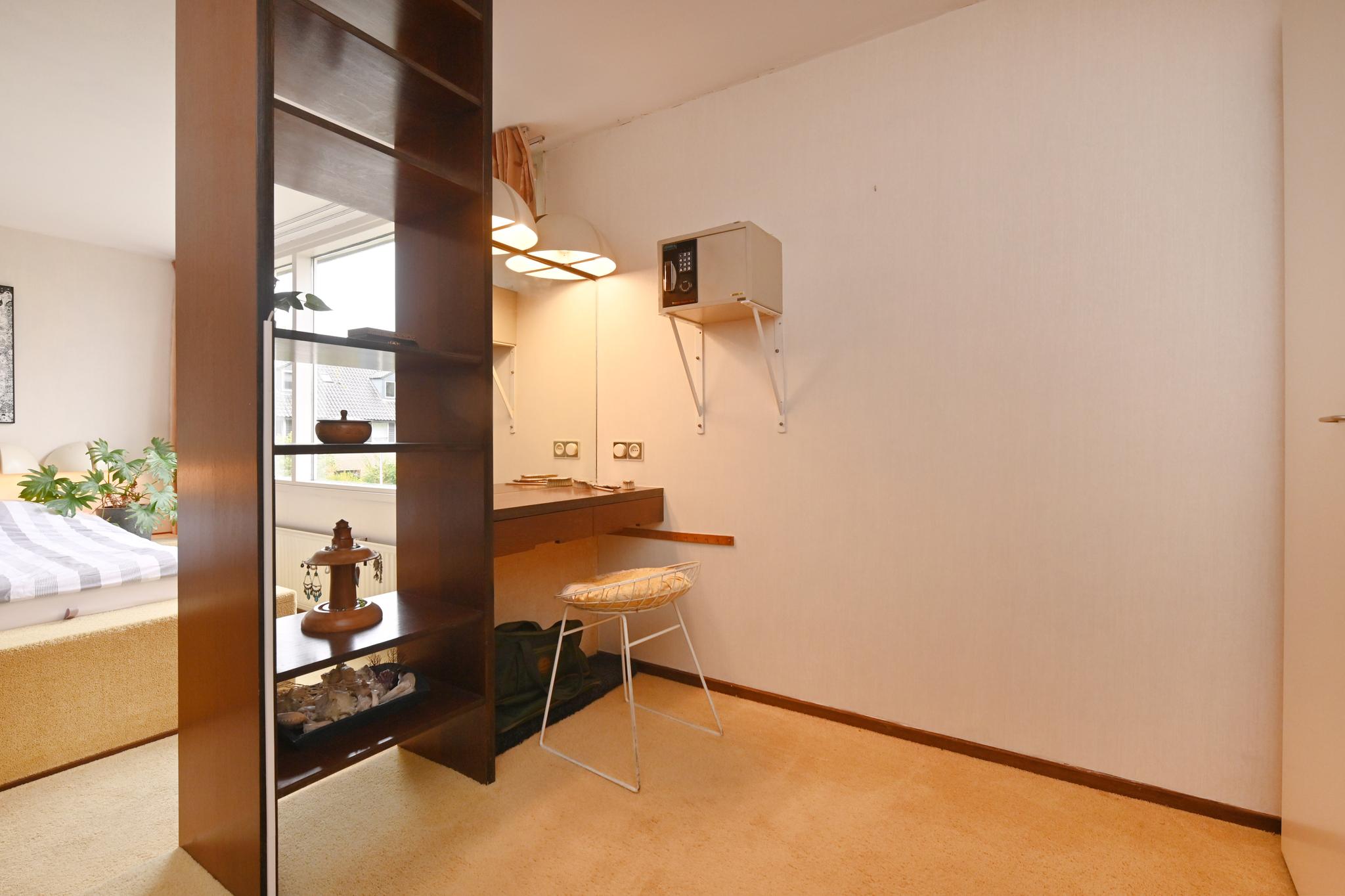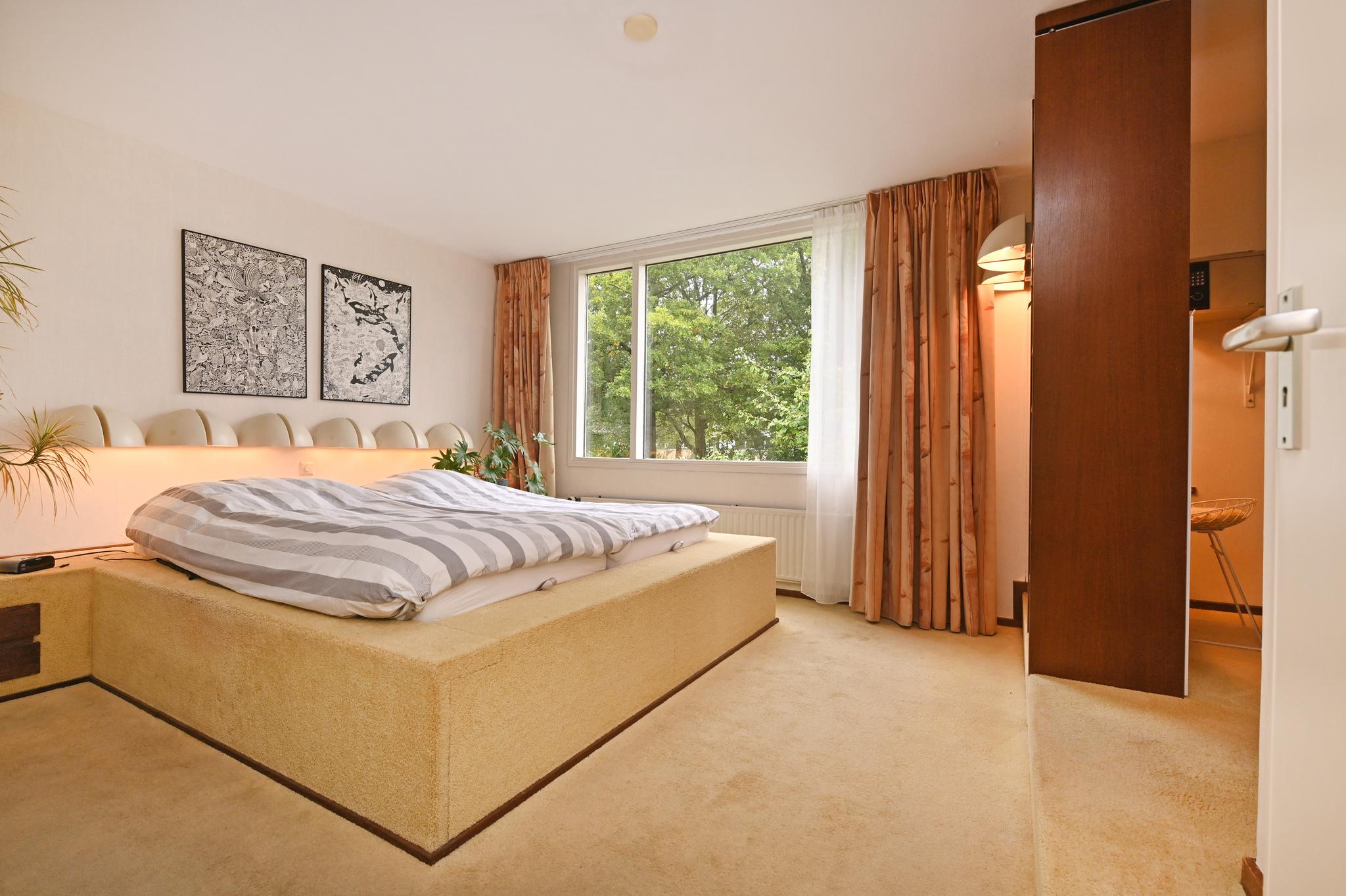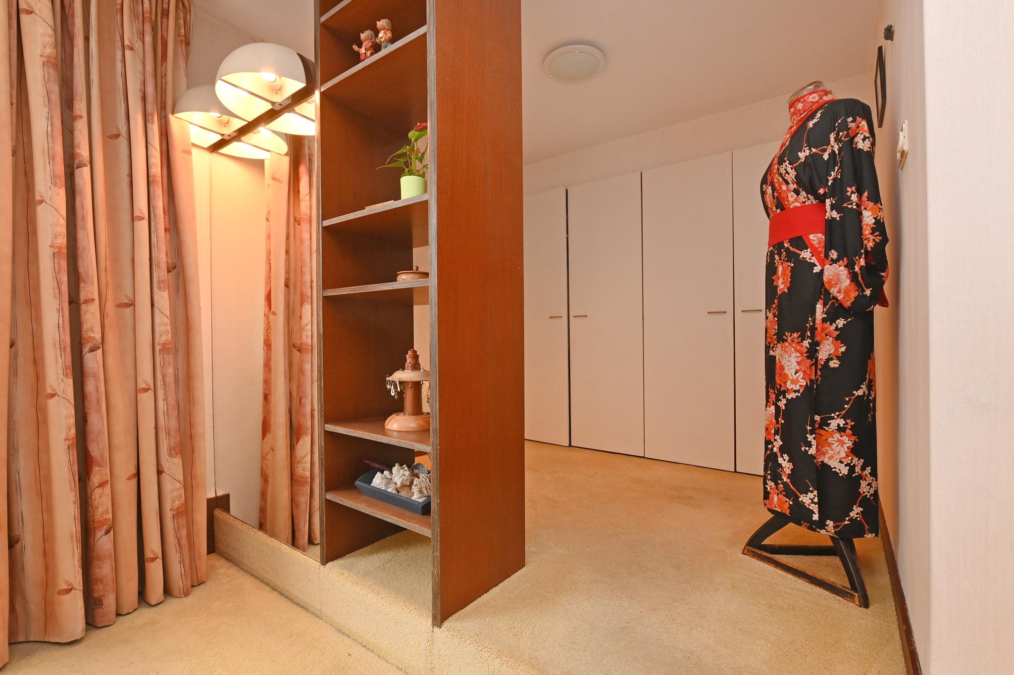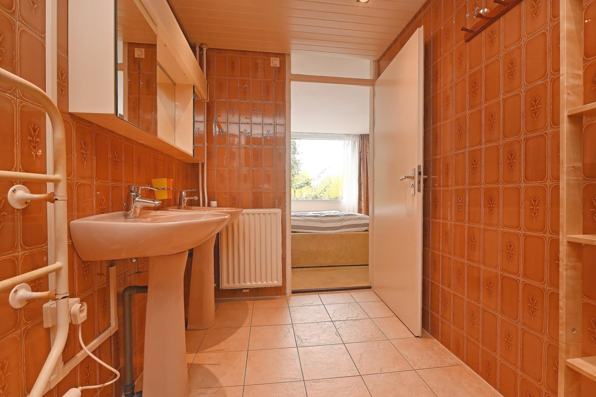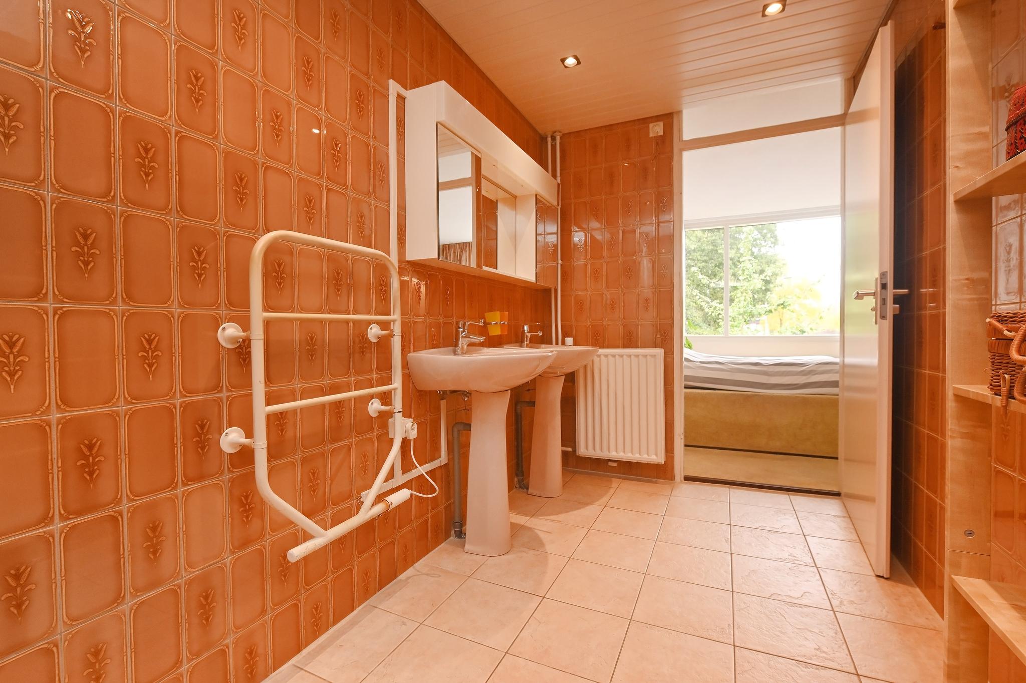 1e verdieping: Op de eerste verdieping bevinden zich twee ruime slaapkamers en twee badkamers. Vanuit de hoofdslaapkamer is de badkamer toegankelijk. Deze badkamer is nog in de stijl van de zeventiger jaren, goede kwaliteit, echter niet meer naar de modetrend van nu. De badkamer is voorzien van een ligbad, dubbele wastafel en een dakraam dat zorgt voor veel natuurlijk licht. De tweede badkamer is uitgerust met een douche en wastafel. Het toilet is separaat. De slaapkamer aan de achterzijde is eenvoudig weer terug te brengen naar de originele situatie met 2 slaapkamers. Wat deze woning standaard heeft is een aparte wasruimte.