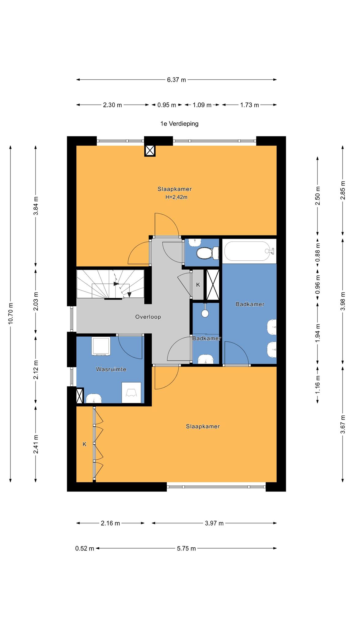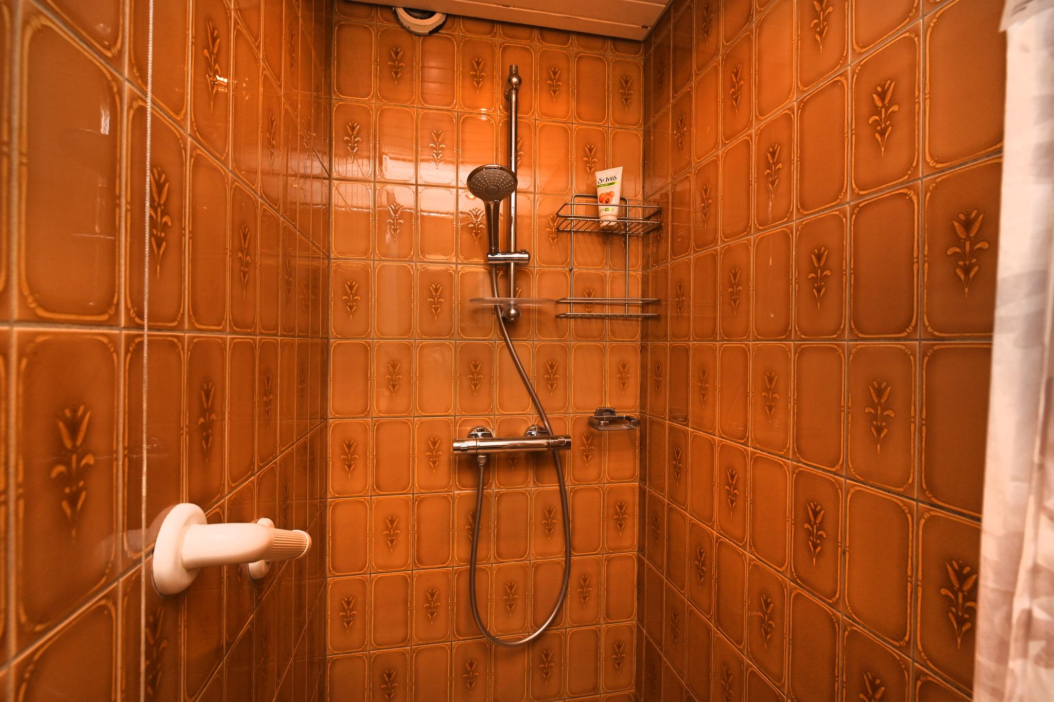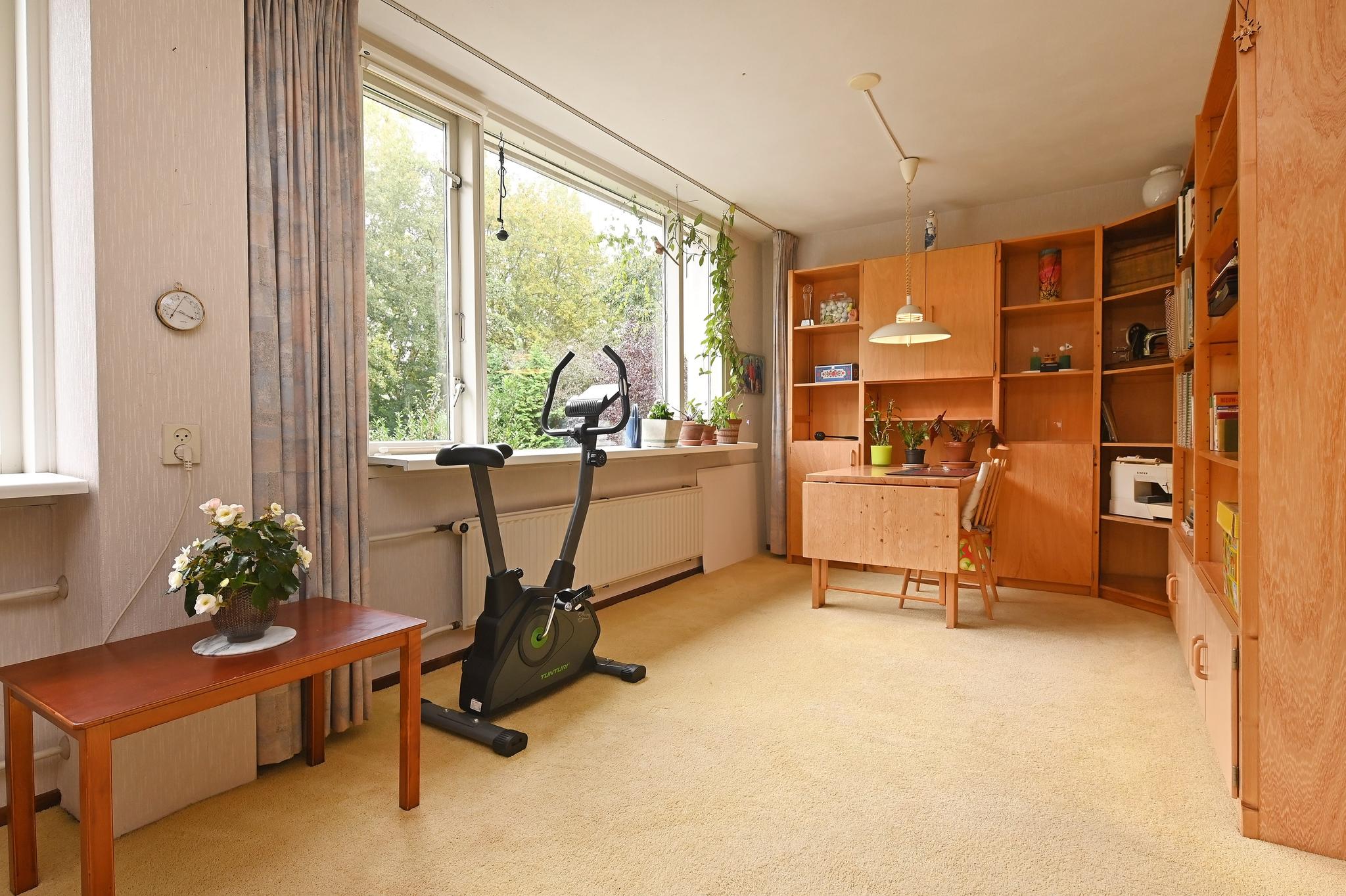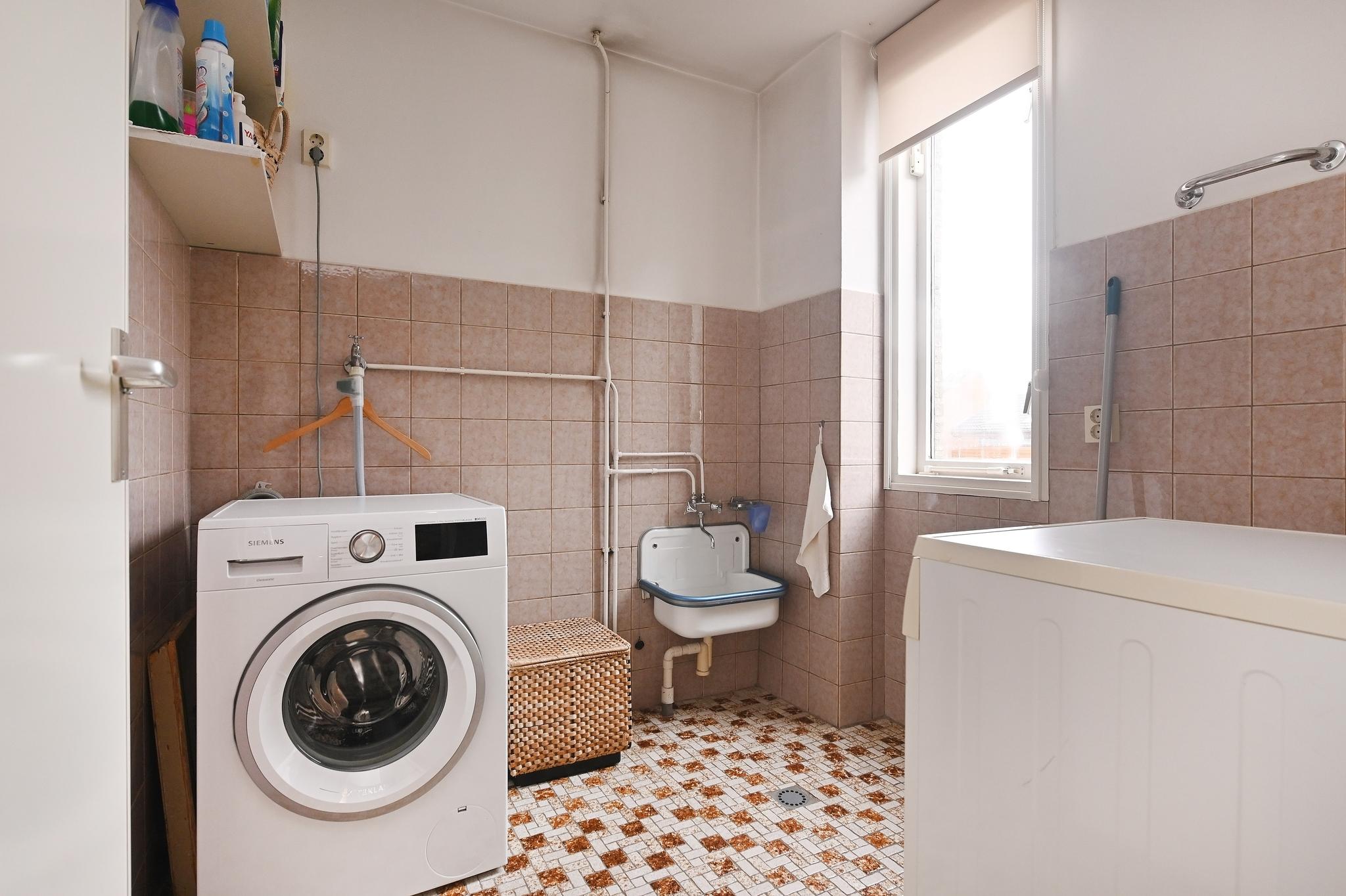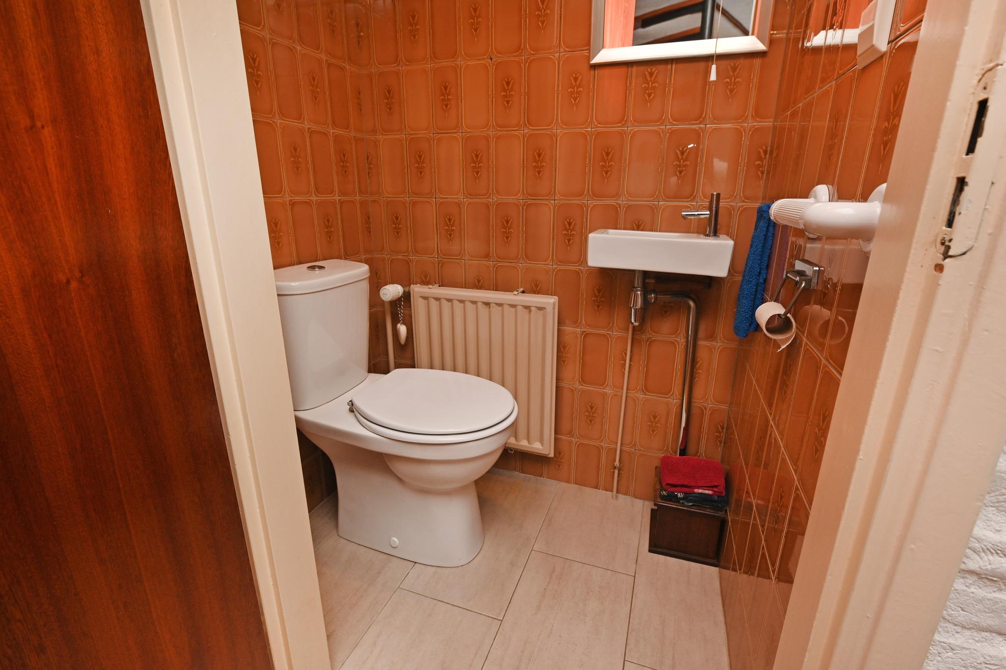 1e verdieping: Op de eerste verdieping bevinden zich twee ruime slaapkamers en twee badkamers. Vanuit de hoofdslaapkamer is de badkamer toegankelijk. Deze badkamer is nog in de stijl van de zeventiger jaren, goede kwaliteit, echter niet meer naar de modetrend van nu. De badkamer is voorzien van een ligbad, dubbele wastafel en een dakraam dat zorgt voor veel natuurlijk licht. De tweede badkamer is uitgerust met een douche en wastafel. Het toilet is separaat. De slaapkamer aan de achterzijde is eenvoudig weer terug te brengen naar de originele situatie met 2 slaapkamers. Wat deze woning standaard heeft is een aparte wasruimte.