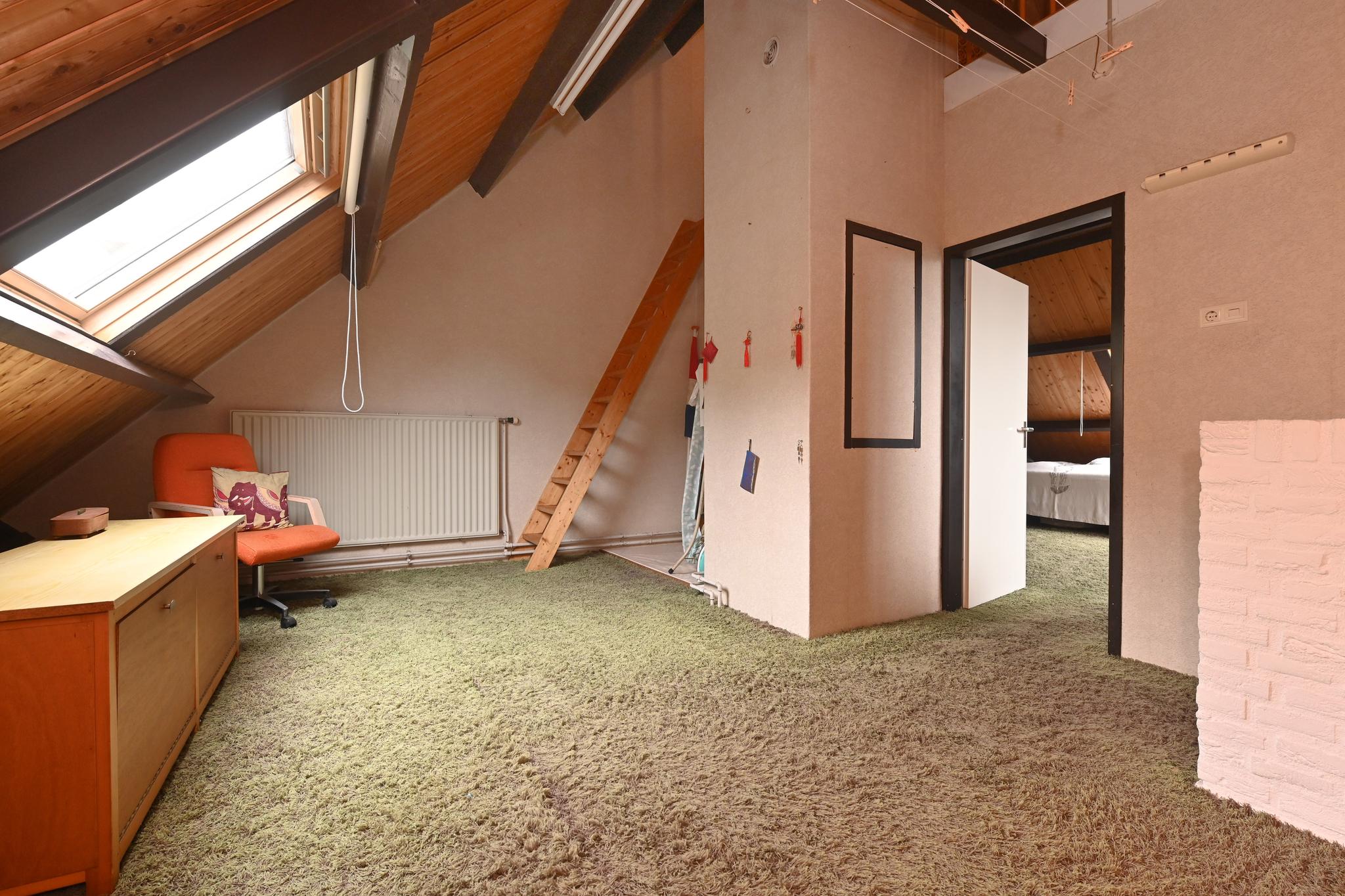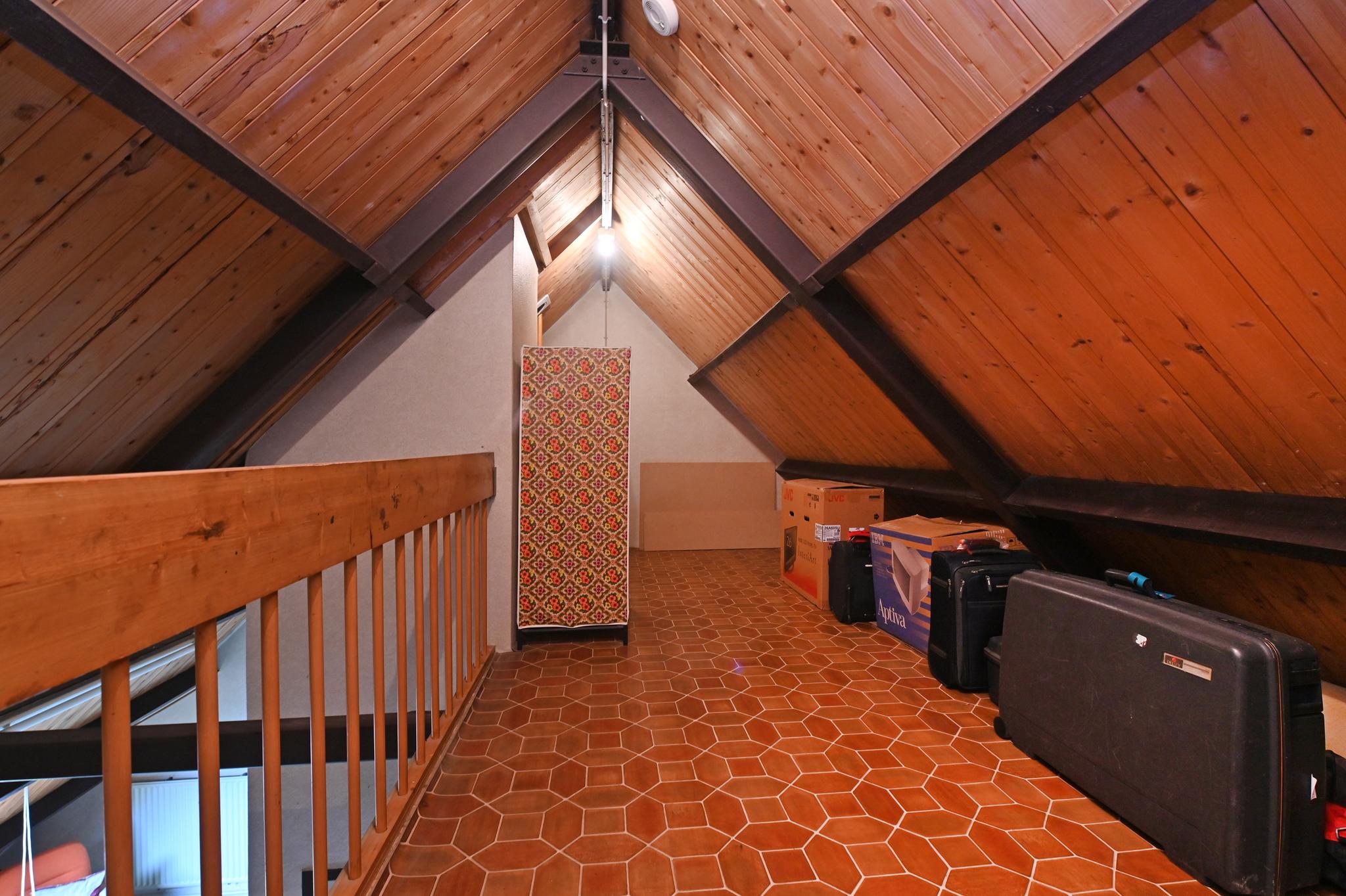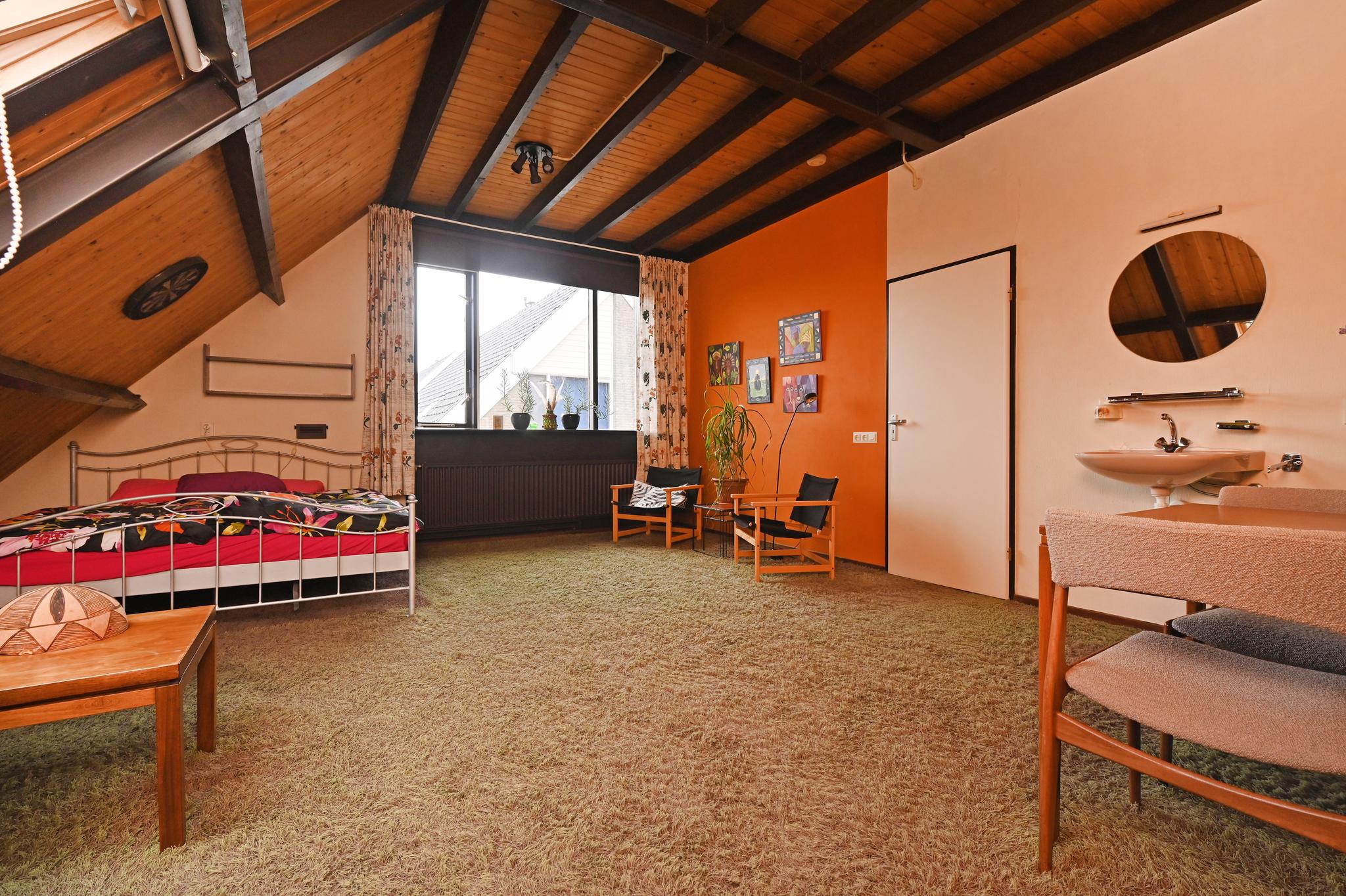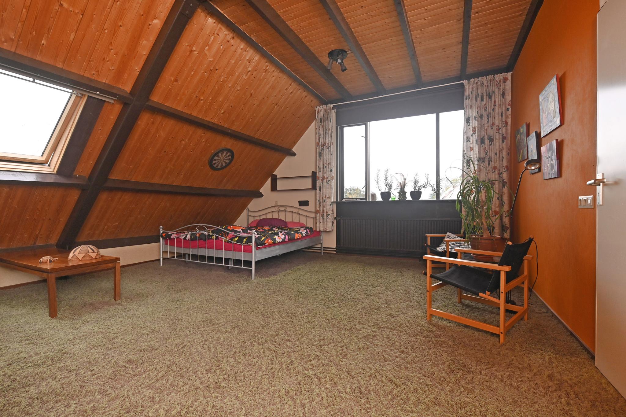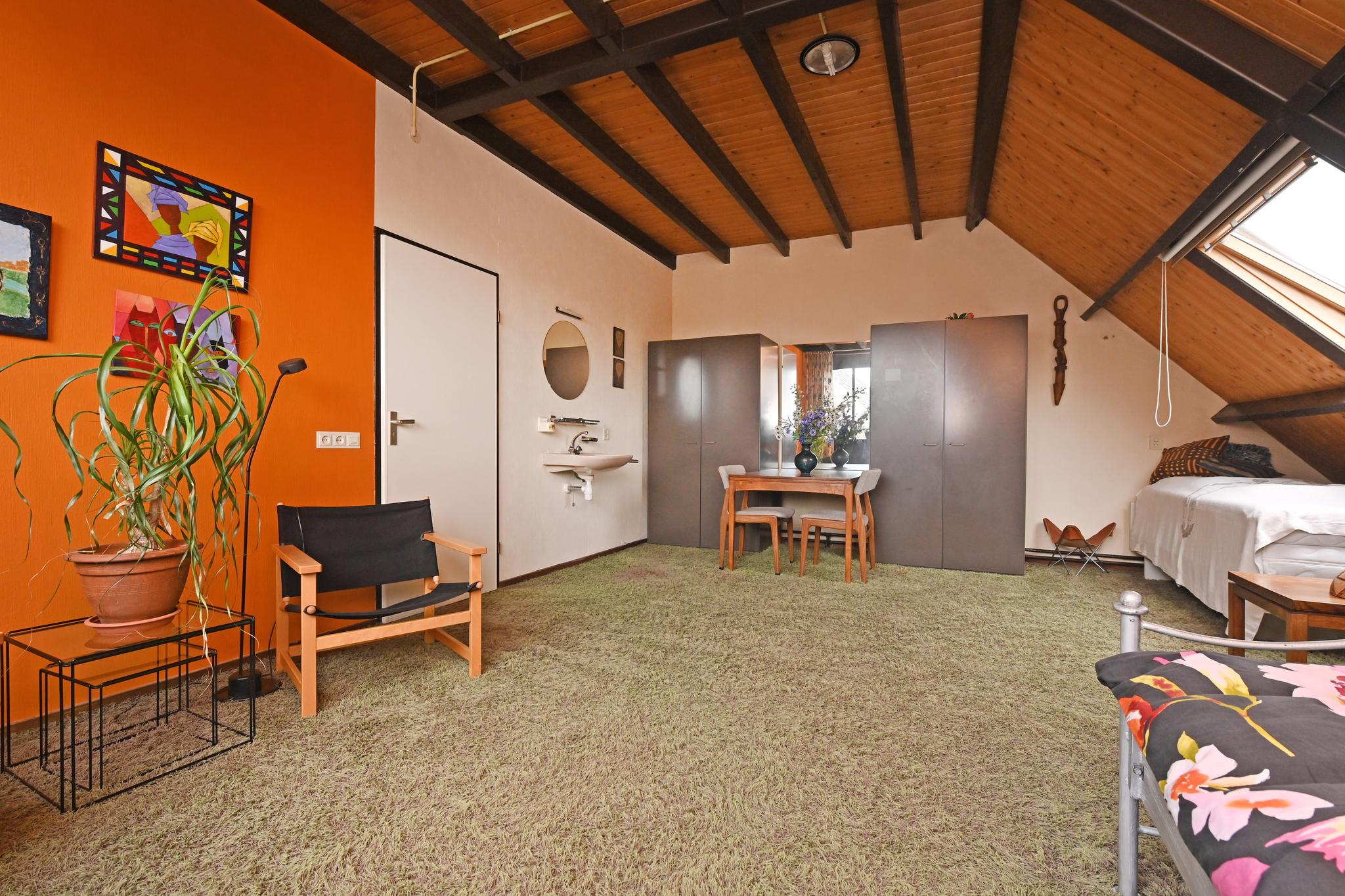 2e verdieping: Deze verdieping biedt nog eens een grote slaapkamer, qua ruimte is het bijna een grote hotelsuite. studio. Deze enorme slaapkamer is nog zeker te splitsen in twee slaapkamers! Daarnaast een open ruimte met een houten inloopkast, door de huidige eigenaar als wijnkast/opslagruimte in gebruik. Via een steektrap is de vliering op stahoogte te bereiken.