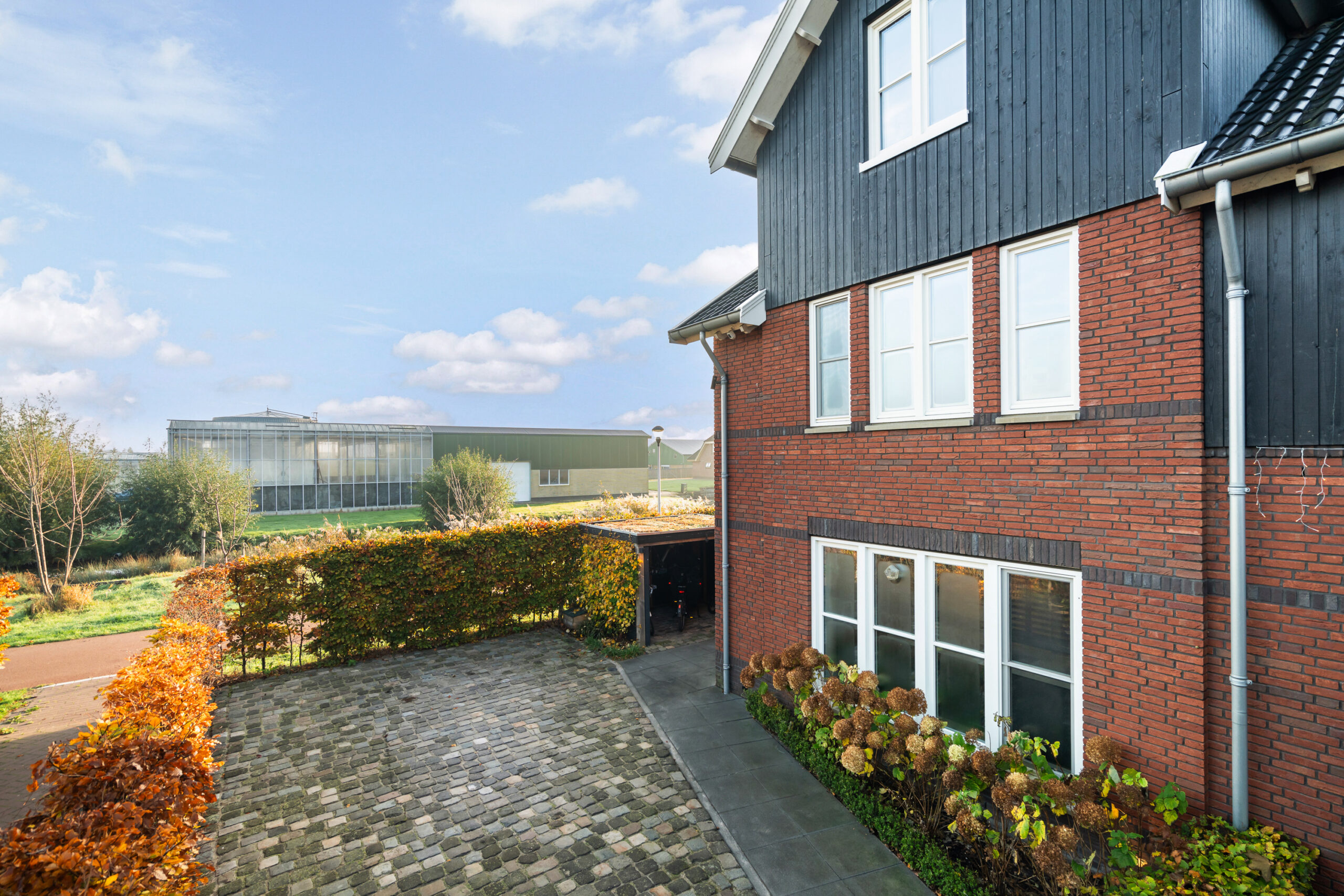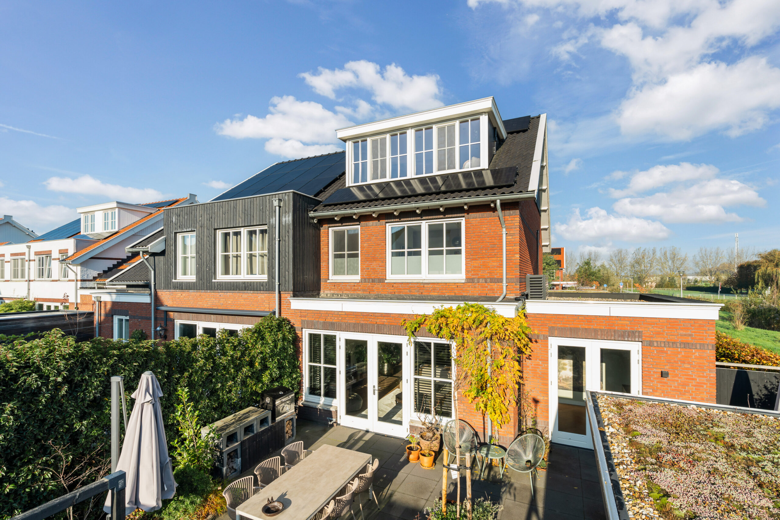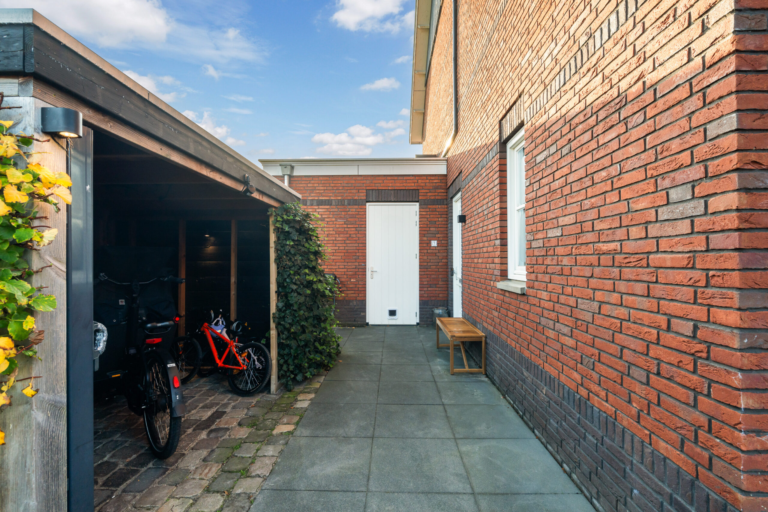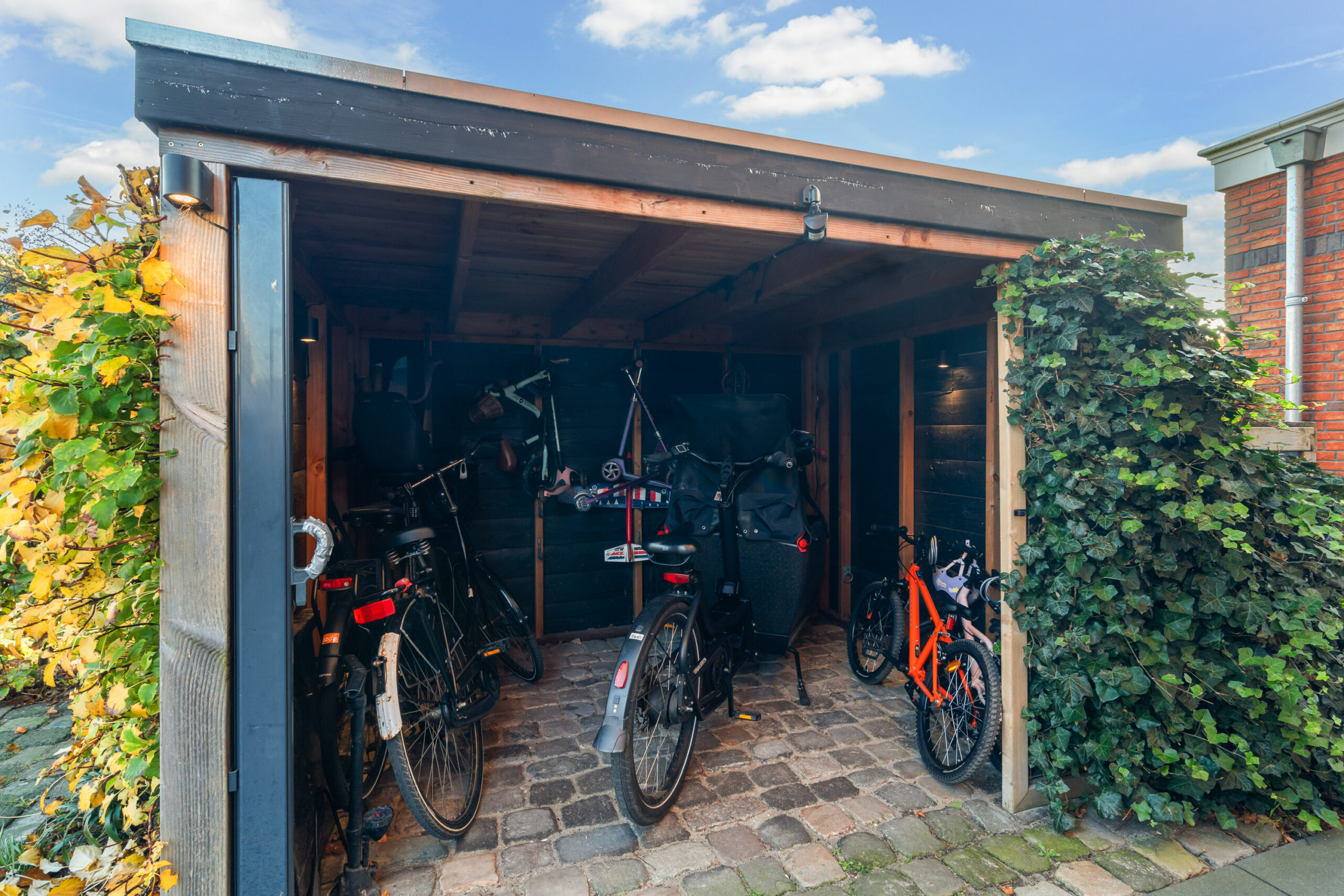 Aan de voorzijde beschikt de woning over een ruime oprit met parkeergelegenheid voor twee tot drie auto’s, ideaal bij bijvoorbeeld verjaardagen of bezoek. Daarnaast is er een extra houten fietsenberging met verlichting, eveneens uitgevoerd met een sedumdak.
