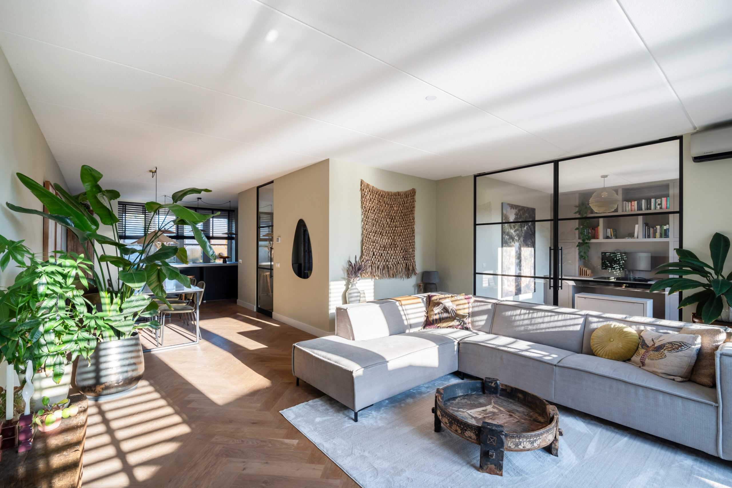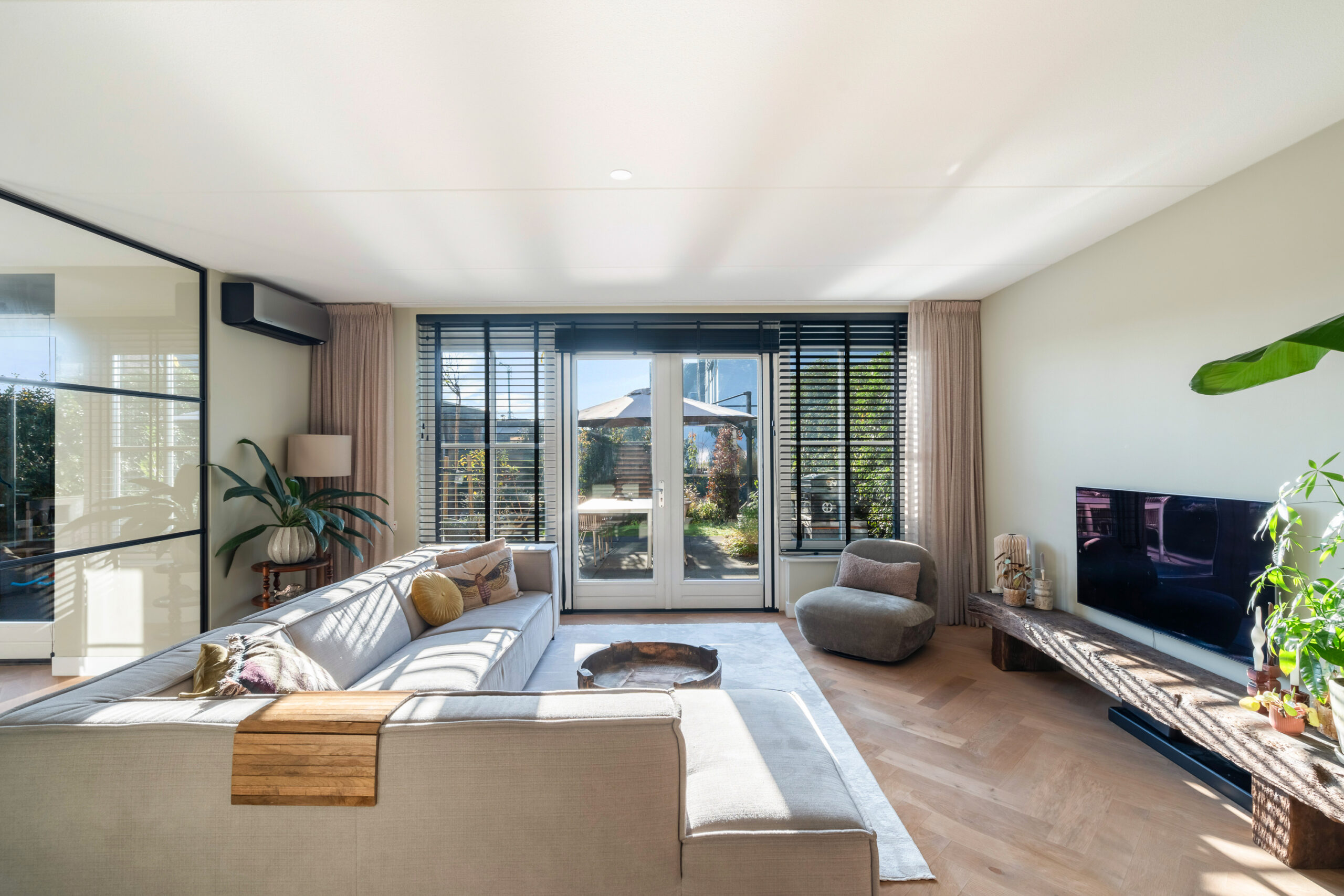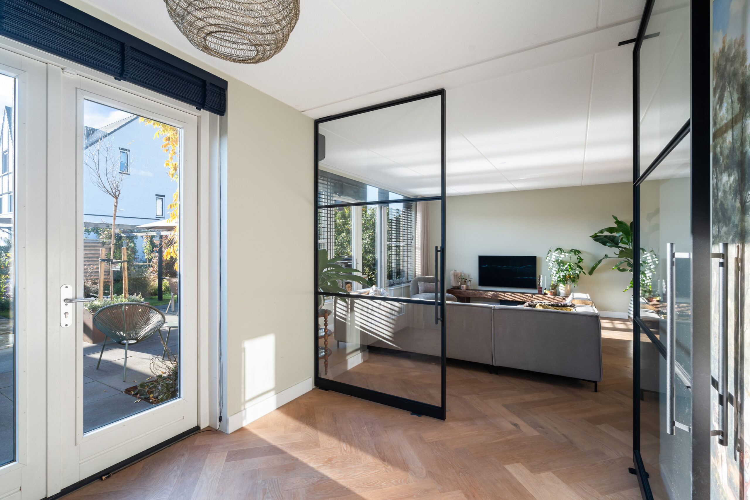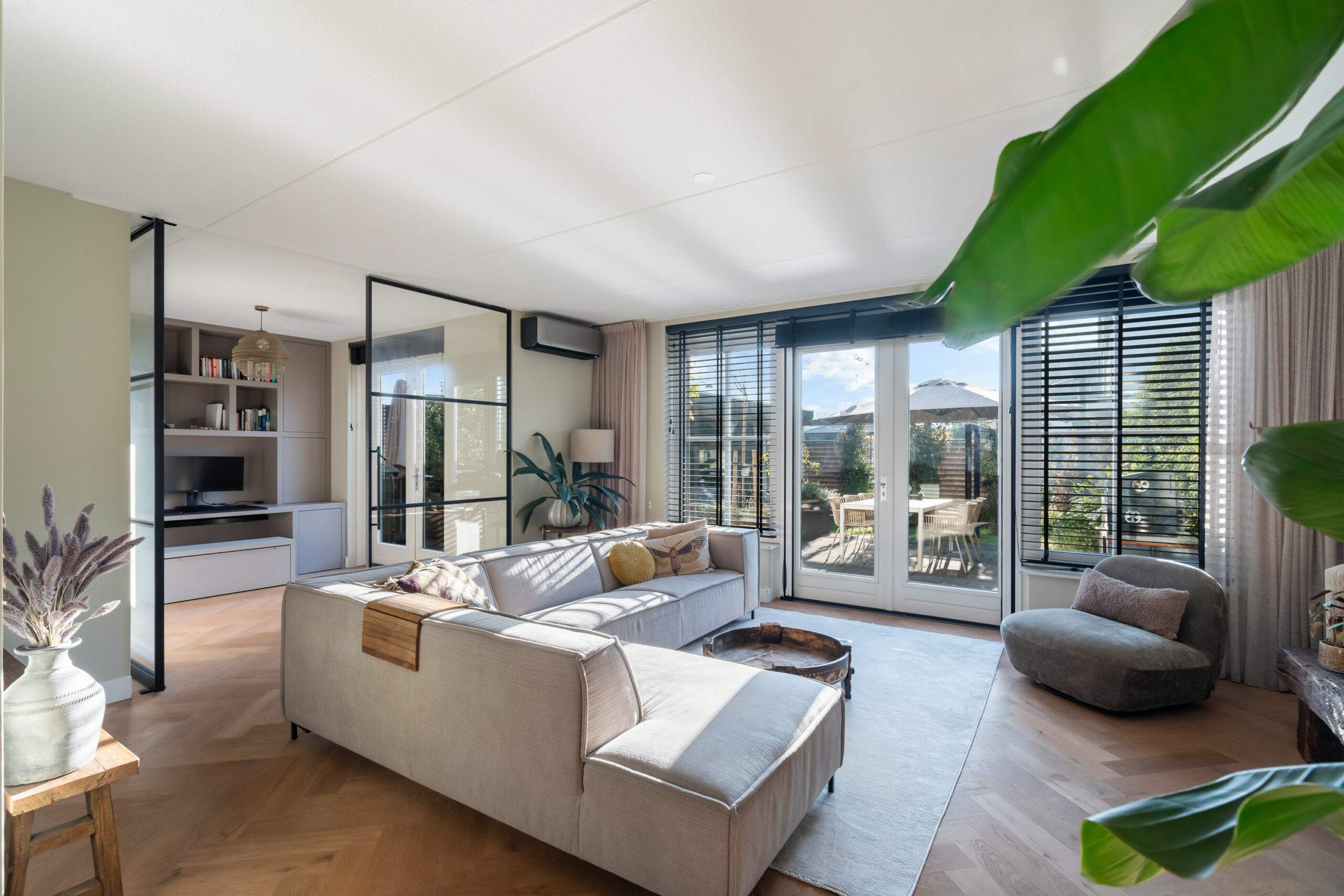 Entree/hal met meterkast, modern toilet en een binnen doorgang naar de berging. Via de hal bereikt u de ruime, lichte woonkamer met houten visgraatvloer, airconditioning en grote raampartijen. De extra werk-/speelkamer is af te sluiten met zwarte stalen deuren, net als de deur in de hal. Aan de voorzijde ligt de moderne matzwarte keuken met grijs composiet blad, inductiekookplaat, Siemens-apparatuur en Quooker. De gehele begane grond is voorzien van vloerverwarming als hoofdverwarming.