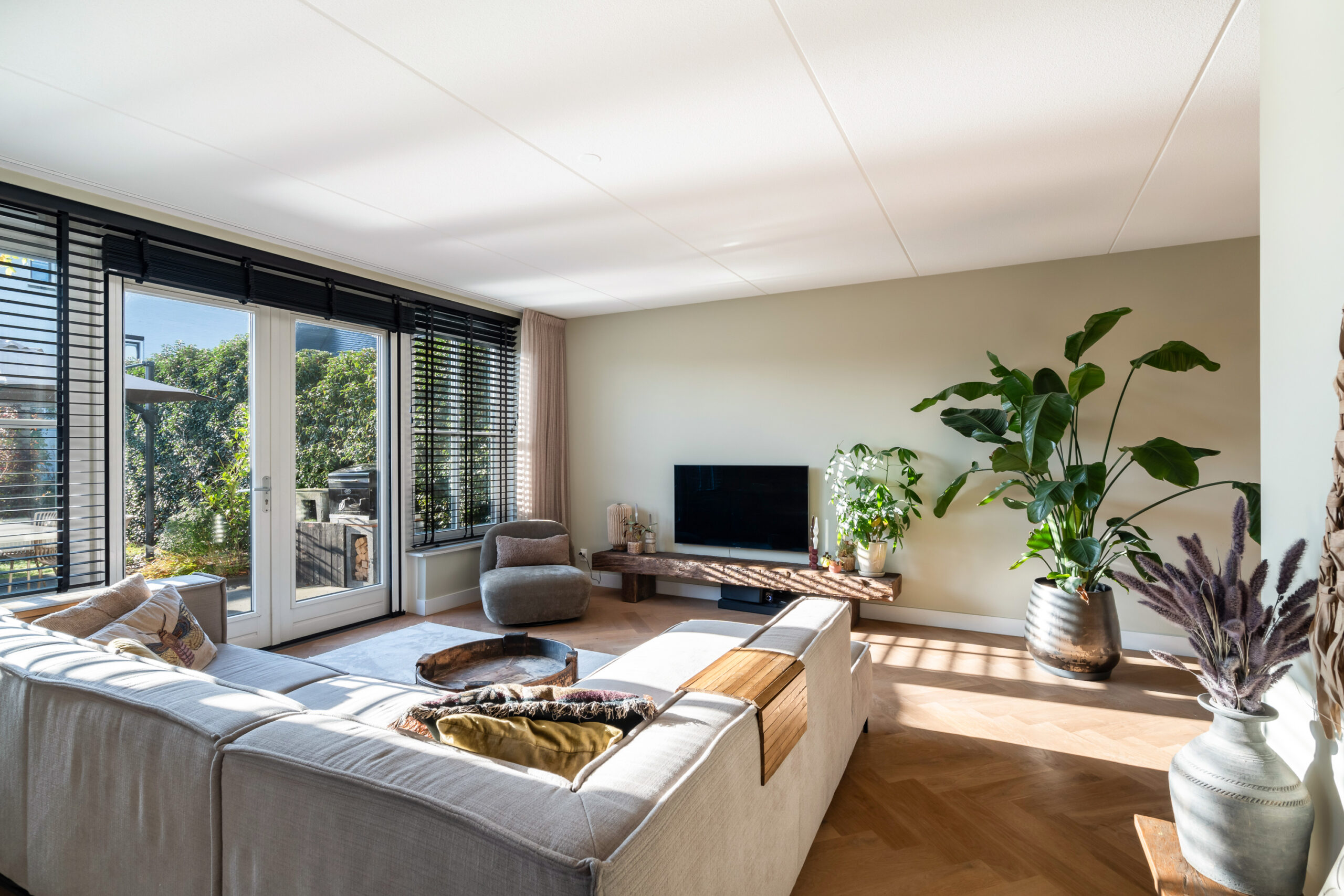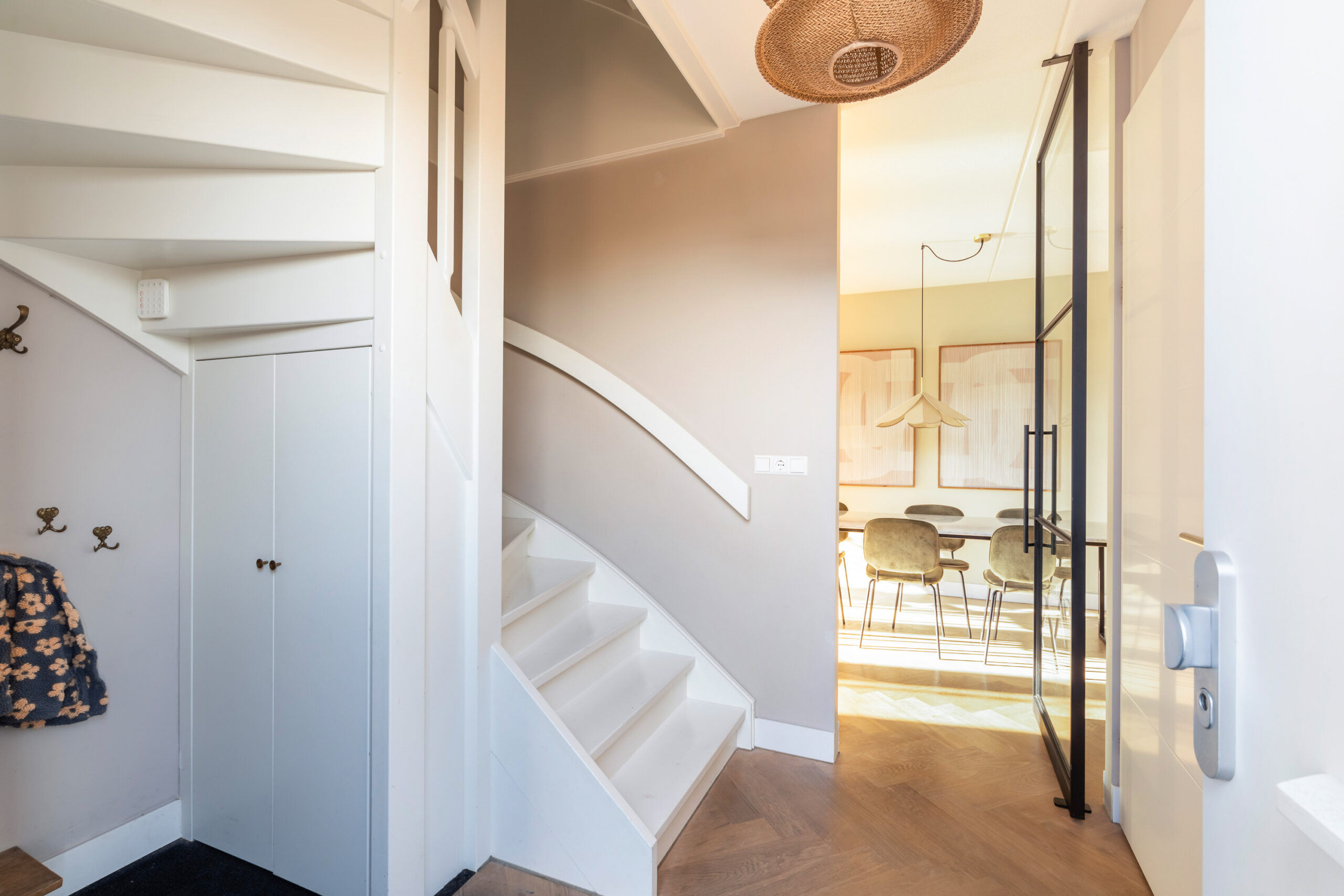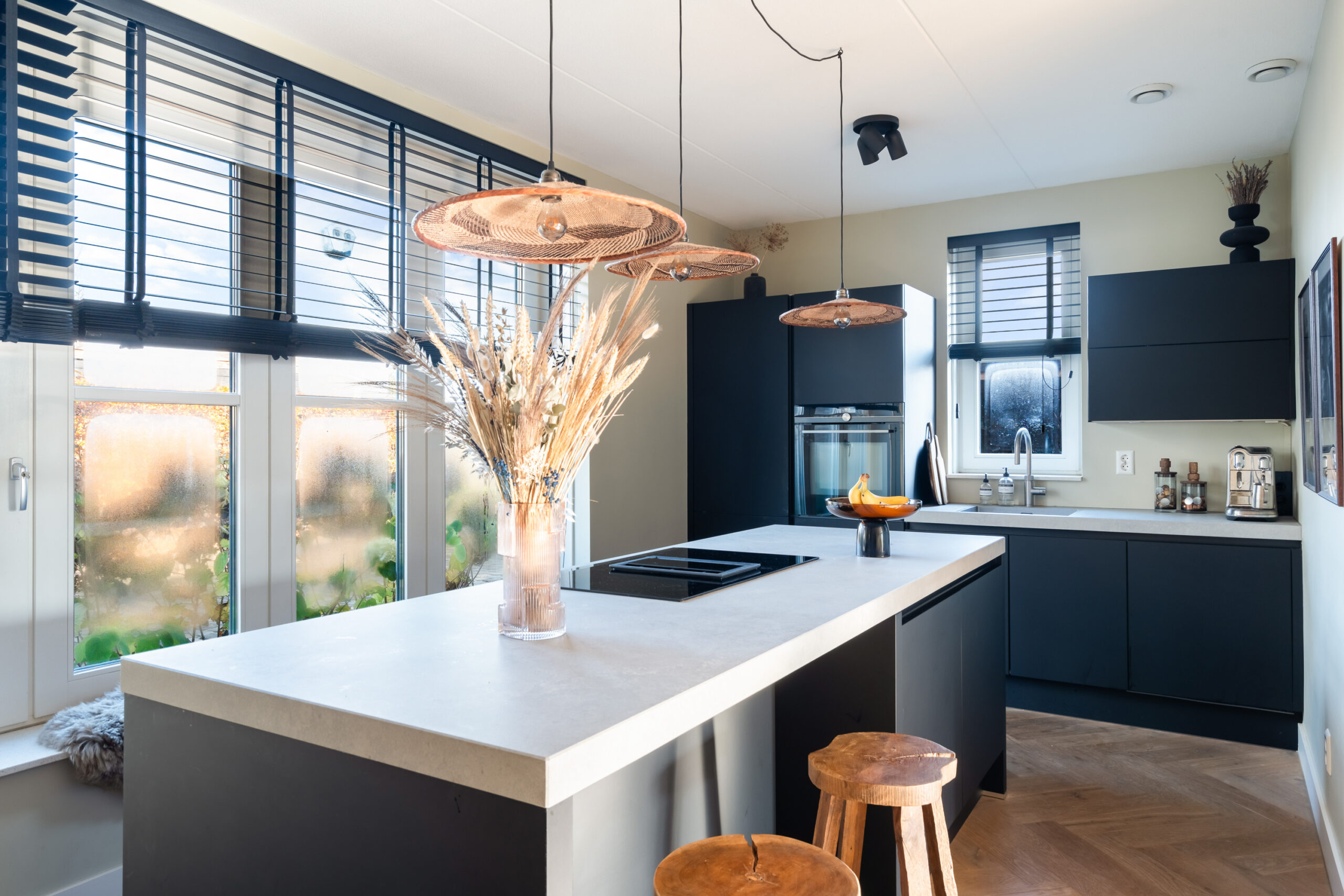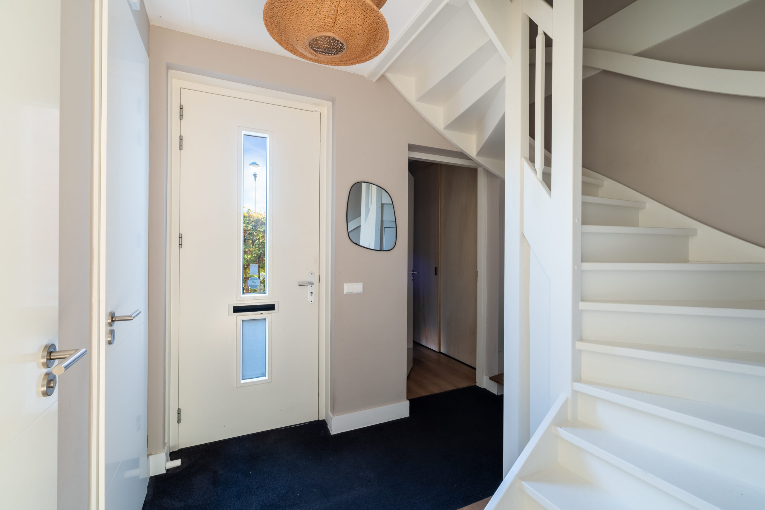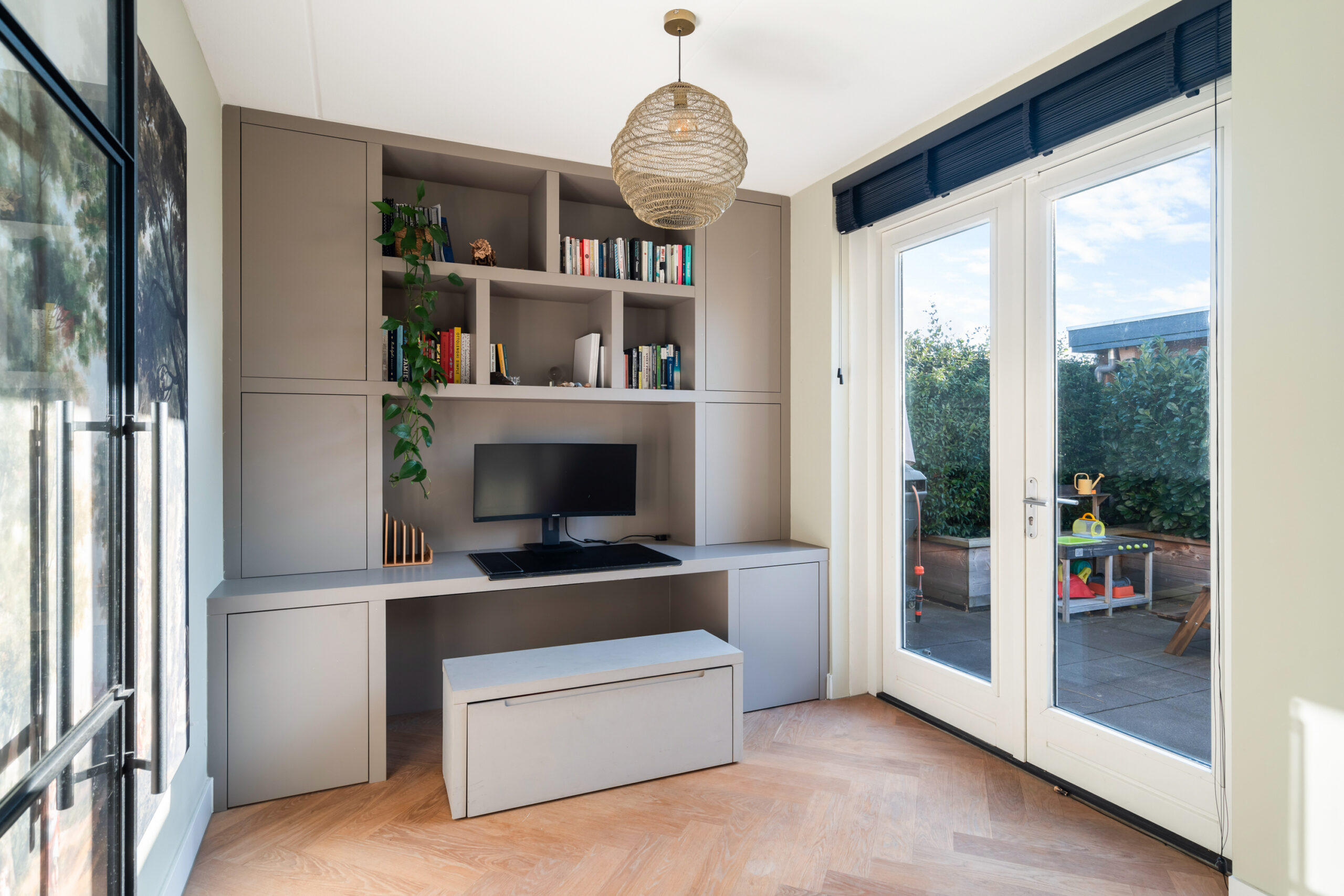 Entree/hal met meterkast, modern toilet en een binnen doorgang naar de berging. Via de hal bereikt u de ruime, lichte woonkamer met houten visgraatvloer, airconditioning en grote raampartijen. De extra werk-/speelkamer is af te sluiten met zwarte stalen deuren, net als de deur in de hal. Aan de voorzijde ligt de moderne matzwarte keuken met grijs composiet blad, inductiekookplaat, Siemens-apparatuur en Quooker. De gehele begane grond is voorzien van vloerverwarming als hoofdverwarming.