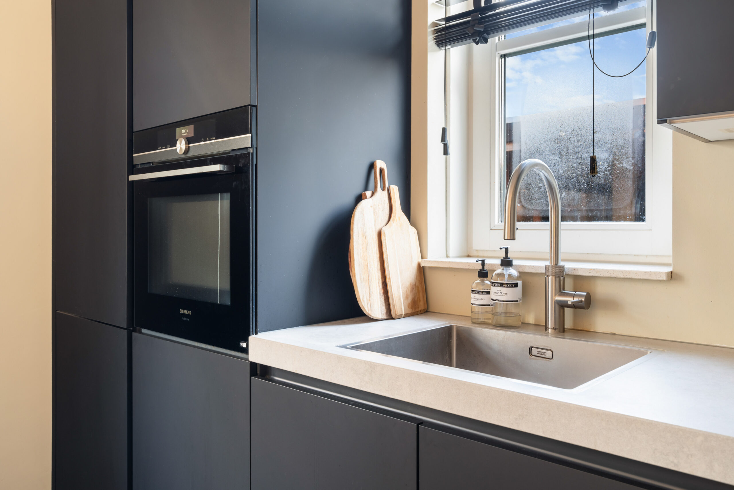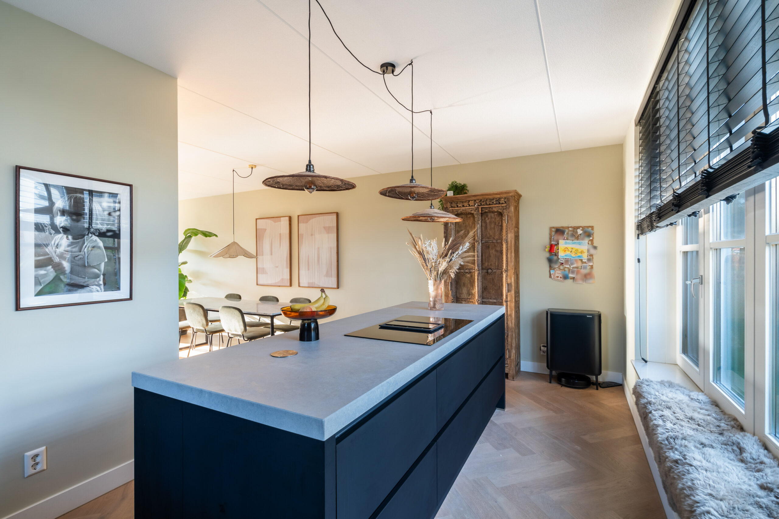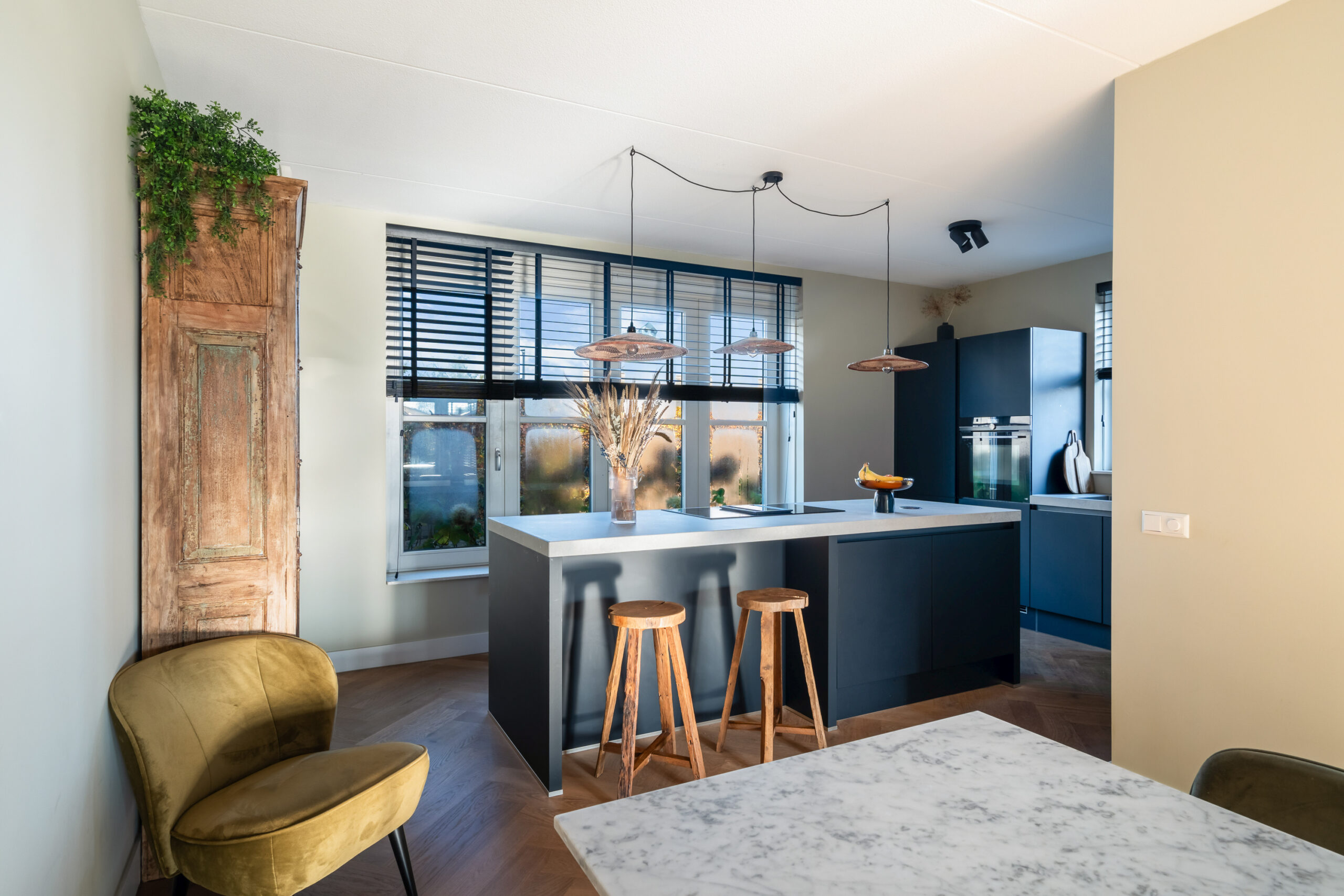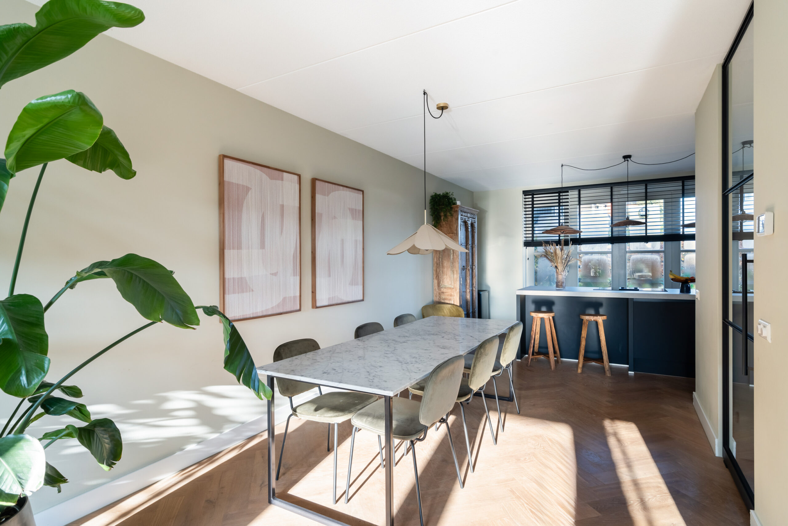 Entree/hal met meterkast, modern toilet en een binnen doorgang naar de berging. Via de hal bereikt u de ruime, lichte woonkamer met houten visgraatvloer, airconditioning en grote raampartijen. De extra werk-/speelkamer is af te sluiten met zwarte stalen deuren, net als de deur in de hal. Aan de voorzijde ligt de moderne matzwarte keuken met grijs composiet blad, inductiekookplaat, Siemens-apparatuur en Quooker. De gehele begane grond is voorzien van vloerverwarming als hoofdverwarming.