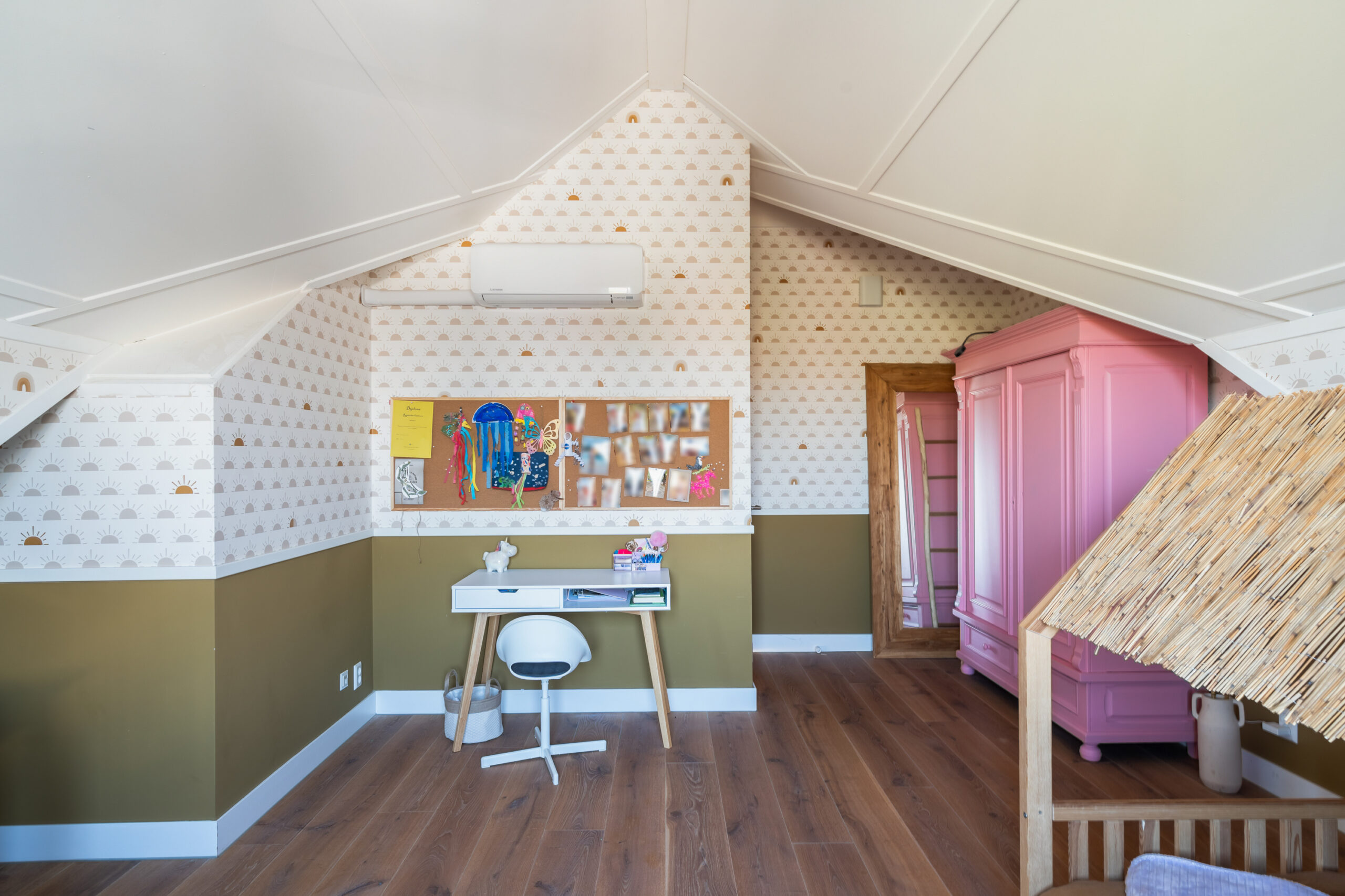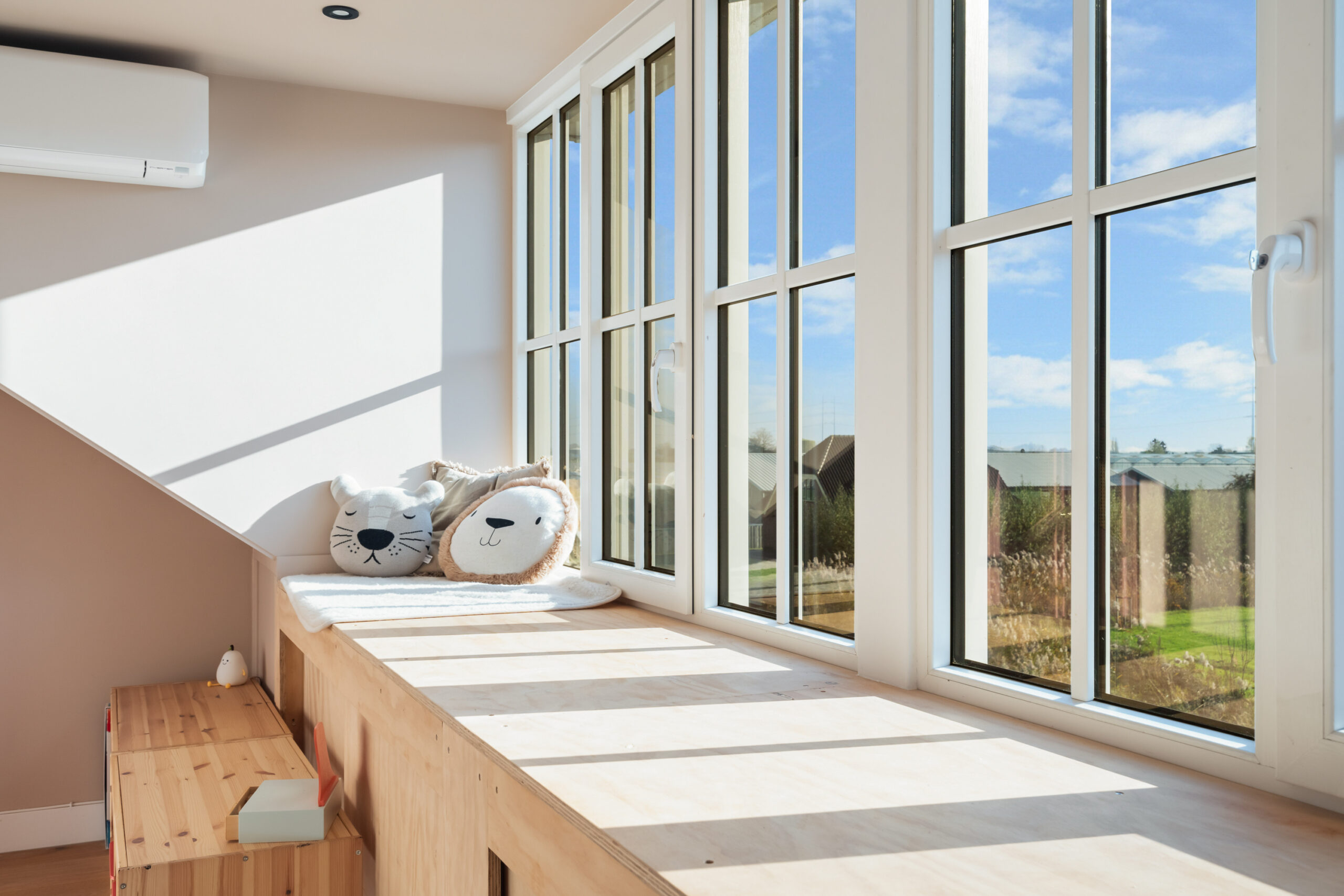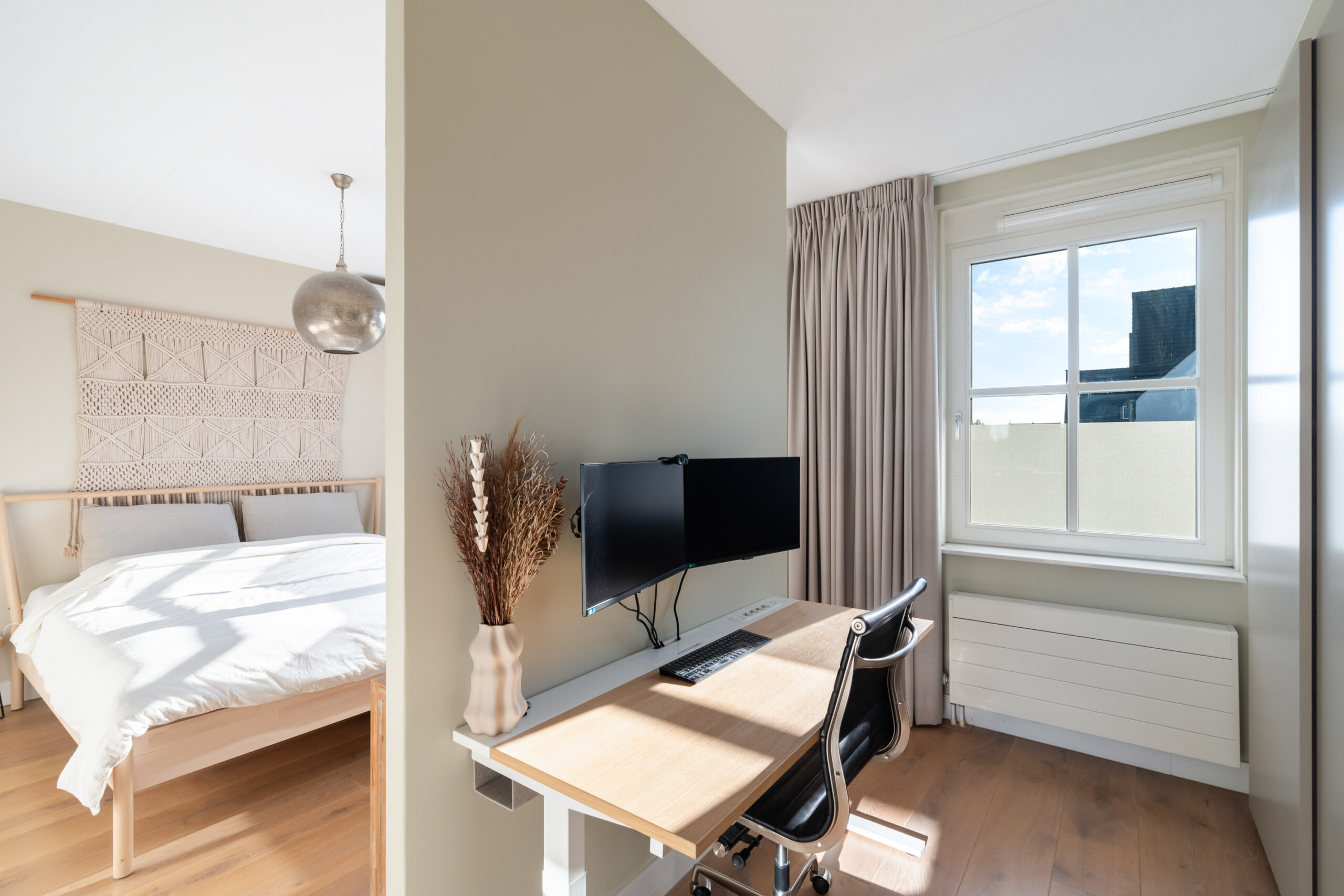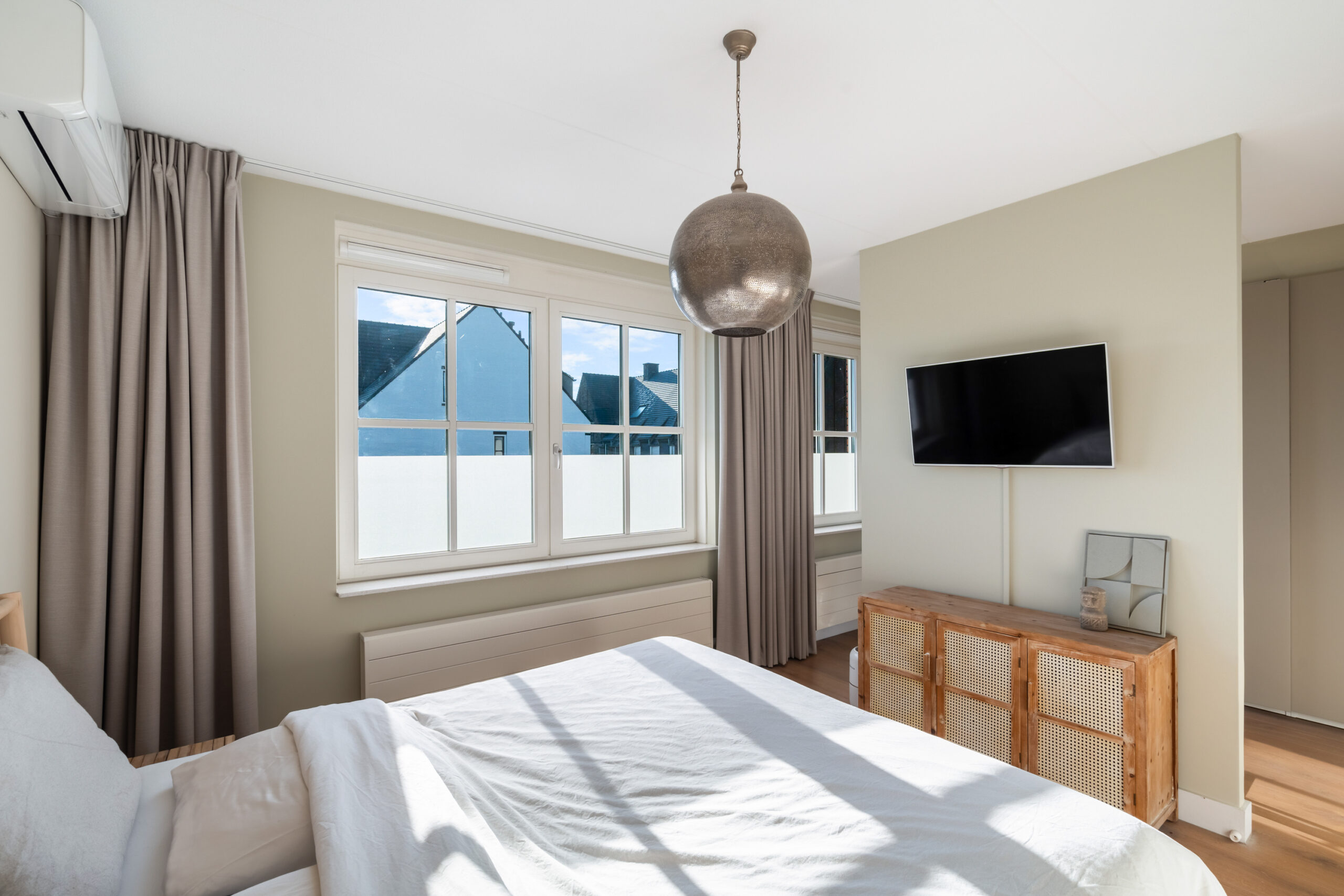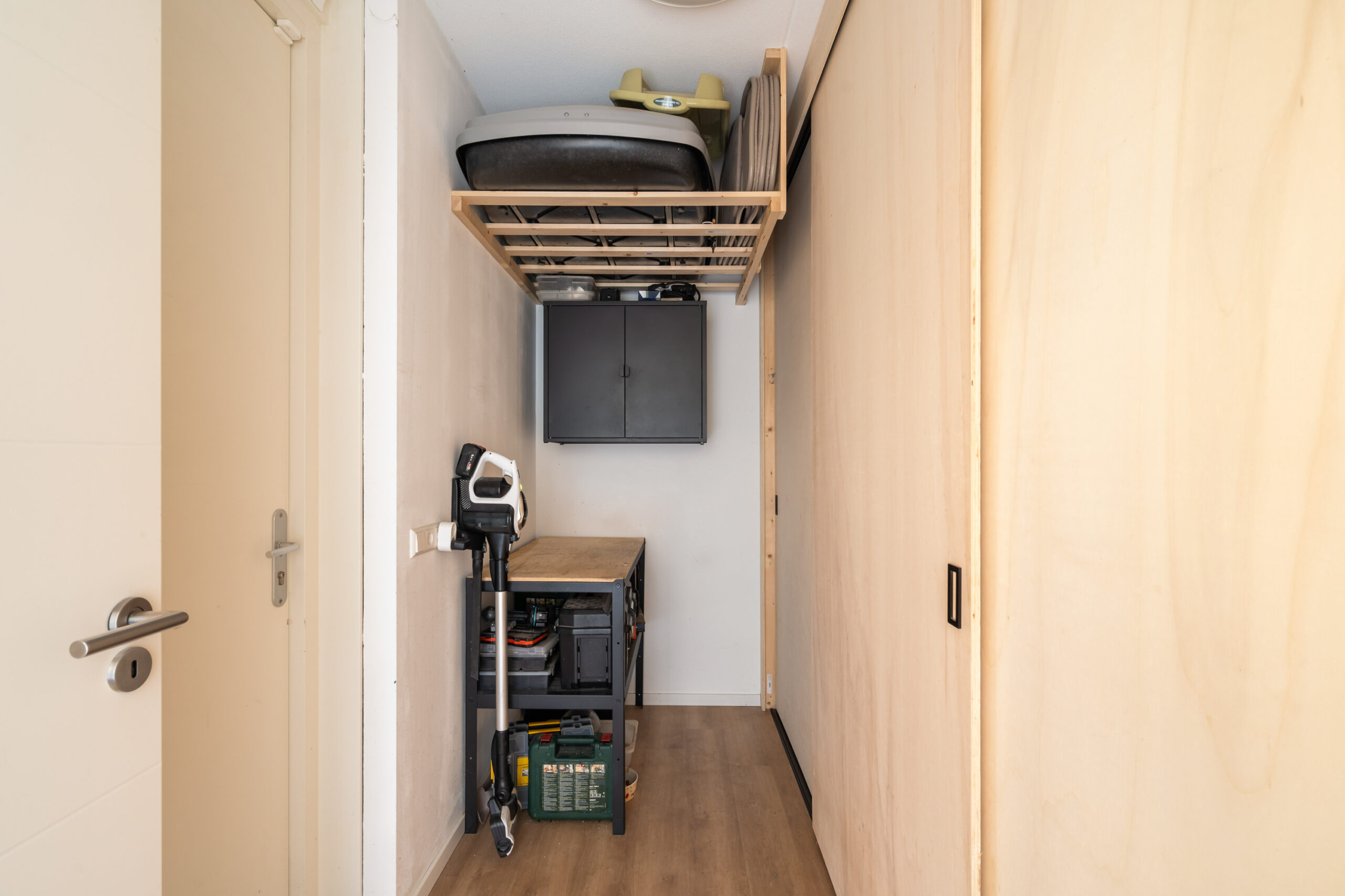 Overloop met was-/stookruimte en toegang tot de derde en vierde ruime slaapkamer. Beide kamers beschikken over airconditioning en veel bergruimte. De slaapkamer aan de voorzijde ligt in de nok, waardoor het hoge plafond voor een extra ruimtelijk gevoel zorgt. De slaapkamer aan de achterzijde is voorzien van een kunststof dakkapel met spots en elektrisch rolluik, wat extra ruimte en comfort biedt.