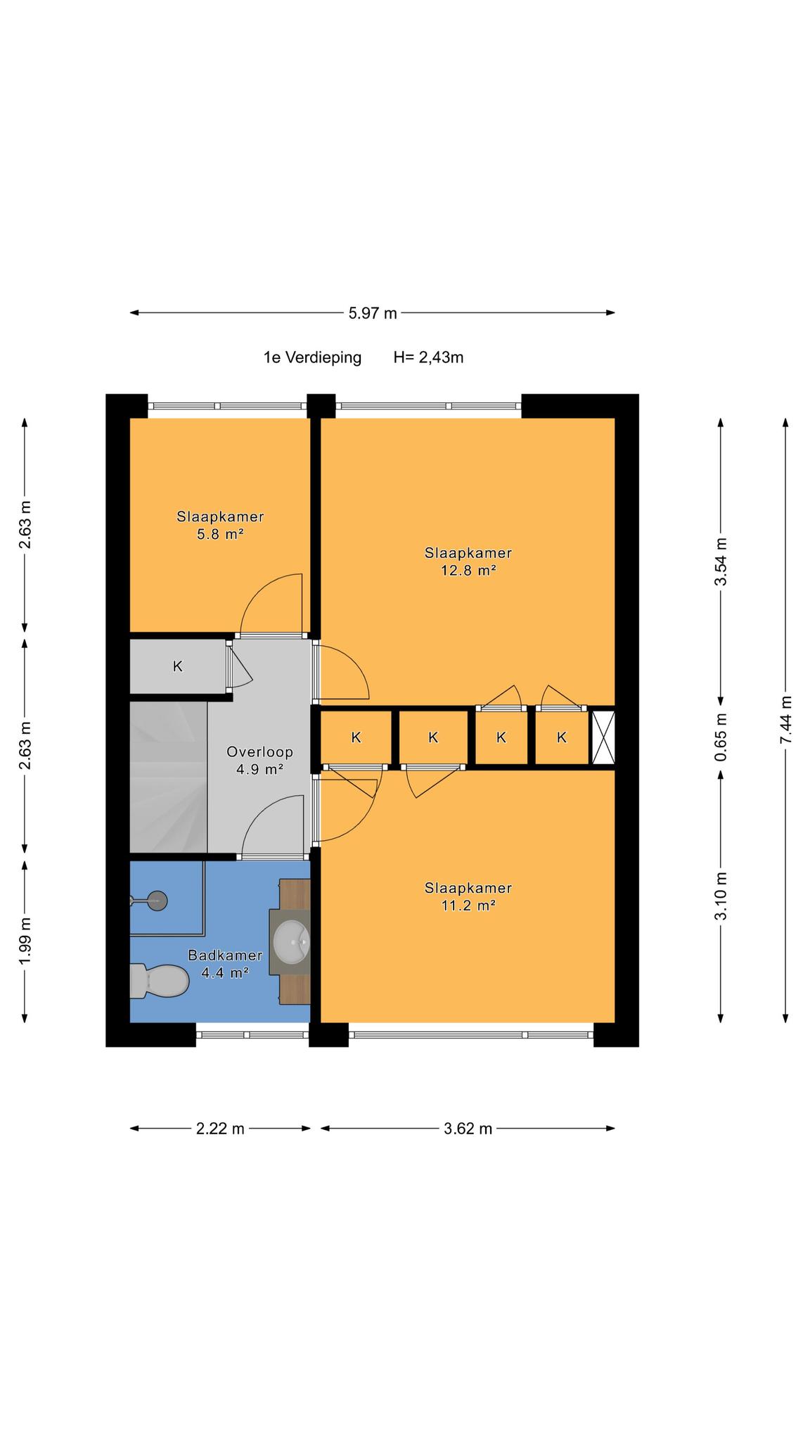 Drie goed formaat slaapkamers, waarvan 2 zijn afgewerkt met een vaste kastenwand. Aan de voorzijde is de badkamer gesitueerd. Deze is ingericht met een douche, wastafel en toilet.