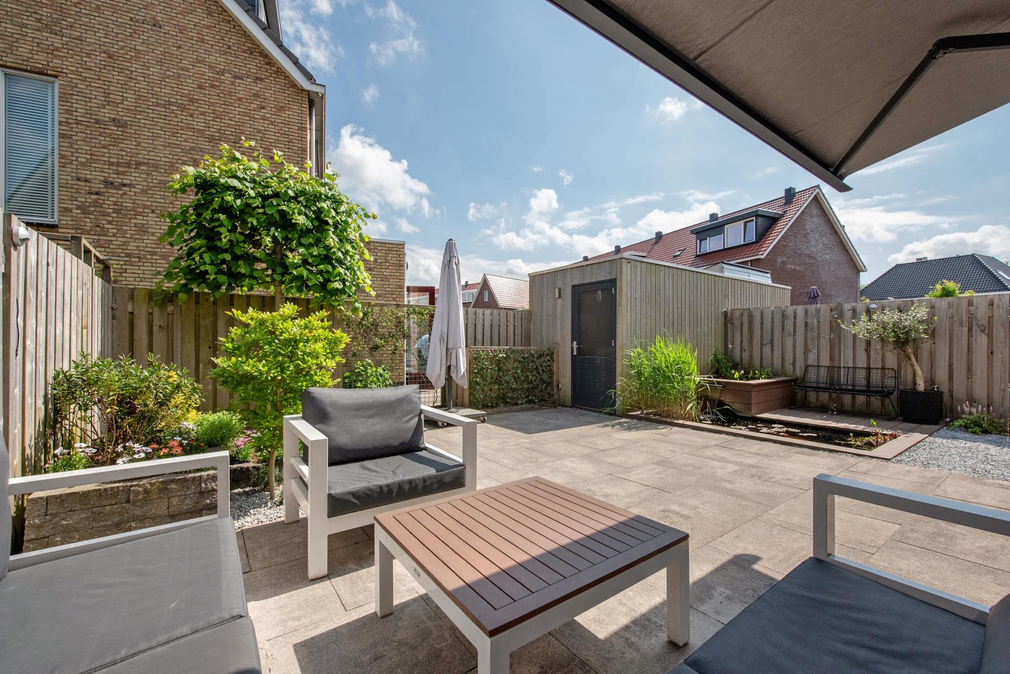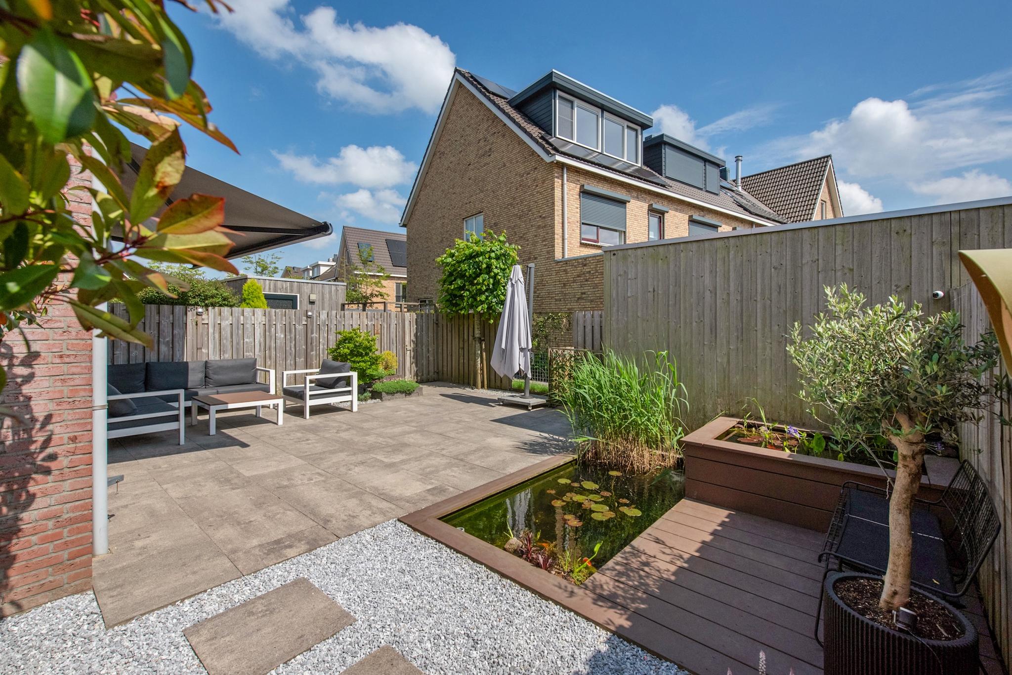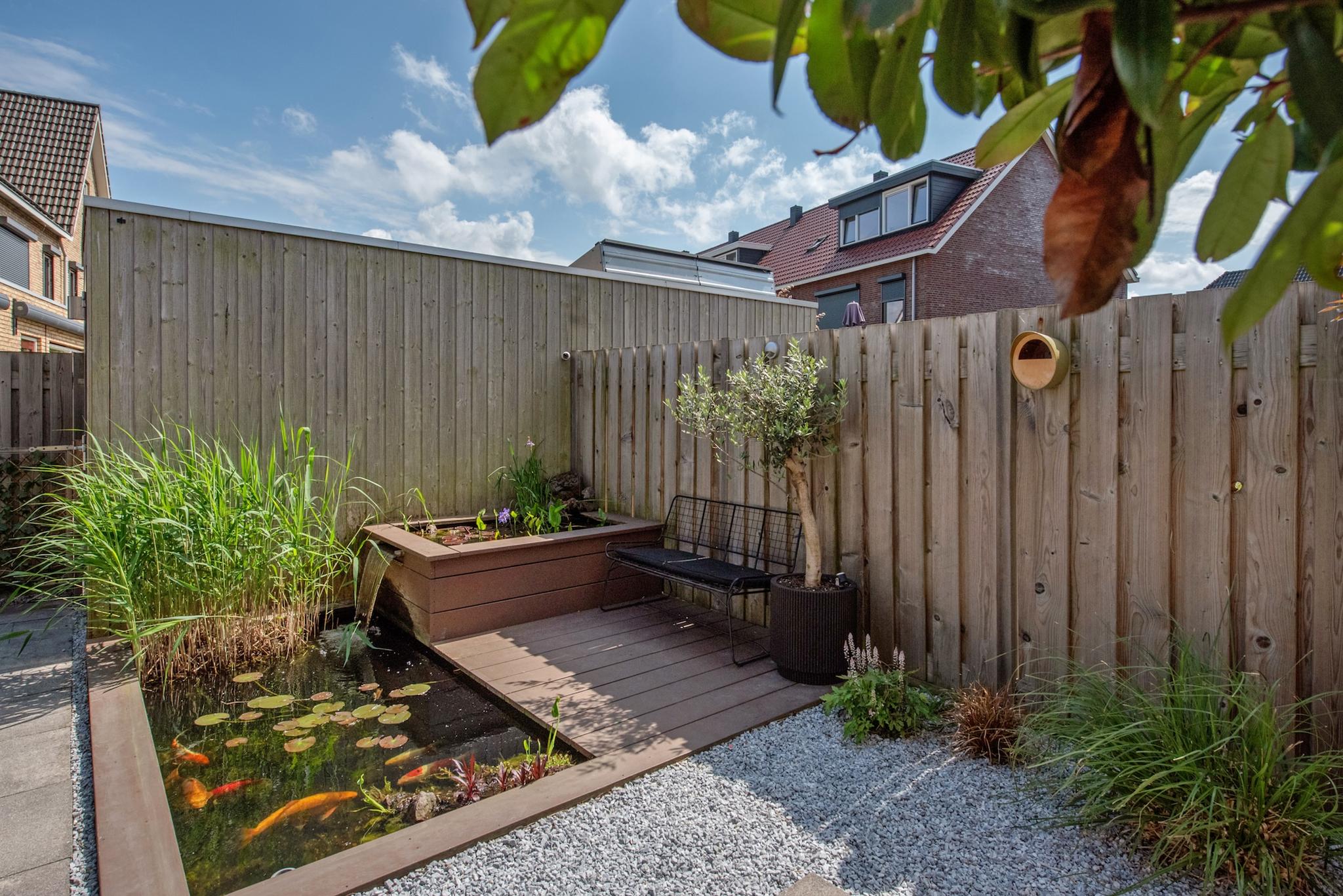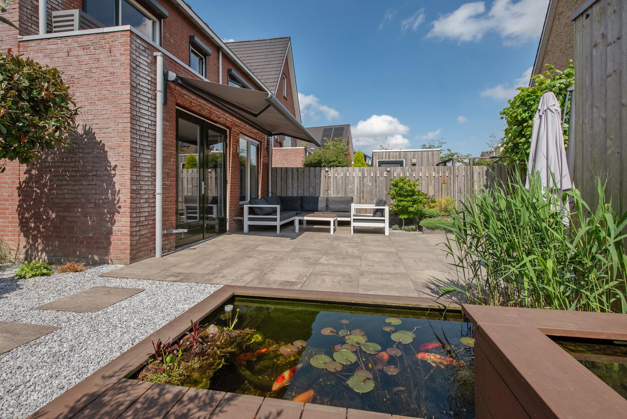 Via de openslaande deuren is de tuin toegankelijk. De verrassend grote tuin is een absoluut hoogtepunt van deze woning. Met een keurig aangelegde vijver en diverse zithoeken is er altijd wel een plekje in de zon of schaduw te vinden. Mede dankzij het elektrische zonnescherm. In de berging met elektra is voldoende ruimte voor bijvoorbeeld de fietsen en tuingereedschap.