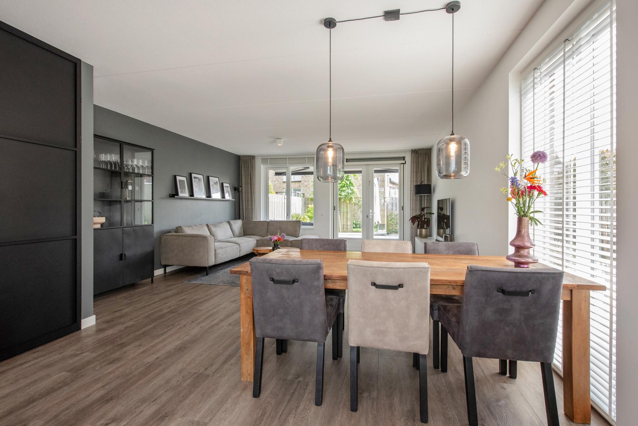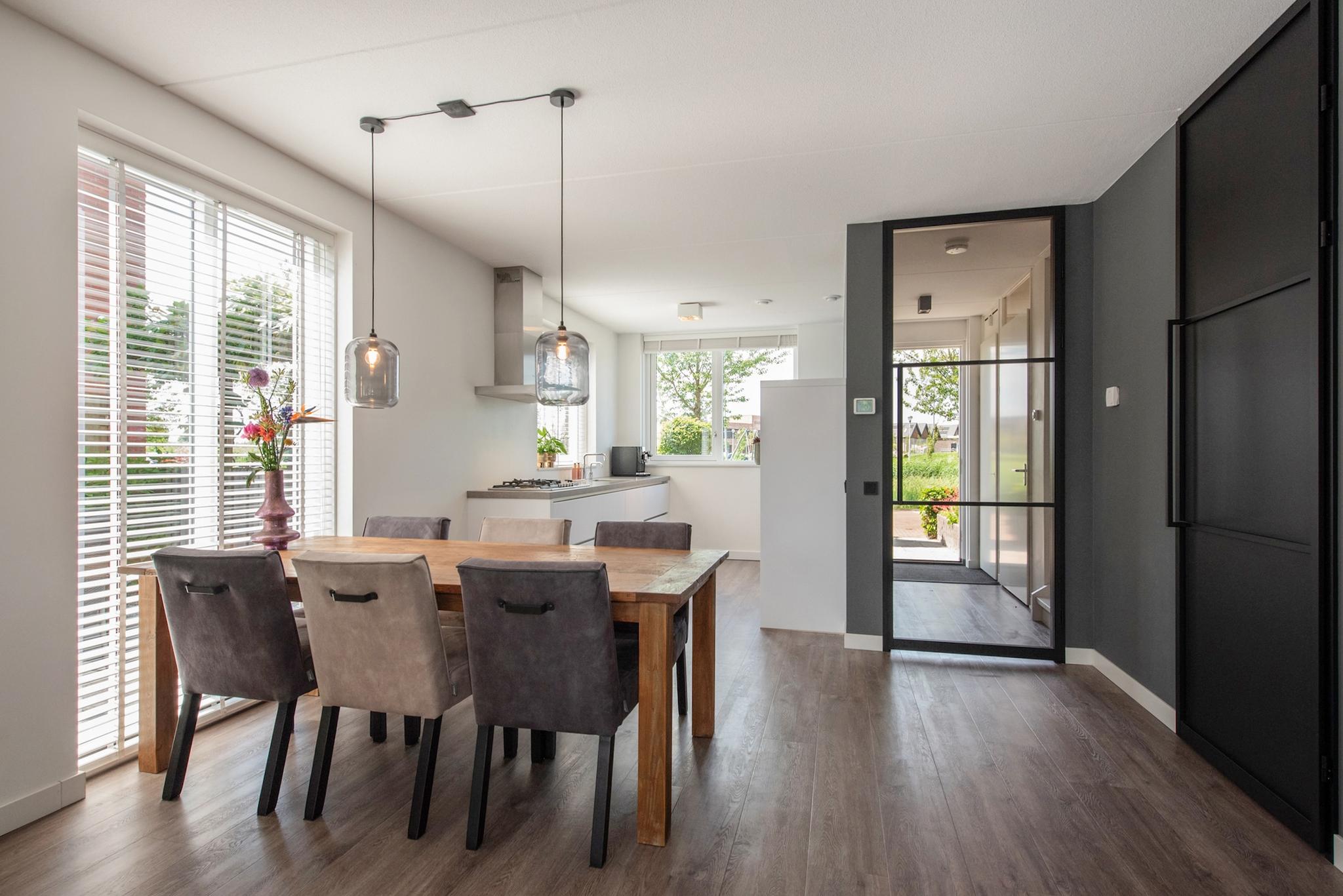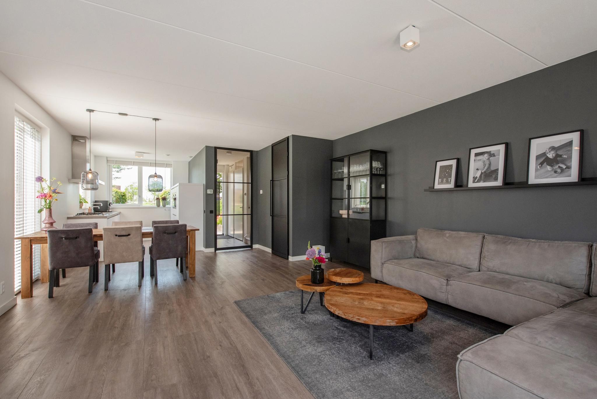 Wat een ruime en lichte woonkamer, die dankzij de aanbouw extra groot is. De ramen aan de zijkant zorgen voor prettig veel lichtinval. De begane grond is modern afgewerkt met stalen deuren, gestucte wanden en vloerverwarming.