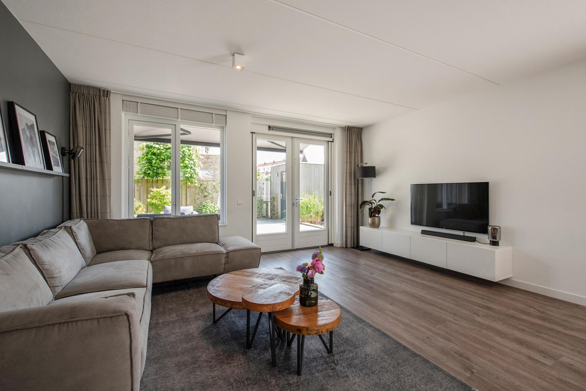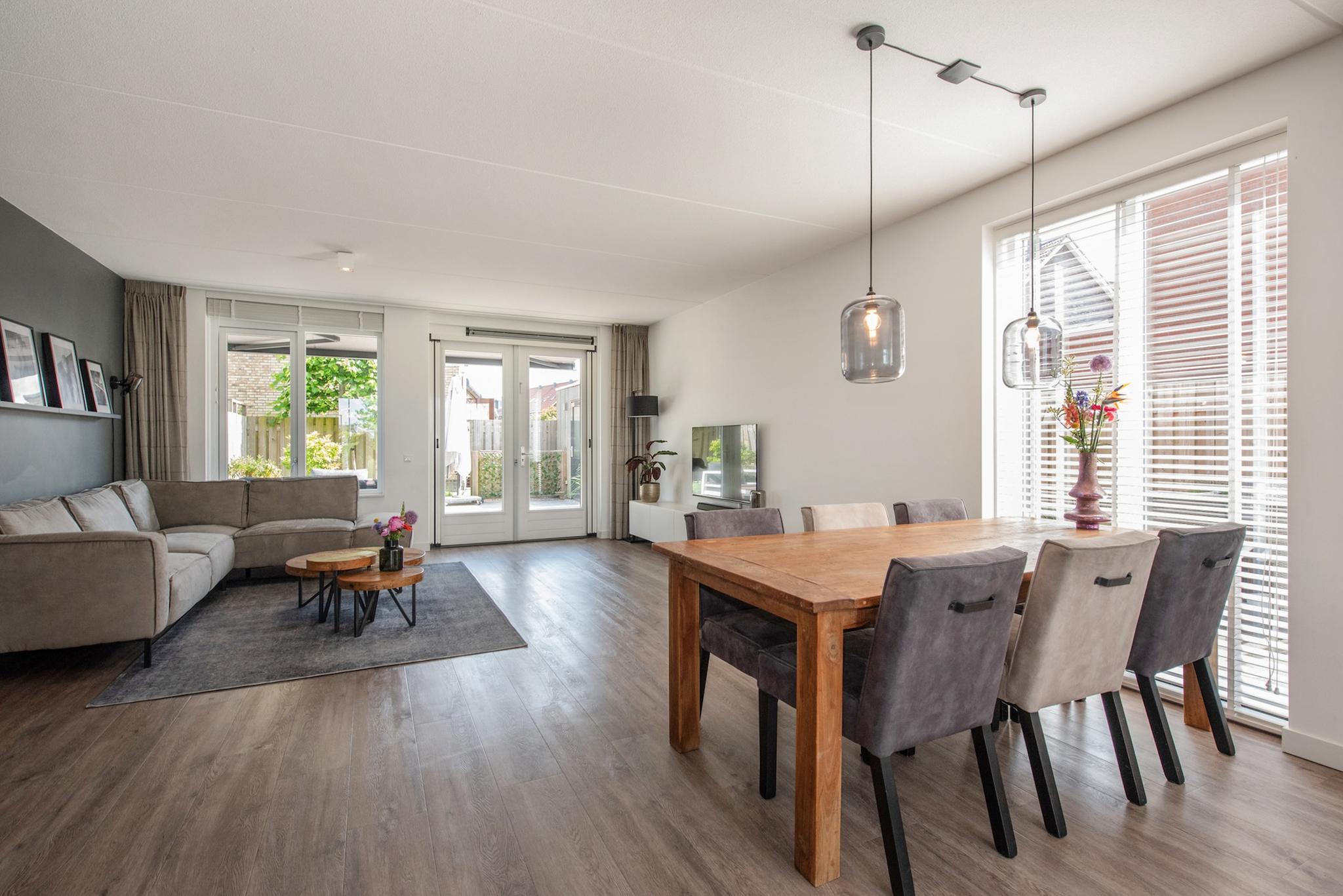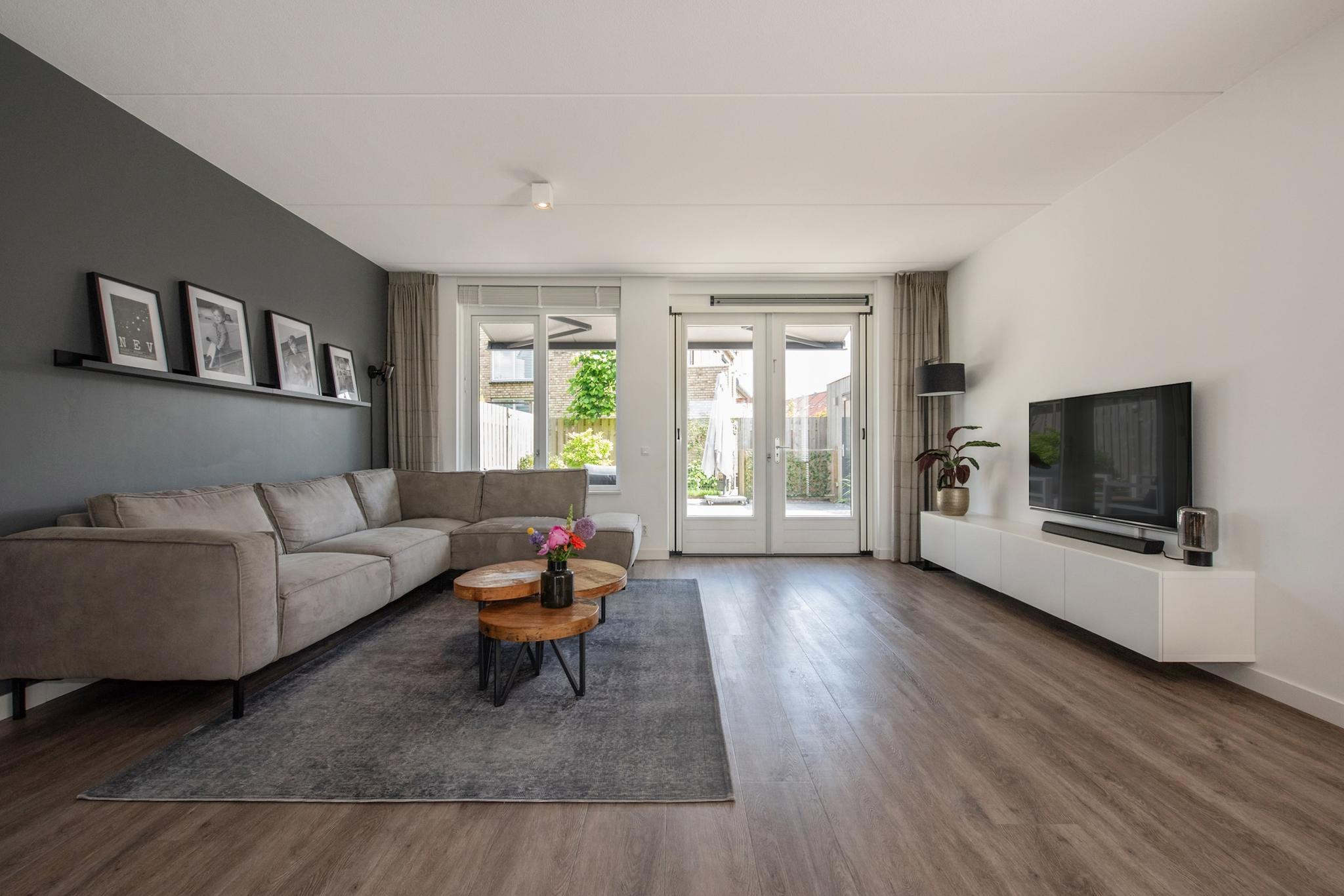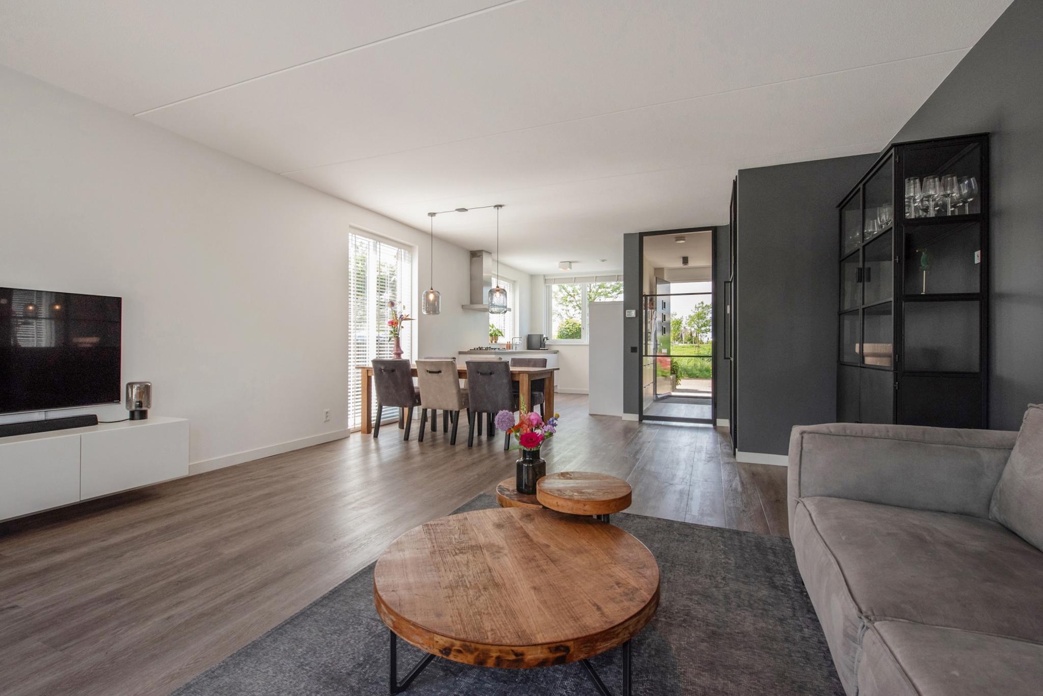 Wat een ruime en lichte woonkamer, die dankzij de aanbouw extra groot is. De ramen aan de zijkant zorgen voor prettig veel lichtinval. De begane grond is modern afgewerkt met stalen deuren, gestucte wanden en vloerverwarming.