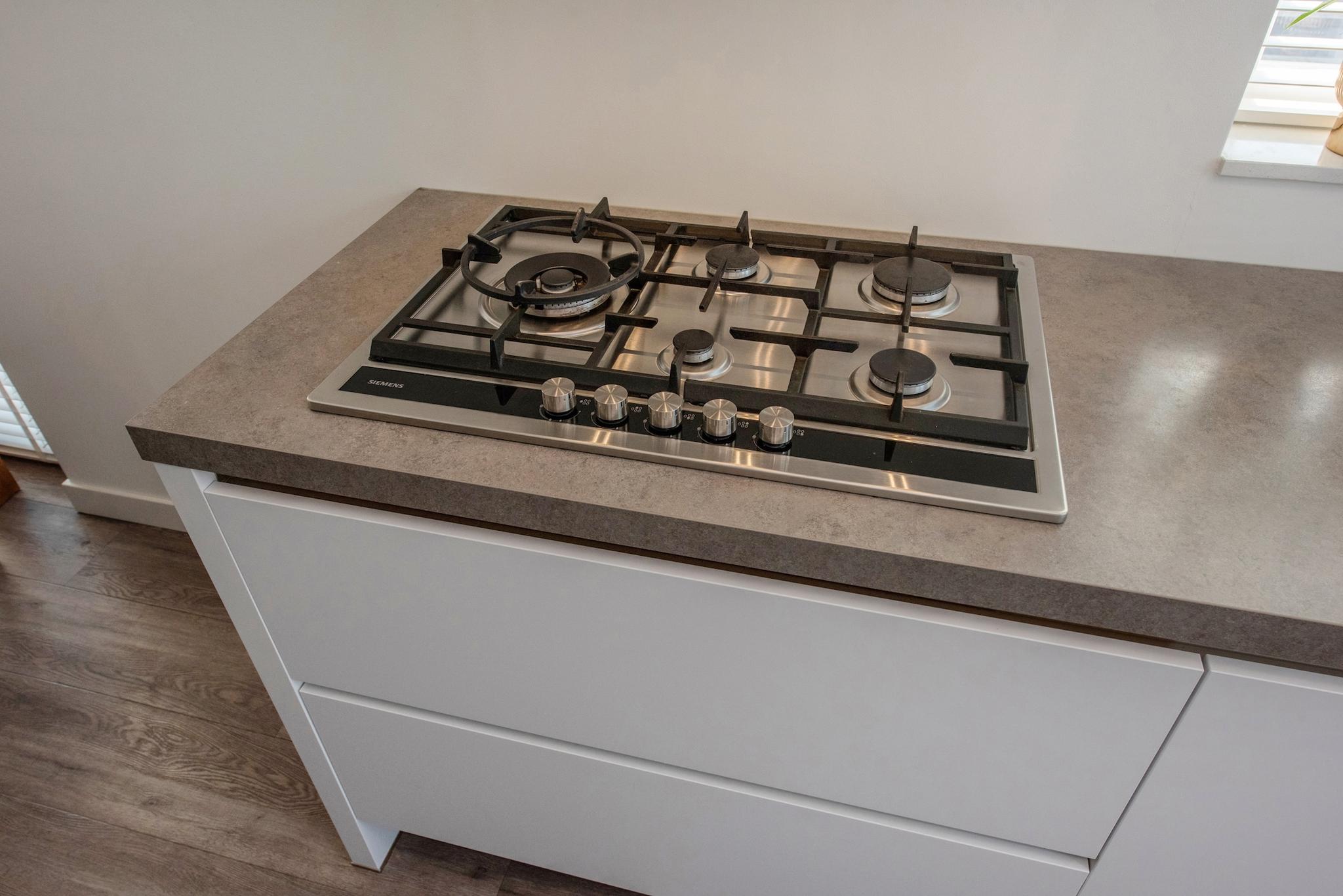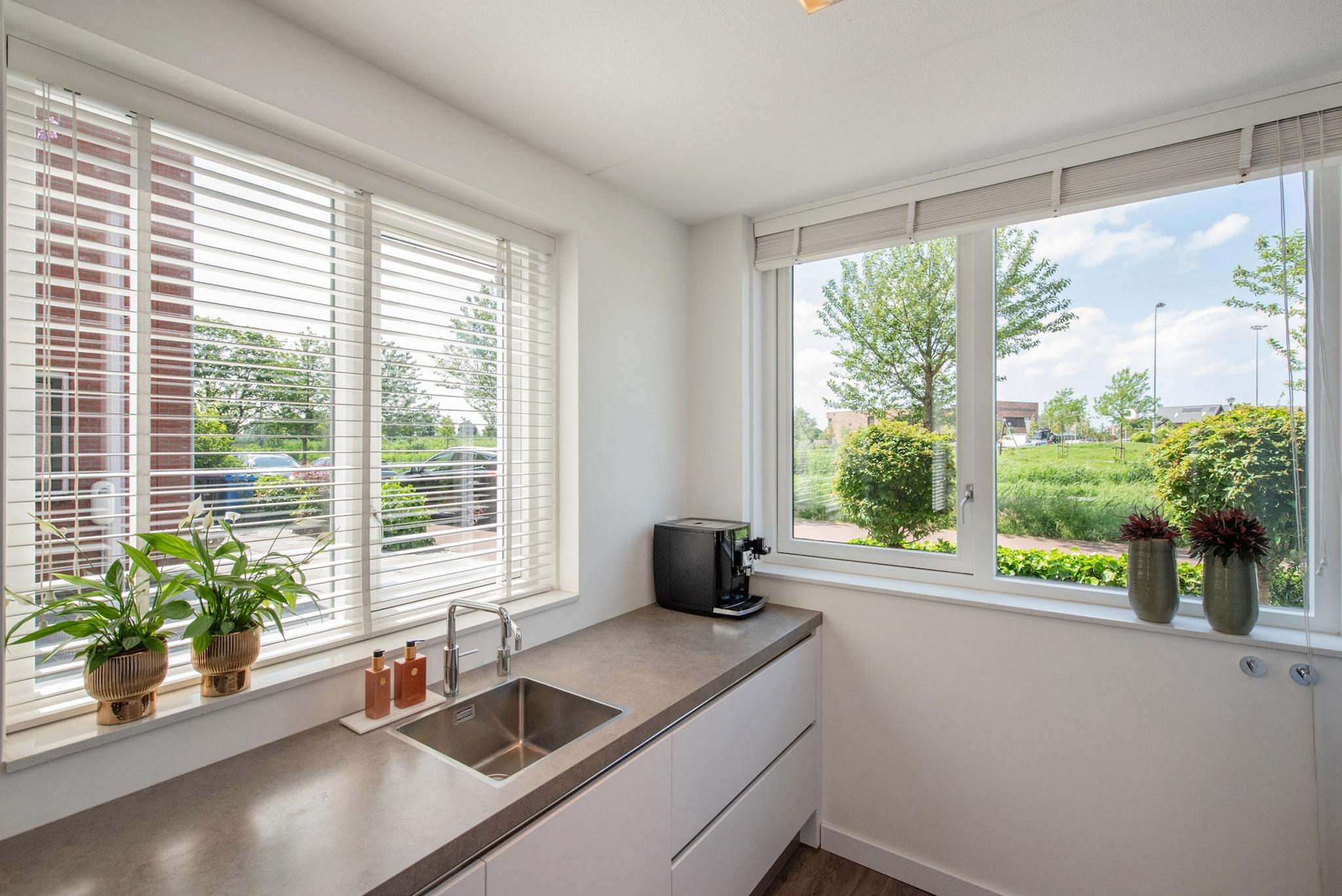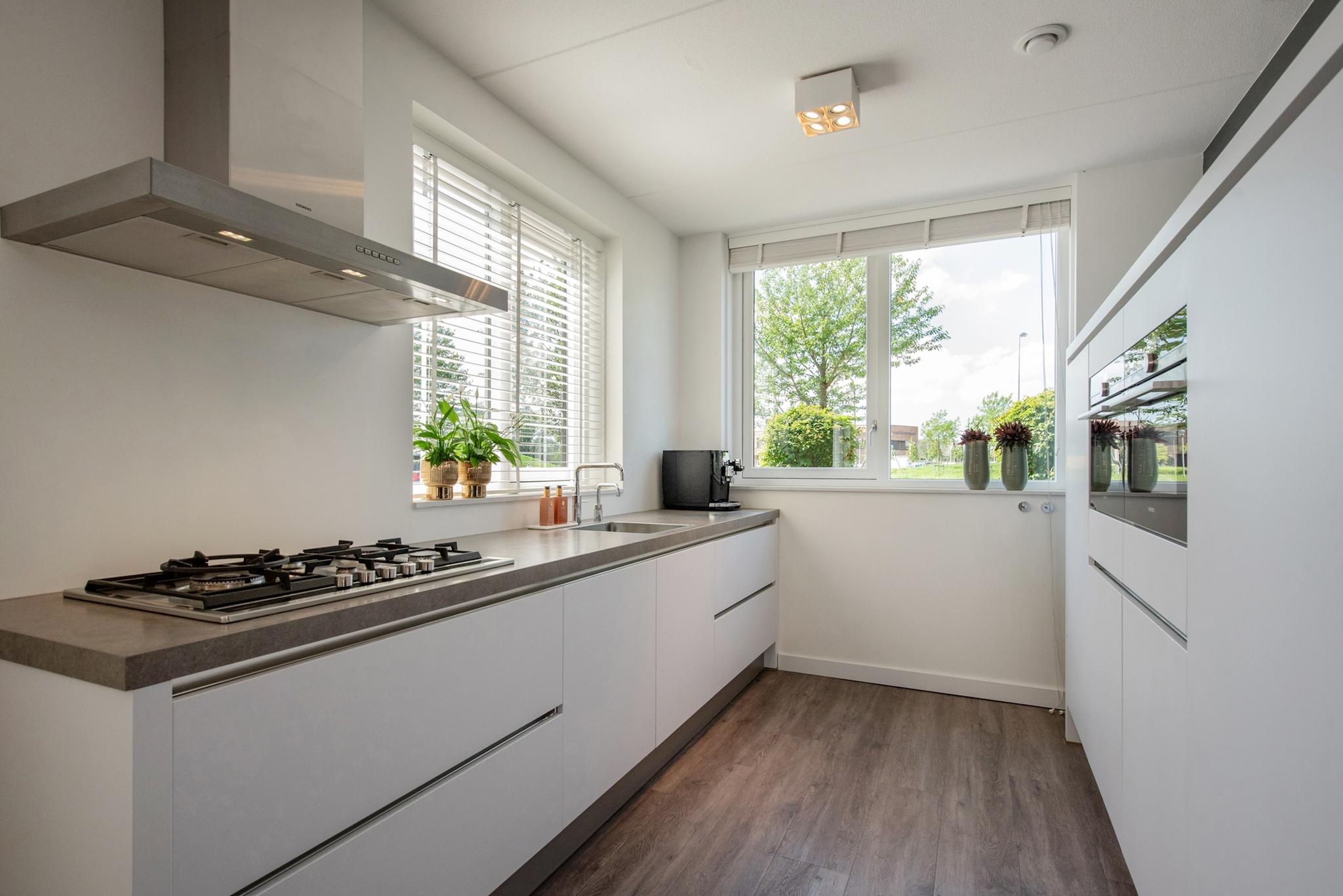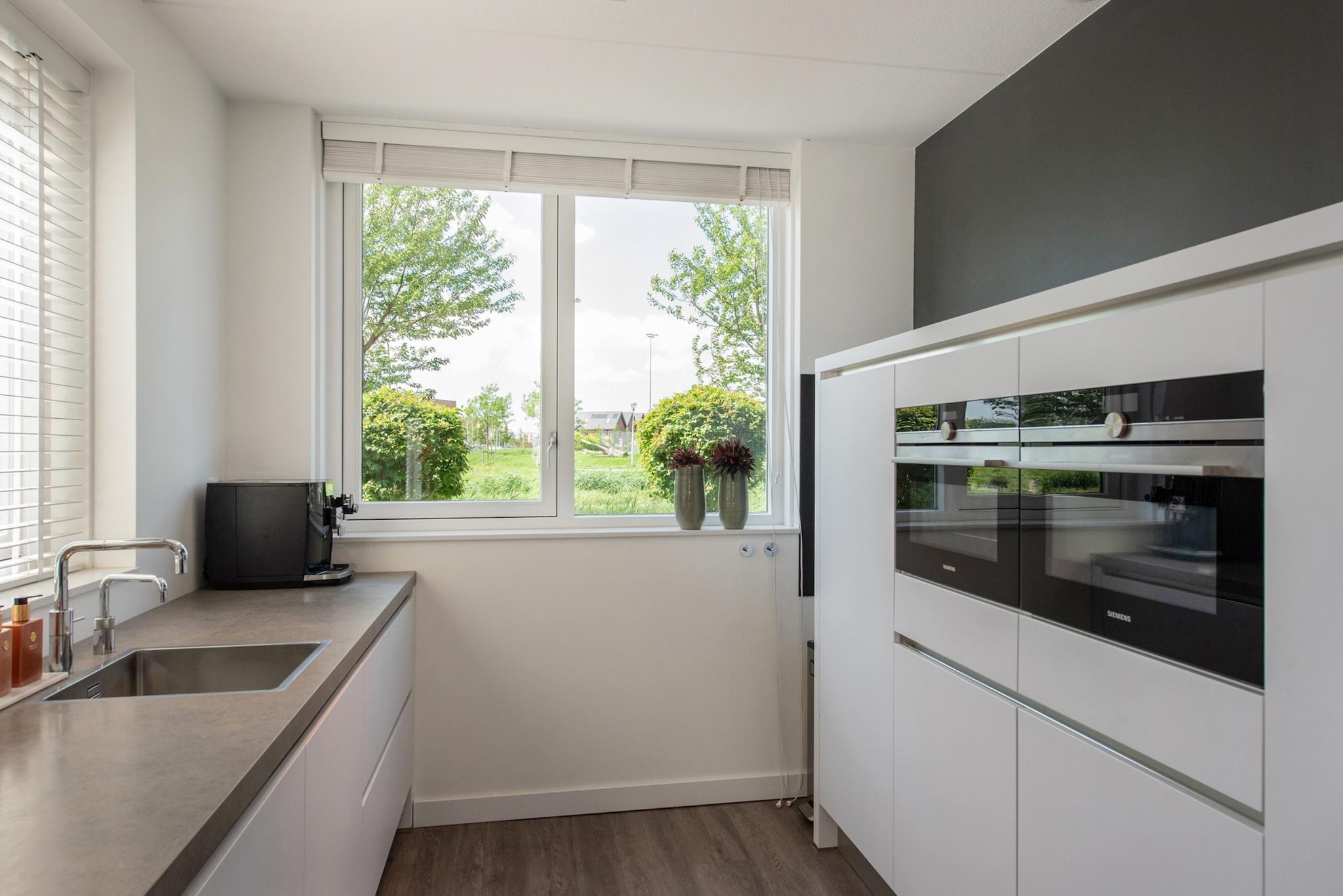 De moderne open keuken aan de voorzijde beschikt over alle benodigde inbouwapparatuur, te weten een Quooker, koelkast, vriezer, combi-oven, oven, vaatwasser en 5-pits gaskookplaat. Aan de voorkant is vrij uitzicht over groen.