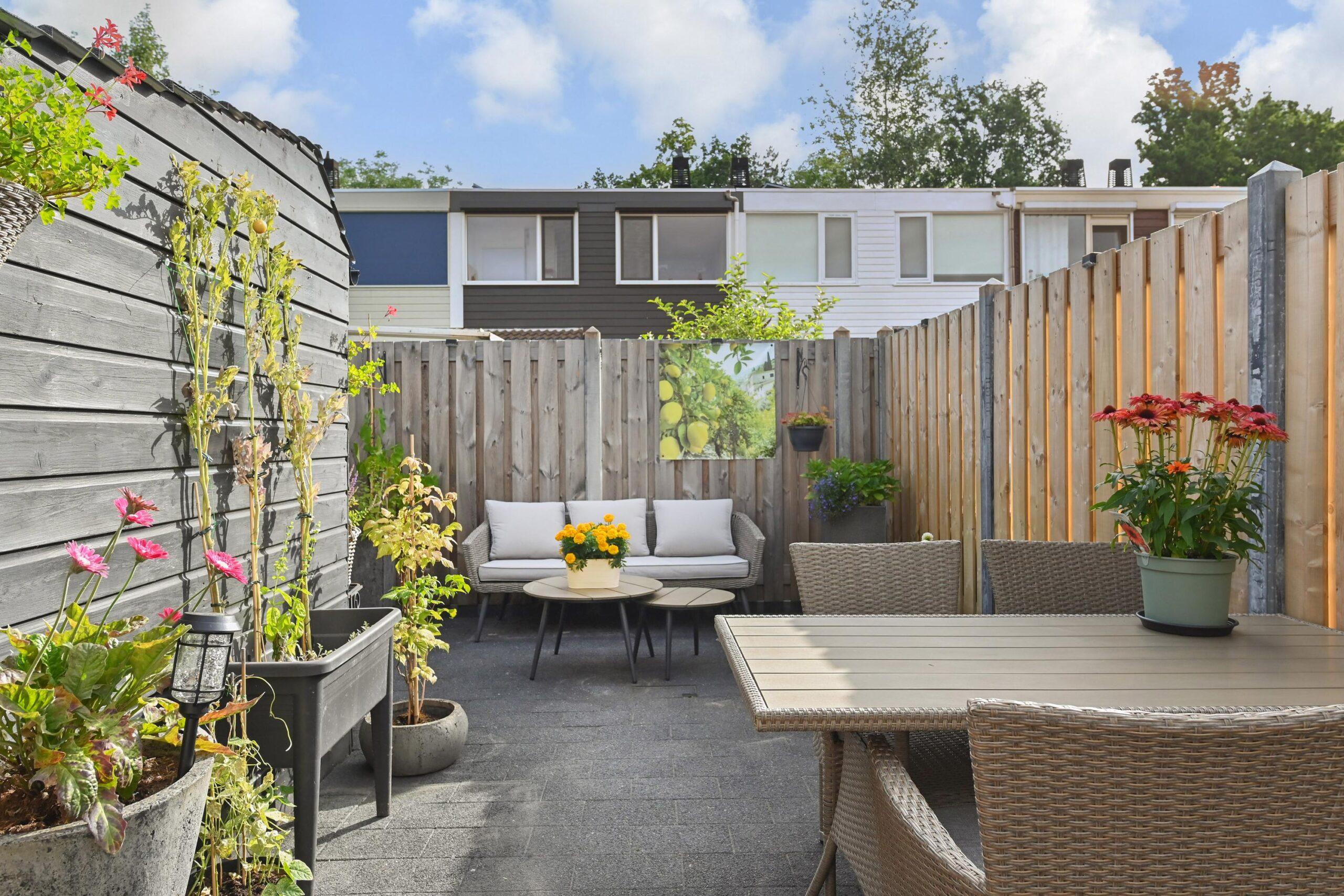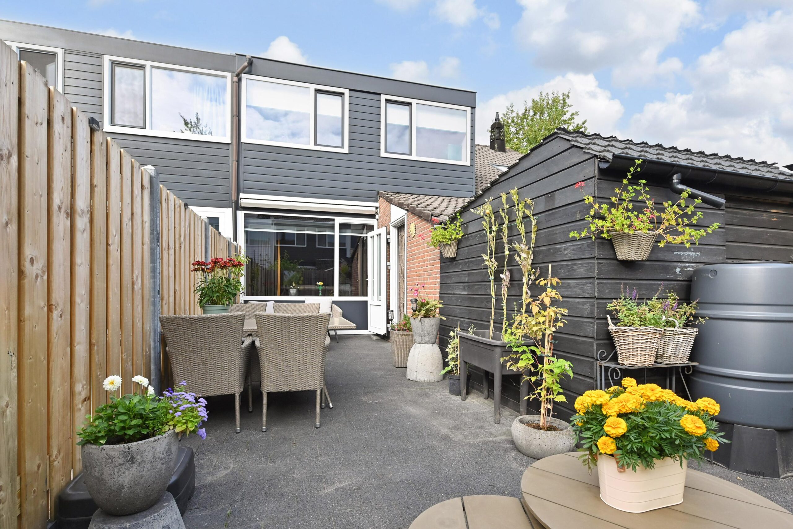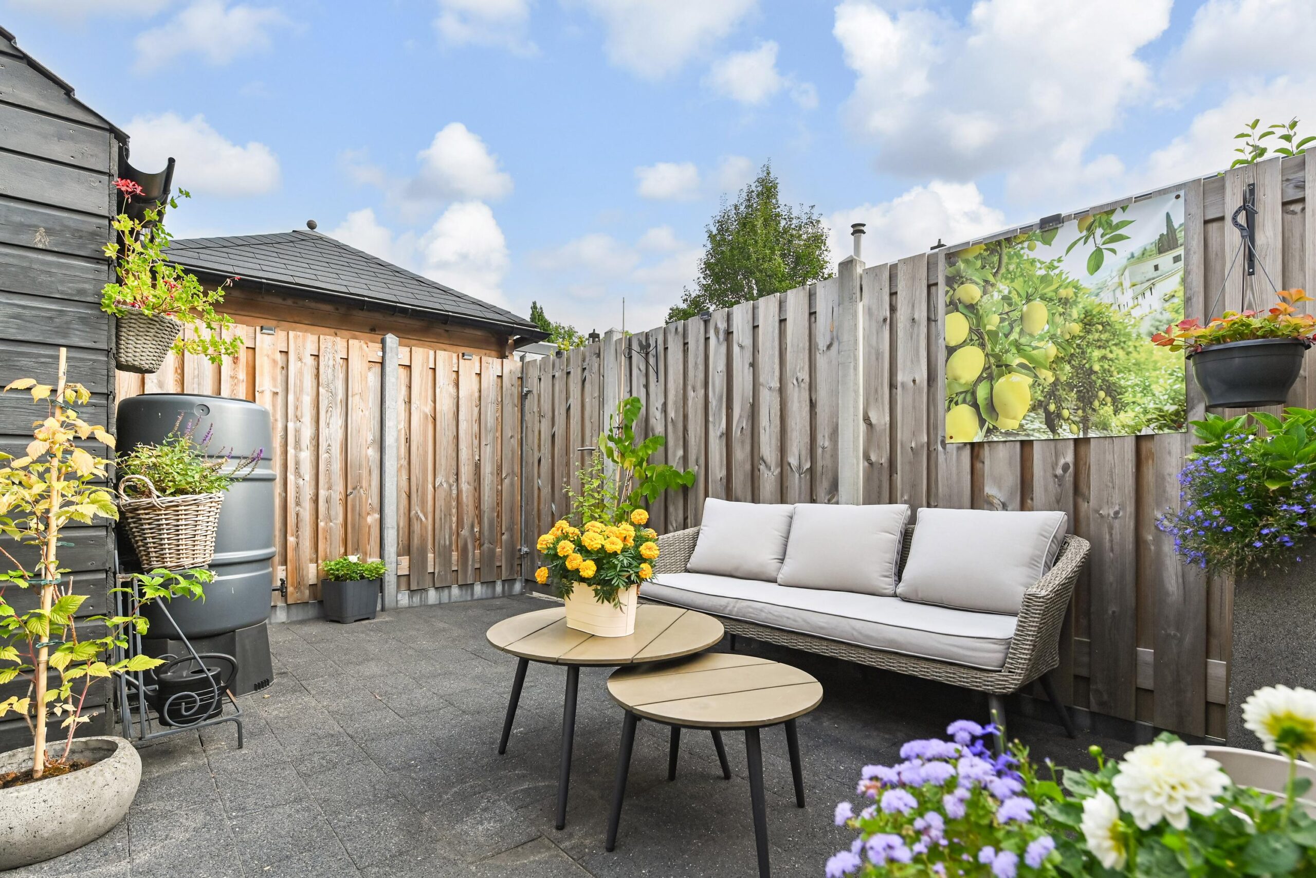 De zonnige, onderhoudsvriendelijke achtertuin is keurig bestraat en voorzien van een nieuwe schutting (2024). Er is ruimte voor meerdere zitjes in de zon. De houten berging met elektra is prettig ruim en biedt plaats voor de fietsen en tuinspullen.