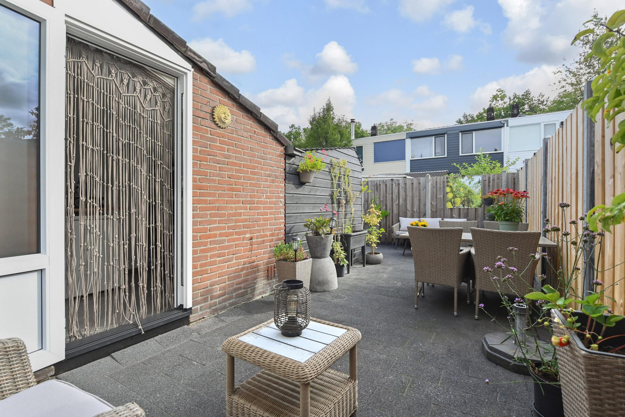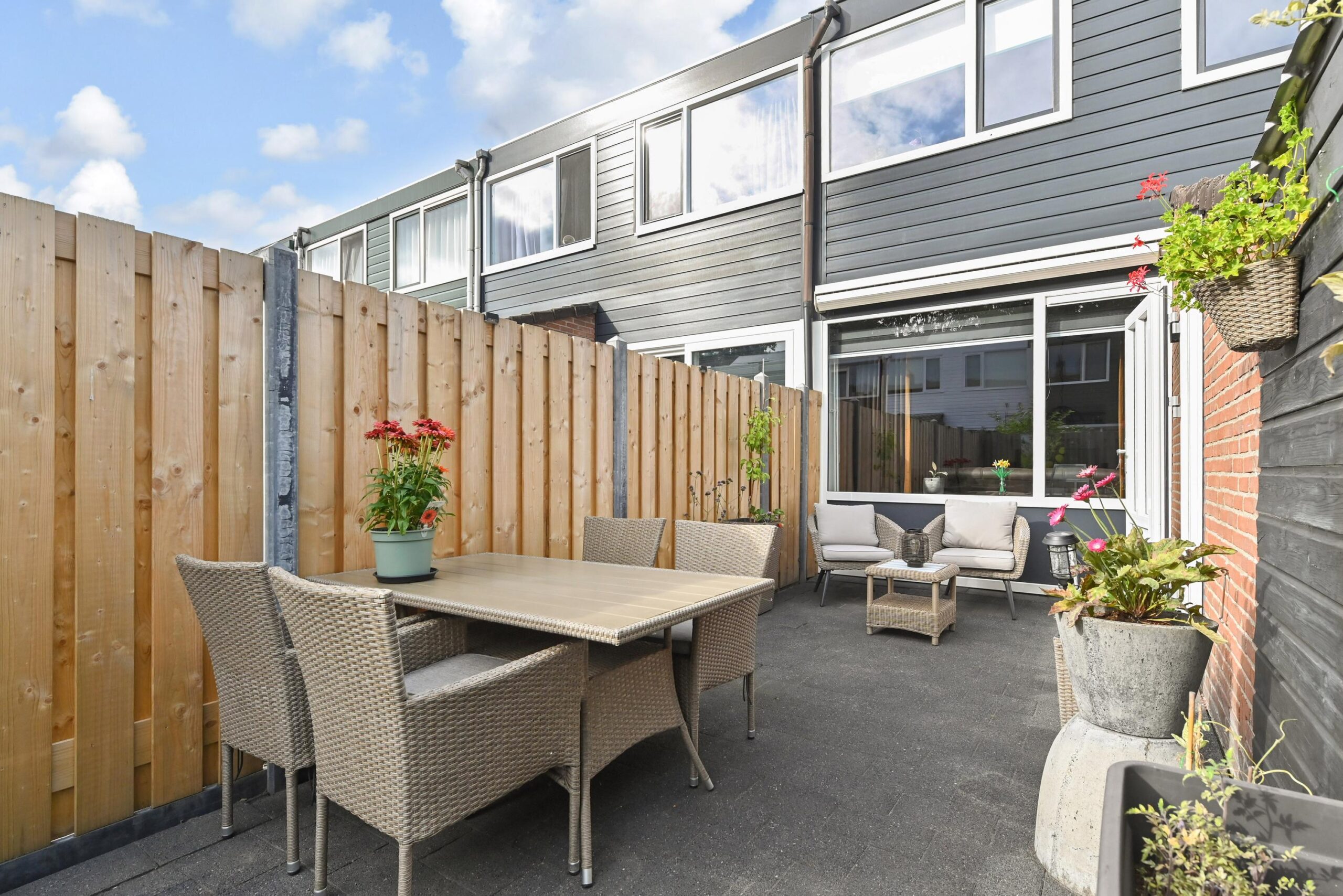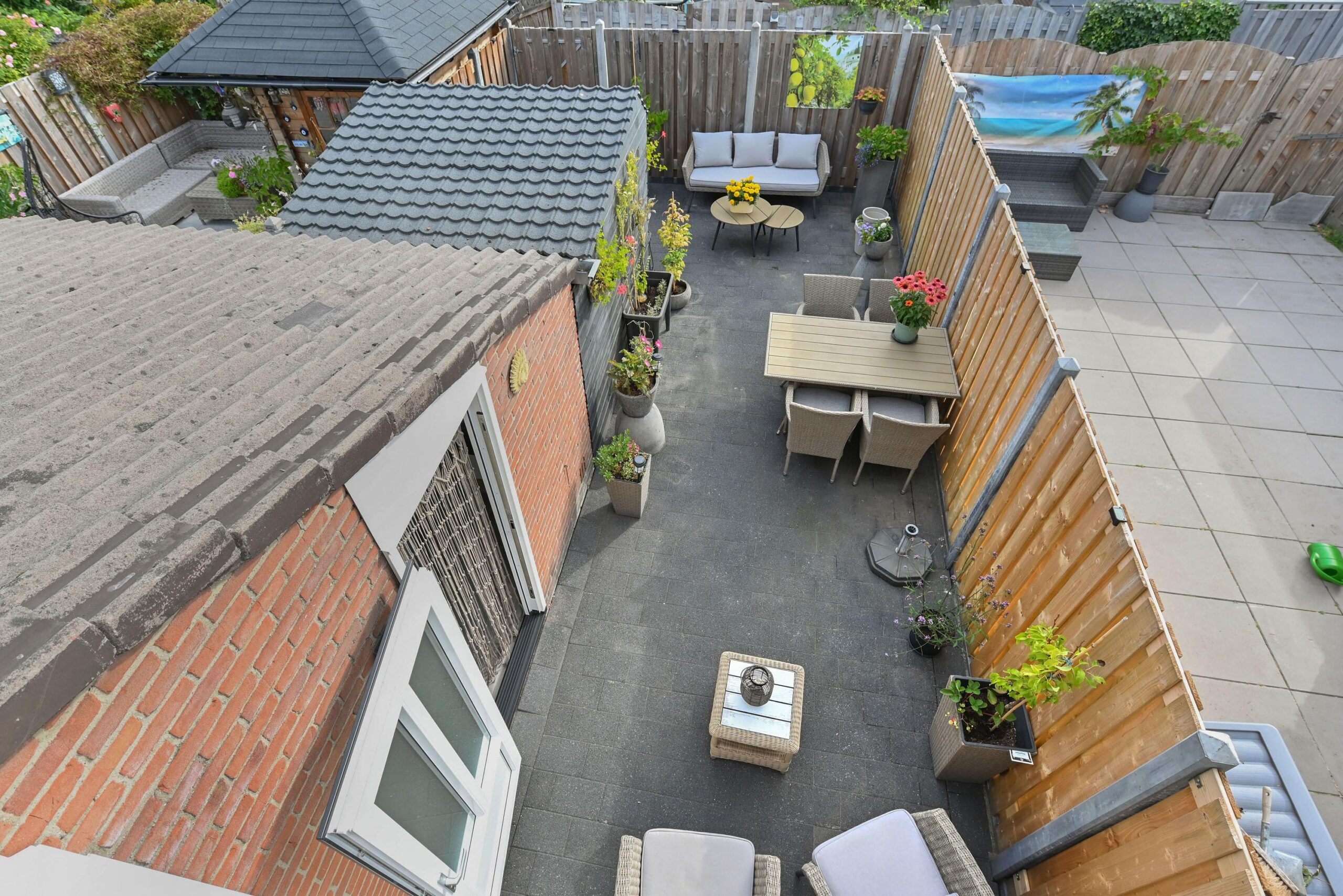 De zonnige, onderhoudsvriendelijke achtertuin is keurig bestraat en voorzien van een nieuwe schutting (2024). Er is ruimte voor meerdere zitjes in de zon. De houten berging met elektra is prettig ruim en biedt plaats voor de fietsen en tuinspullen.
