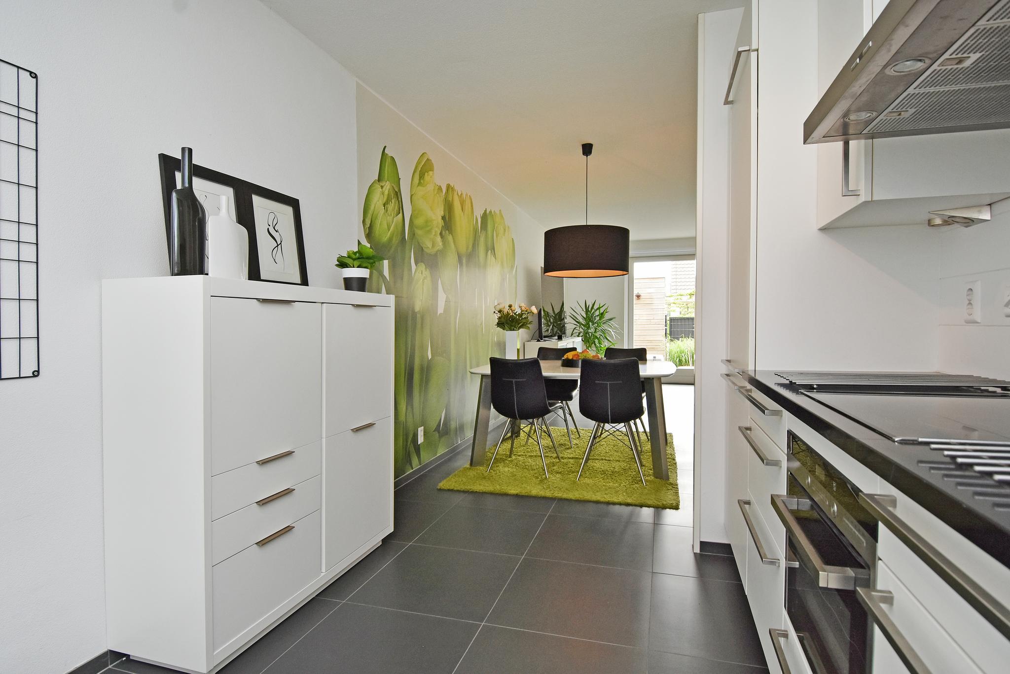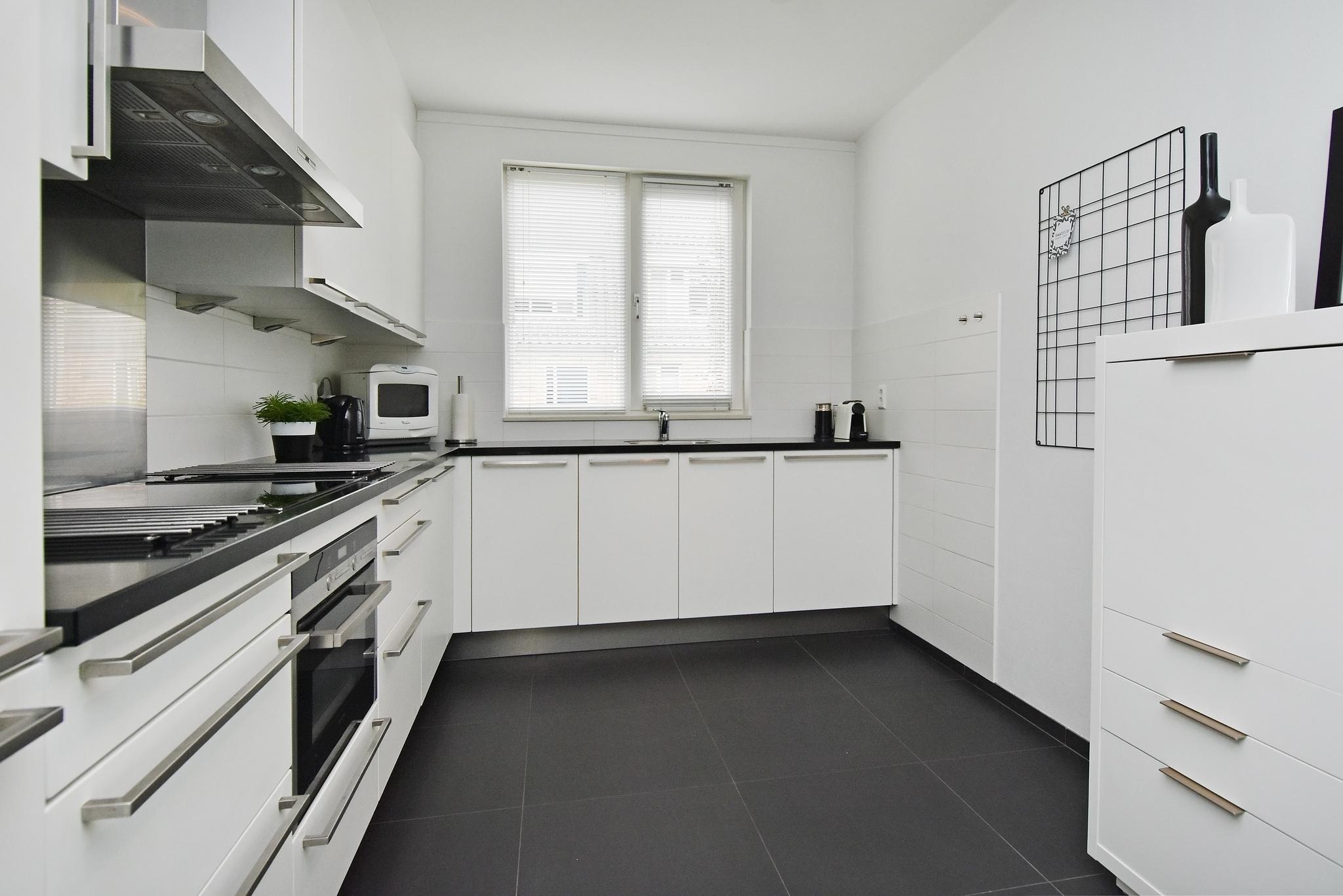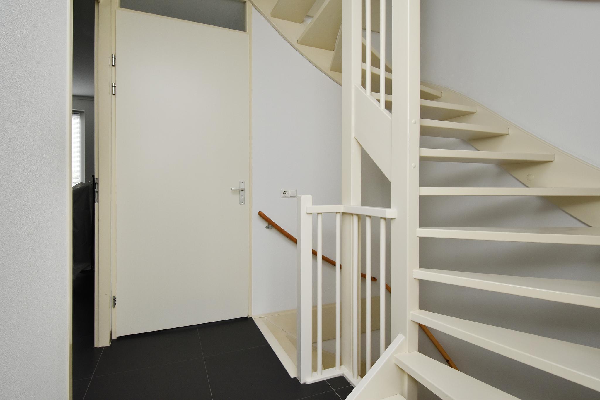 Begane grond: Hal/entree met de trapopgang, modern toilet v.v. een wandcloset. Heerlijke, lichte woonkamer met een grote schuifpui, met daardoor een prettige lichtinval en waardoor je kunt genieten van volop uitzicht op de tuin. De moderne, open keuken beschikt over diverse inbouwapparatuur, waaronder inductiekookplaat, afzuigkap, vaatwasser, koel-/vriescombinatie en combi magnetron/oven.
