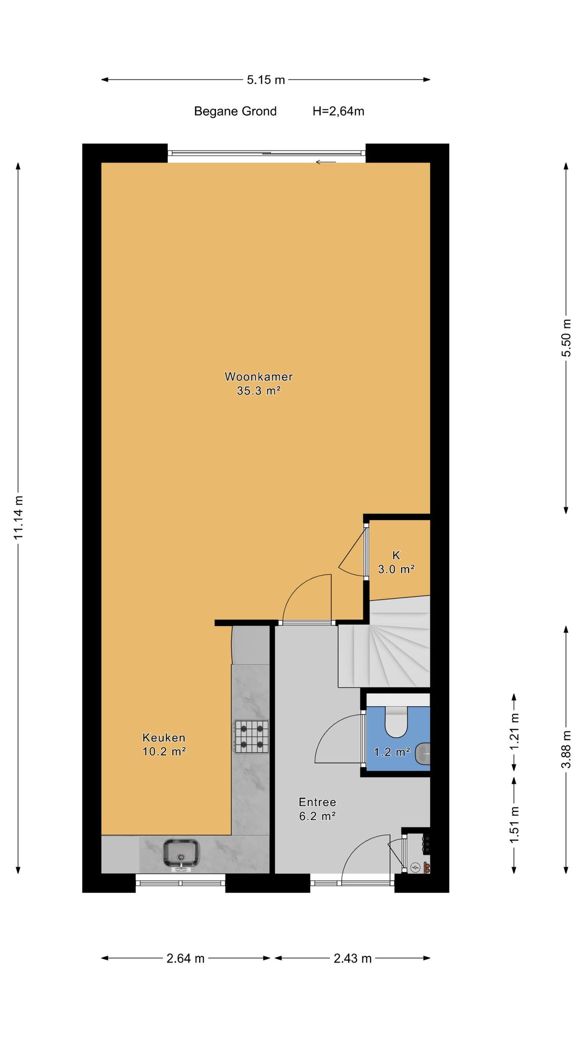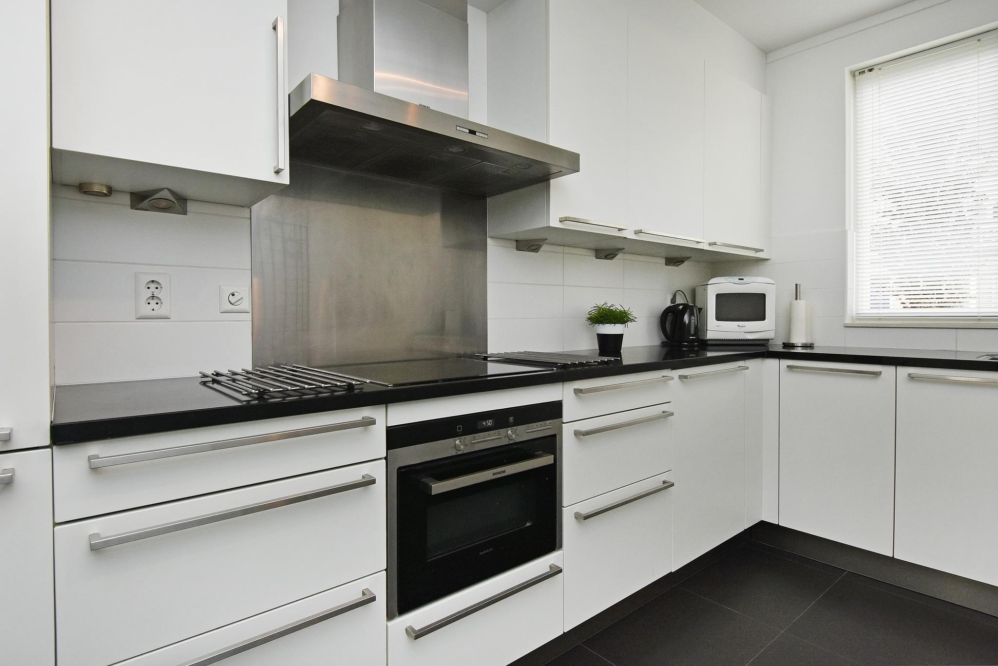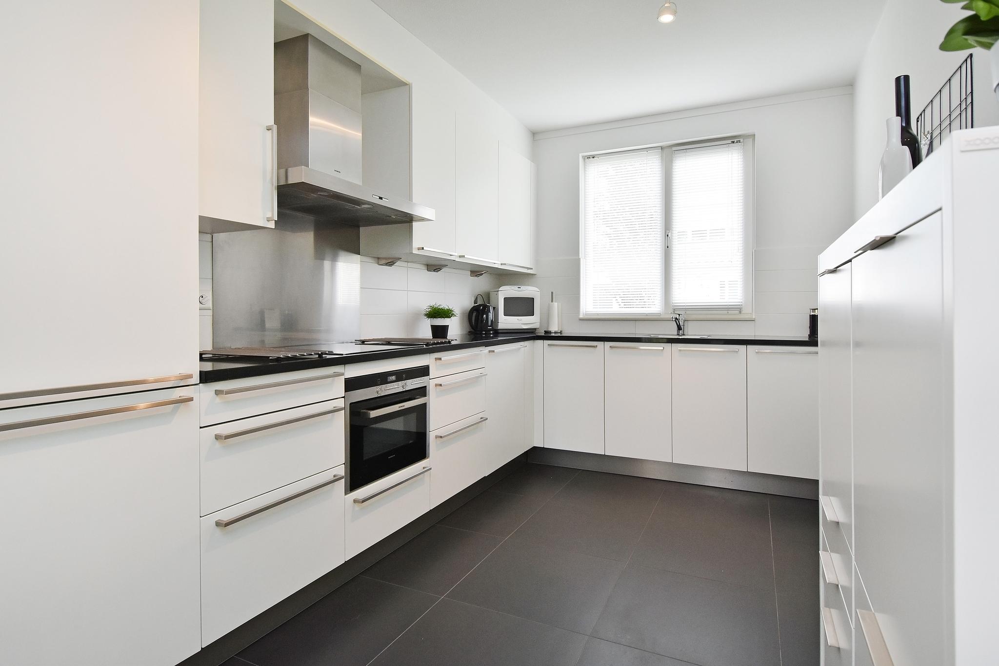Begane grond: Hal/entree met de trapopgang, modern toilet v.v. een wandcloset. Heerlijke, lichte woonkamer met een grote schuifpui, met daardoor een prettige lichtinval en waardoor je kunt genieten van volop uitzicht op de tuin. De moderne, open keuken beschikt over diverse inbouwapparatuur, waaronder inductiekookplaat, afzuigkap, vaatwasser, koel-/vriescombinatie en combi magnetron/oven.