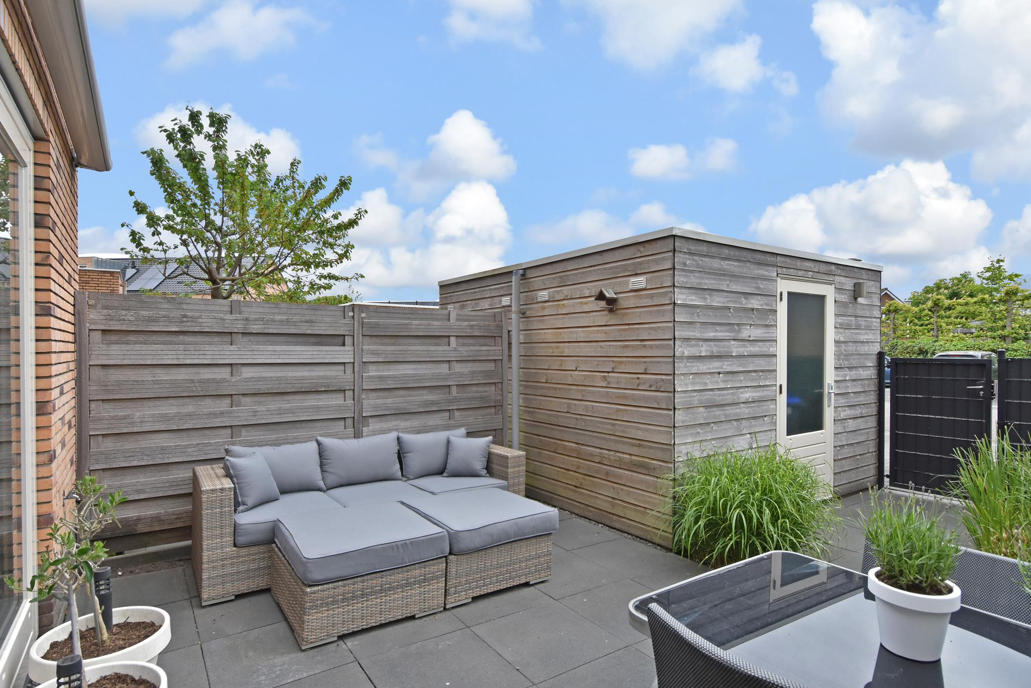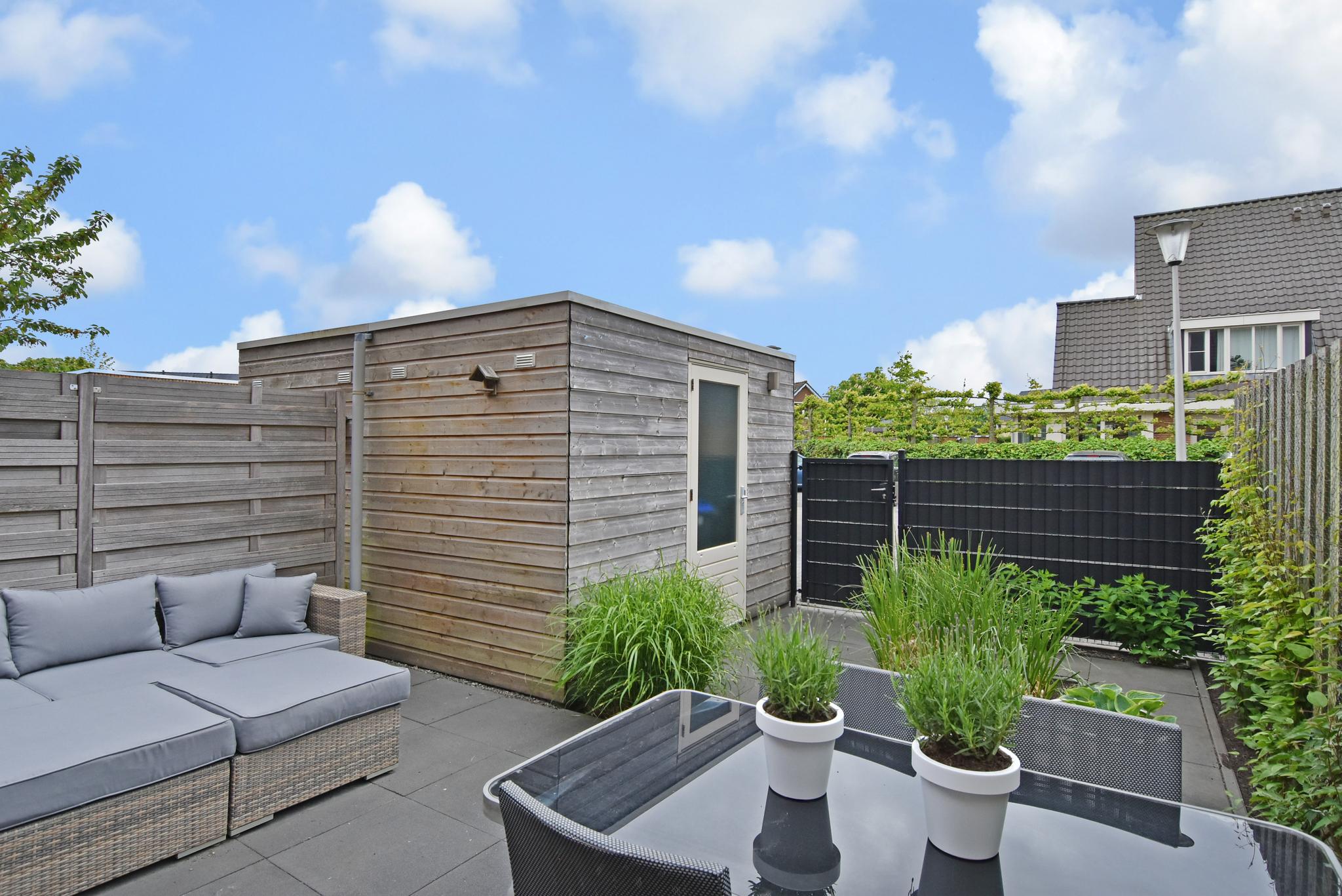 -Vrijstaande houten berging in de achtertuin;