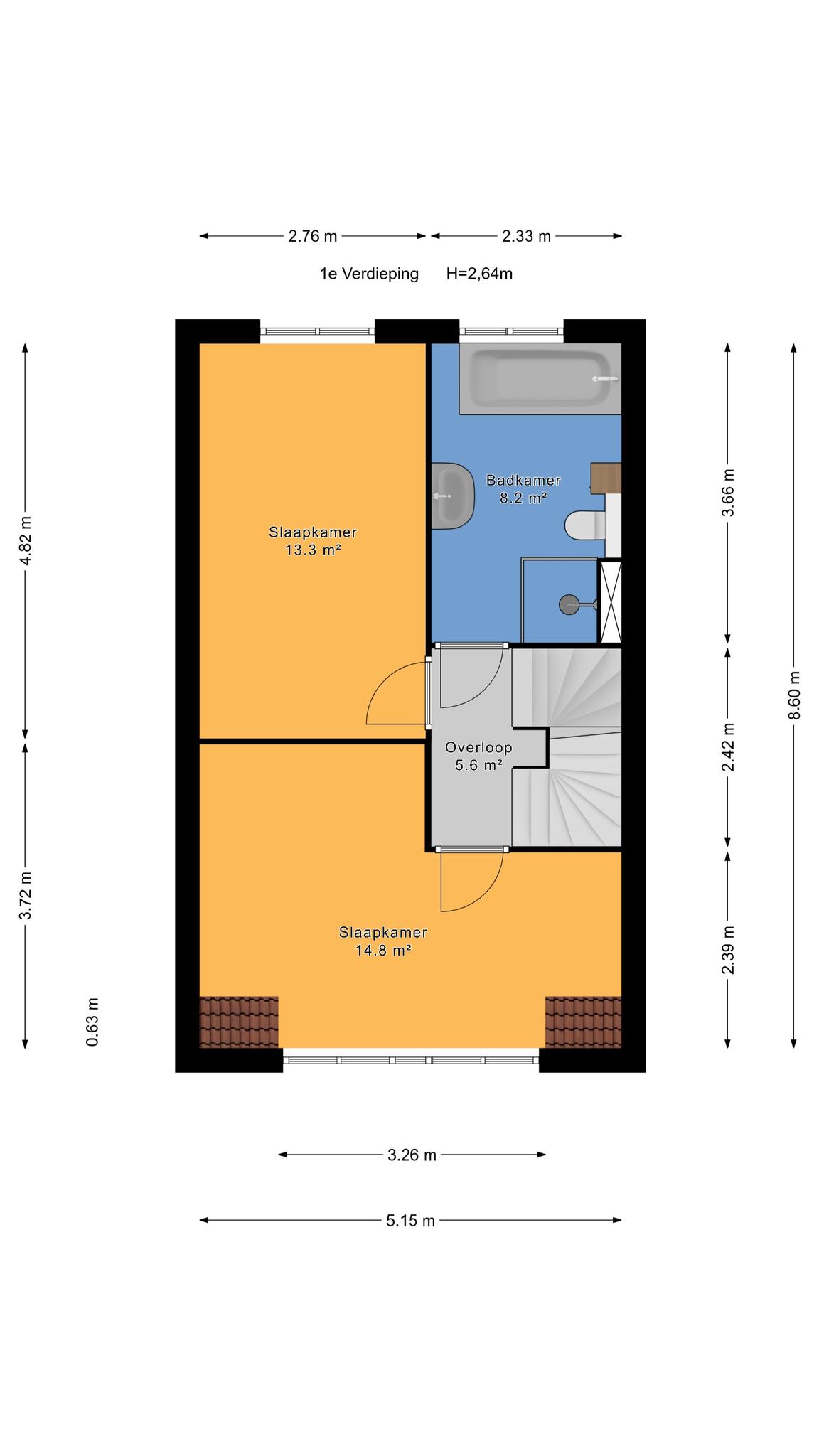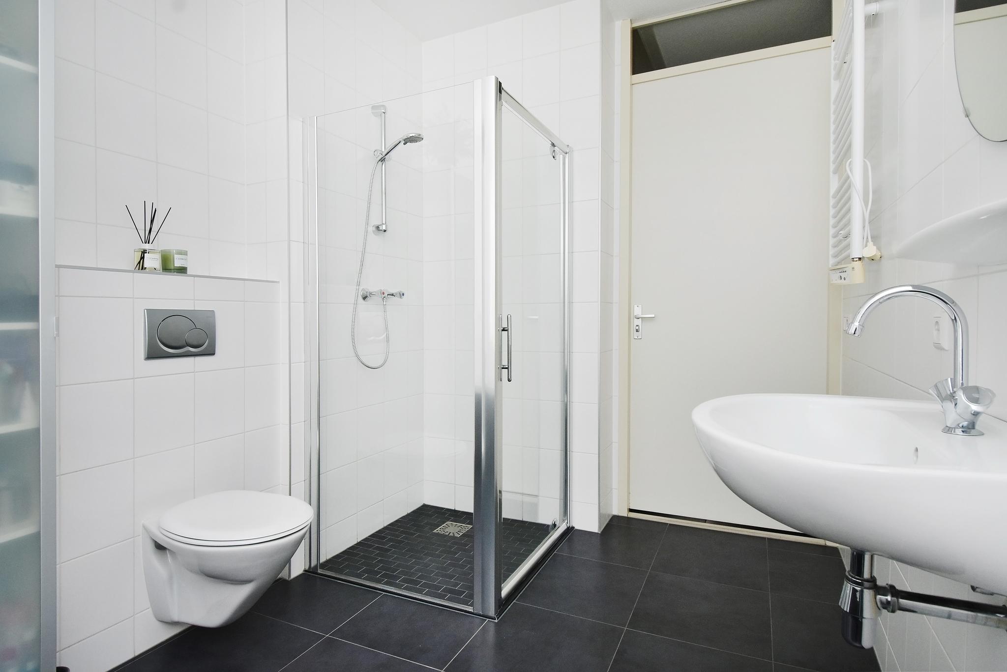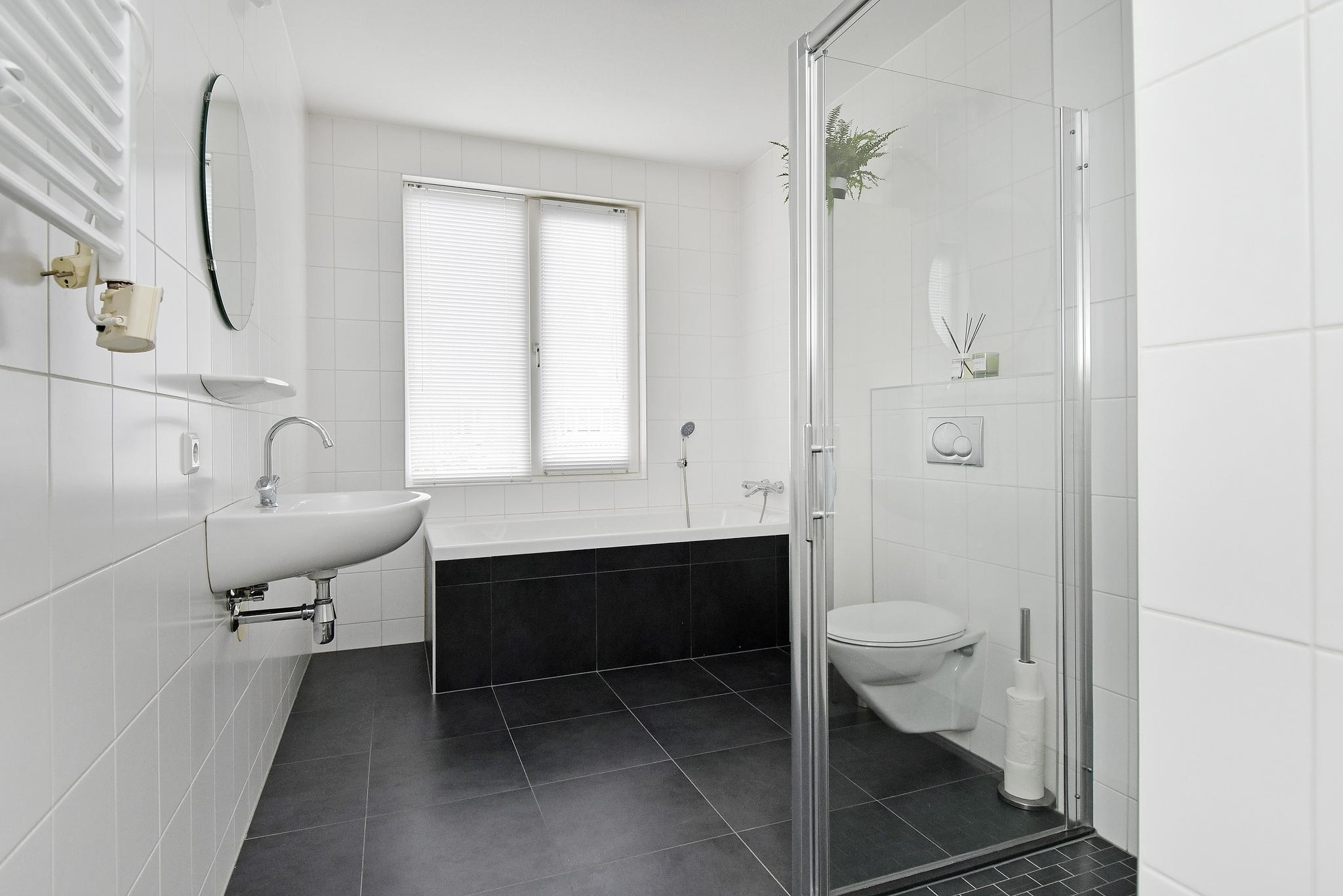 1e Verdieping: Overloop, twee (voormalig drie) keurig afgewerkte slaapkamers. Grote slaapkamer aan de voorzijde met dakkapel. Flinke slaapkamer aan achterzijde met grote kast. De badkamer beschikt over een ligbad, wandcloset, douchecabine en een wastafelcombinatie.