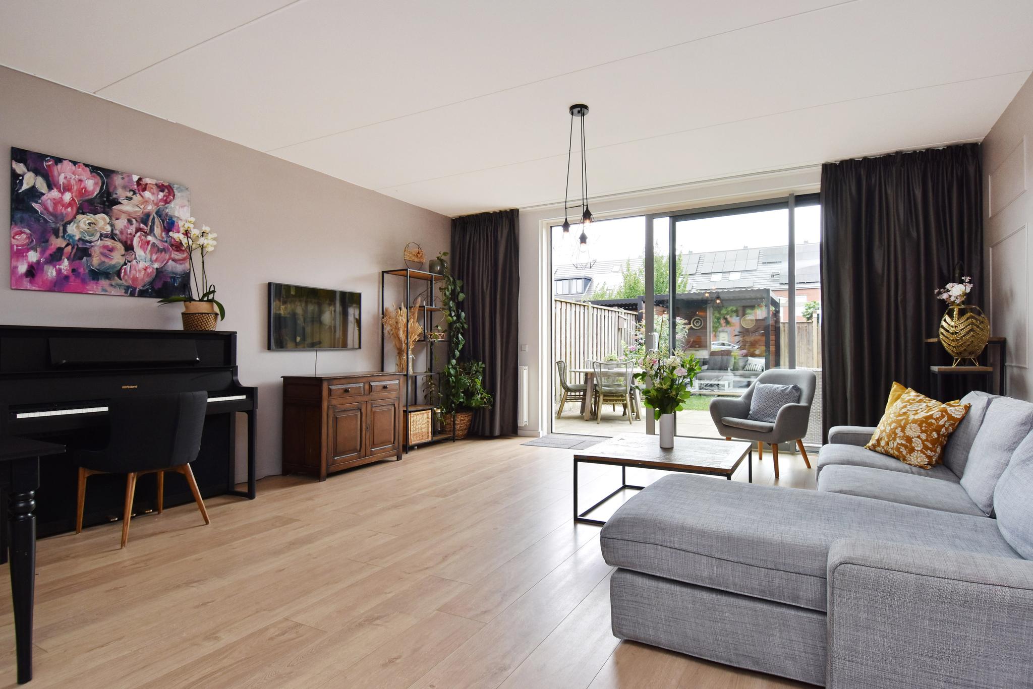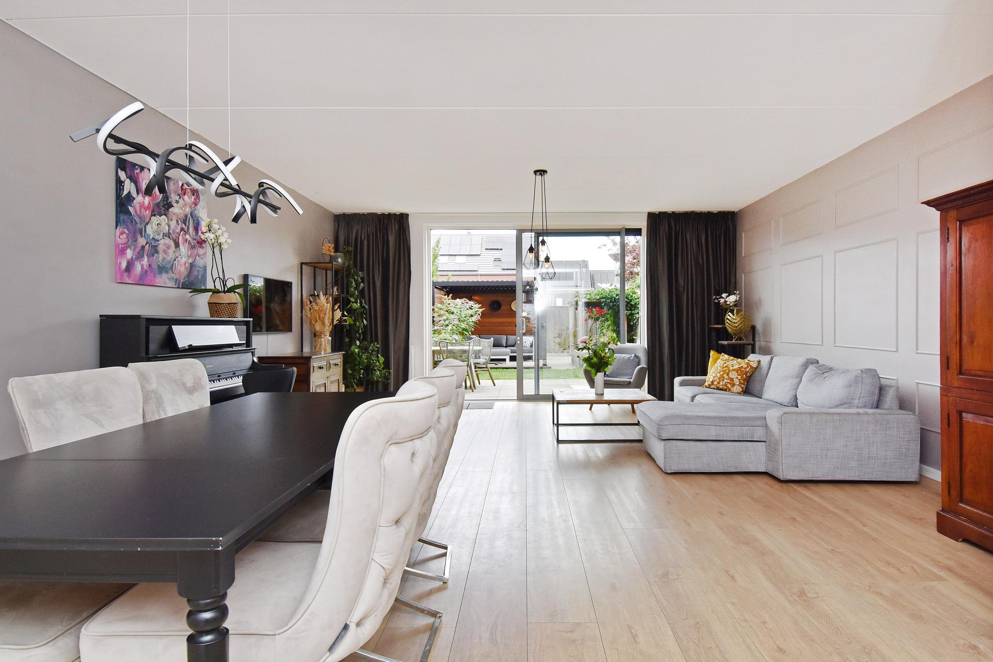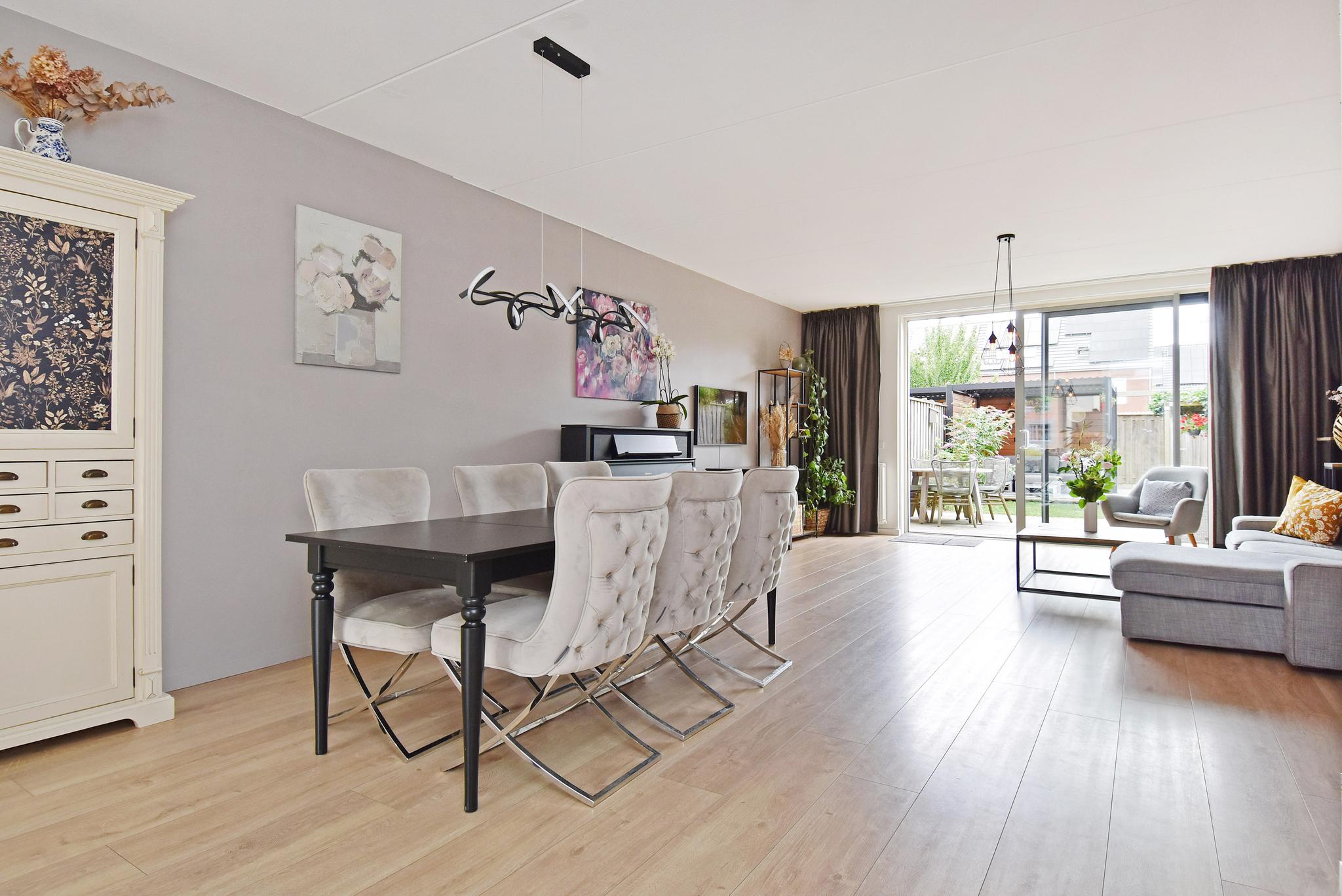 De woonkamer is aan de achterzijde uitgebouwd. Deze sfeervolle leefruimte biedt volop plek voor zowel een comfortabele zithoek als een ruime eethoek. Daarnaast is er een handige trapkast voor extra opbergruimte.