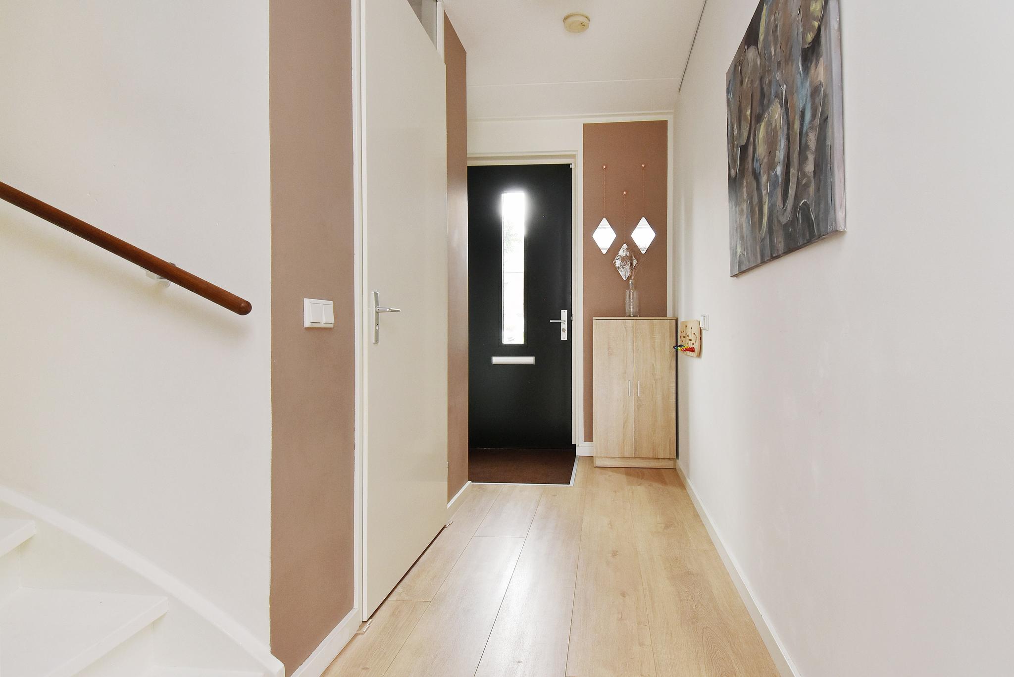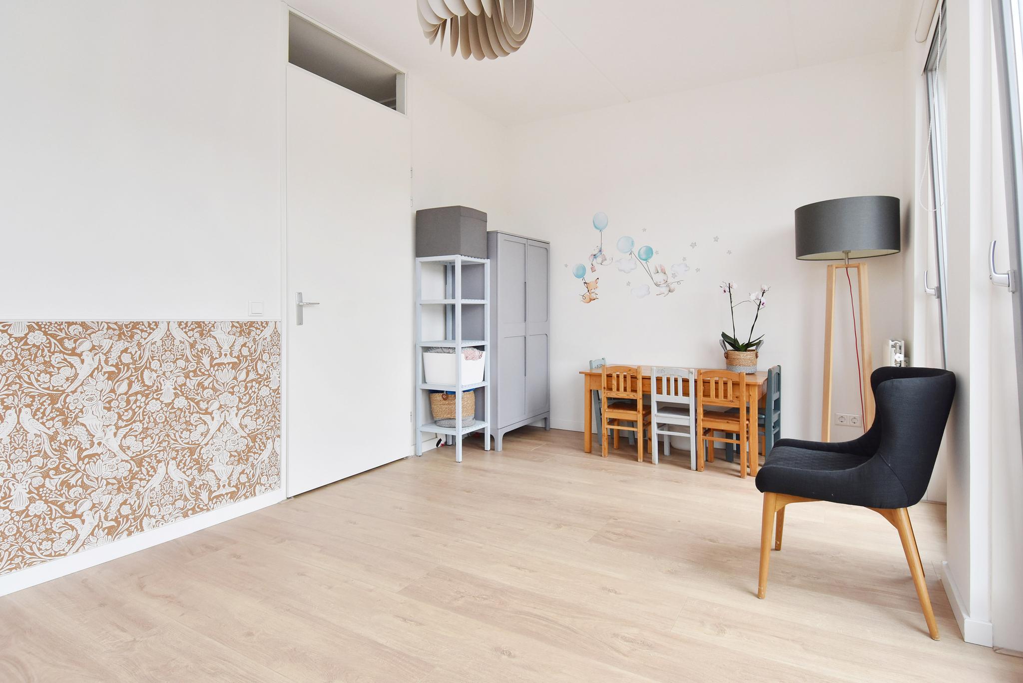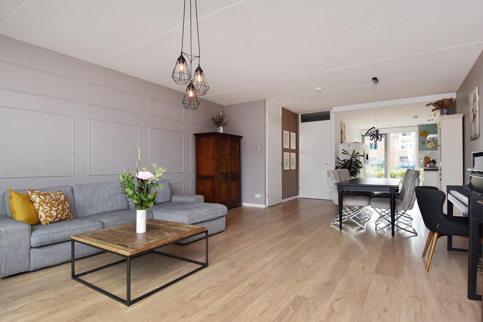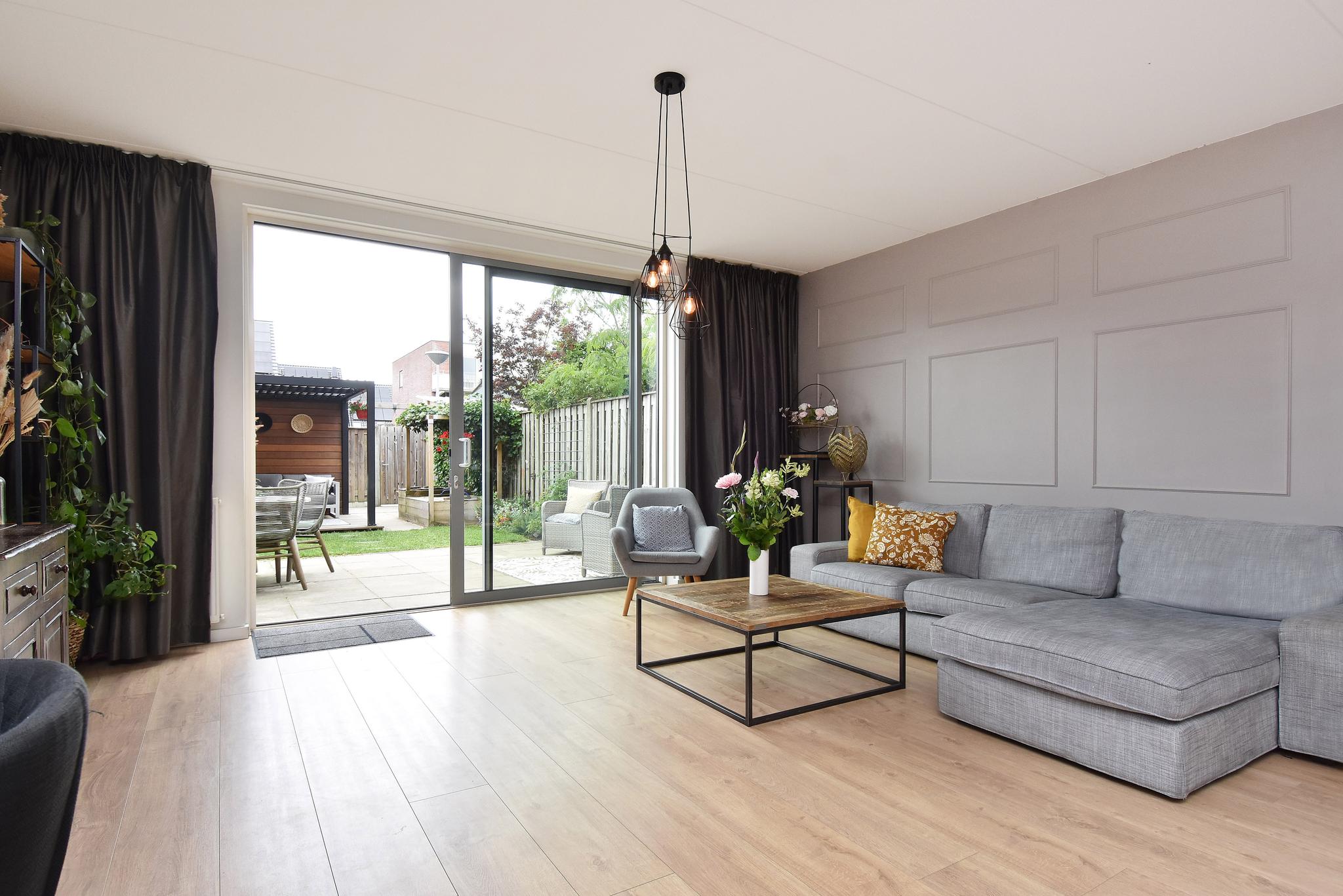 De woonkamer is aan de achterzijde uitgebouwd. Deze sfeervolle leefruimte biedt volop plek voor zowel een comfortabele zithoek als een ruime eethoek. Daarnaast is er een handige trapkast voor extra opbergruimte.