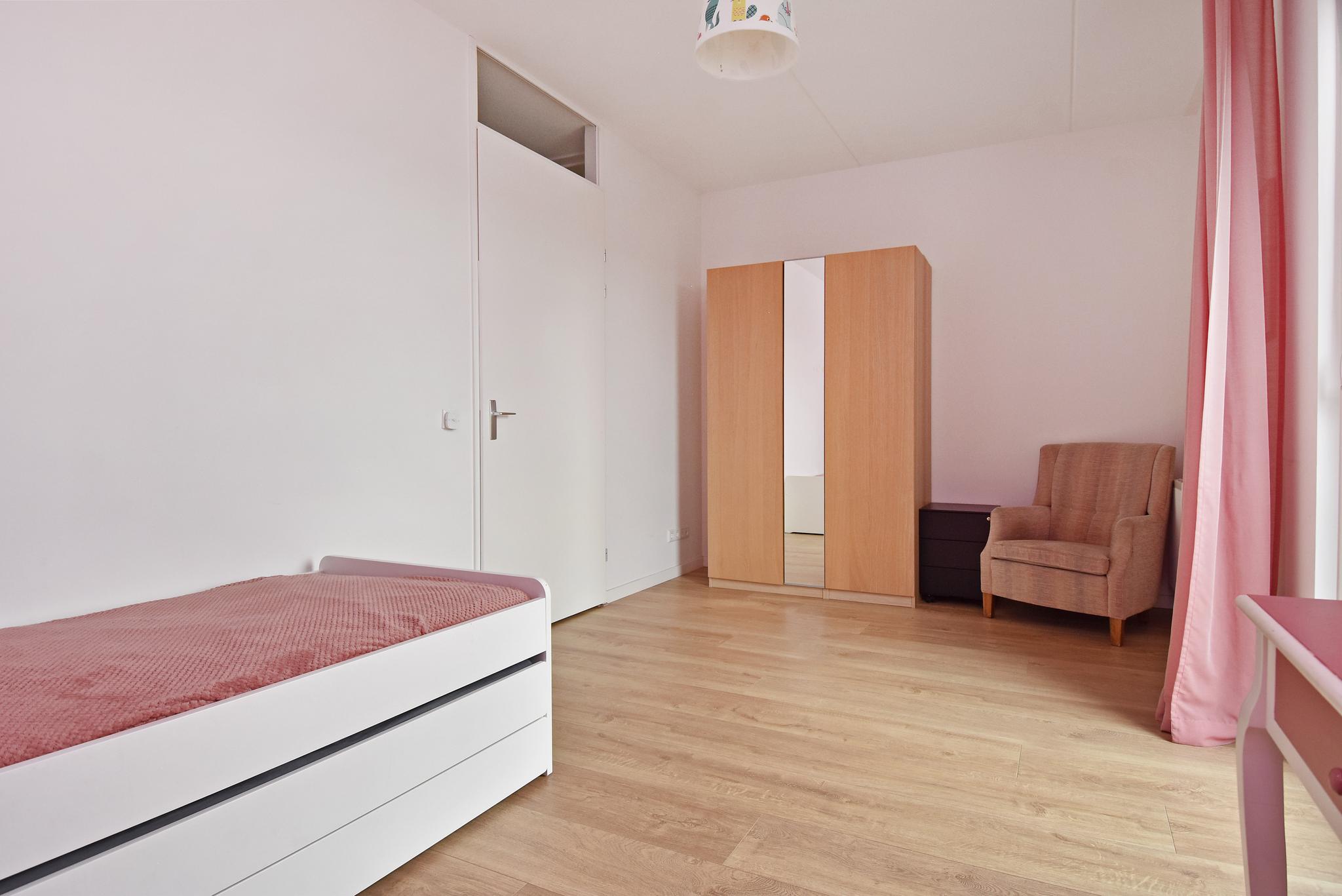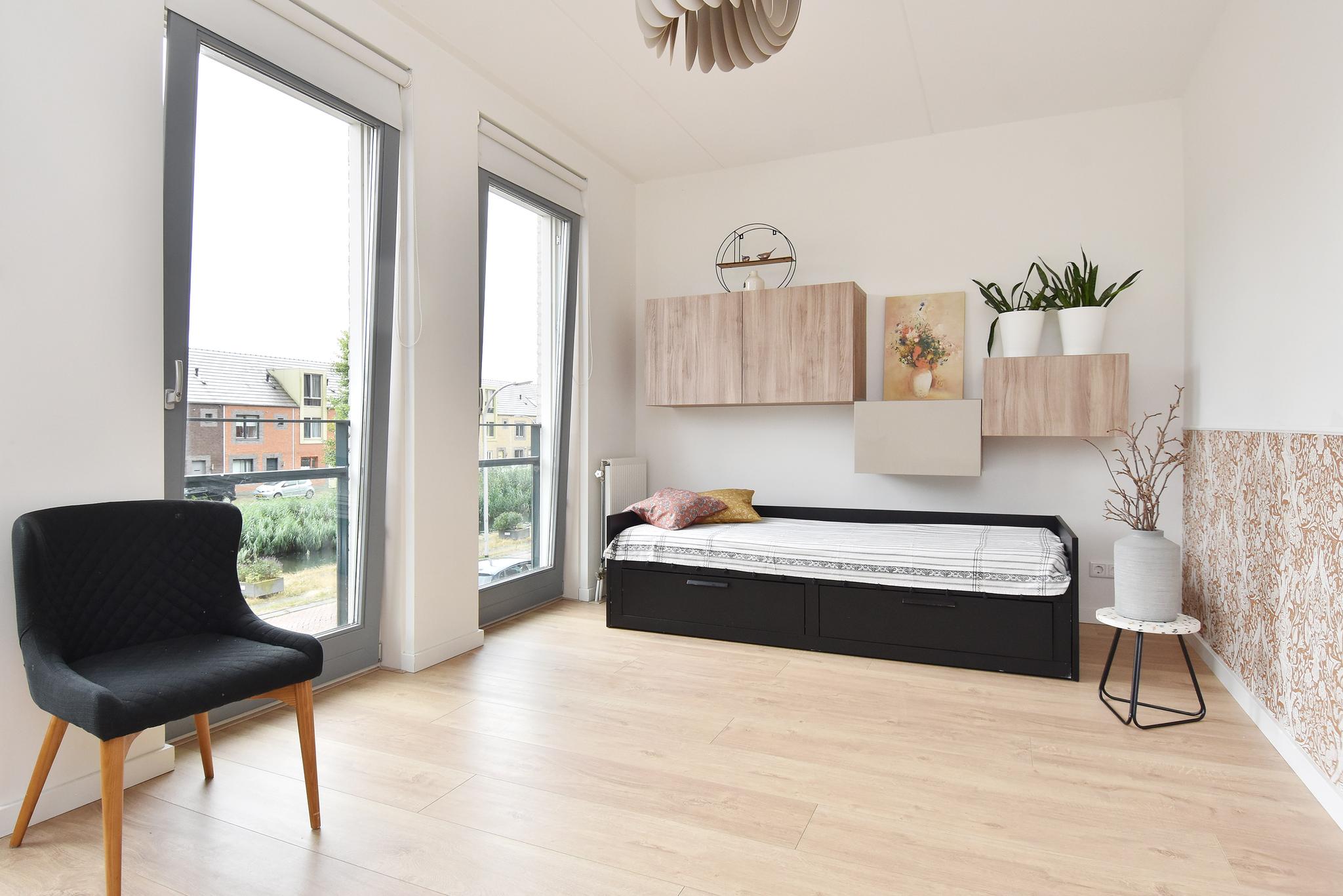 De slaapkamer aan de voorzijde is voorzien van een charmant Frans balkon, waardoor er volop licht binnenvalt.