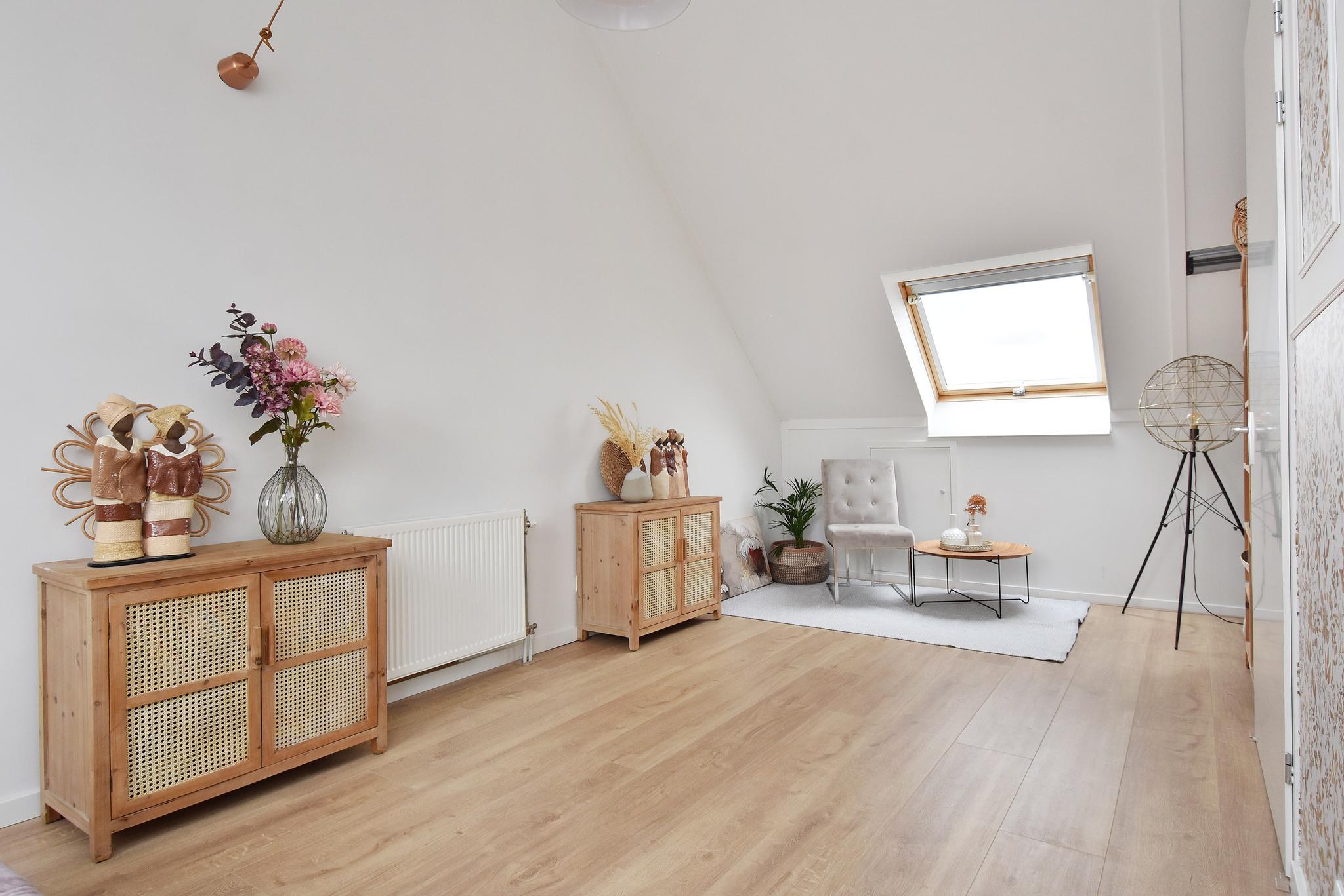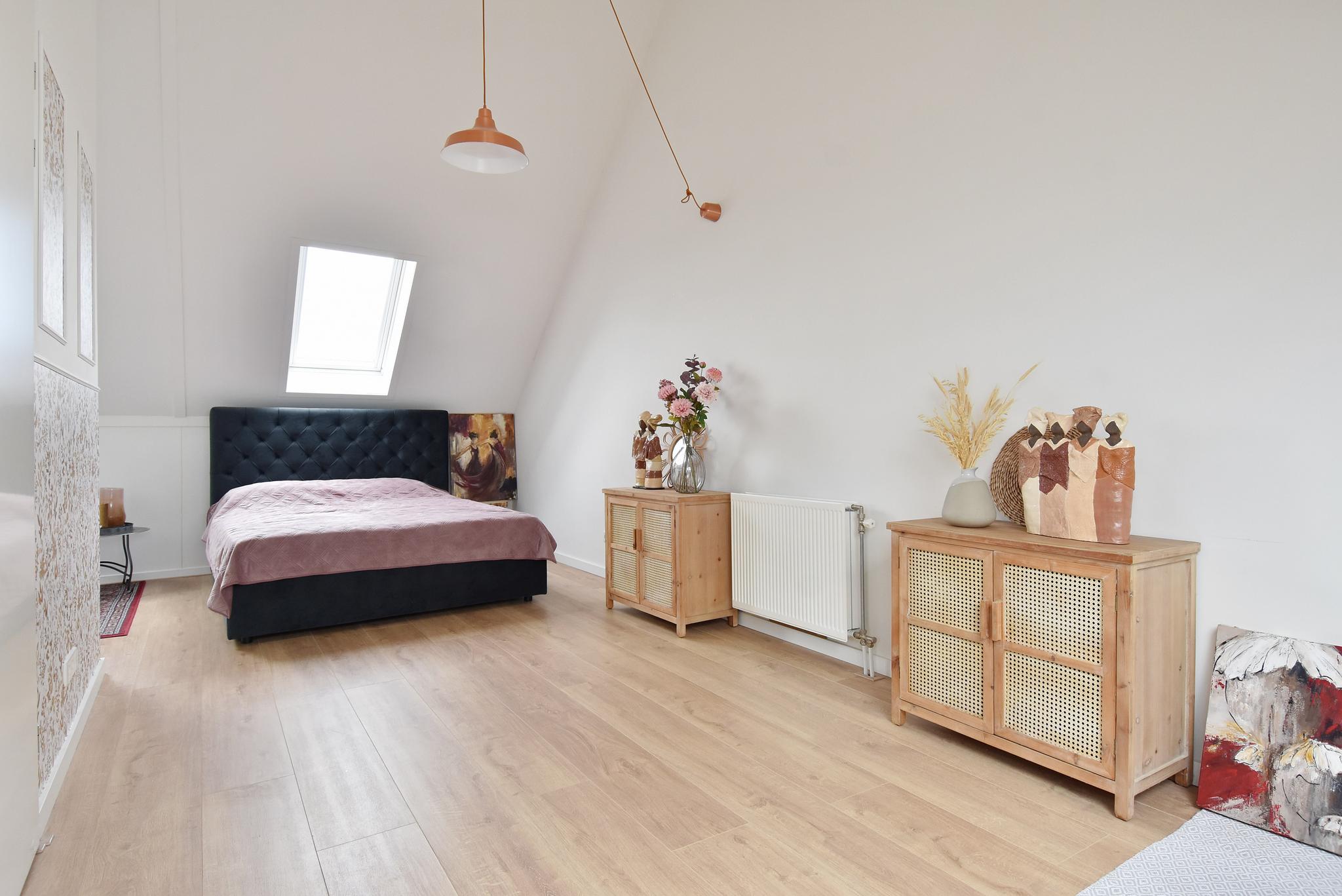 Wauw wat een ruimte! De hoge nok geeft een nog ruimtelijker gevoel. Deze slaapkamer biedt meerdere mogelijkheden, geheel naar eigen wens.
