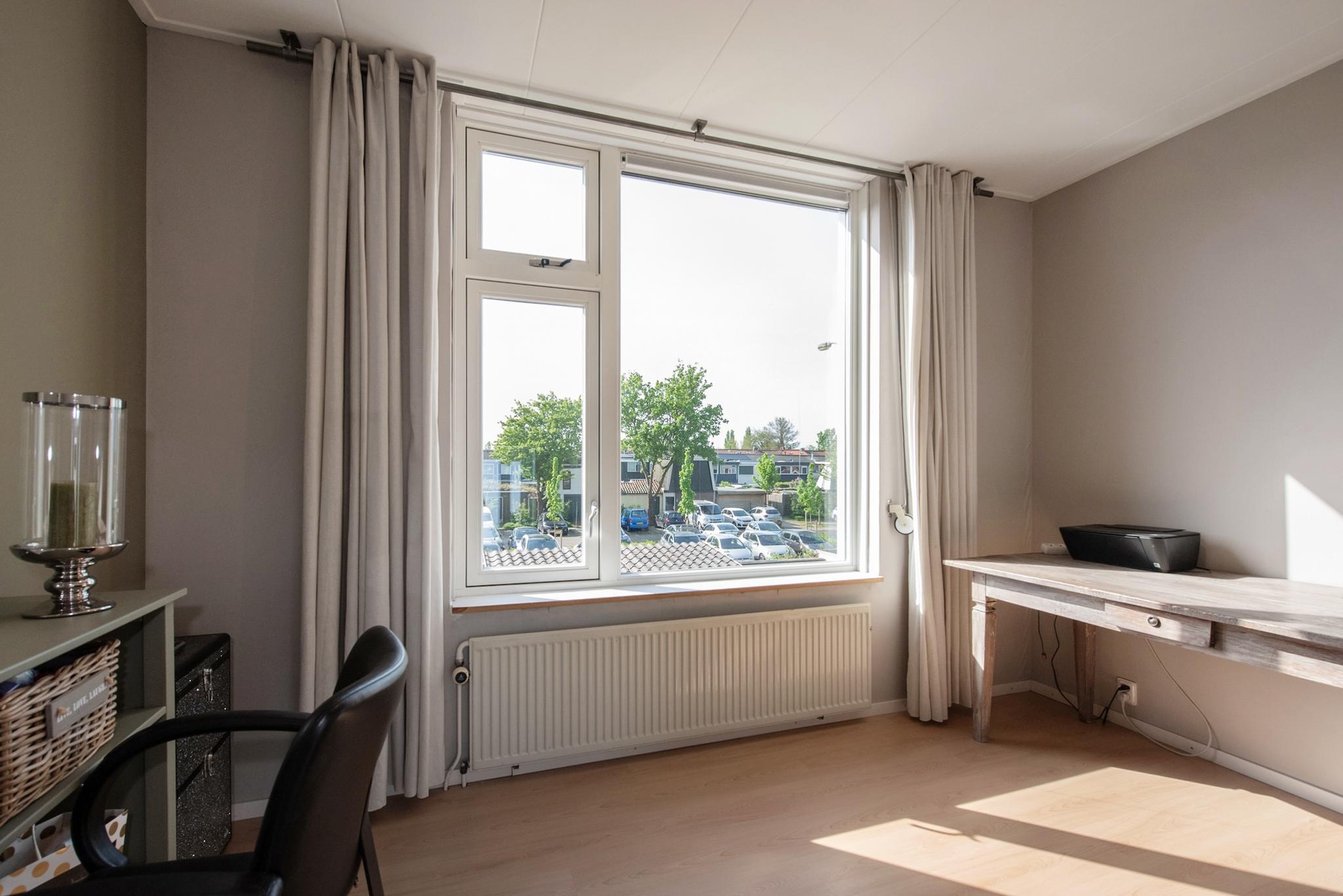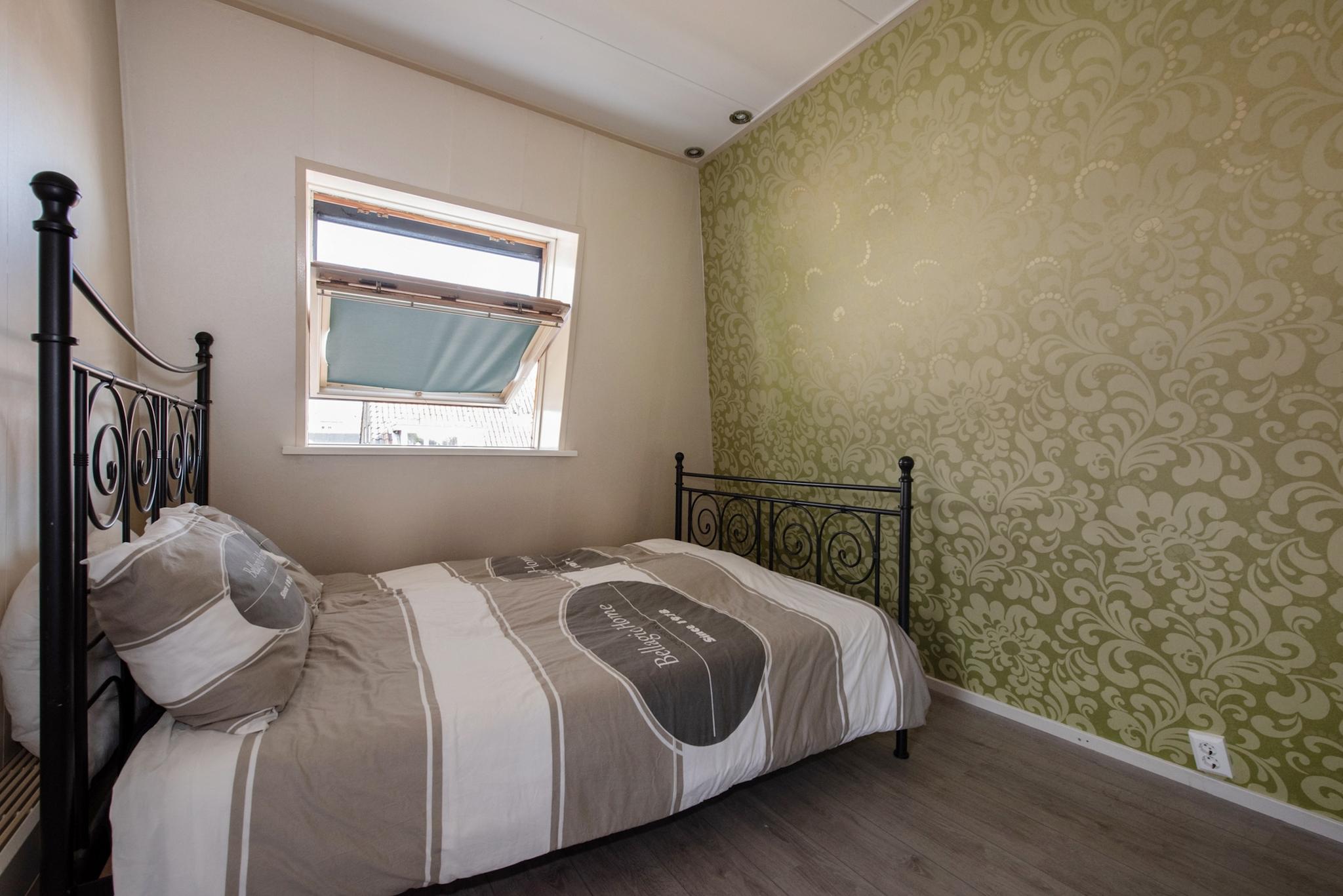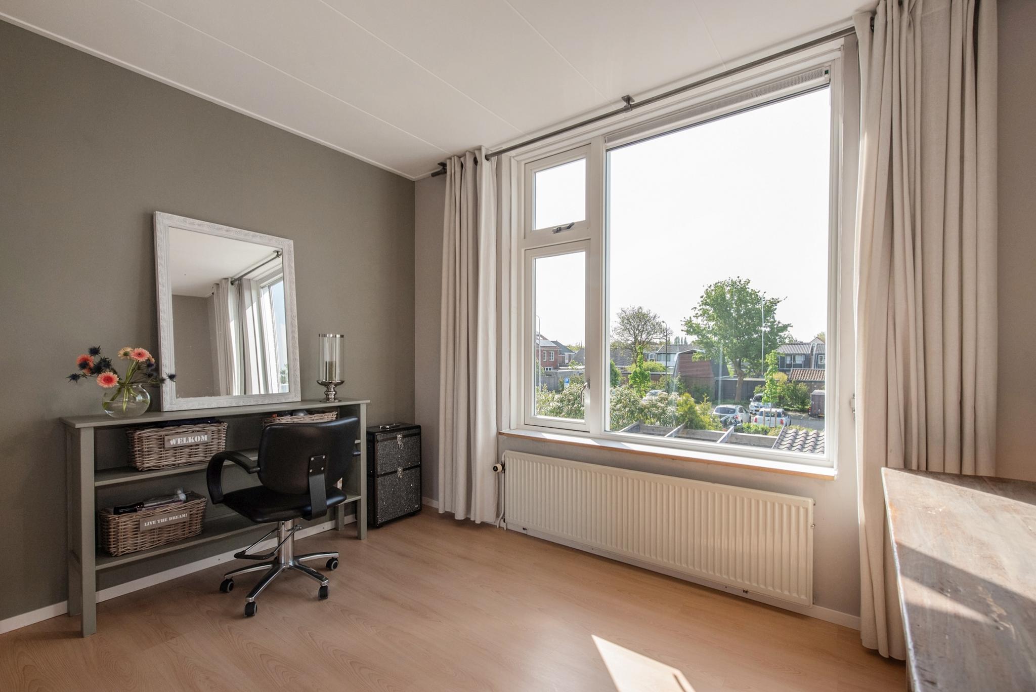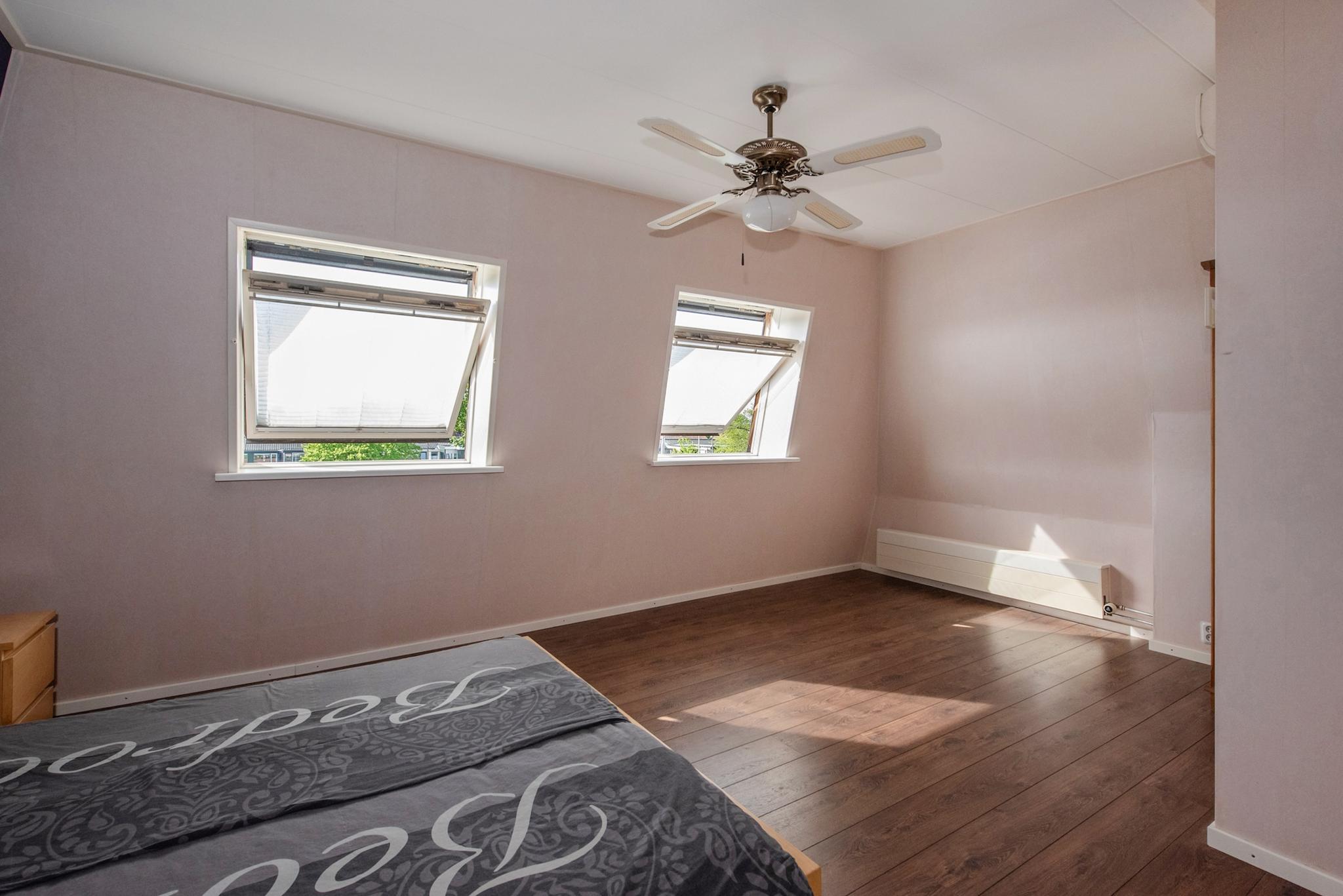 Overloop met dakkapel aan zijkant, veel lichtinval door de lichtkoepel in het platte dak, twee flink formaat slaapkamers en een kleinere (werk-studeer-garderobe) kamer. Deze etage is eveneens voorzien van een laminaatvloer.