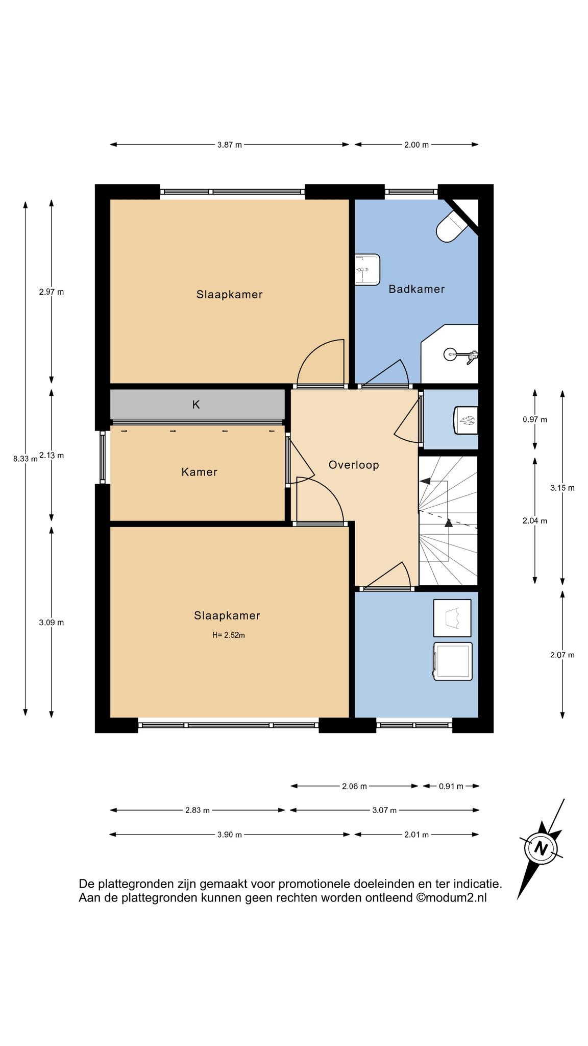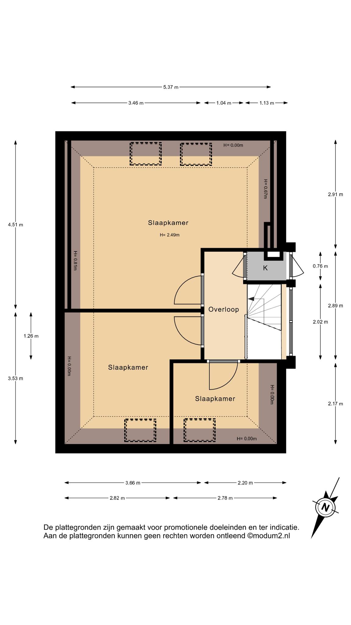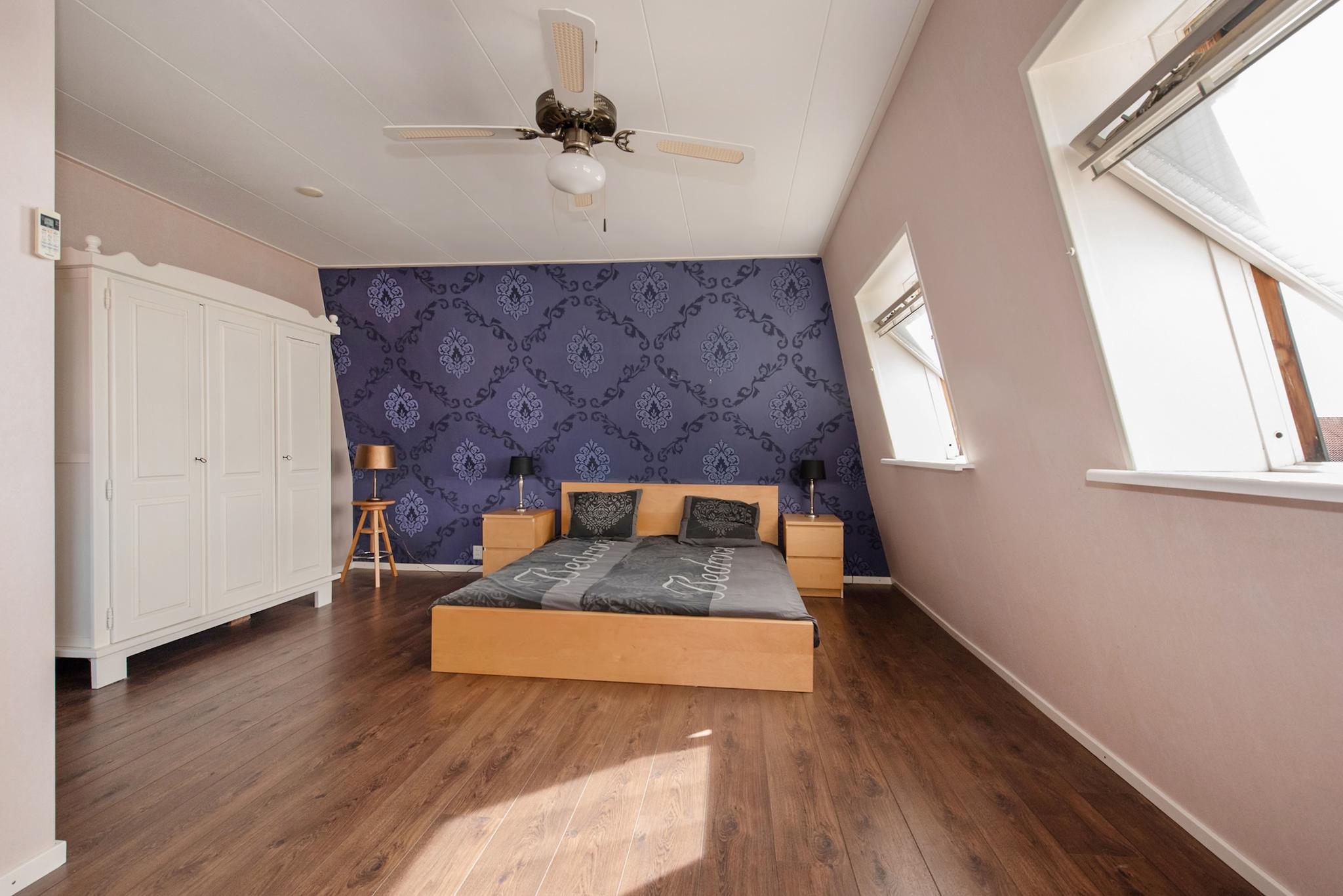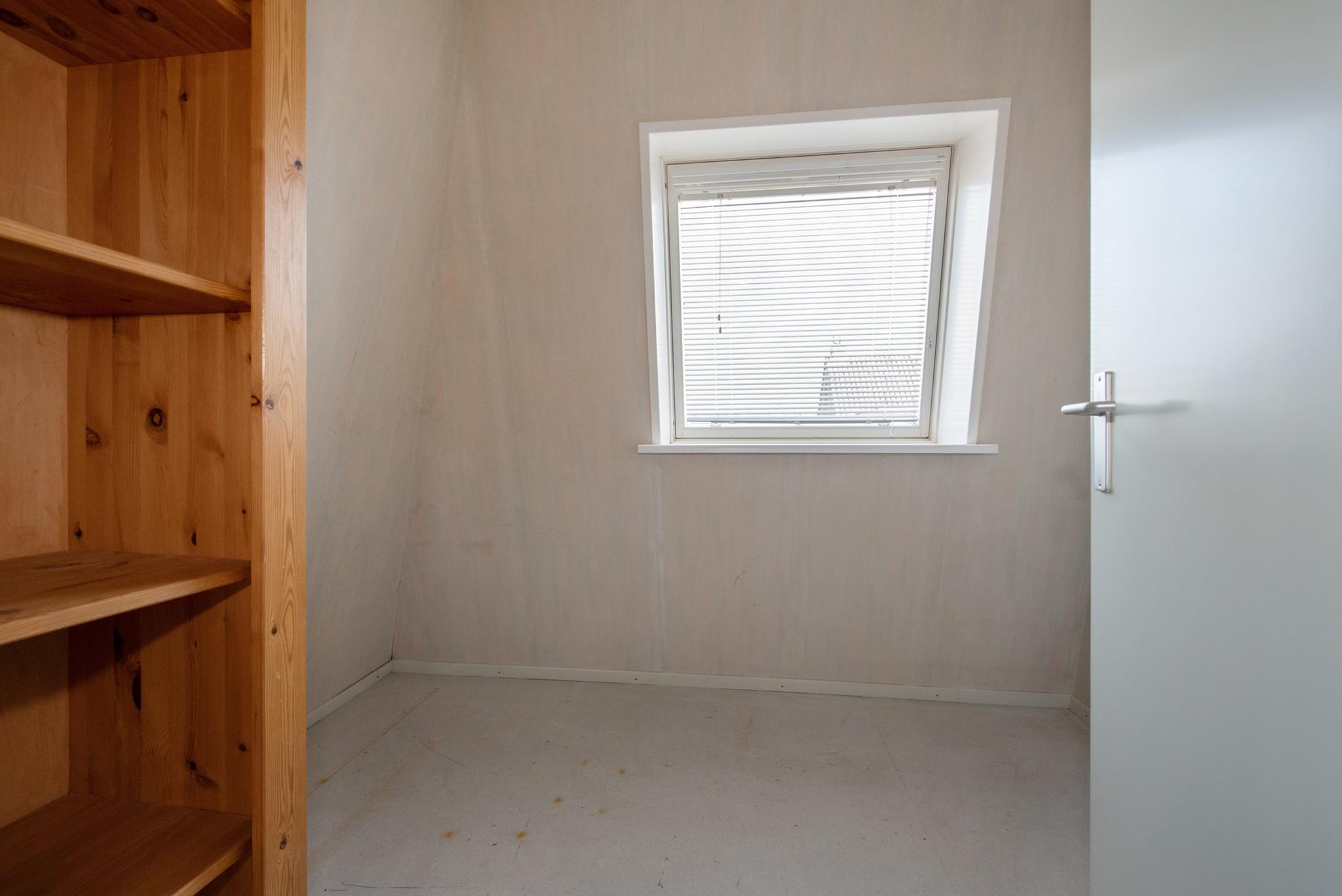 Overloop met dakkapel aan zijkant, veel lichtinval door de lichtkoepel in het platte dak, twee flink formaat slaapkamers en een kleinere (werk-studeer-garderobe) kamer. Deze etage is eveneens voorzien van een laminaatvloer.