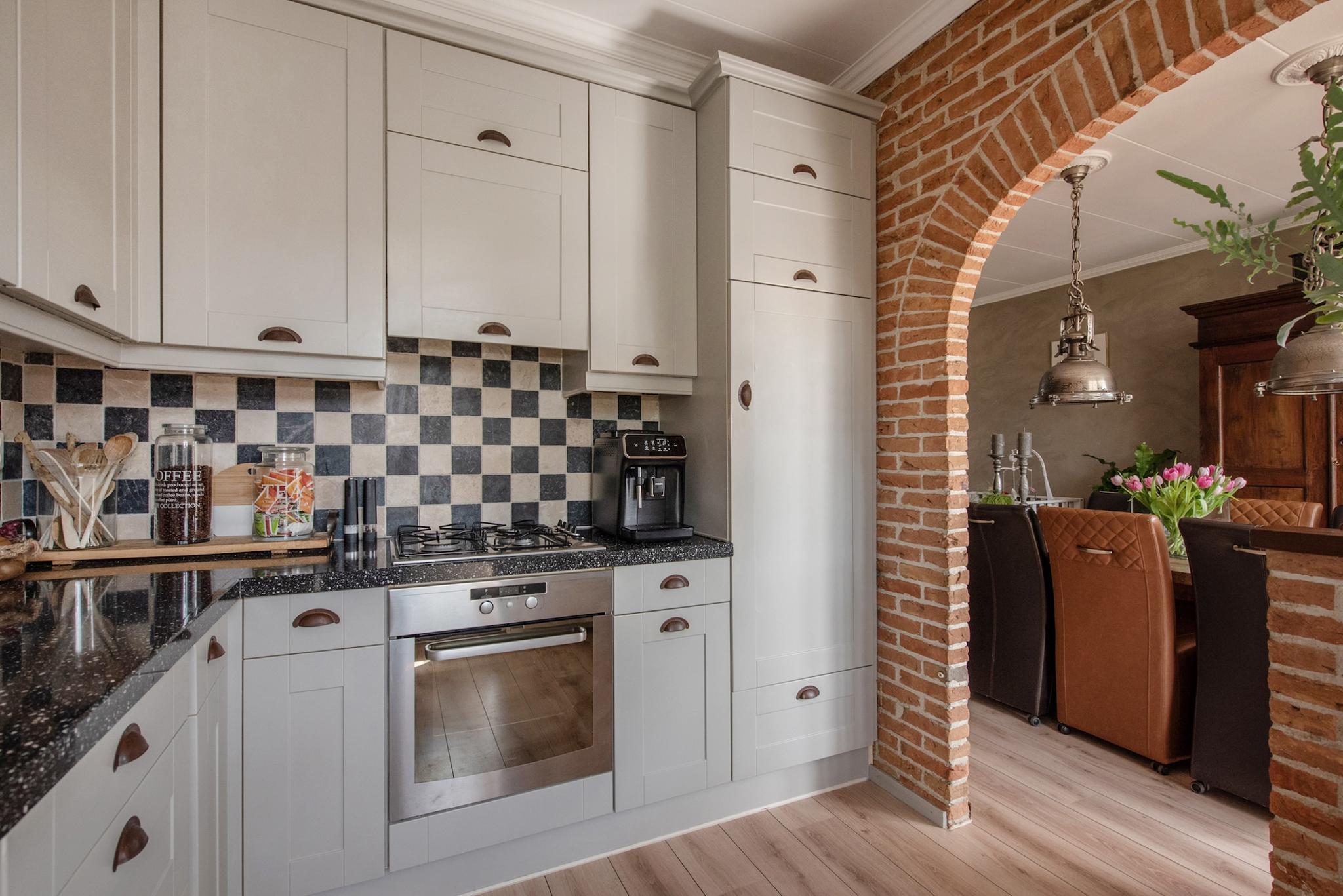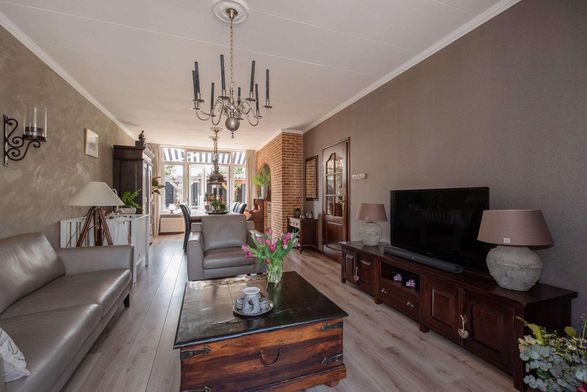Entree/hal met trapopgang naar 1e verdieping, toiletruimte met een authentiek fonteintje, toegang tot de ruime woonkamer met een gezellige erker aan de voorzijde. De woonkamer is voorzien van een laminaatvloer met vloerverwarming. Aan de achterzijde bevindt zich de open keuken in landelijke stijl en voorzien van diverse inbouwapparatuur.