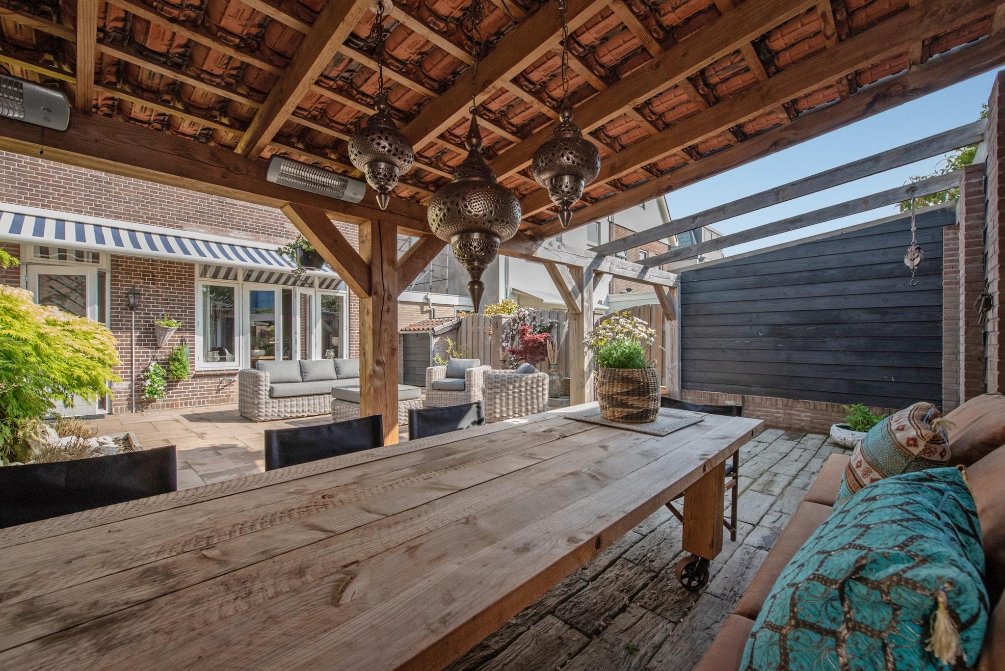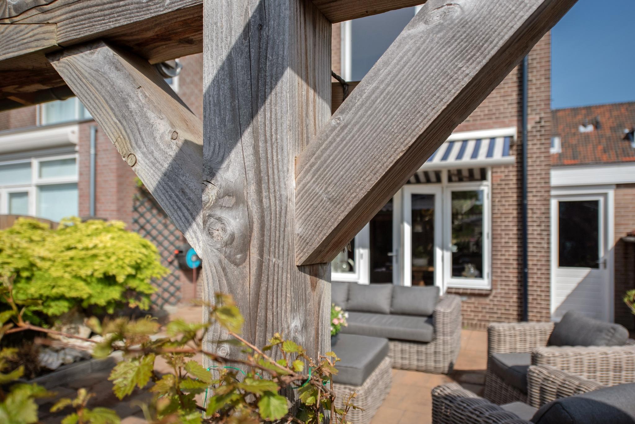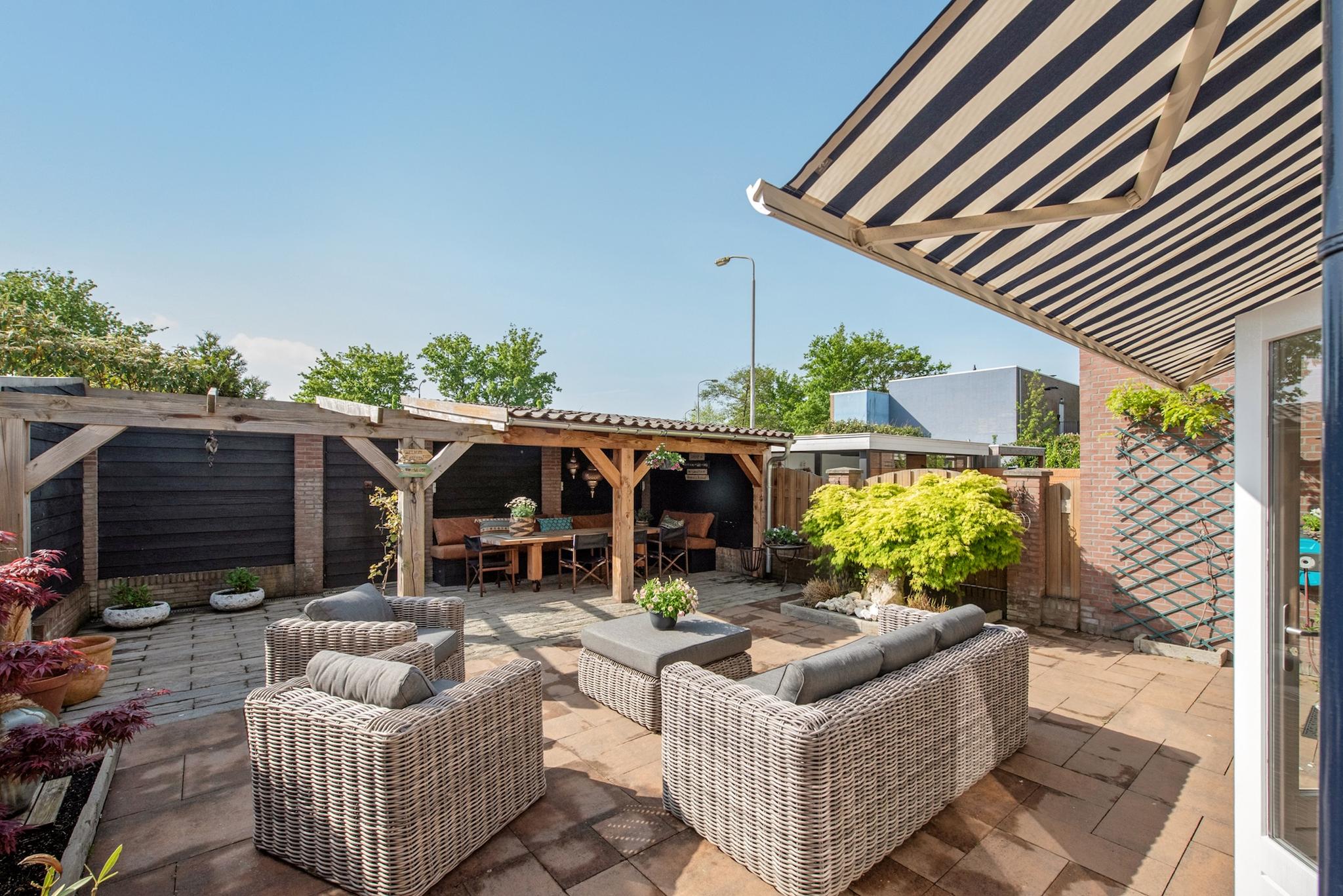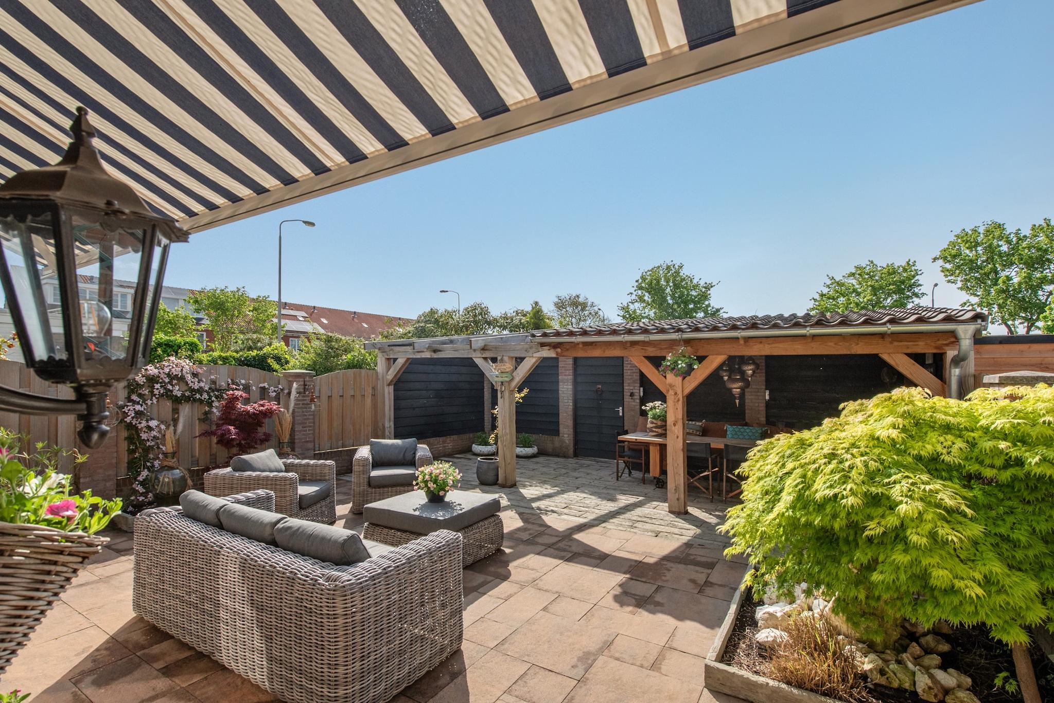 Wat een prachtige tuin! Via de openslaande deuren is toegang tot de gezellige achtertuin, met een zonnige ligging op het zuiden. Met de grote veranda overkapping is het heerlijk genieten. De aangebouwde berging is via de voor- en achtertuin toegankelijk en biedt voldoende ruimte voor onder andere de fietsen.