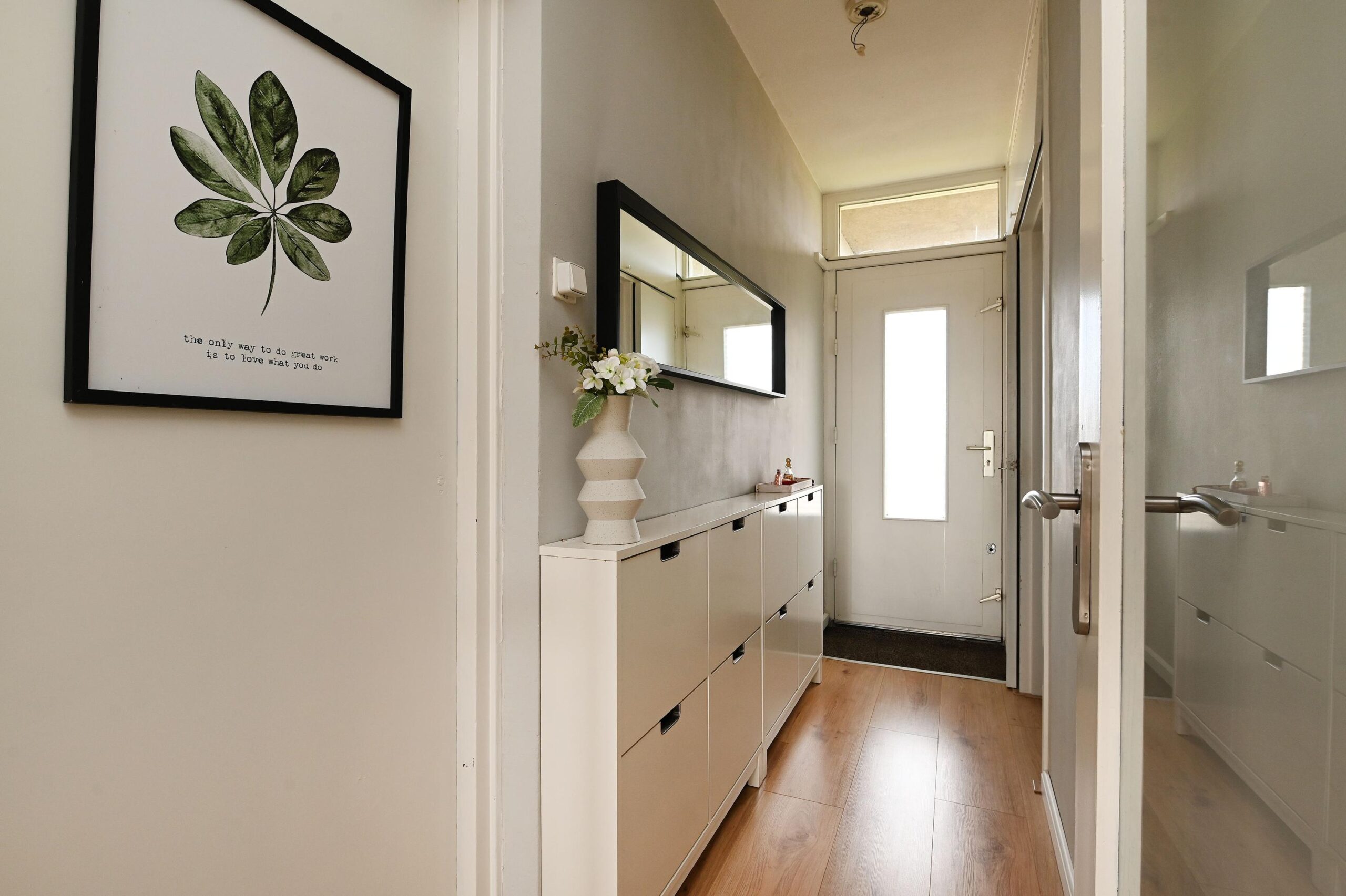 Kom binnen in het tochtportaal met meterkast en garderoberuimte.