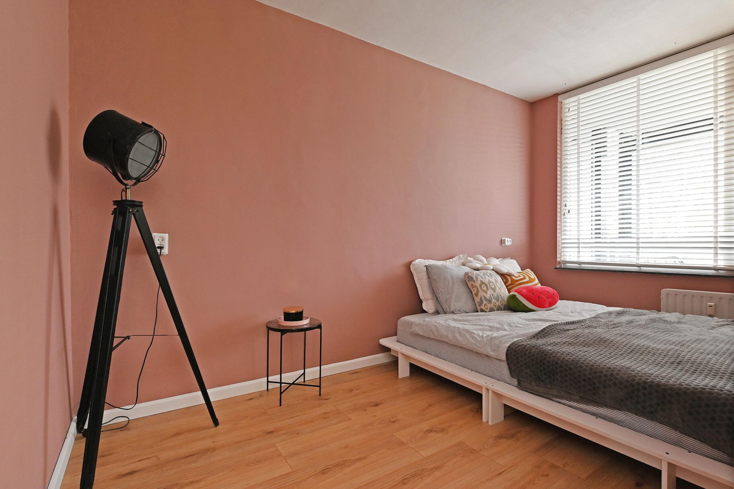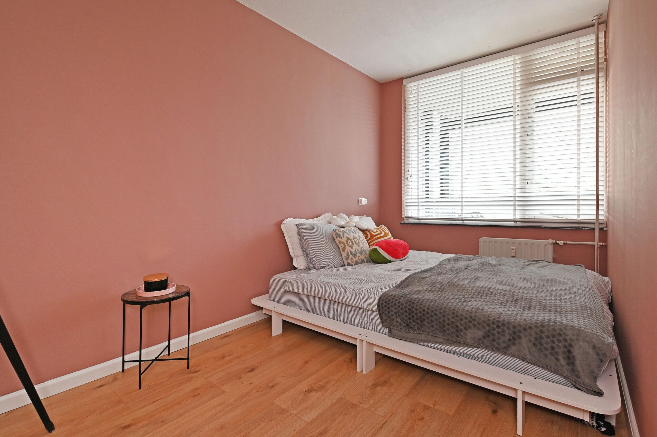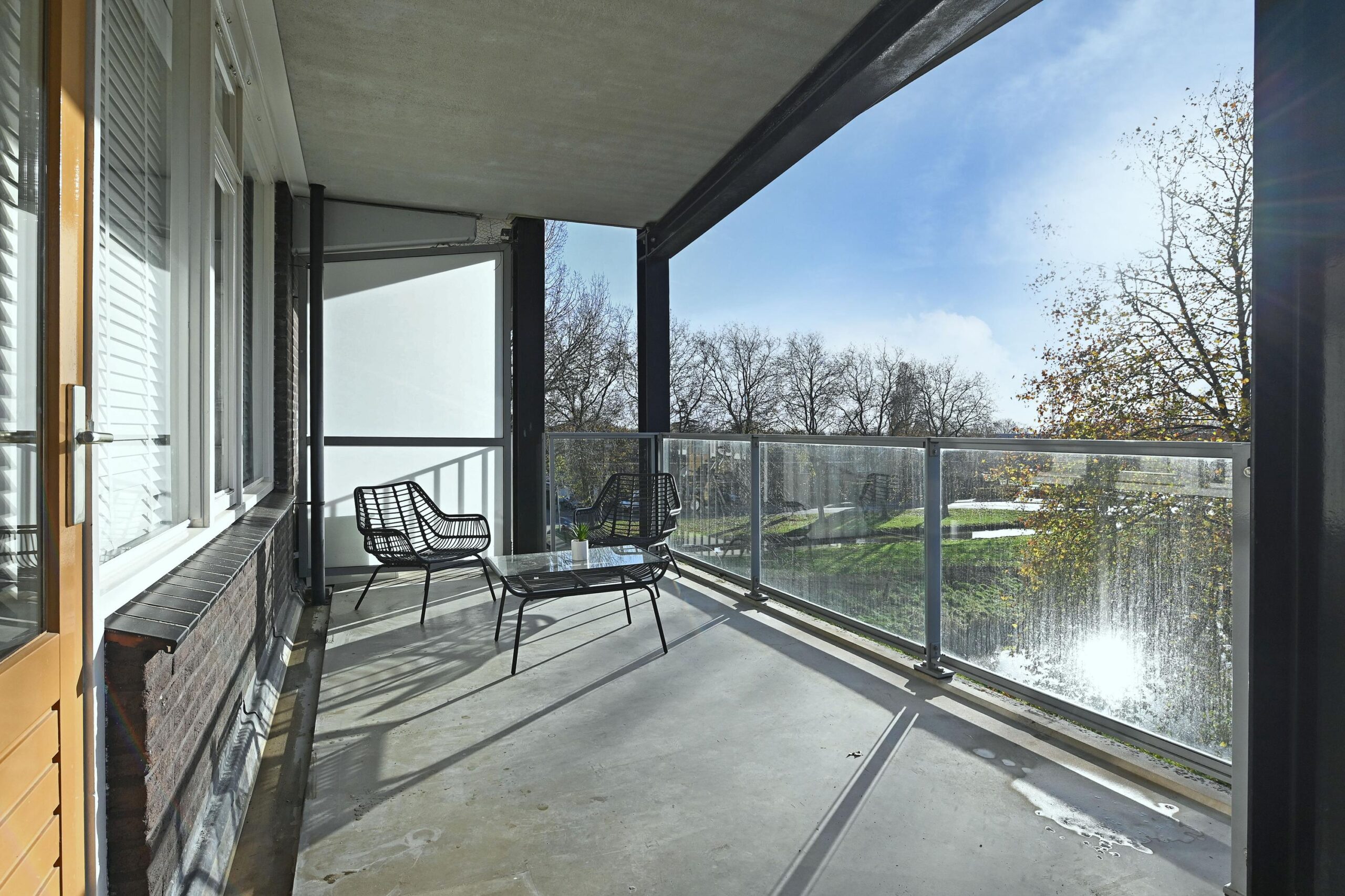 De slaapkamer aan de achterzijde geeft toegang tot het balkon. Wat een heerlijk balkon, zéér royaal (19 m²)en op het zonnige zuiden!