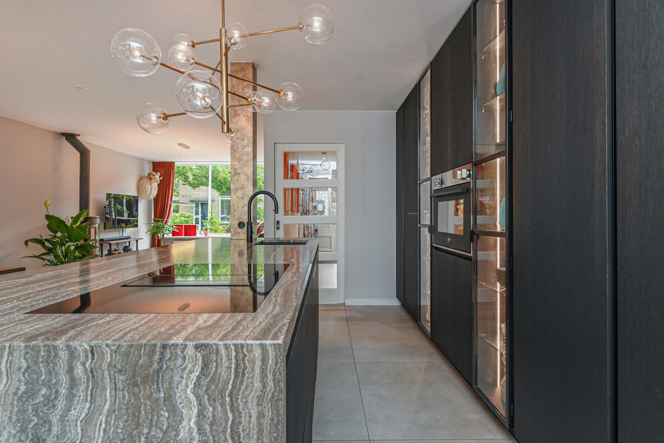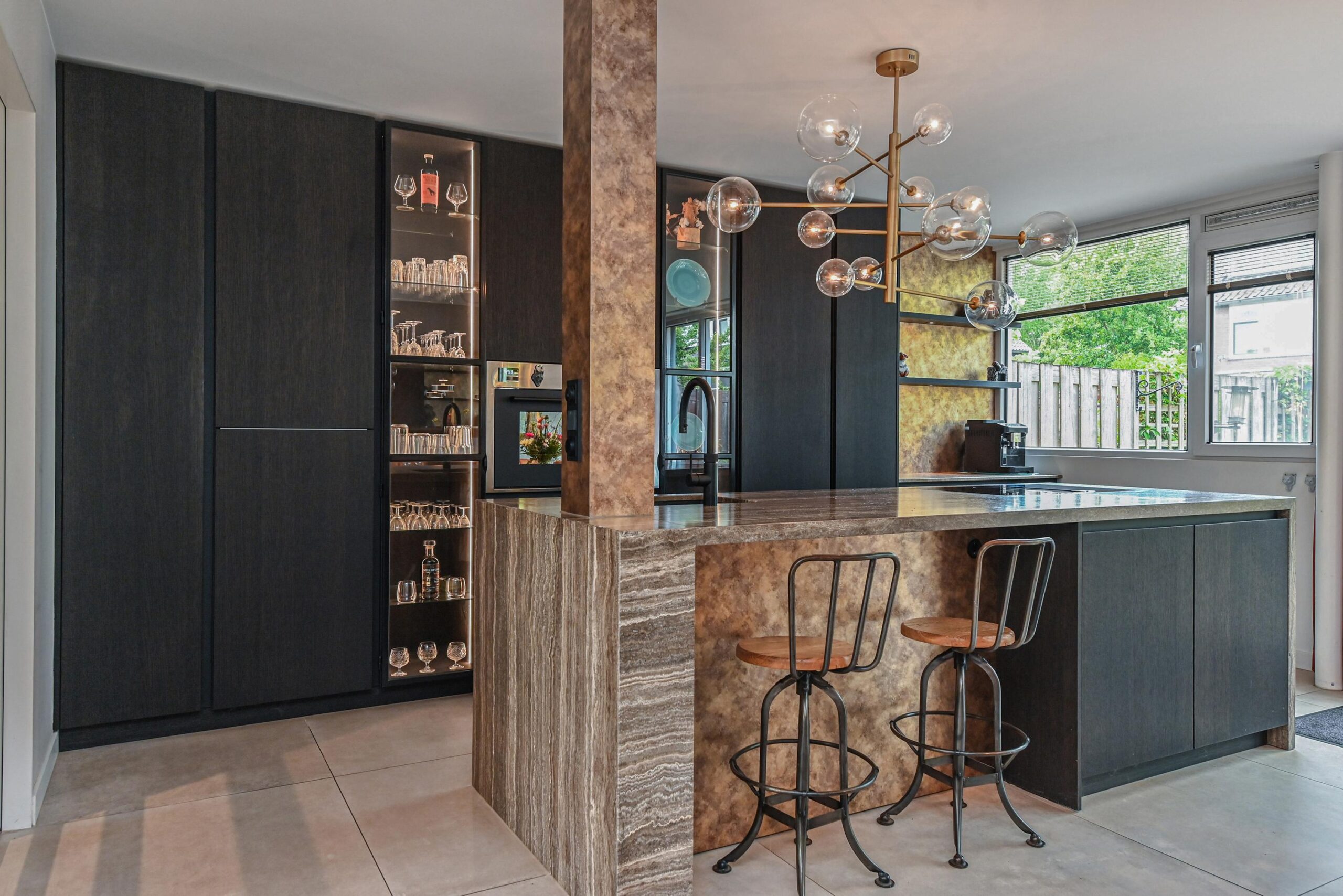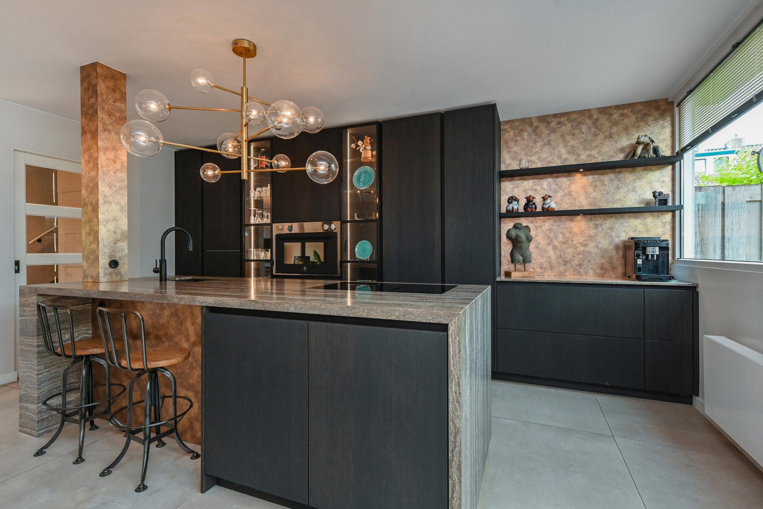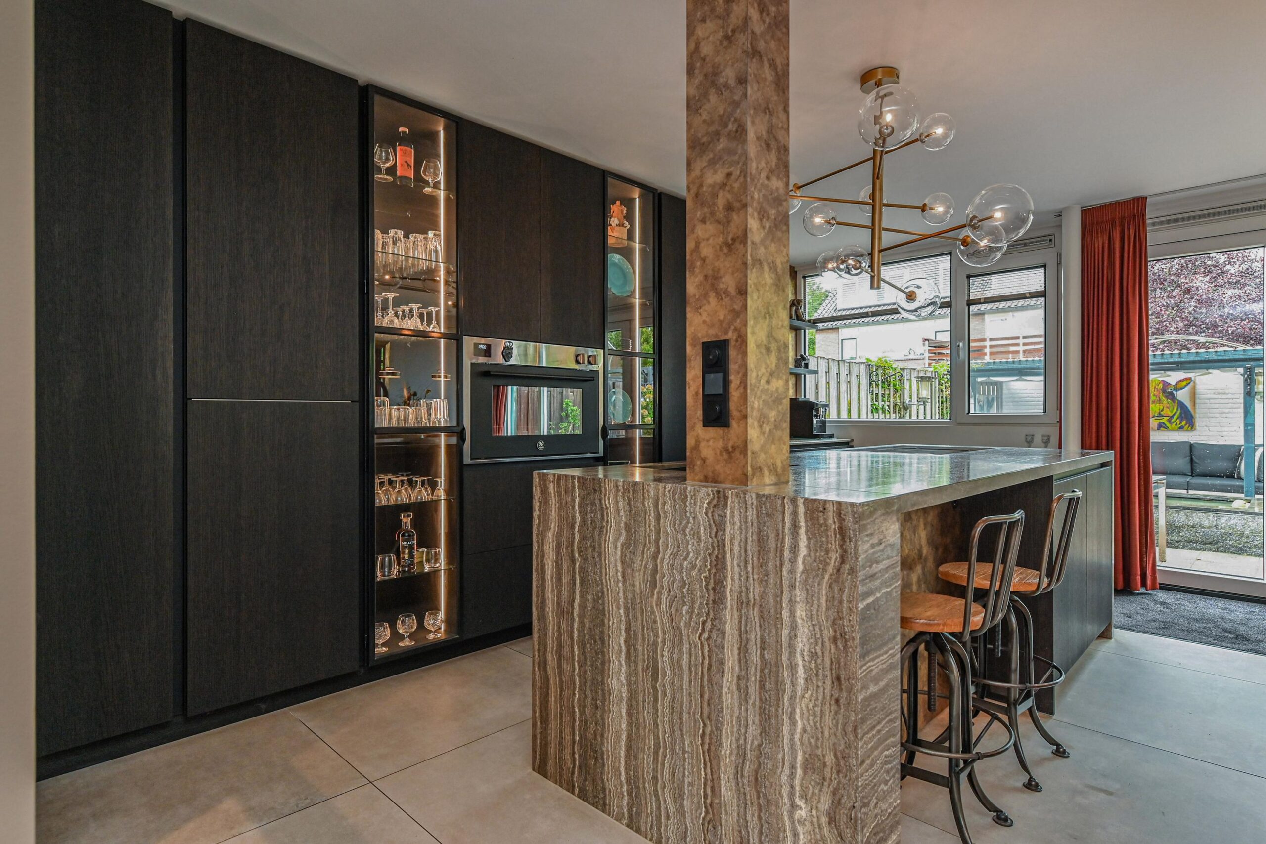 – Aan de achterzijde bevindt zich in de uitbouw een zeer luxe open keuken van het merk ‘Bollier’ met kookeiland en koffiehoek, sfeervolle verlichting, softclose sluitingen en voorzien van diverse inbouwapparatuur van hoogwaardige kwaliteit zoals: koelkast, vriezer, Quooker, vaatwasser, 90 cm oven op ooghoogte van het merk ‘Steel cucine’, inductie kookplaat met afzuiging.