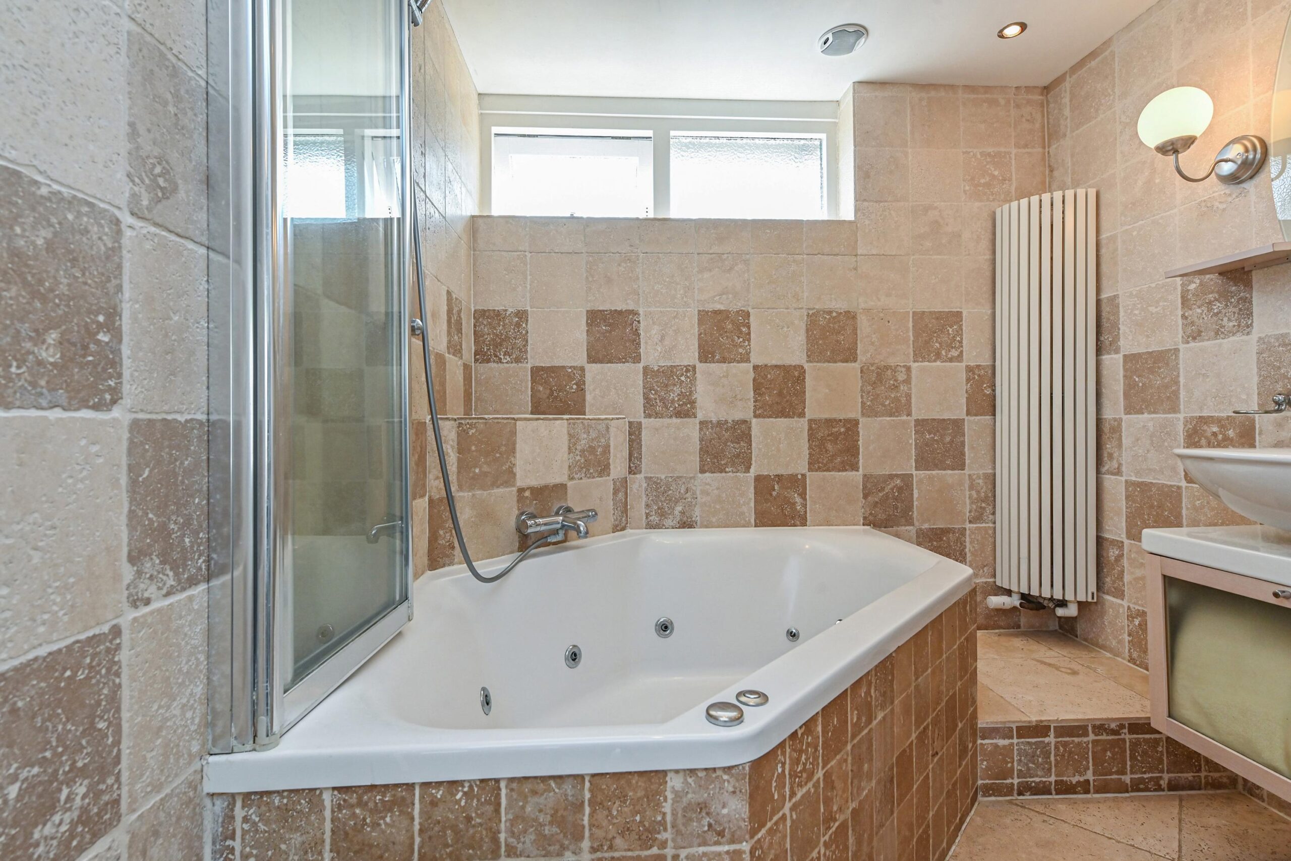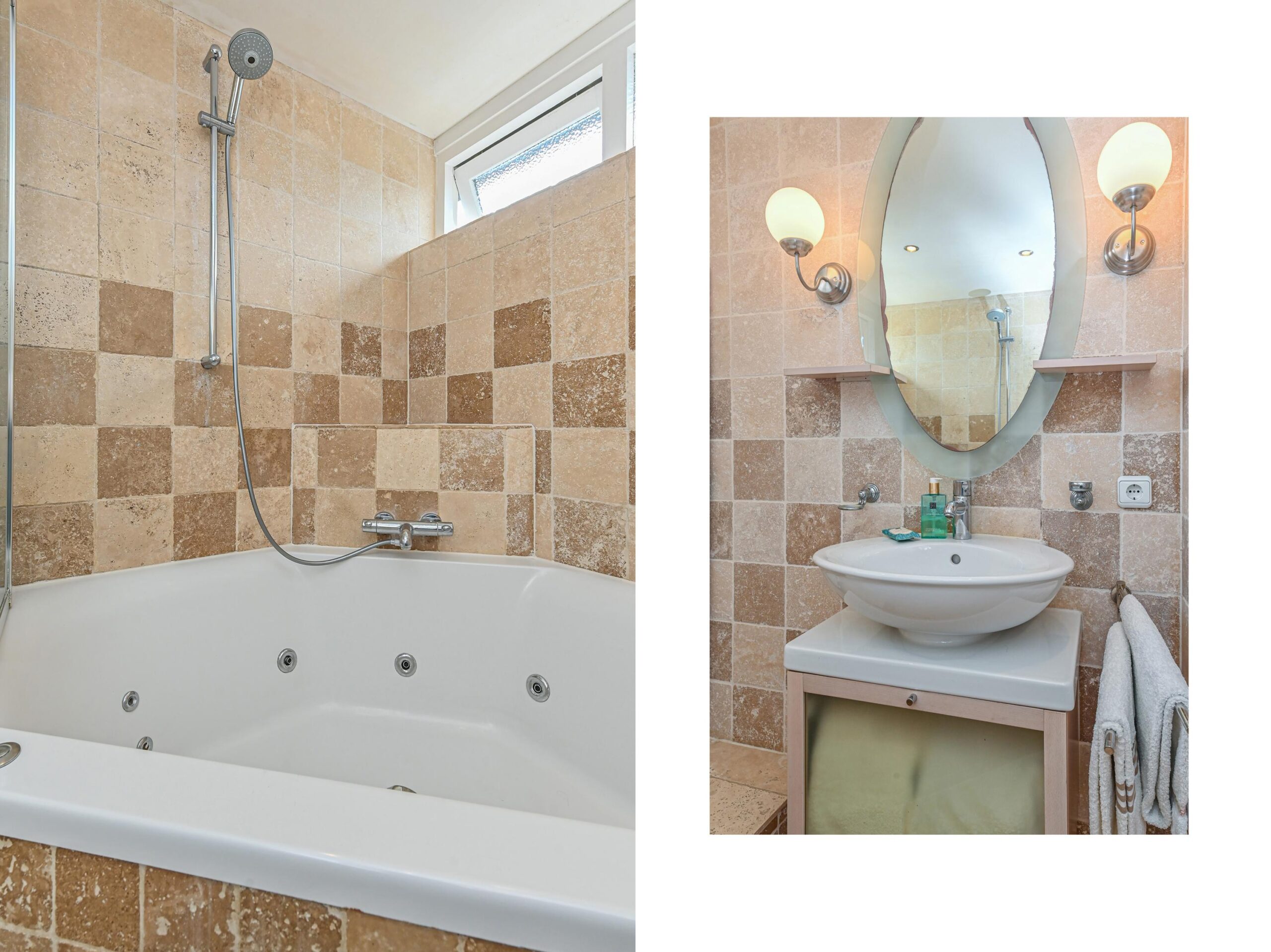 – Moderne badkamer is ingericht met een whirlpoolbad, wastafel, radiator, plafond met spots en speakersysteem en mechanische ventilatie