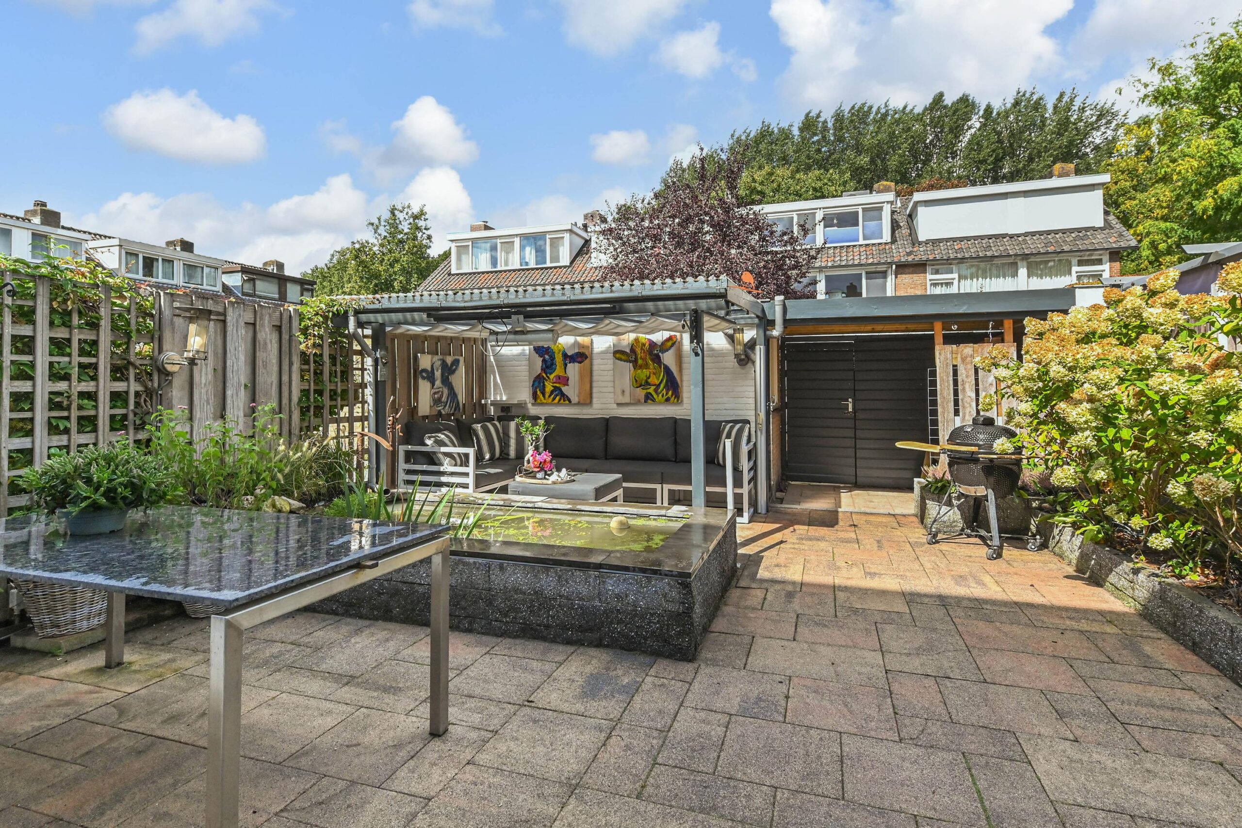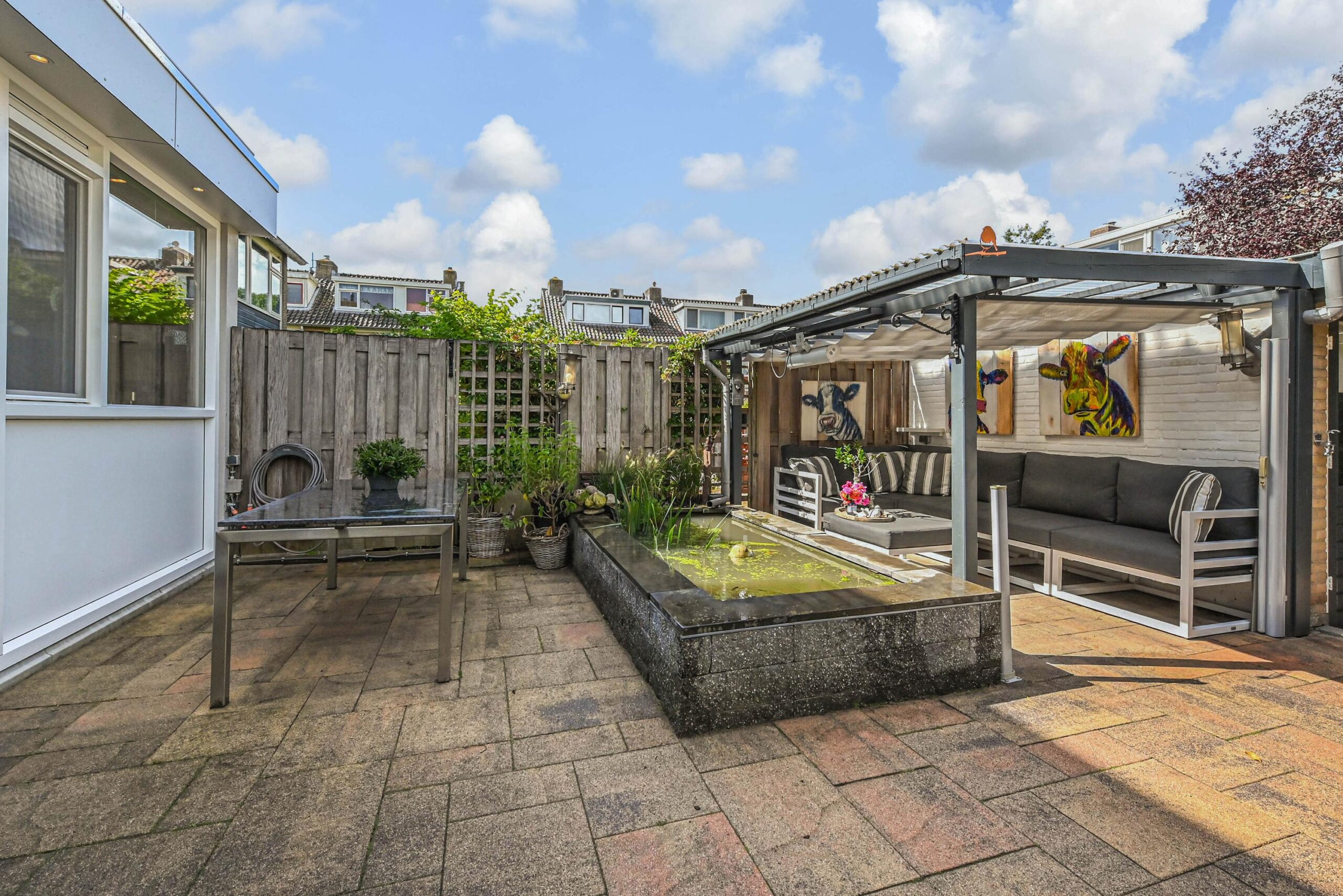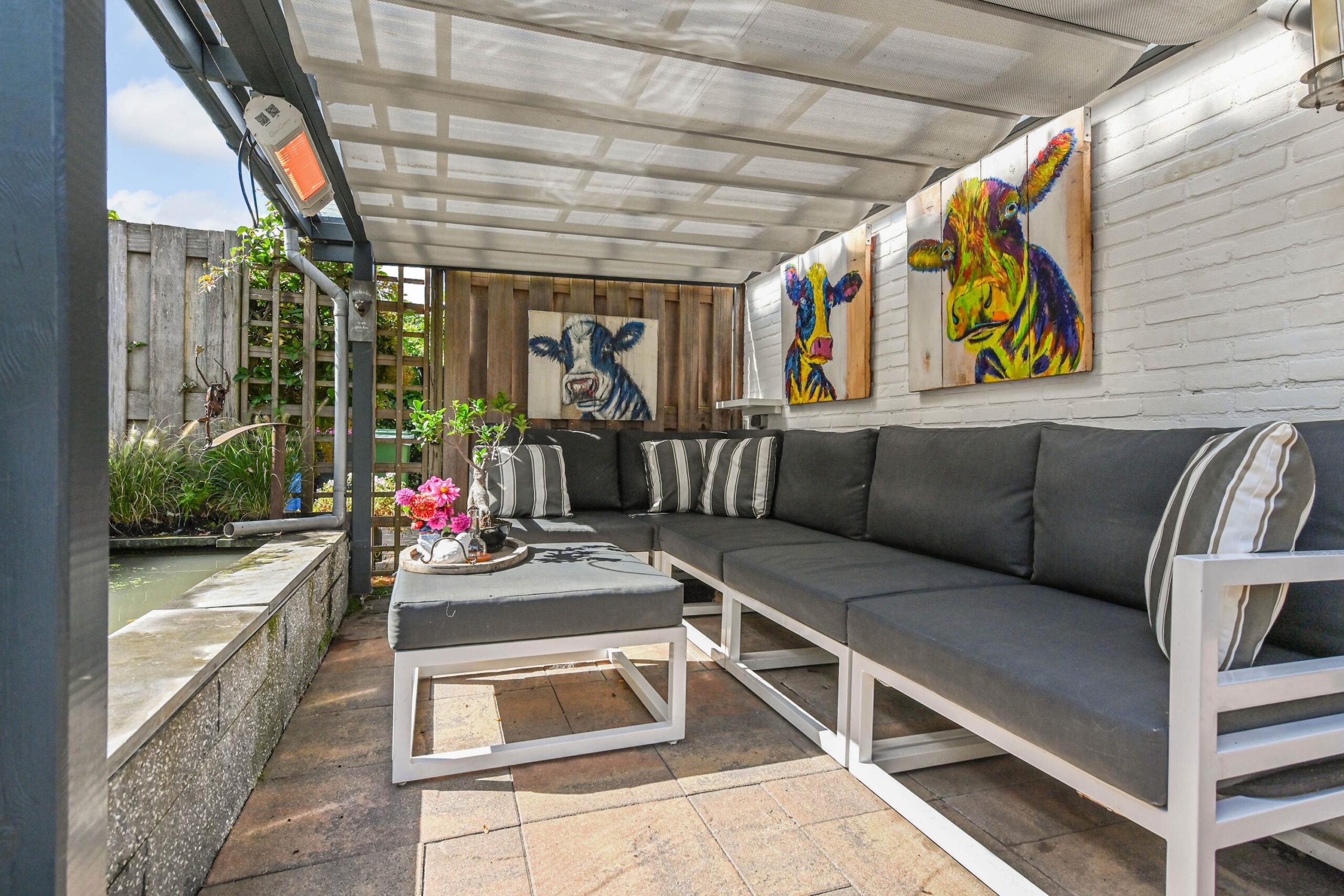 De fraai aangelegde achtertuin met overkapping, terrasheater en gezellige loungehoek is op Noordwesten gesitueerd, beschikt over een berging en is bereikbaar via een achterom.