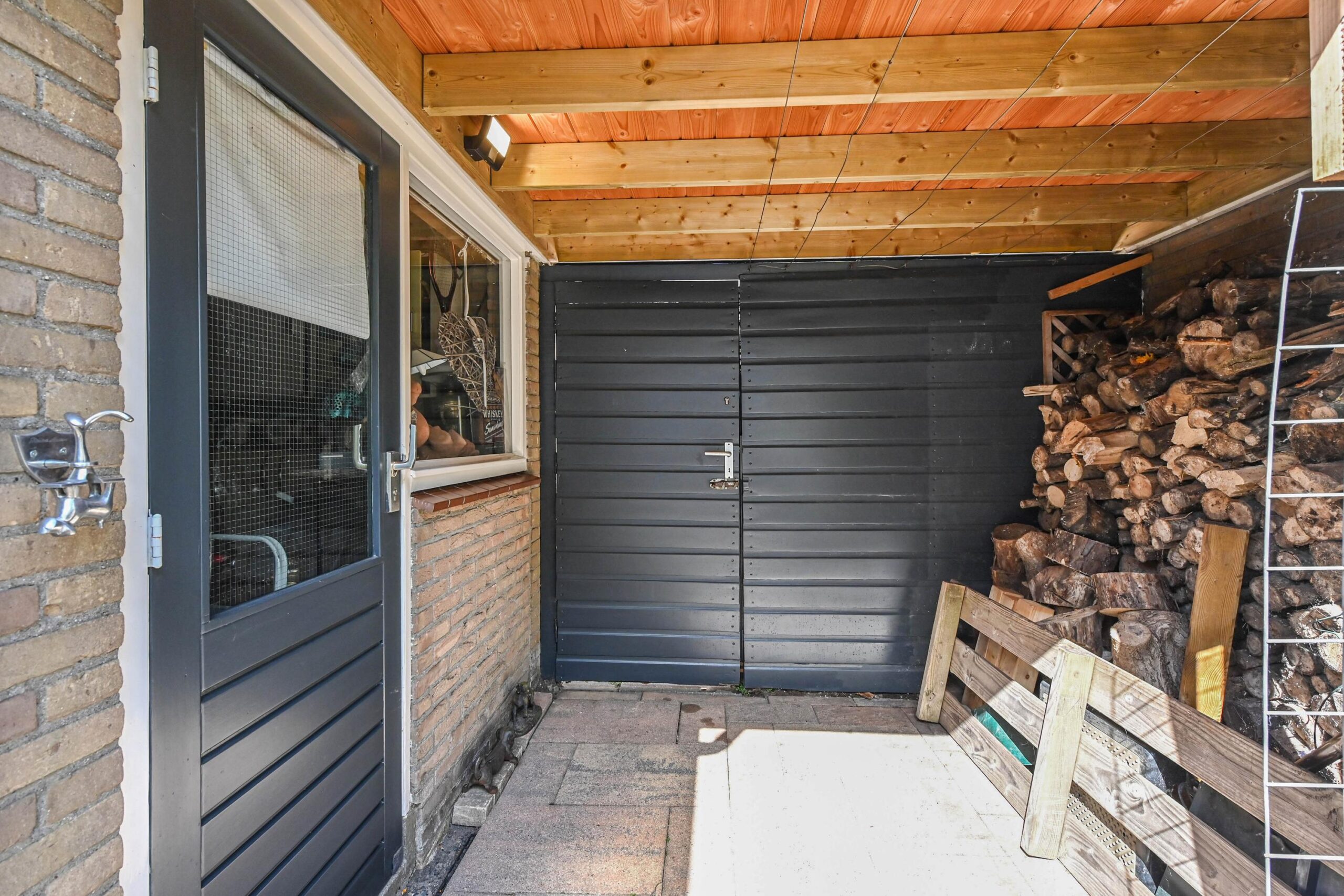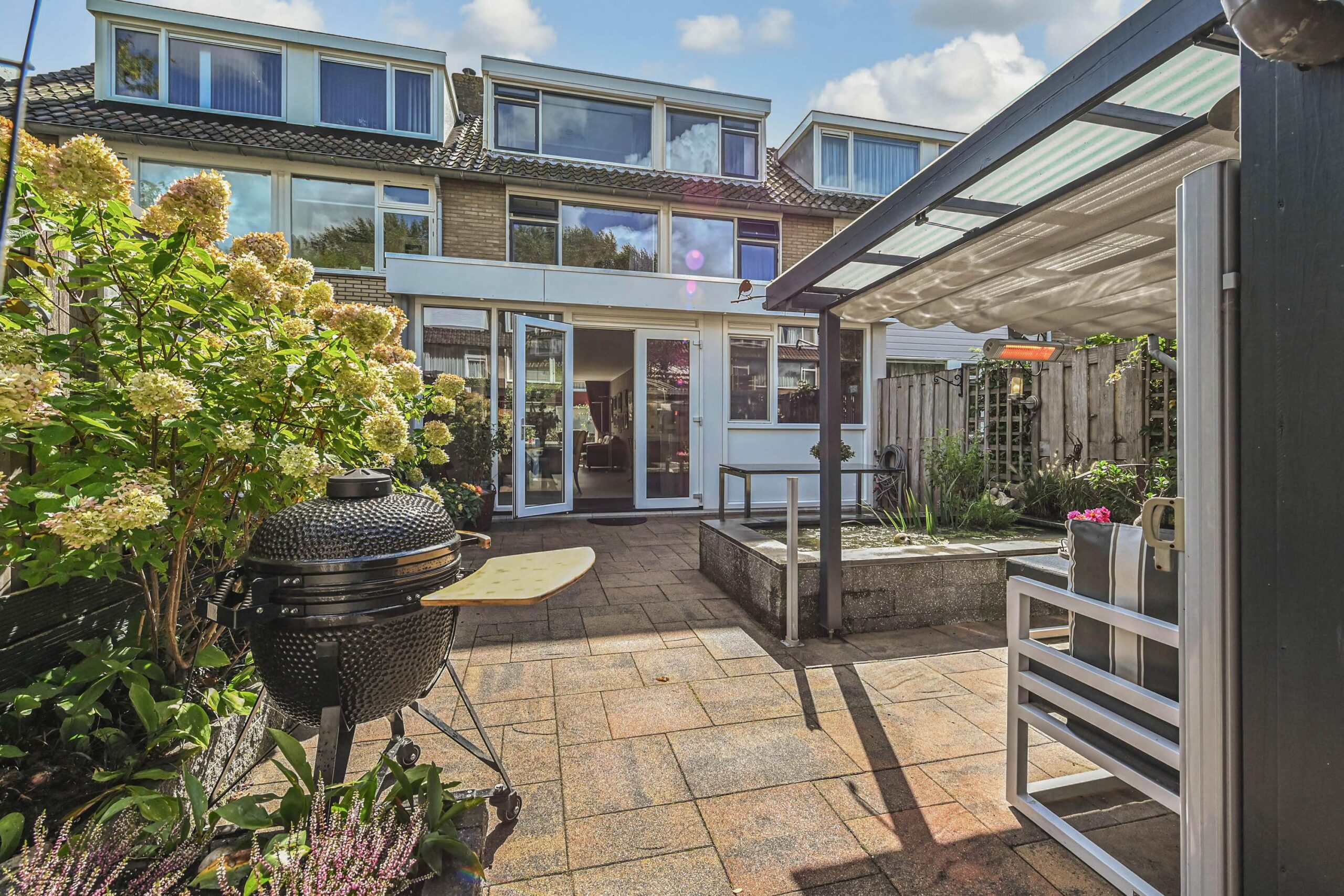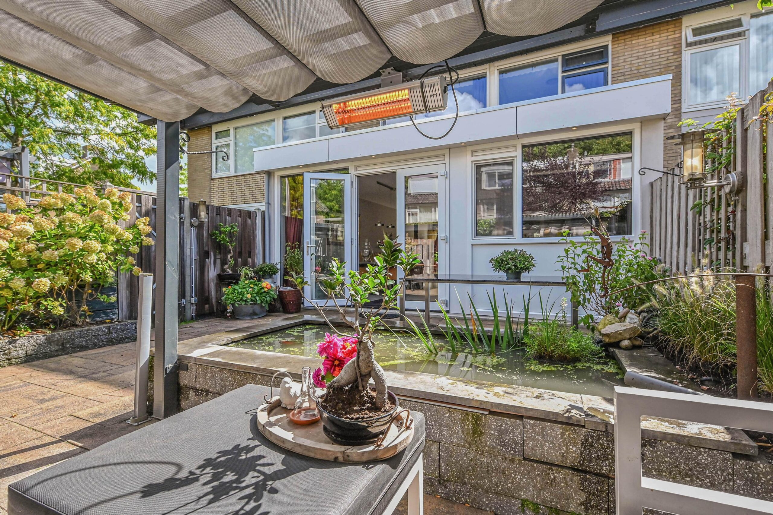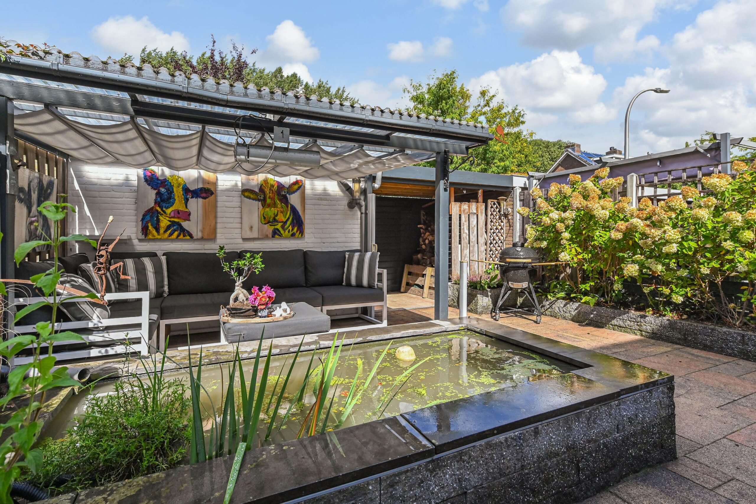 De fraai aangelegde achtertuin met overkapping, terrasheater en gezellige loungehoek is op Noordwesten gesitueerd, beschikt over een berging en is bereikbaar via een achterom.