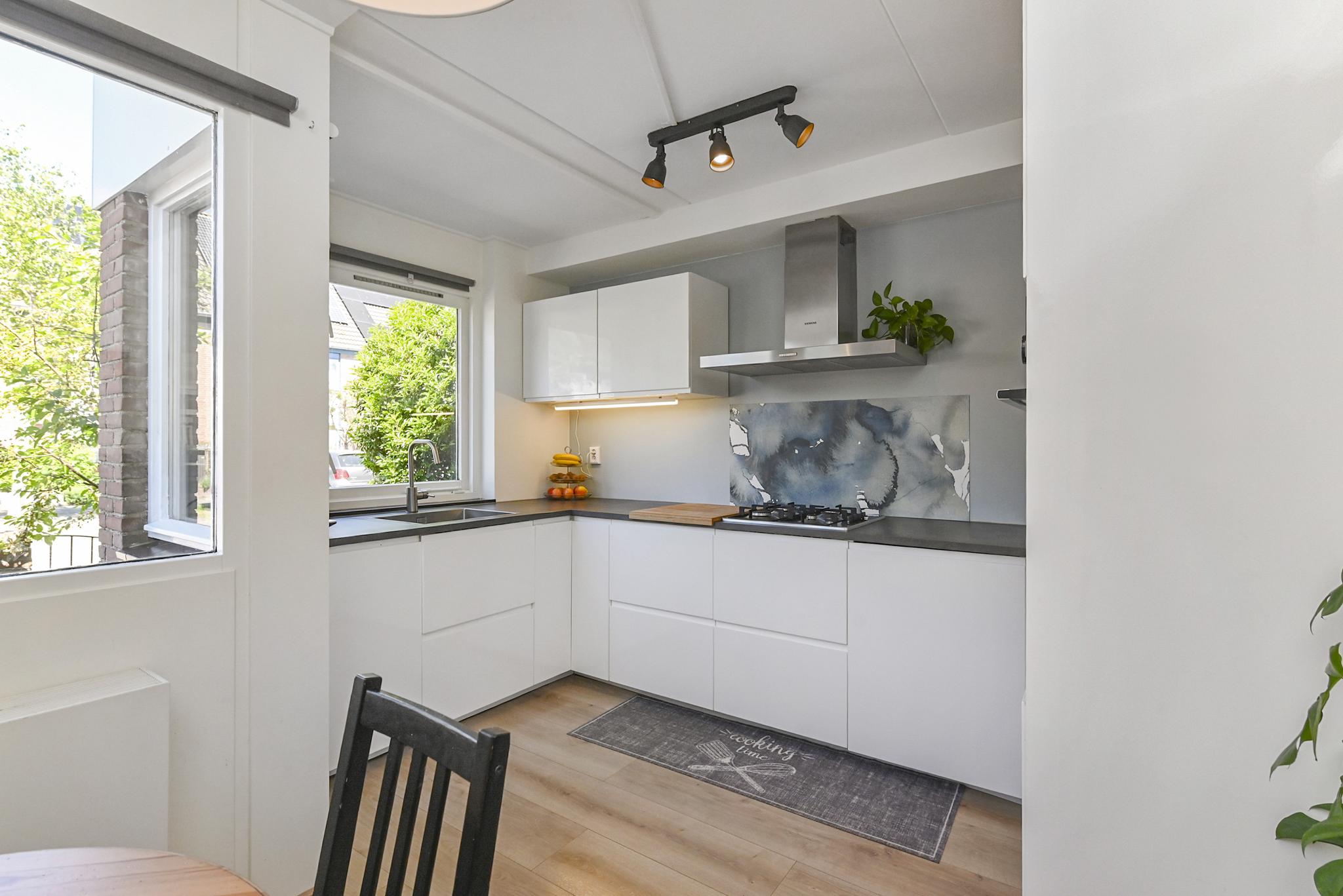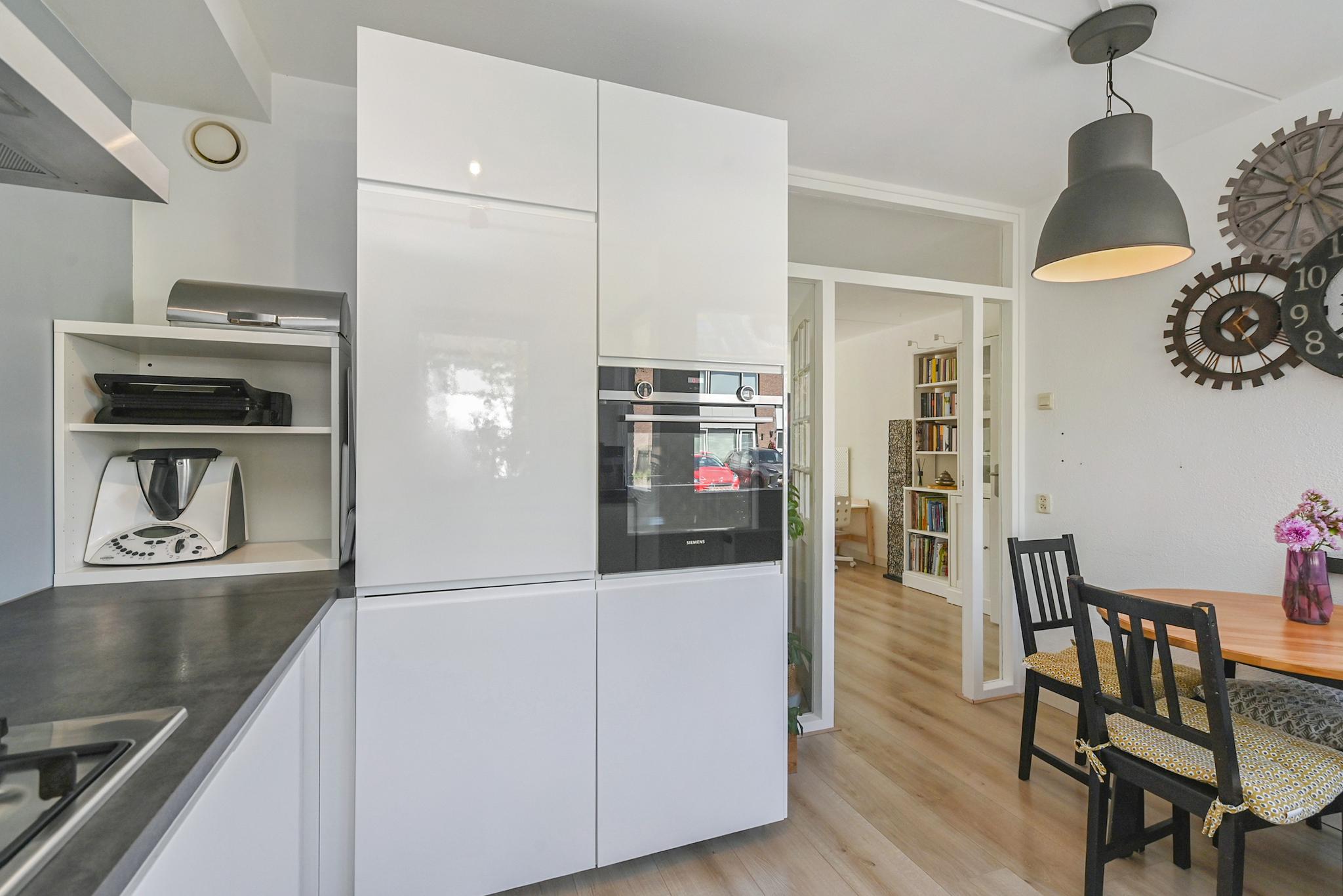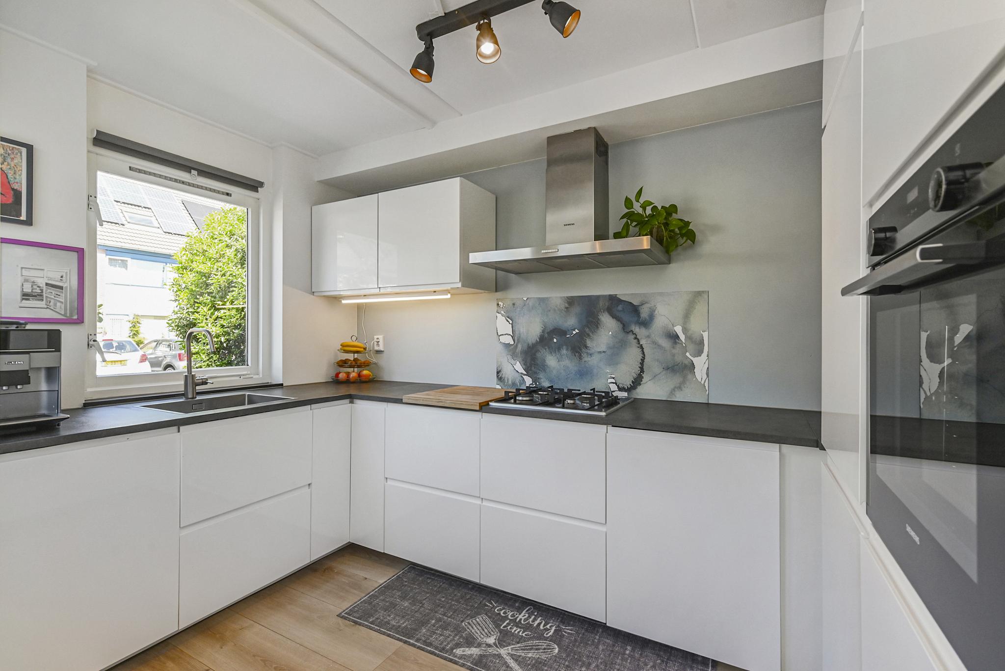 Aan de voorzijde van de woning is de gezellige woonkeuken. Deze is modern ingericht met een praktische opstelling en voorzien van diverse inbouwapparatuur, te weten een gaskookplaat, vaatwasser, koelkast, vriezer en een combi-oven. Vanuit de hal is er toegang tot de toiletruimte en de trapopgang.