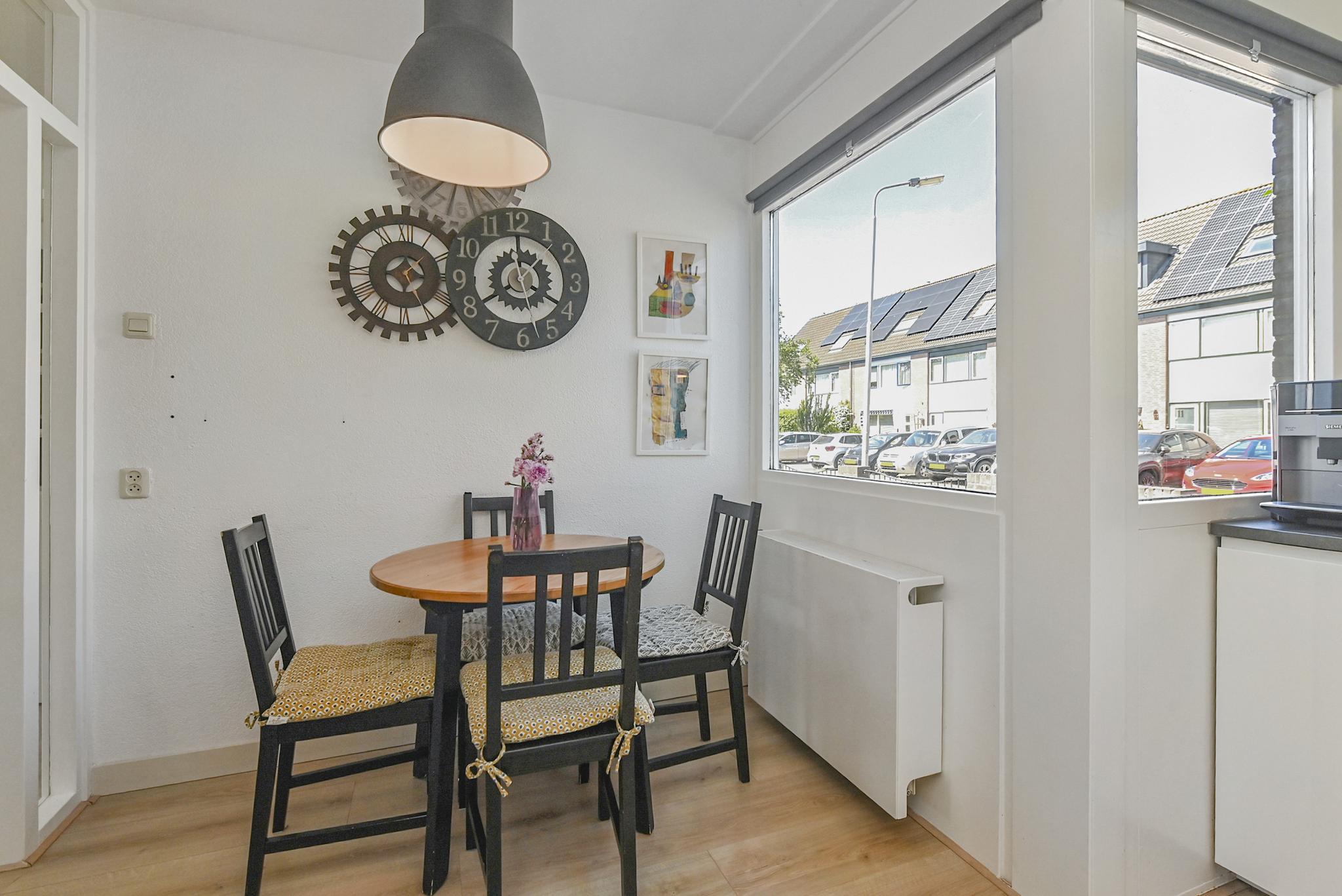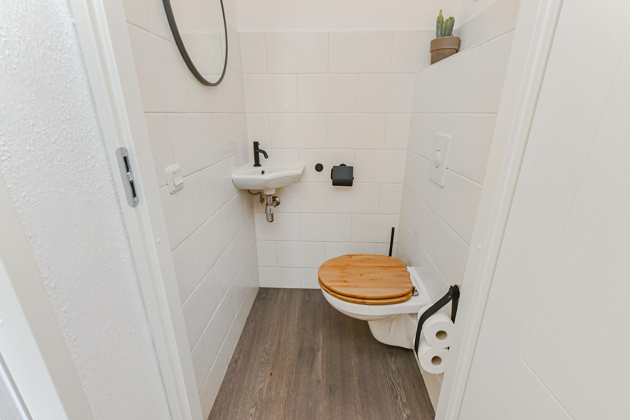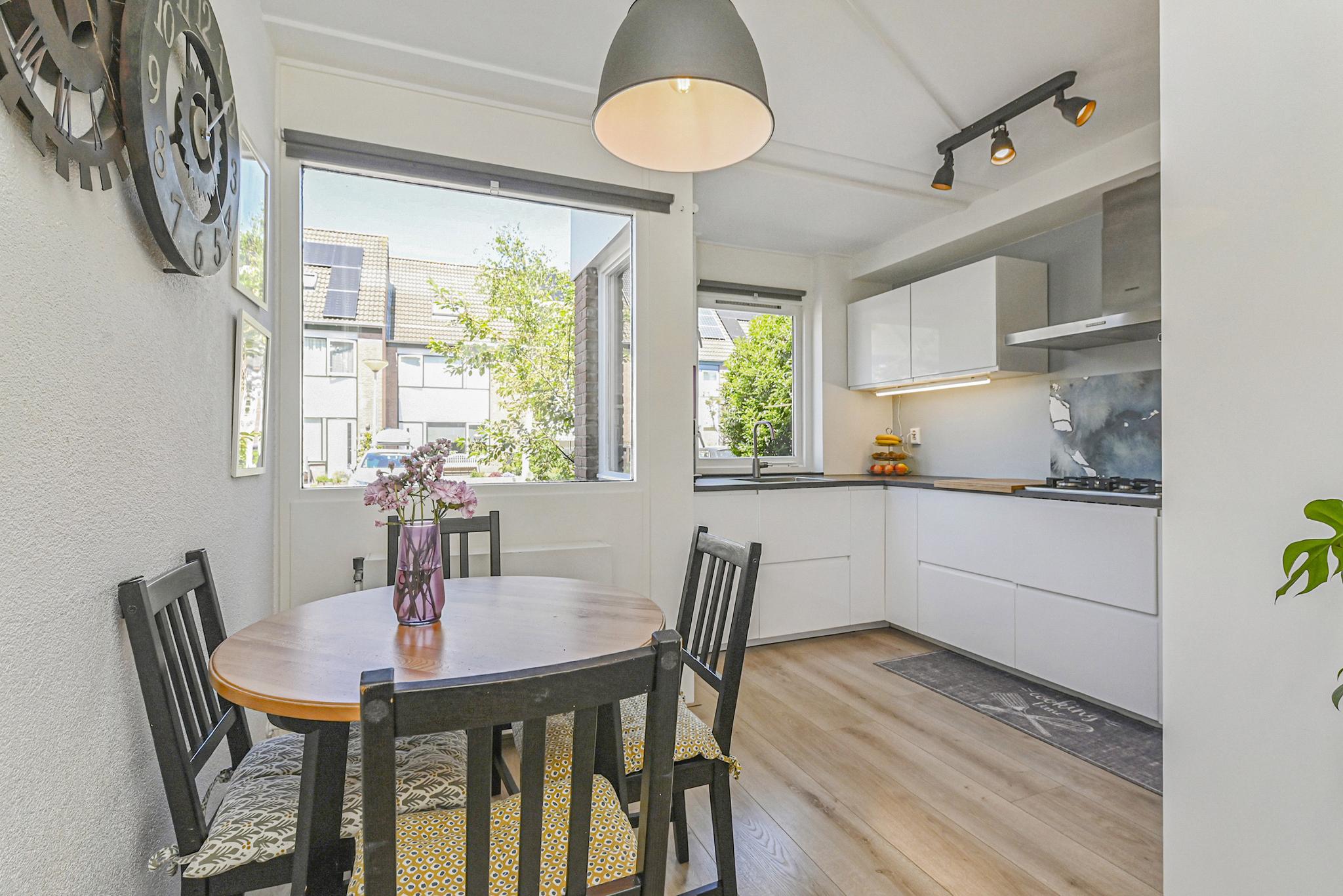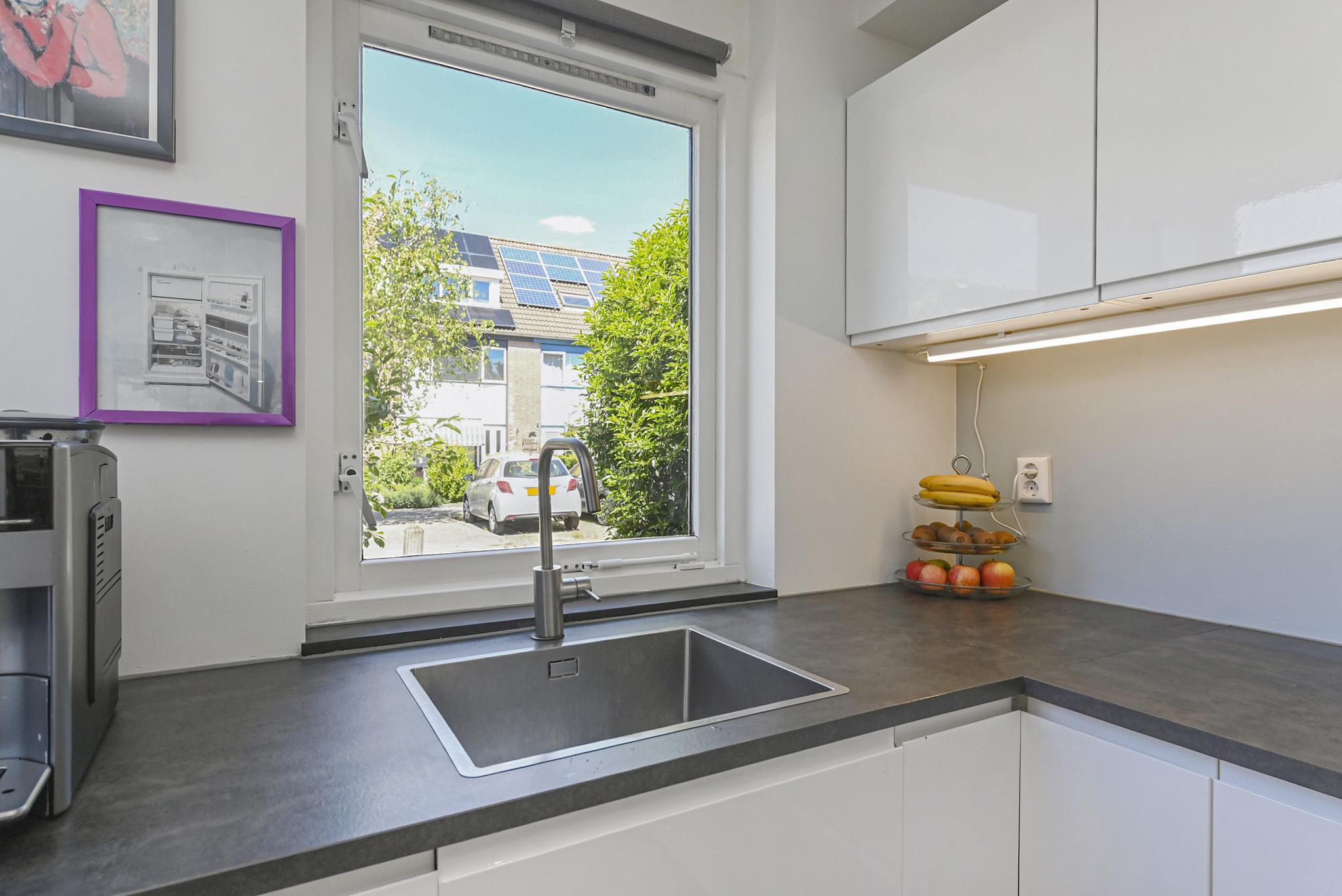 Aan de voorzijde van de woning is de gezellige woonkeuken. Deze is modern ingericht met een praktische opstelling en voorzien van diverse inbouwapparatuur, te weten een gaskookplaat, vaatwasser, koelkast, vriezer en een combi-oven. Vanuit de hal is er toegang tot de toiletruimte en de trapopgang.