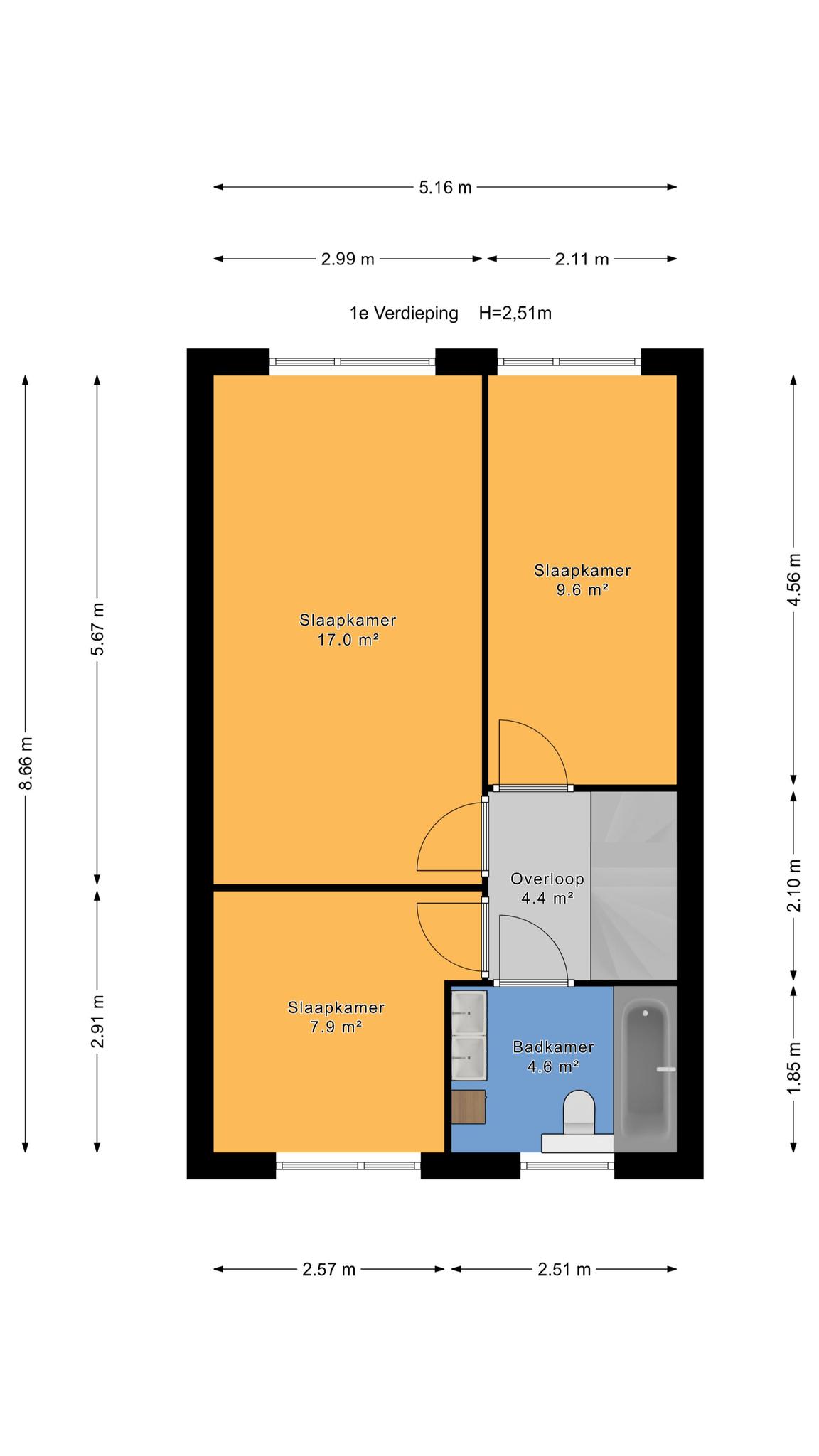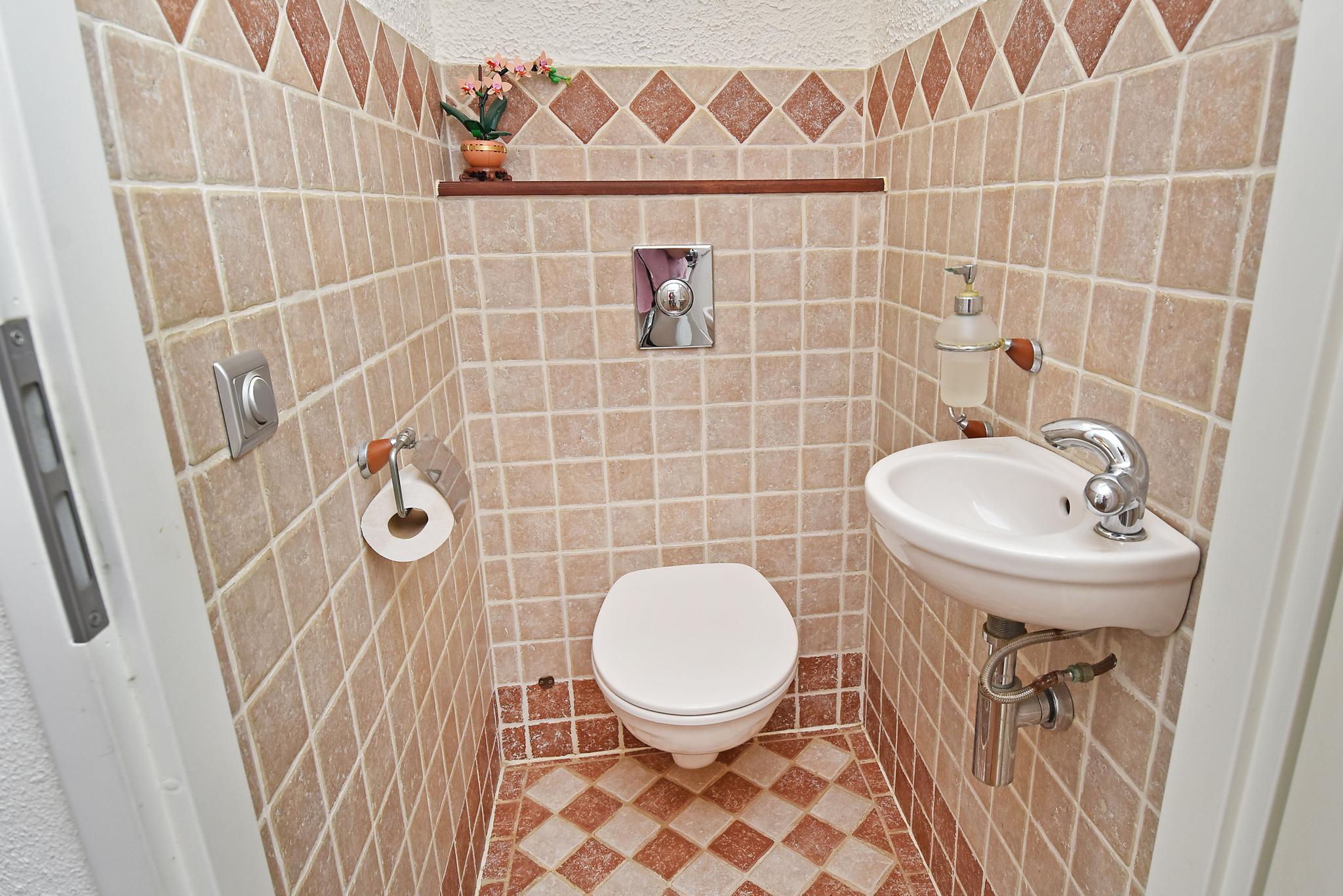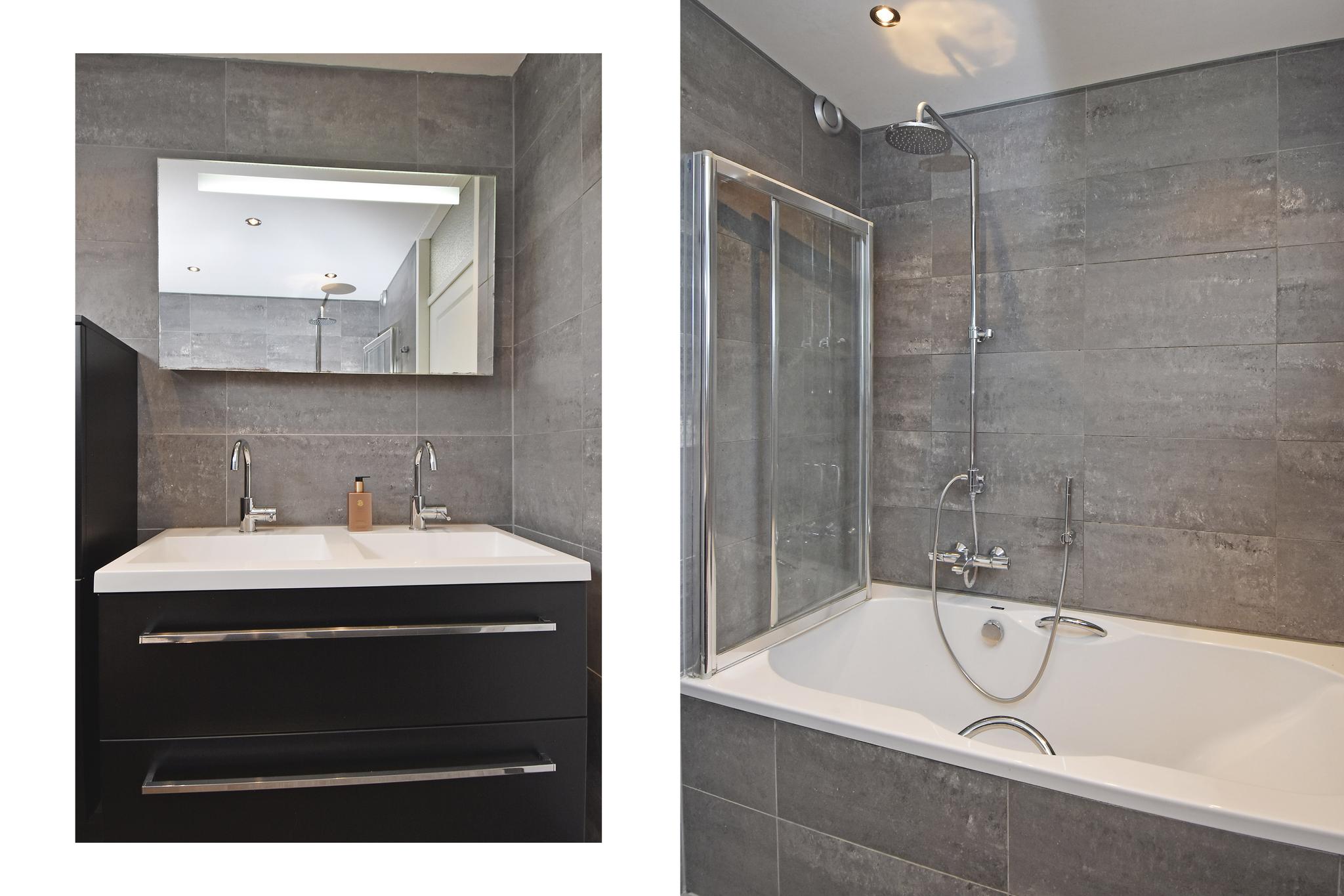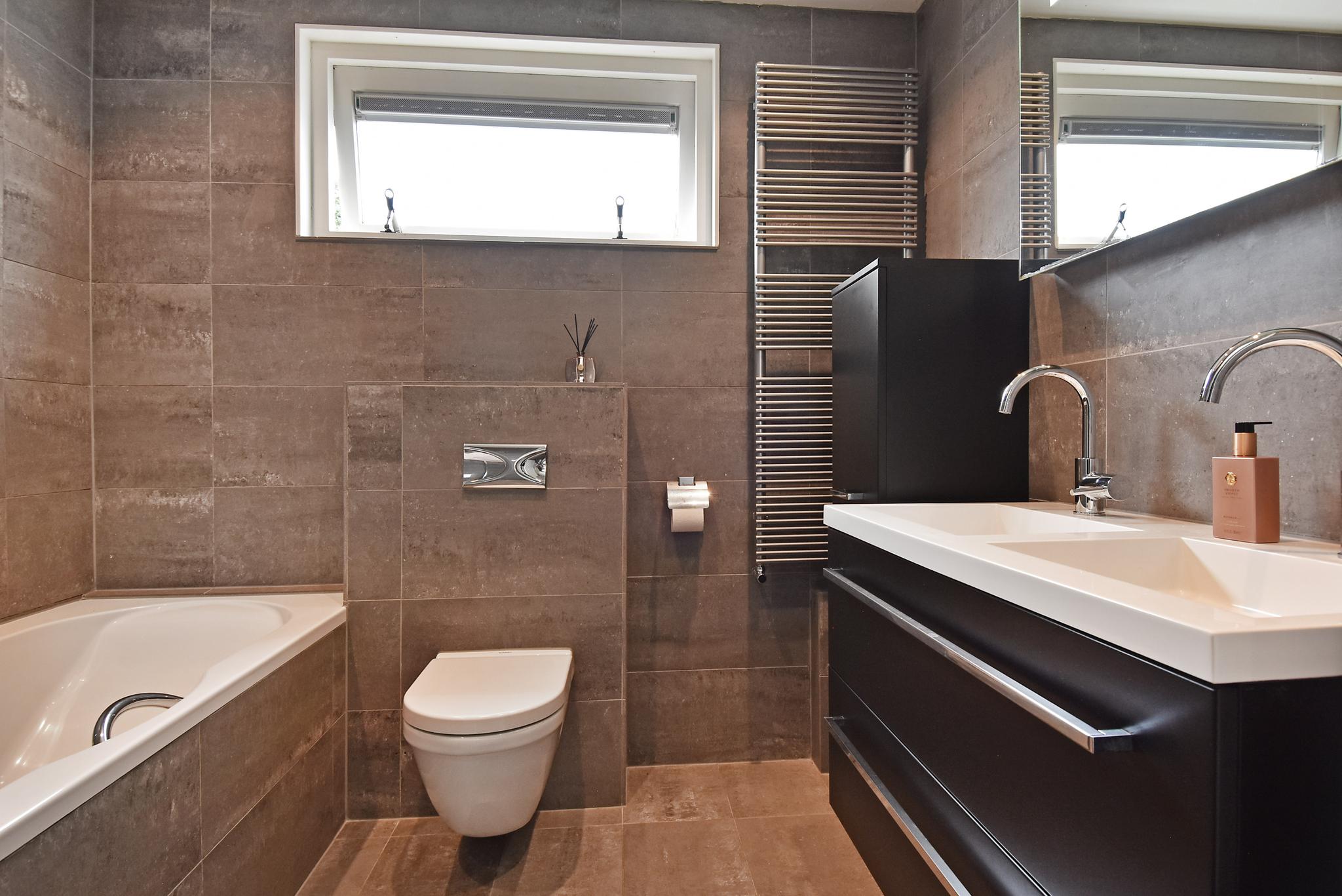1e etage: Overloop, drie grote slaapkamers en de badkamer. De ruime slaapkamers zijn voorzien van een nette laminaatvloer en zijn zorgvuldig afgewerkt. De moderne badkamer bevindt zich aan de voorzijde en is voorzien van een bad/douche combinatie, dubbele wastafel, 2e toilet, handdoekradiator en mechanische ventilatie. De badkamer heeft grijze vloer- en wandtegels. Ook kan er een raam geopend worden ten behoeve van natuurlijke ventilatie.