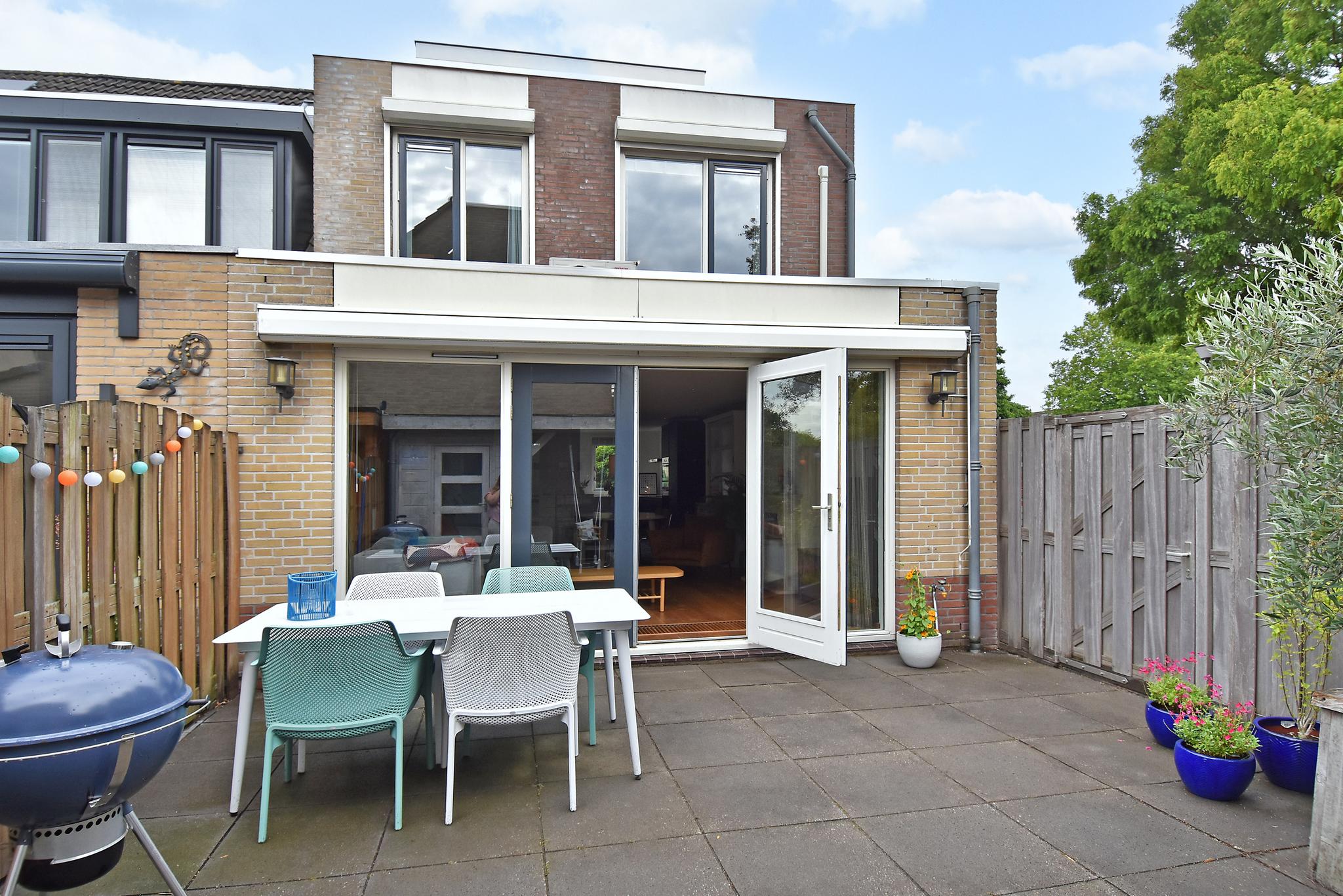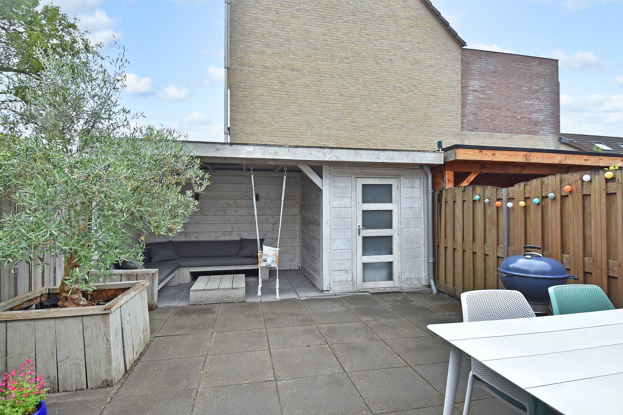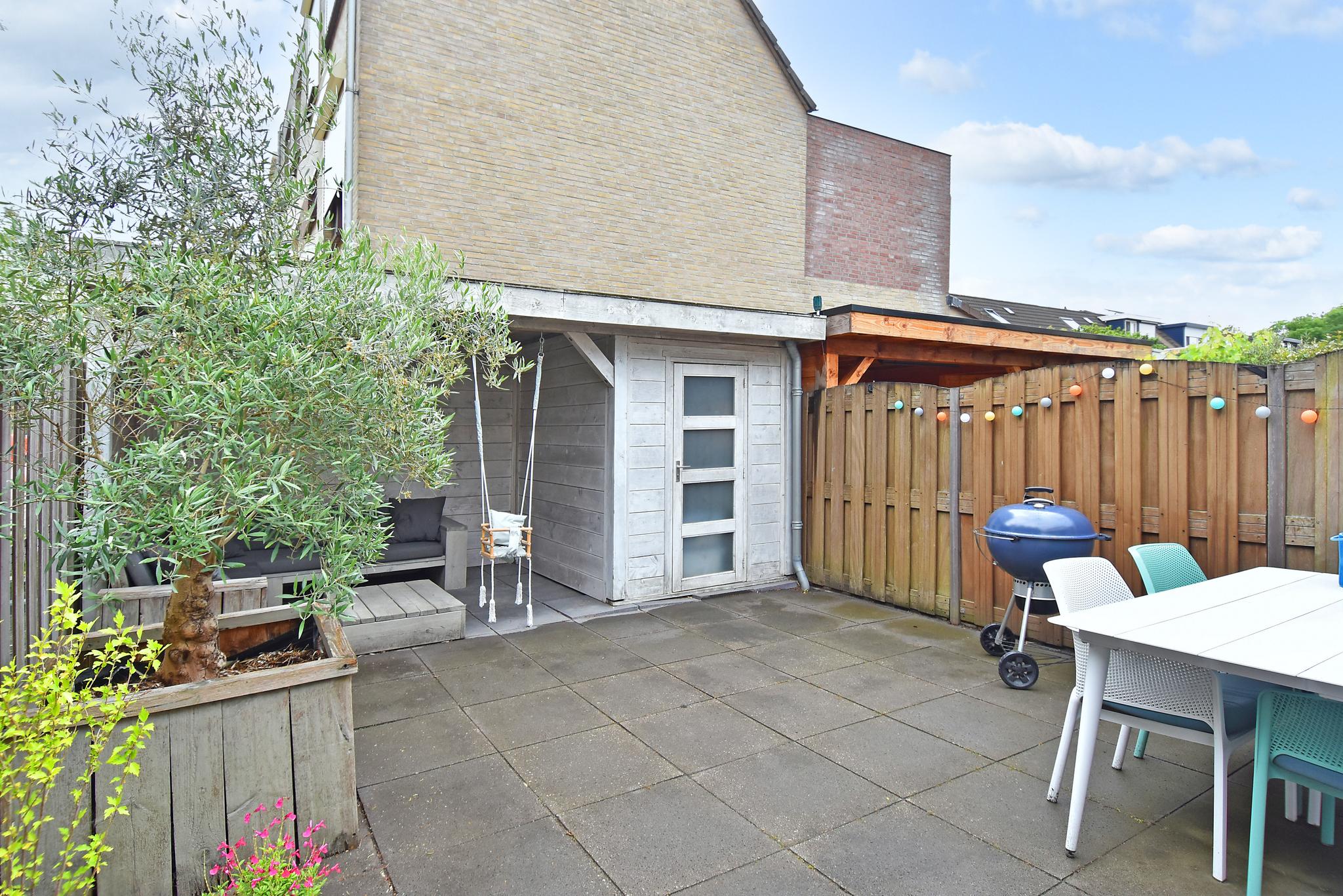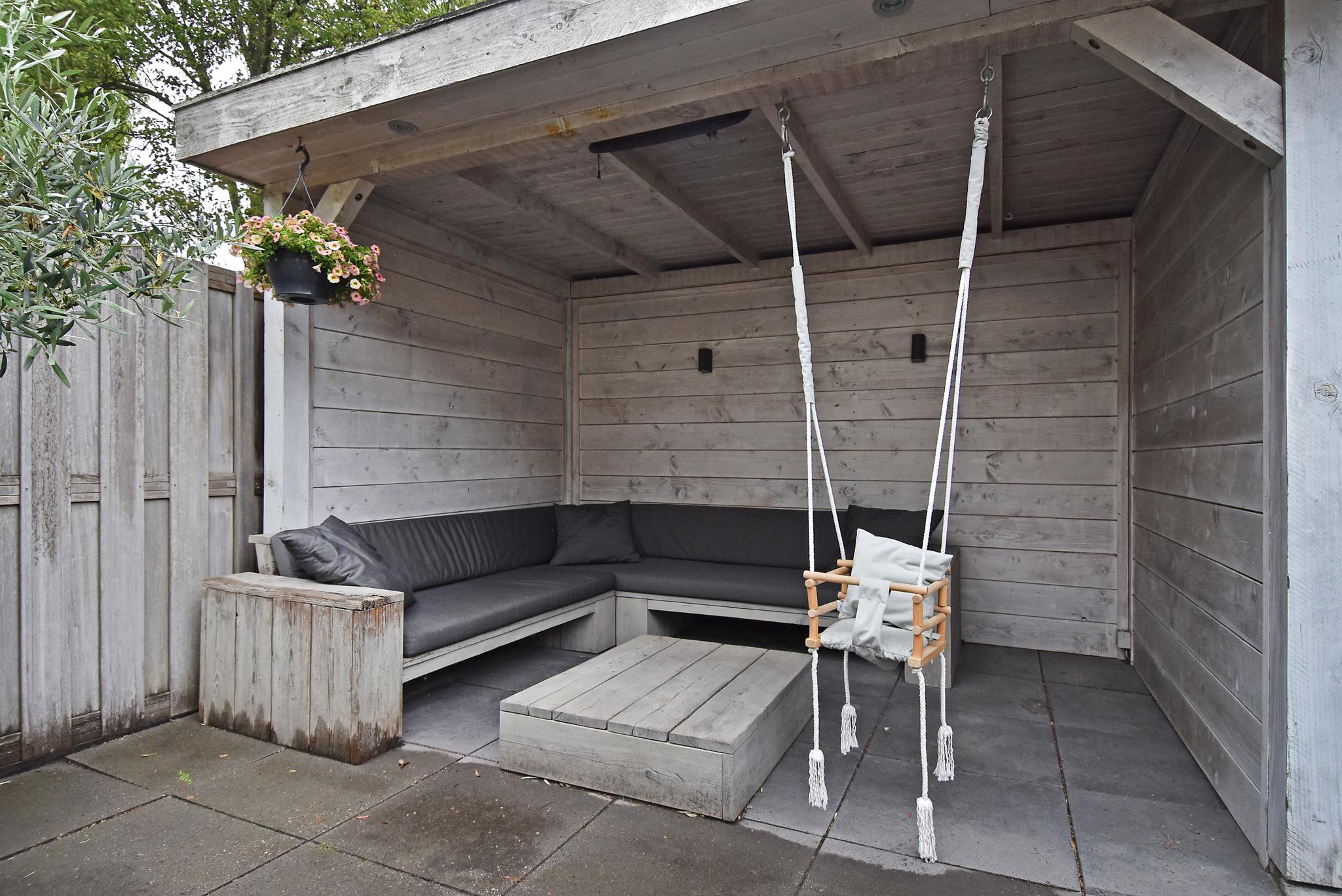 Aan de achterzijde ligt de onderhoudsarme achtertuin, de tuin biedt veel privacy, beschikt over een achterom en een vrijstaande houten berging met veranda.