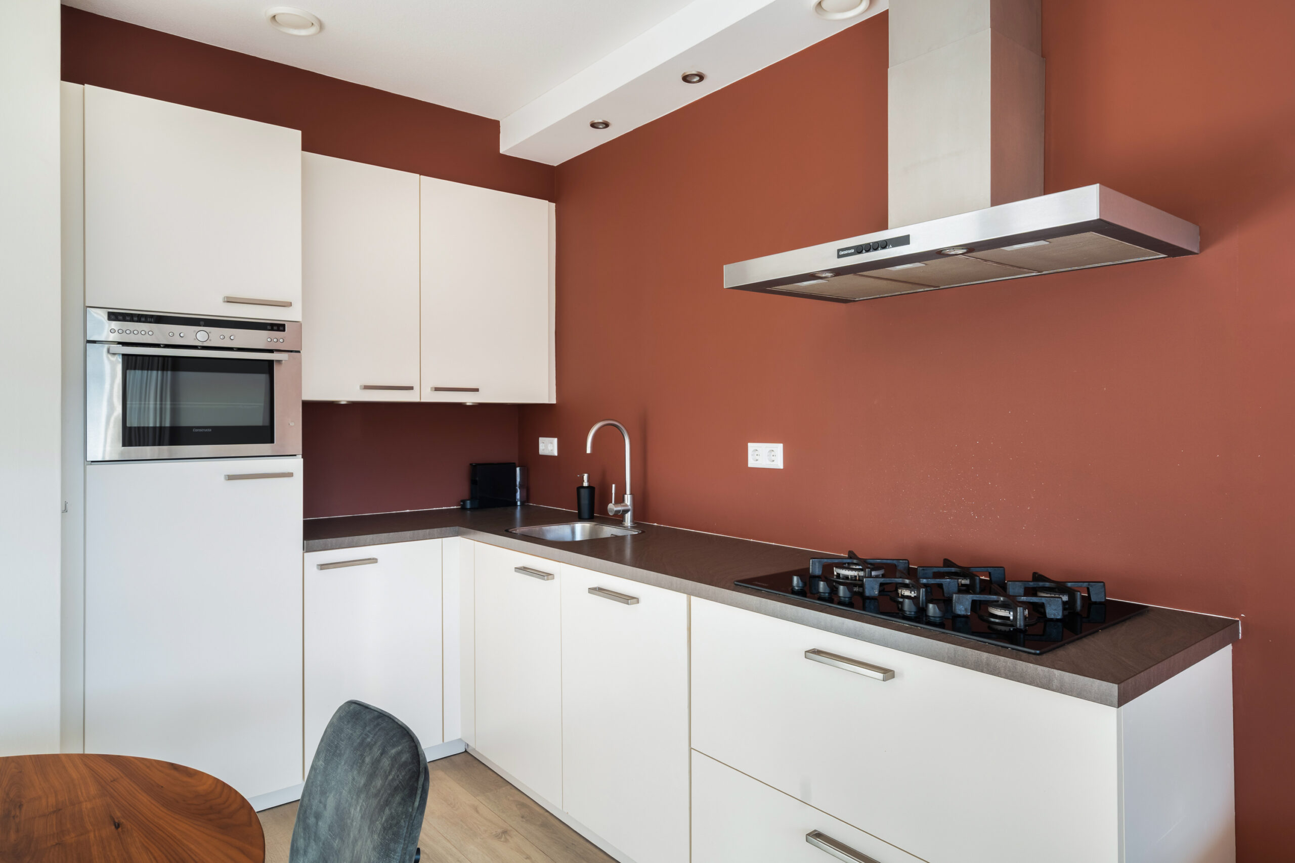 – De moderne keuken is praktisch in hoekopstelling, licht van kleur en heeft alle benodigde apparatuur
