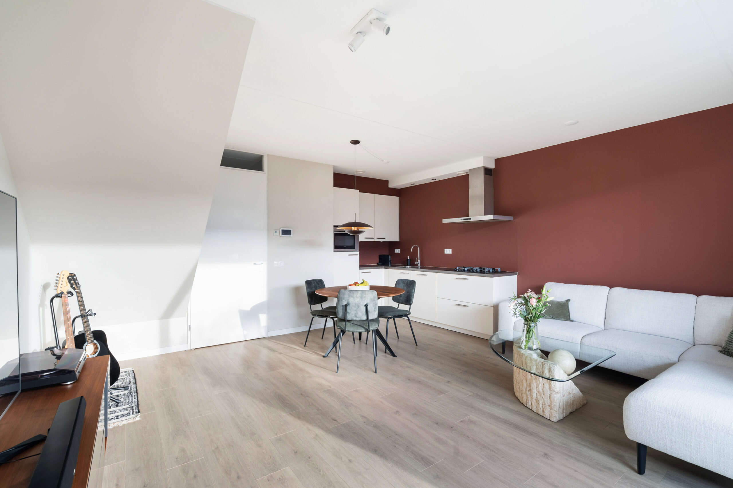– De woonkamer is heel licht door de grote schuifpui en geeft toegang tot het indrukwekkende dakterras waar je de gehele dag van de zon kunt genieten—ideaal voor etentjes, relaxen of tuinieren in potten.
