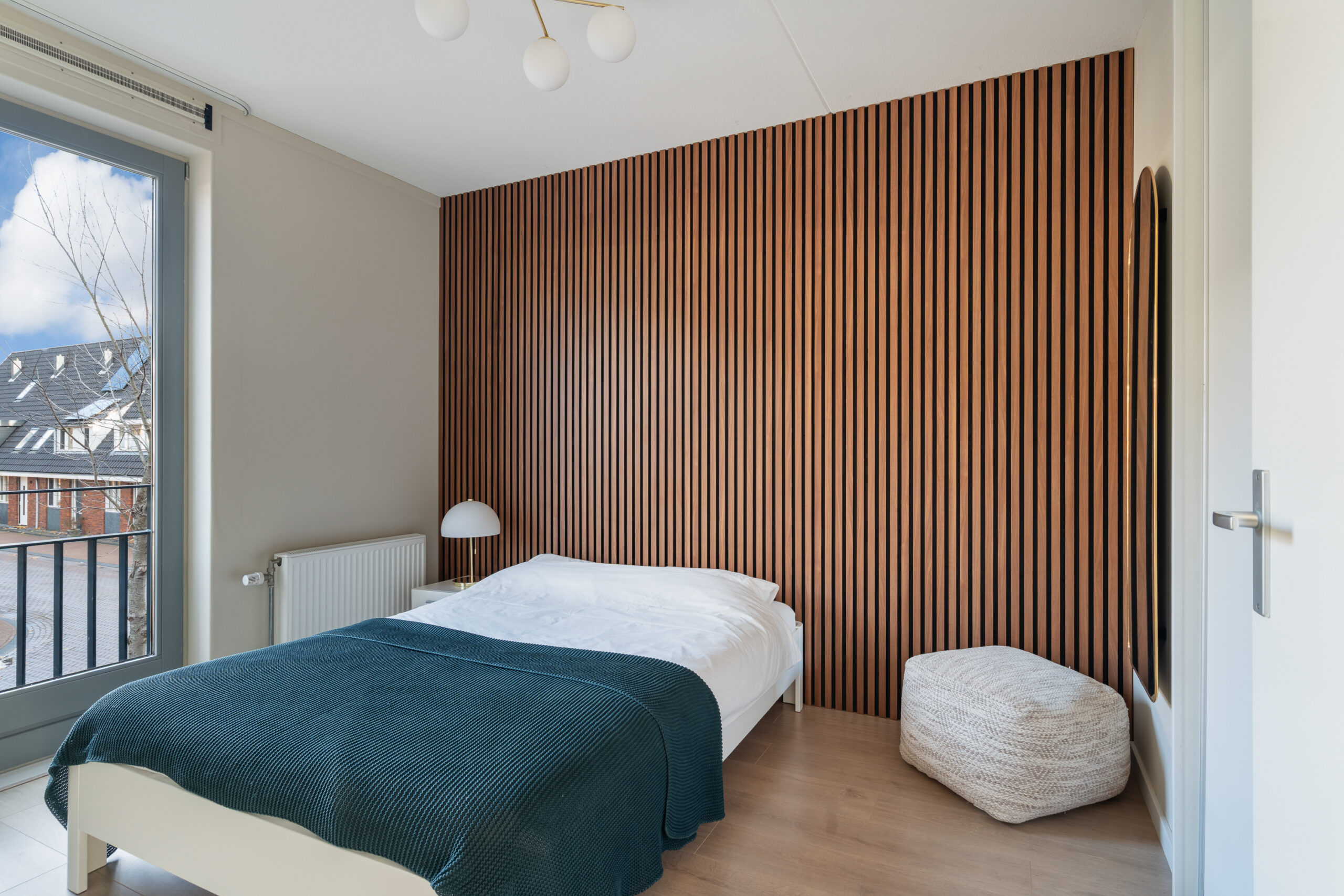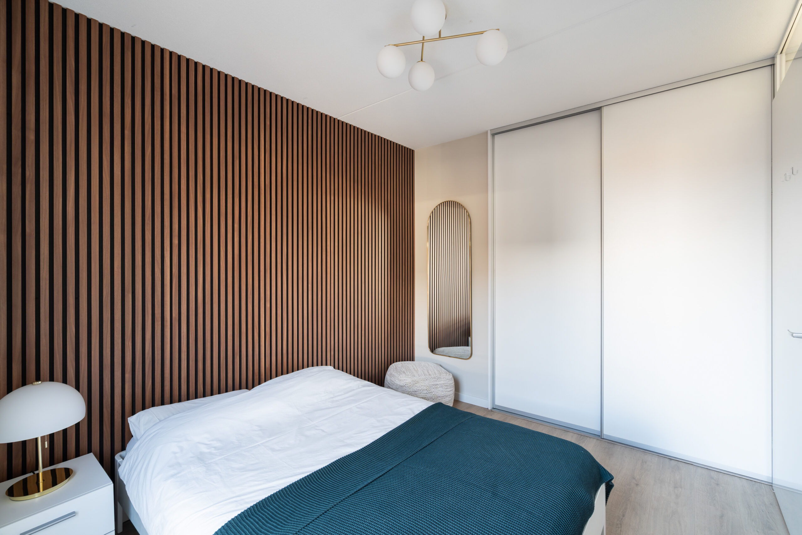 – 2 slaapkamers aan de voorzijde met Frans balkon, laminaatvloeren en 1 met vaste schuifwandenkast