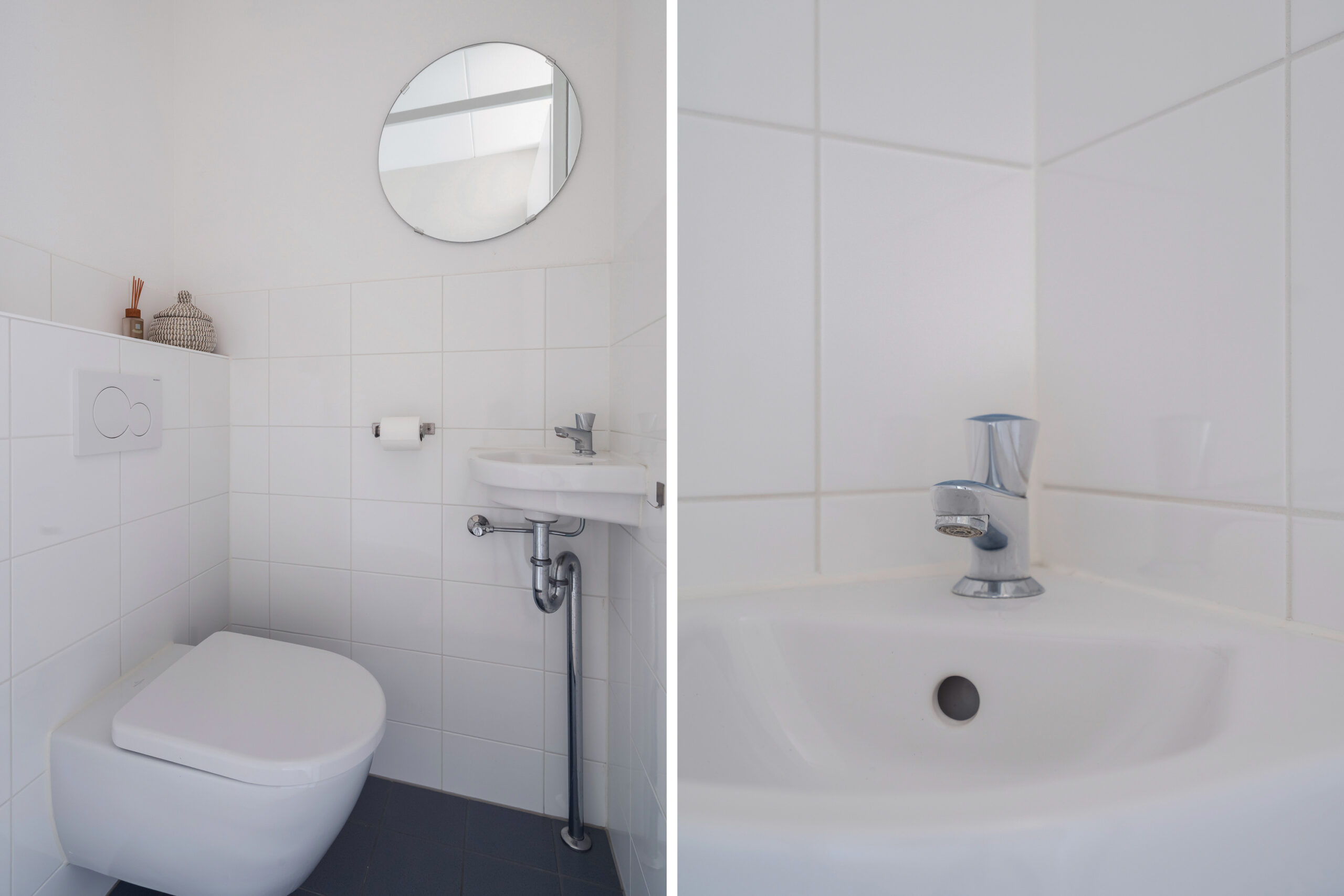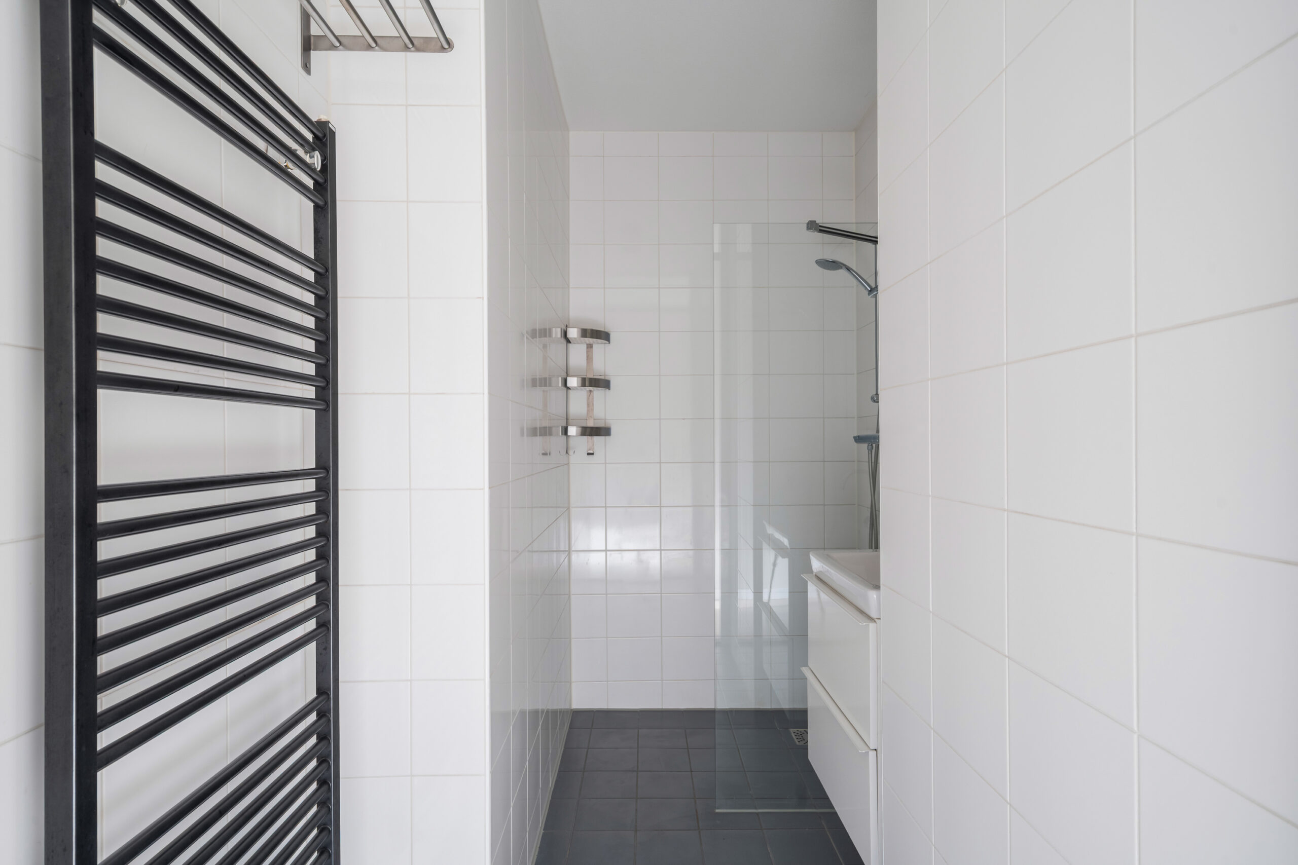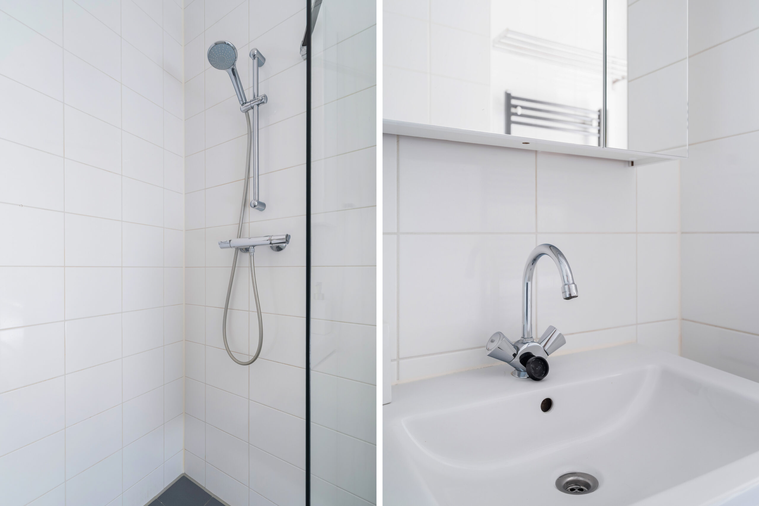 – De badkamer is strak, fris en keurig verzorgd met een douche, wastafelmeubel en spiegelkast.