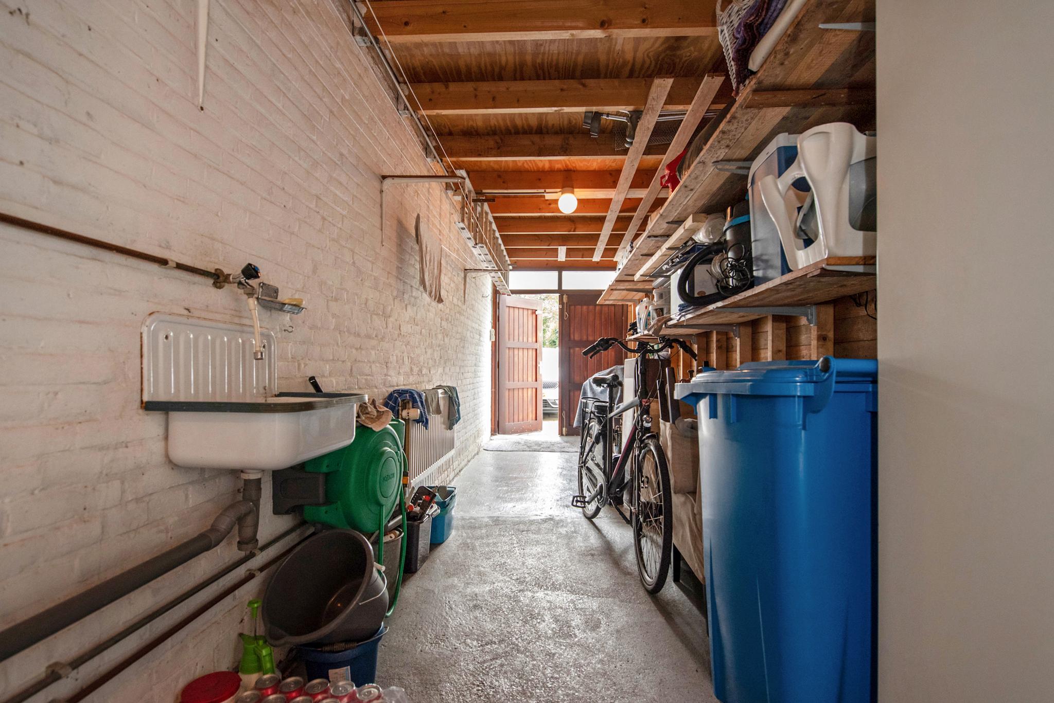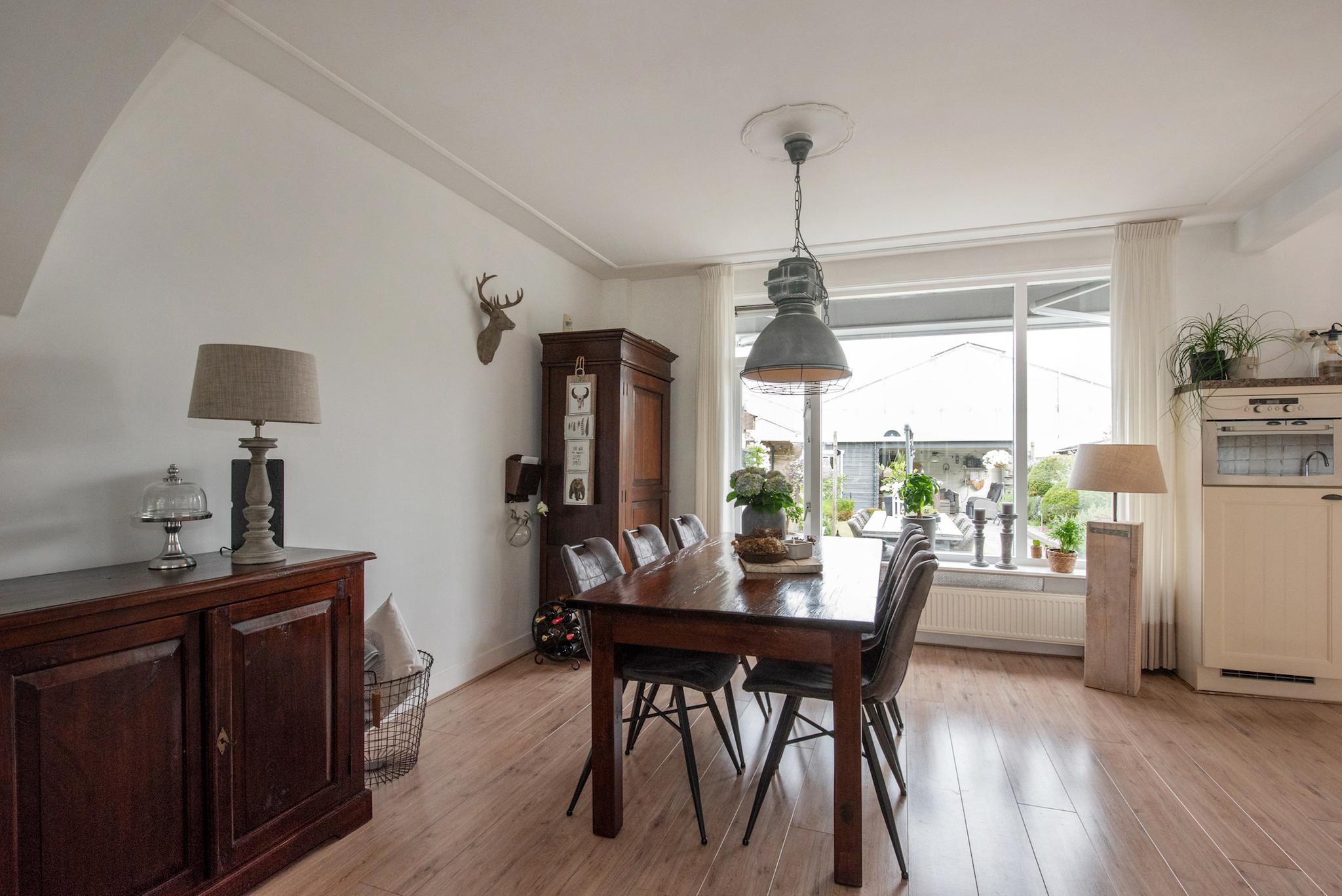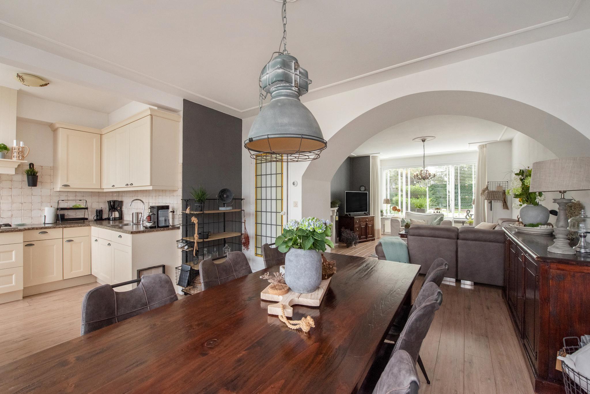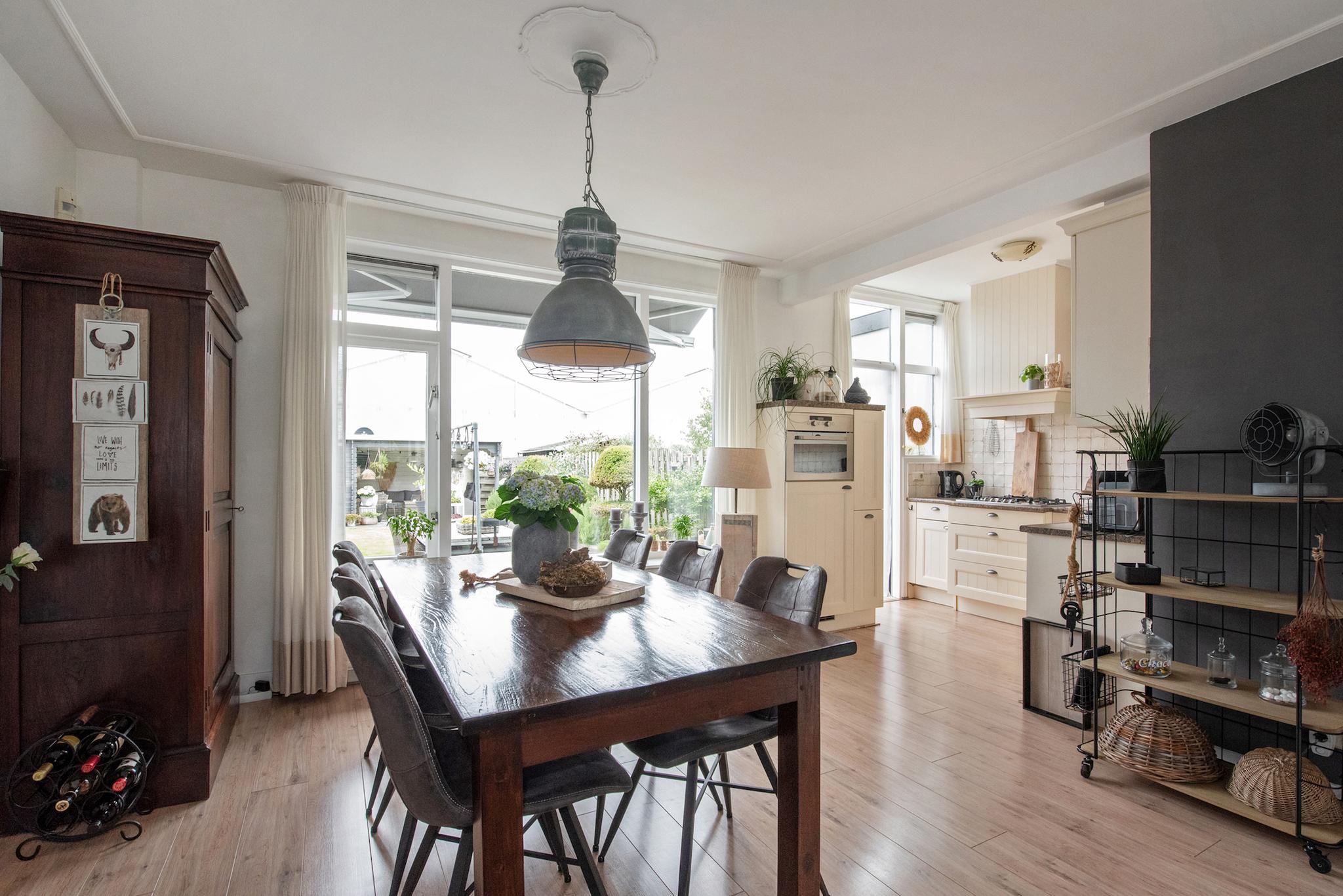 Entree met meterkast, toiletruimte en gang met prachtig trappenhuis en glas-in-lood deur. Royale woonkamer opgedeeld in zit- en eetgedeelte, optisch met een toog gescheiden, op de vloer ligt een houtlook laminaat. Aan de achterzijde van de woning staat de keuken in een grote L-vorm opgesteld met extra vrijstaande blok voor apparatuur, de keuken is in landhuisstijl en beschikt over enige inbouwapparatuur. Grote bijkeuken/berging naast de woning met aansluiting voor wasmachine/droger, uitstortgootsteen en opstelling CV combi ketel. Vanuit de achterzijde is de heerlijke achtertuin toegankelijk met diverse leuk ingerichte hoekjes, gazon en een fijne veranda/overkapping waardoor je lang van het buitenleven kunt genieten.